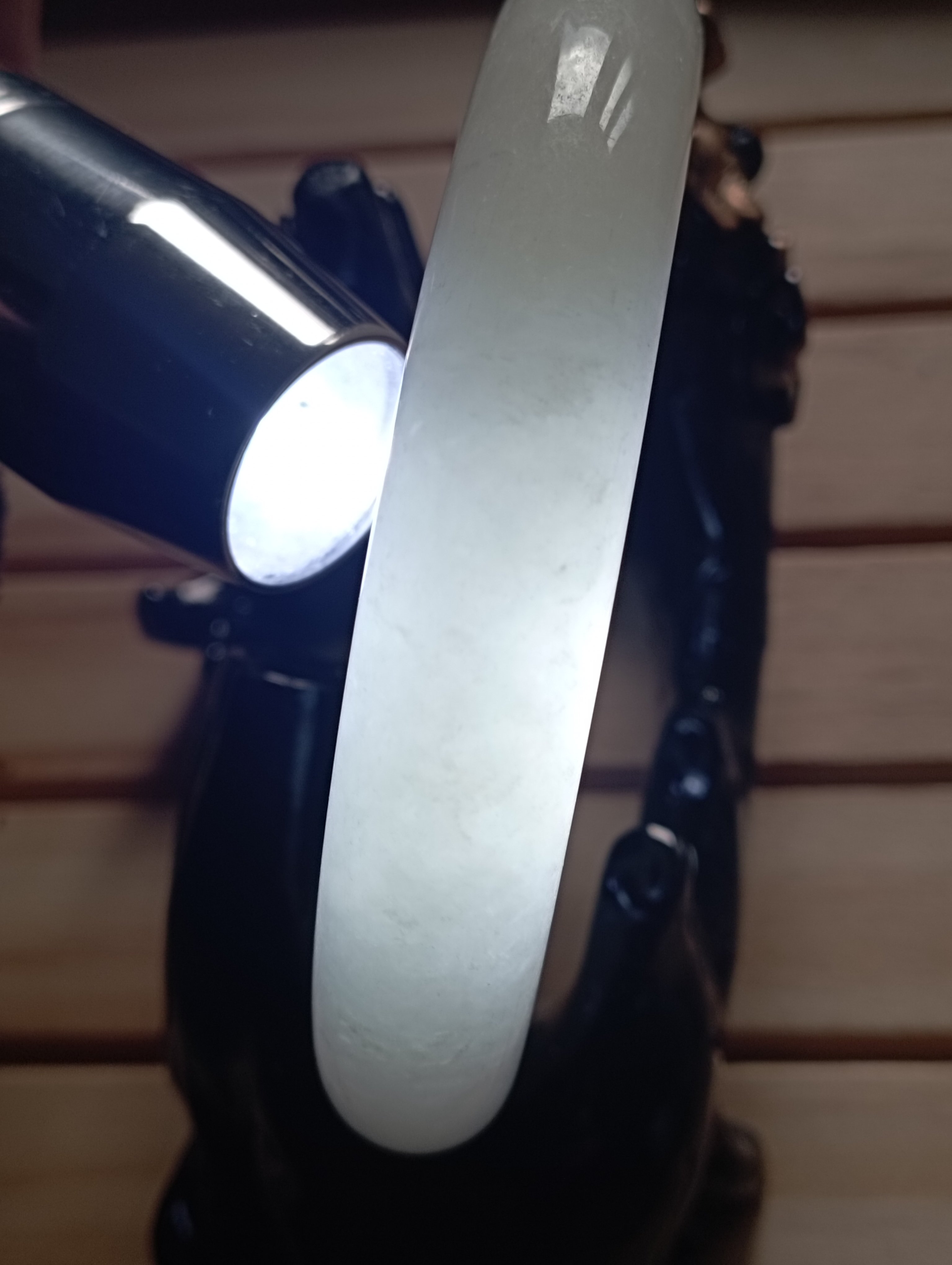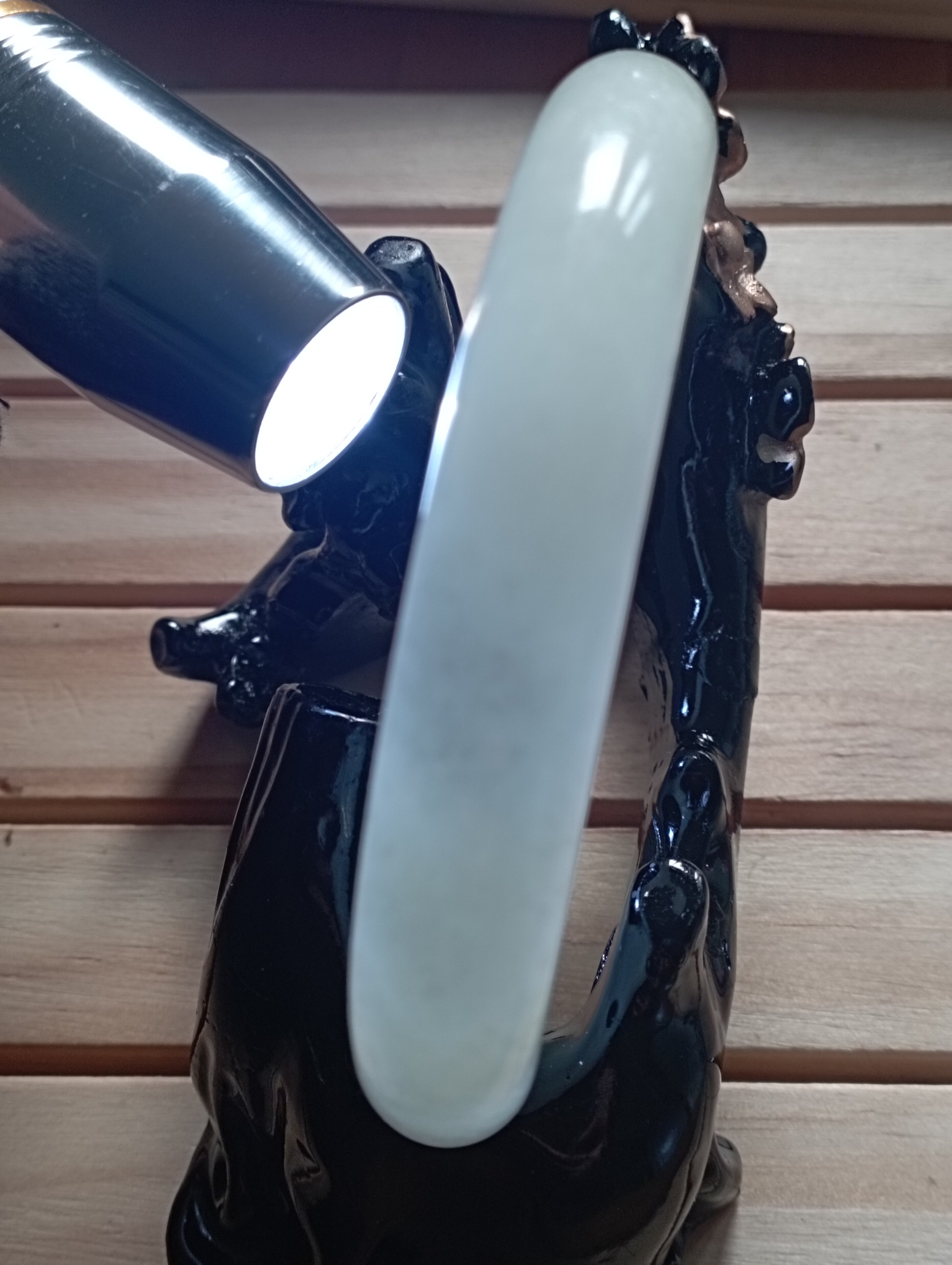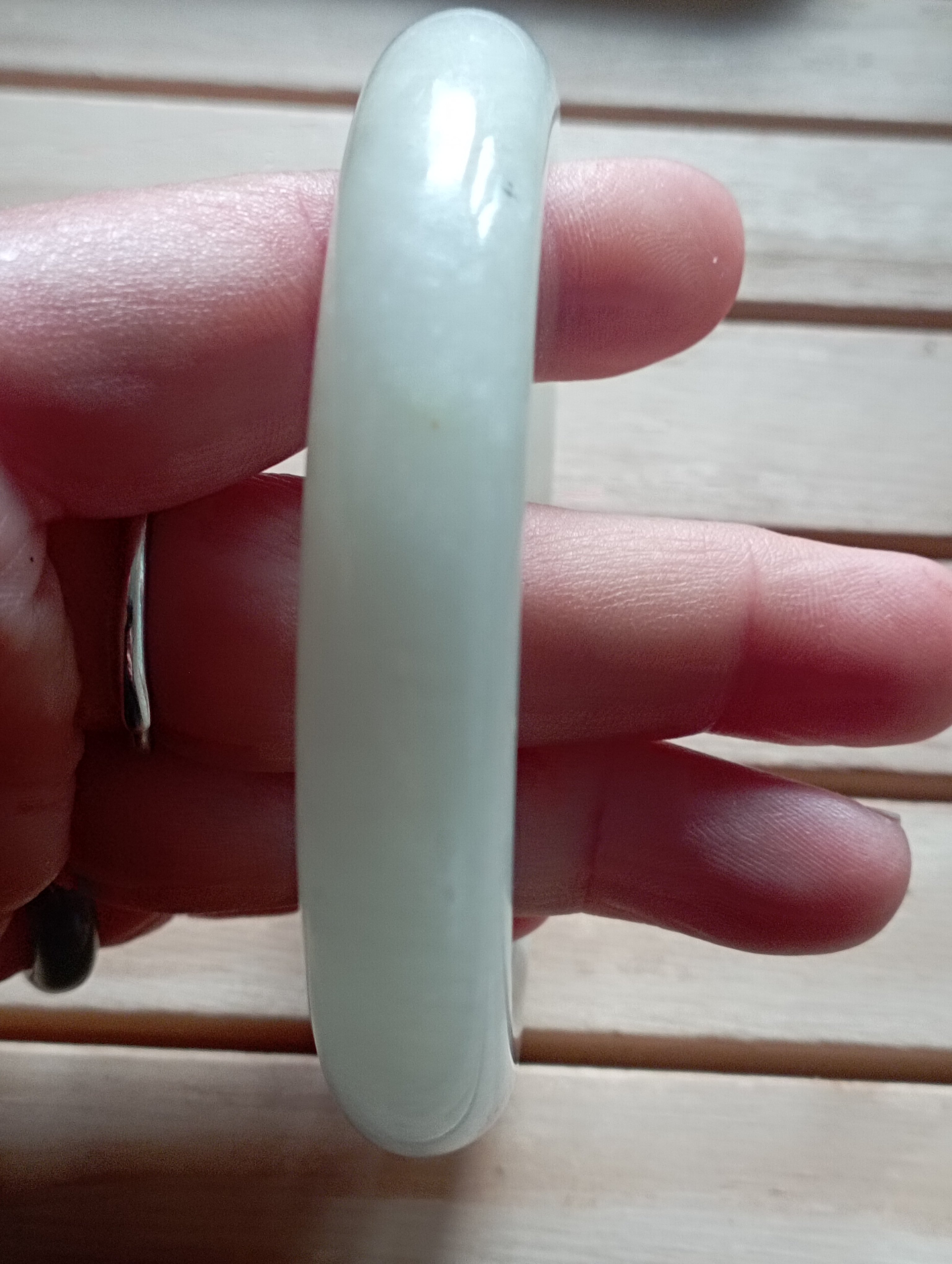 Beautiful white bangle made of Hetian from Qinghai in China. It is a softer jade compared to jadeite. Measures 57.5 X 11.2 X 10mm, weighs 67.59g, comes with a certificate of authenticity.£180