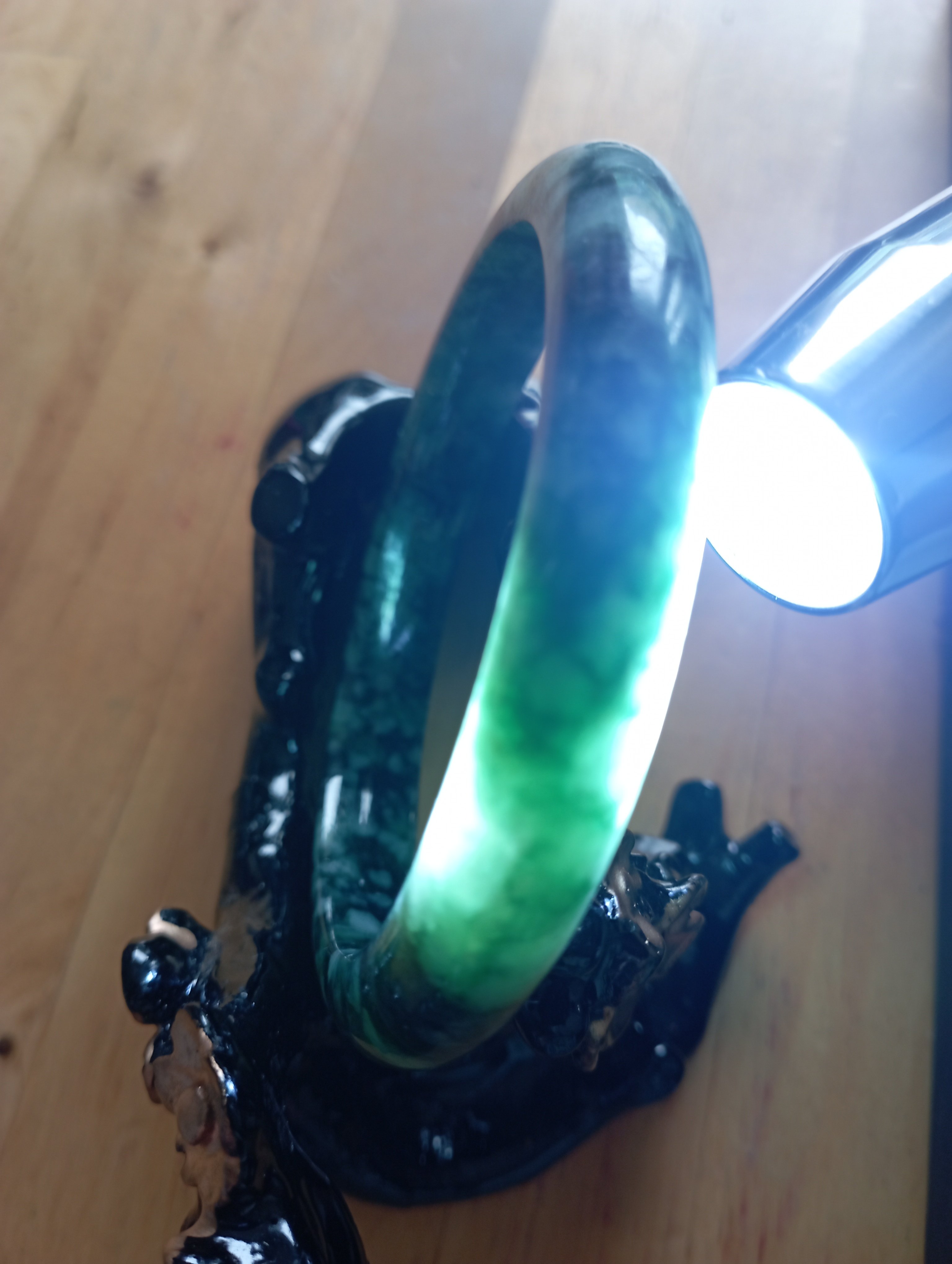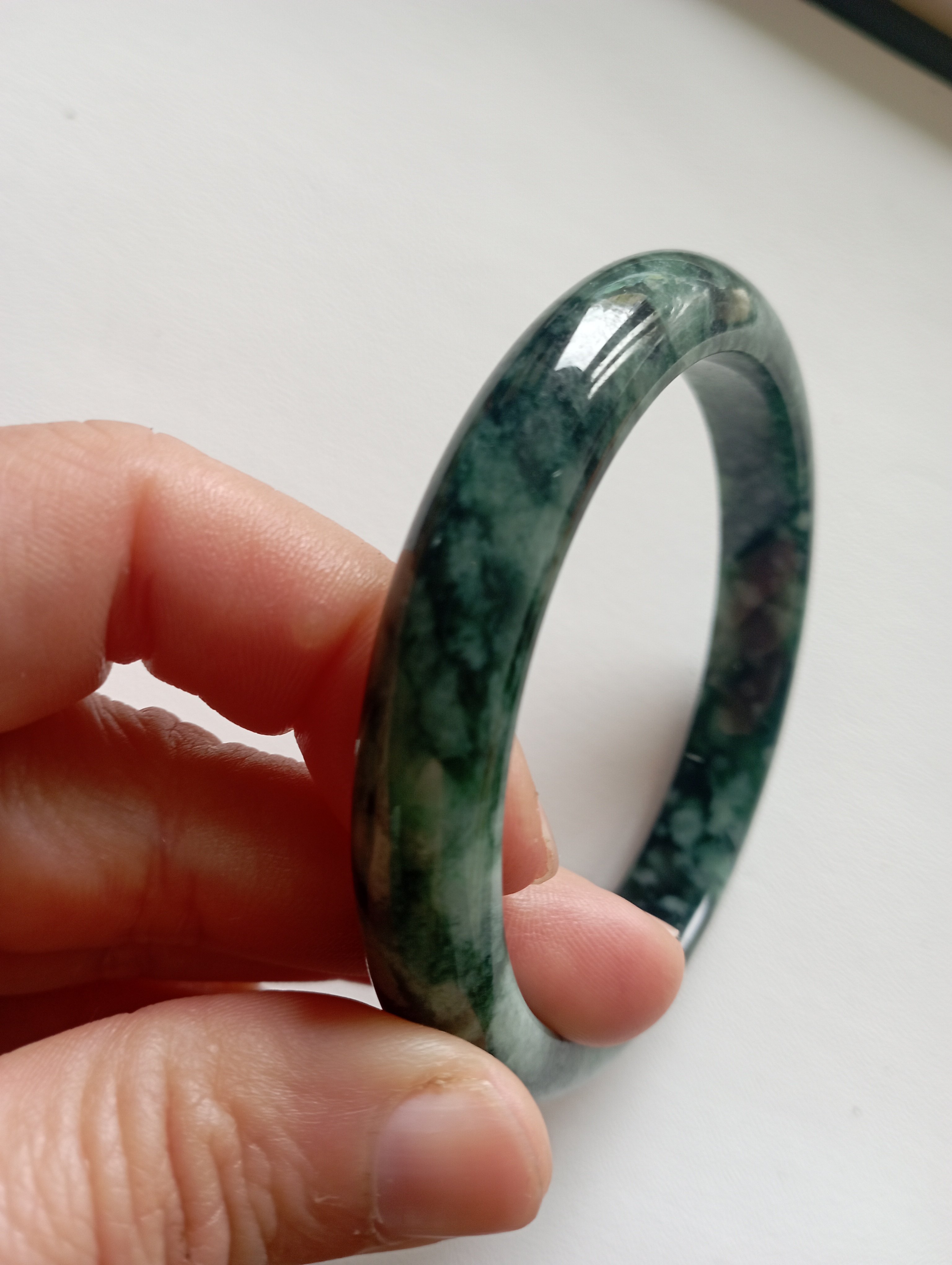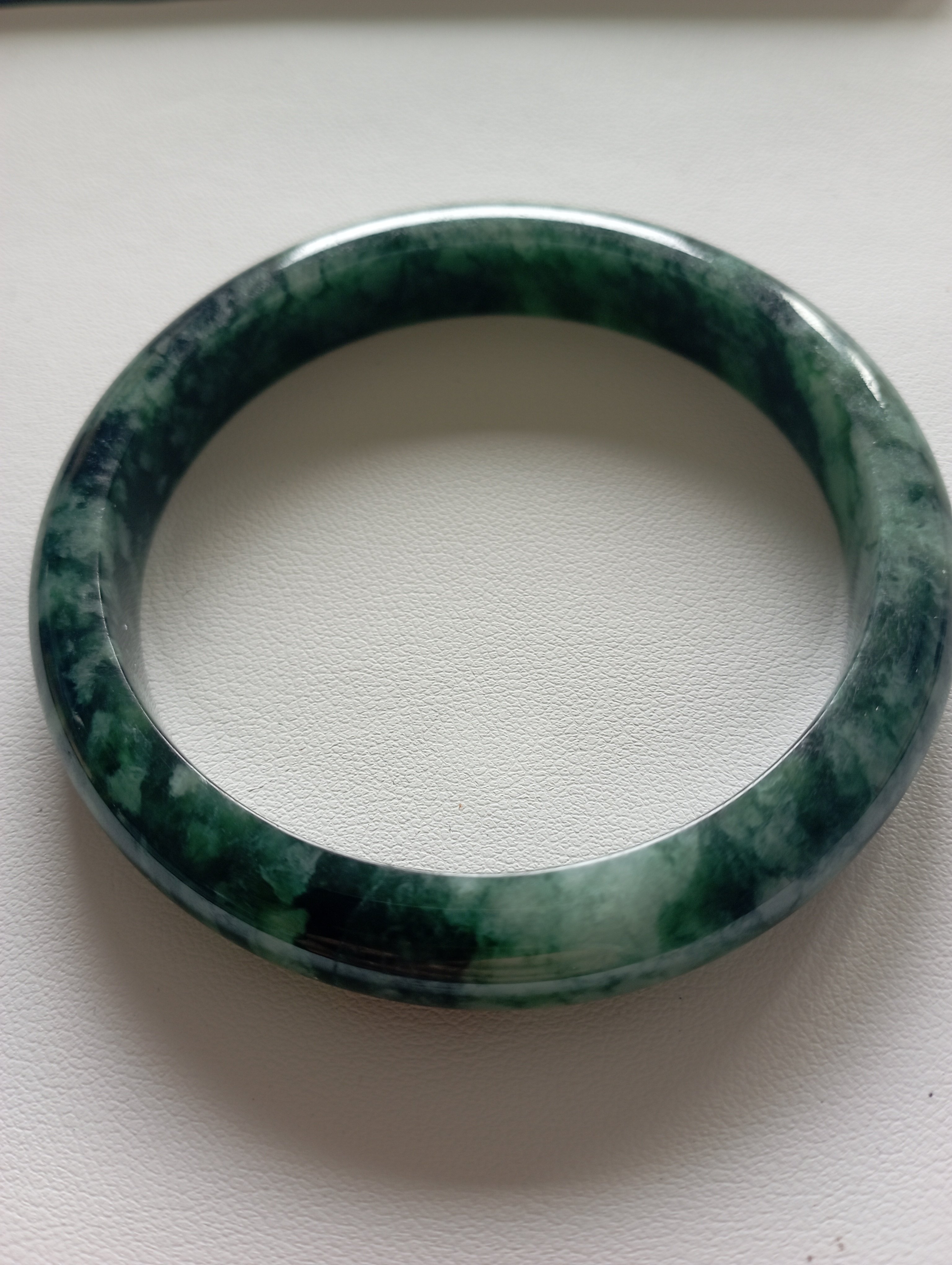 Vibrant green when the light shines through, the bangle itself is dark green with darker green blooms all over, measures 58.1 X 10.1 X 7.7mm, weighs 41.65g. Comes with a certificate of authenticity £198