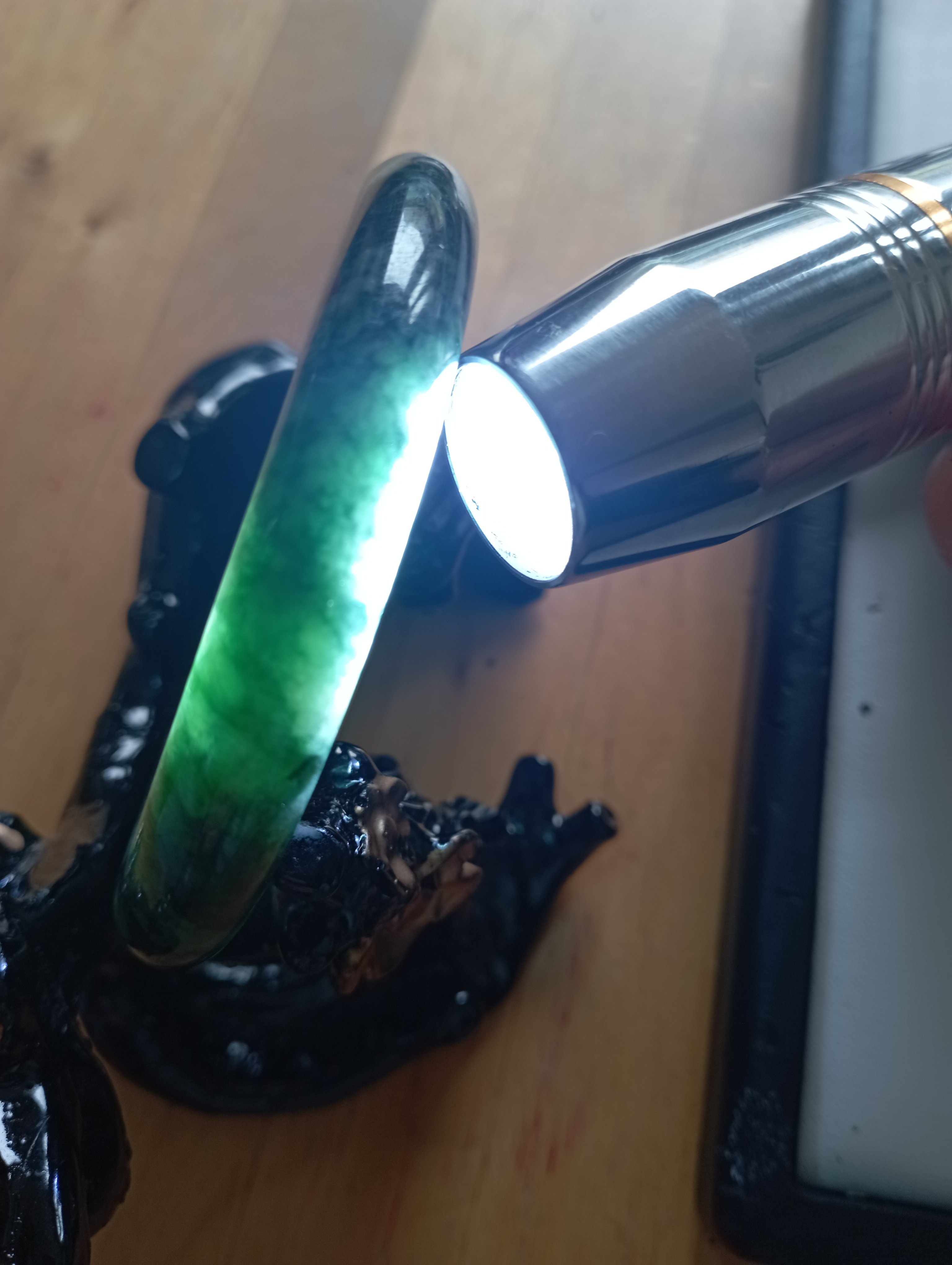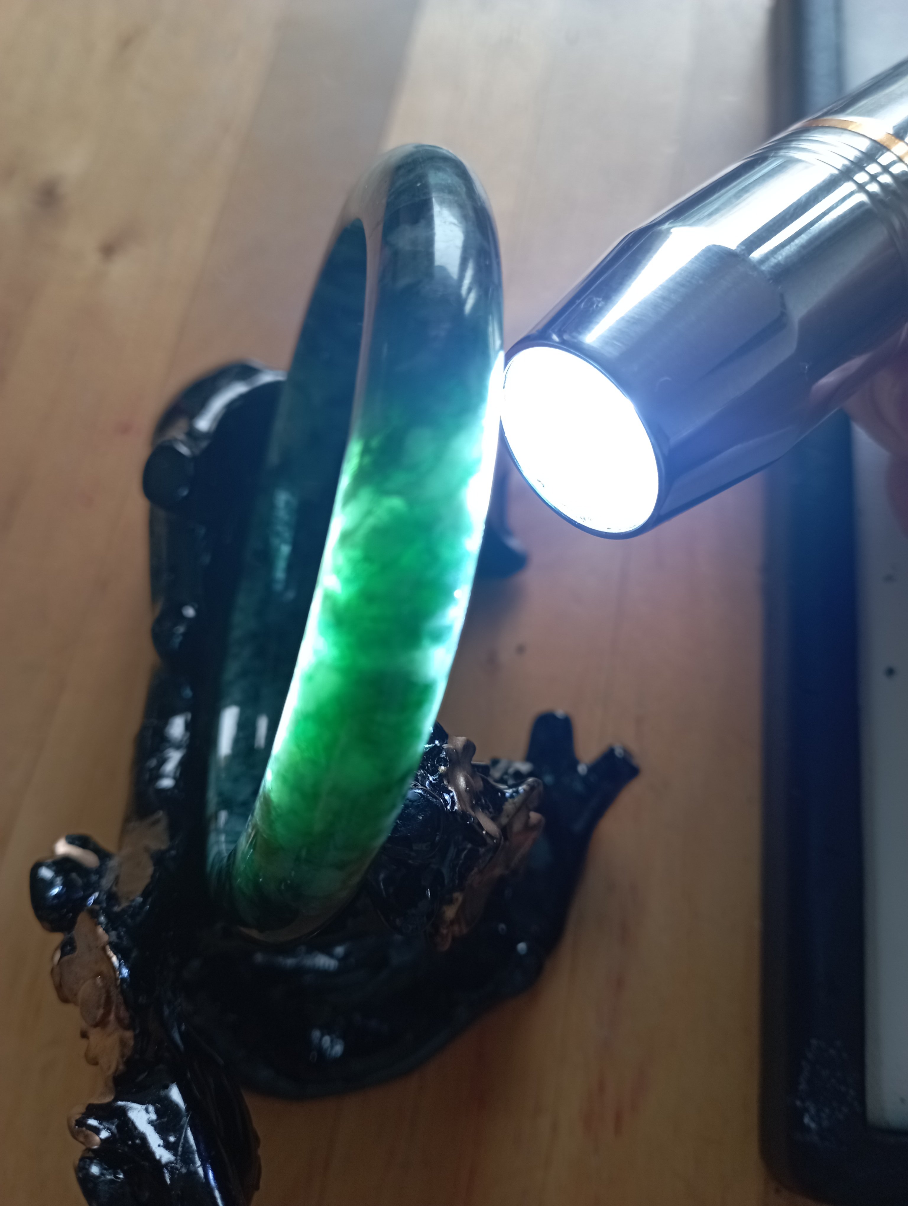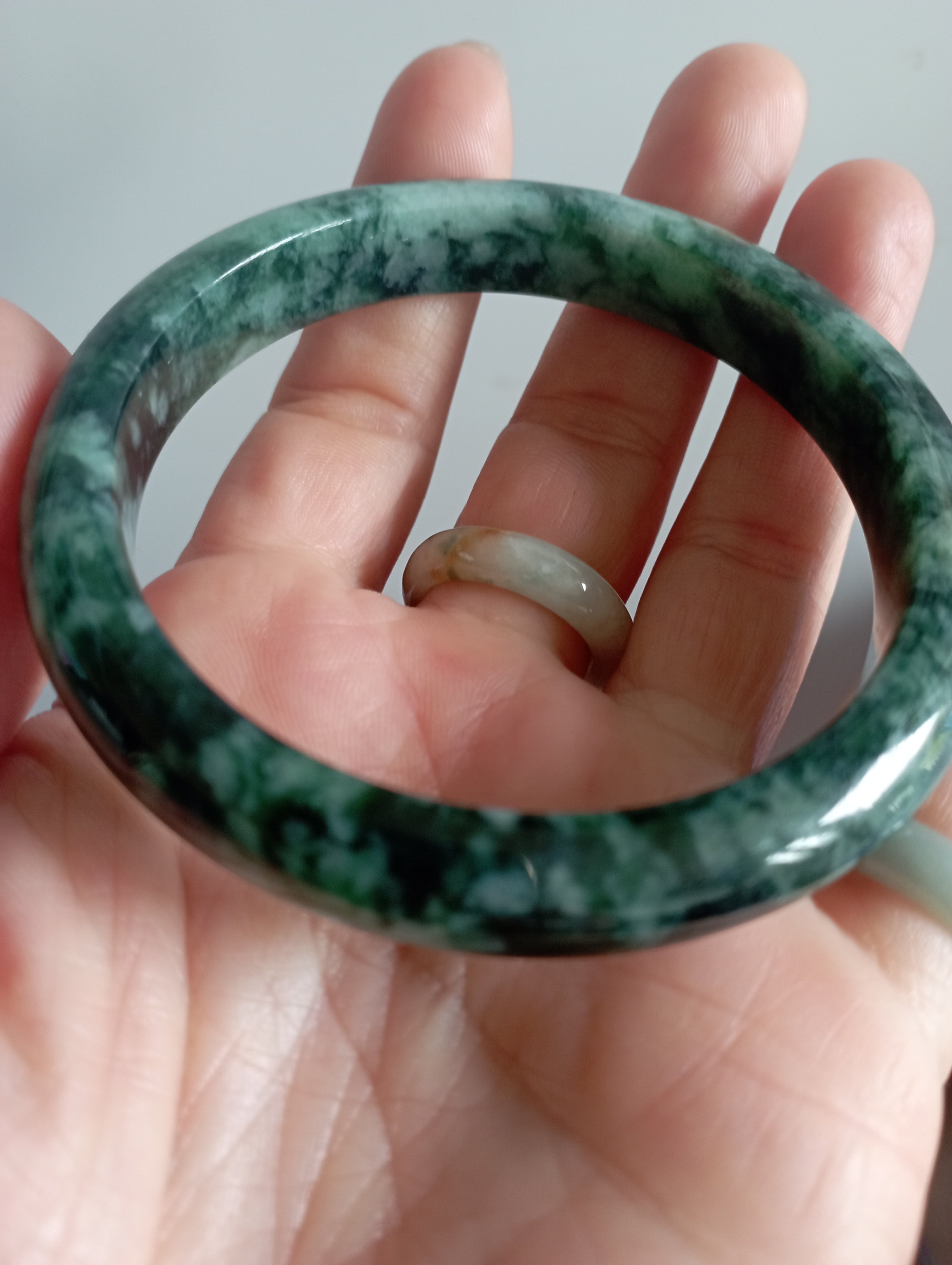 Vibrant green when the light shines through, the bangle itself is dark green with darker green blooms all over, measures 58.1 X 10.1 X 7.7mm, weighs 41.65g. Comes with a certificate of authenticity £198