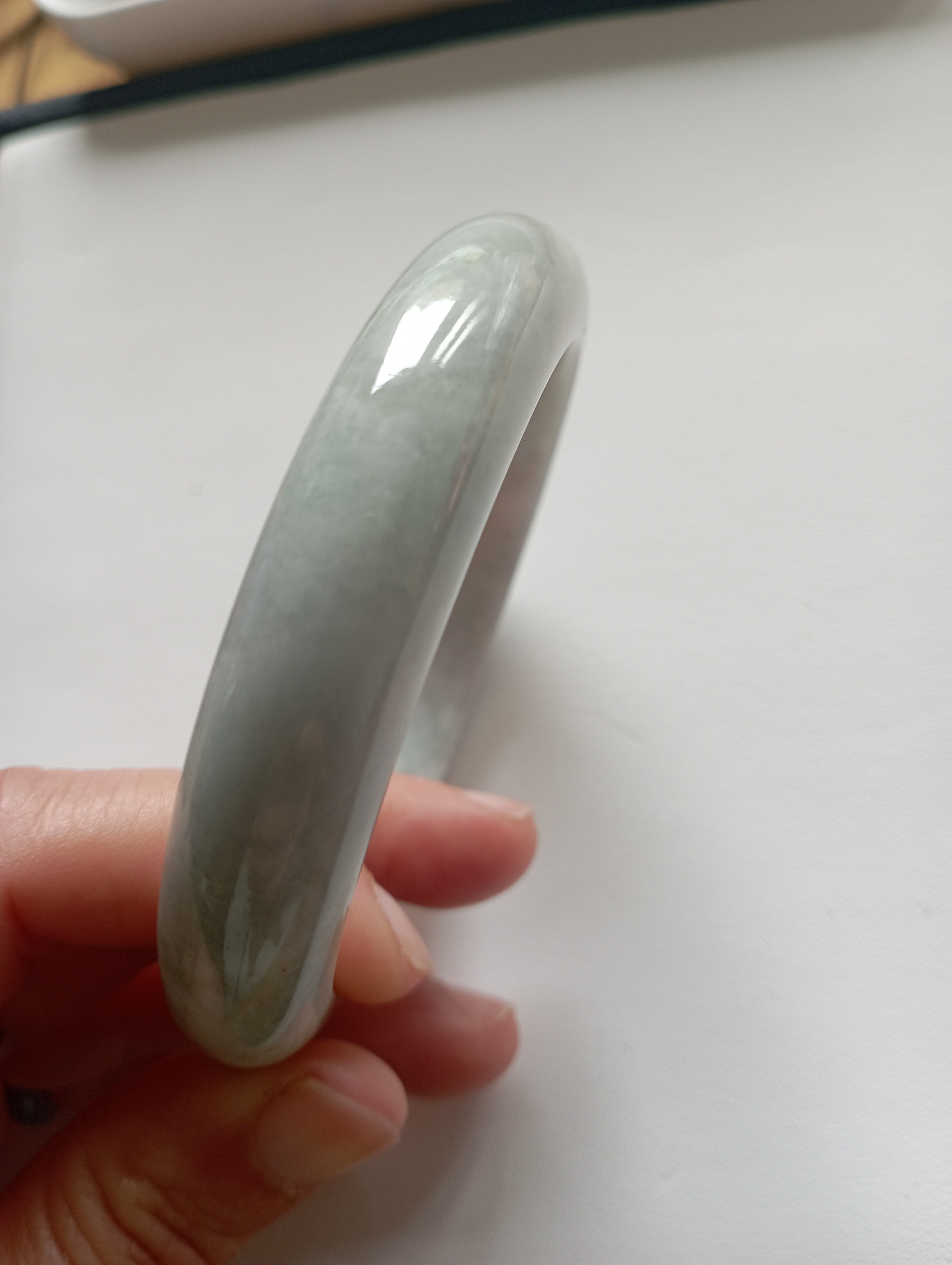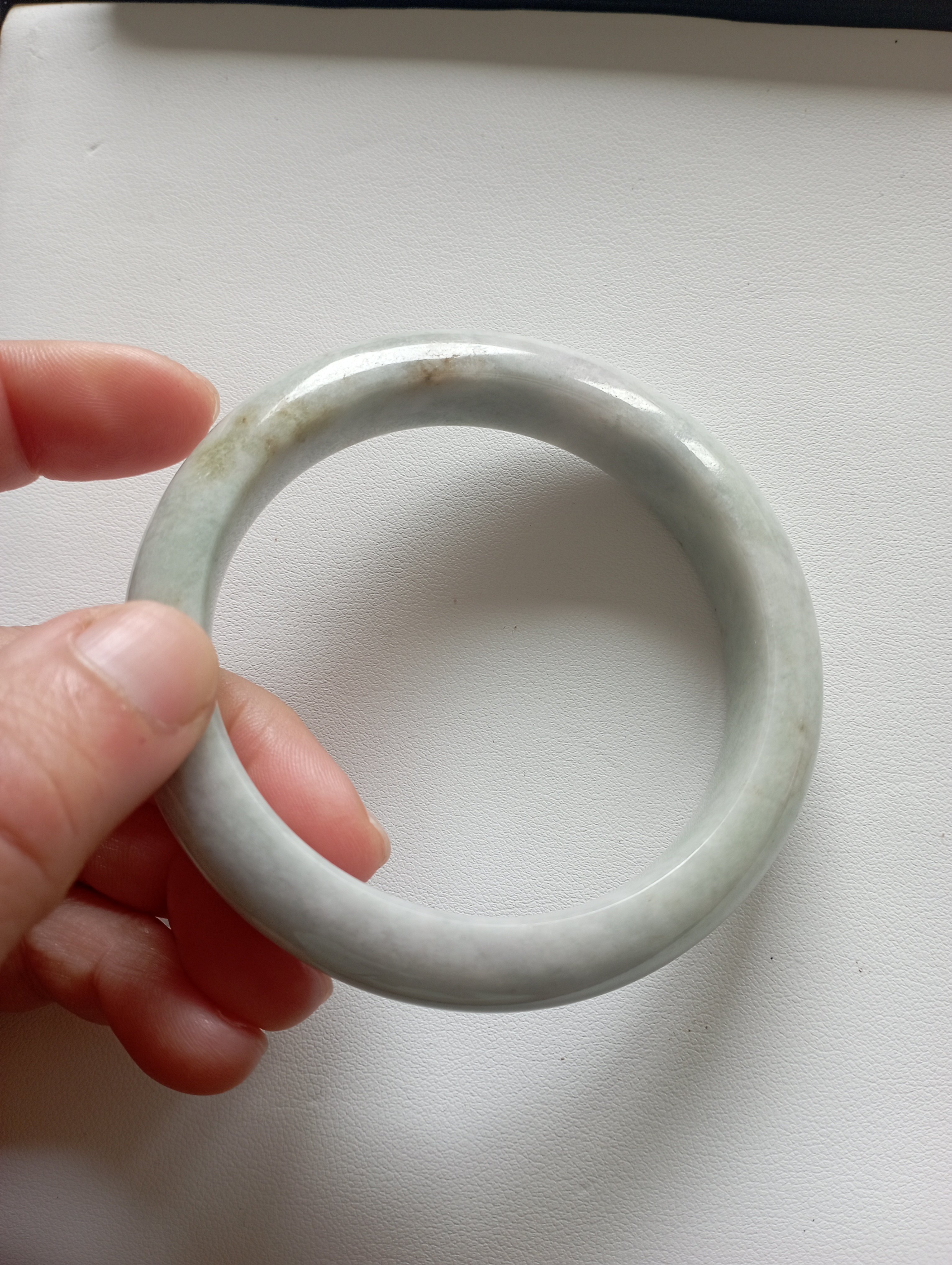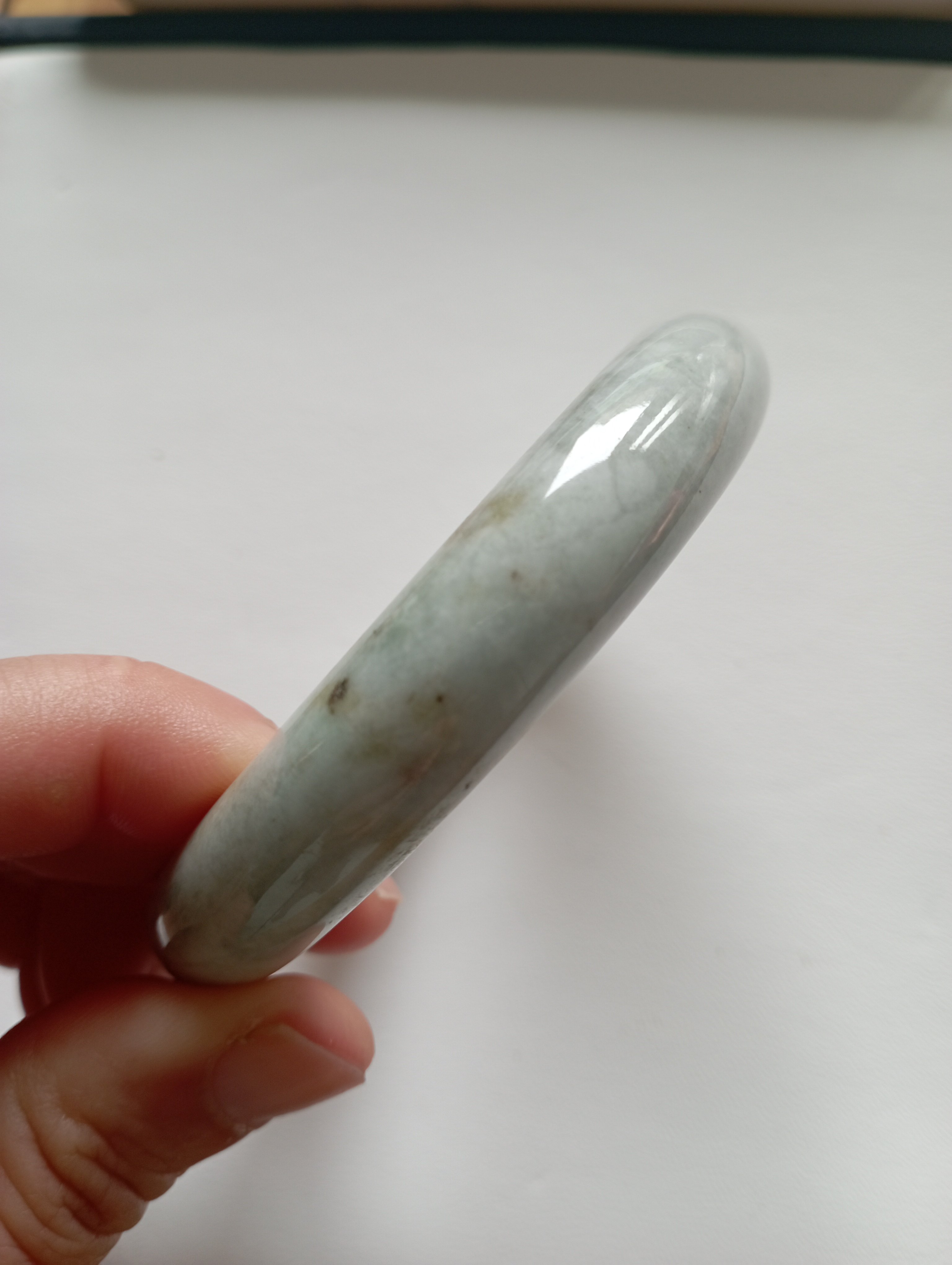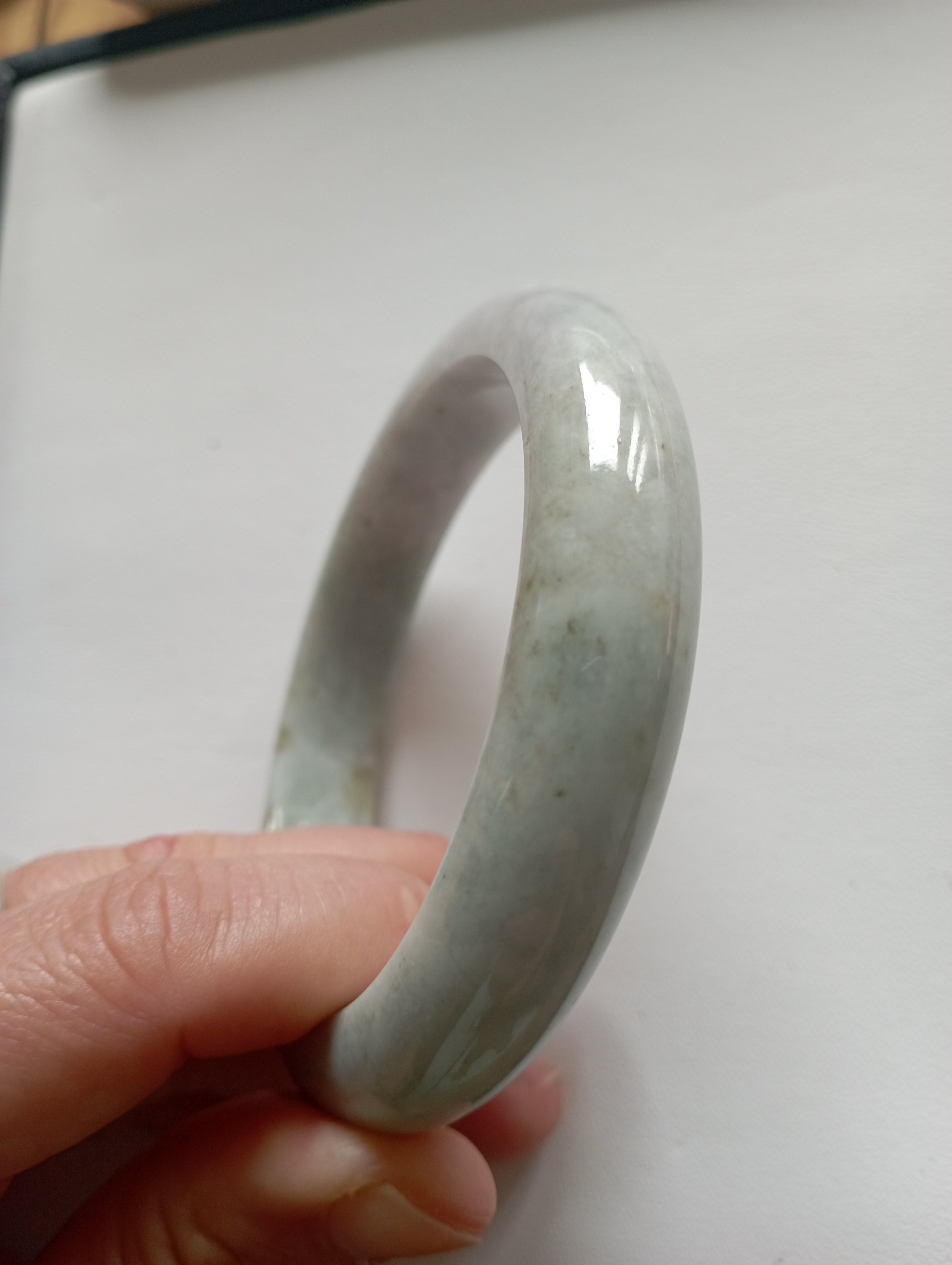 Bargain bangle in a very light green colour with yellow patches. Measures 61.8 X 12.8 x 9.7mm, should fit a small 62mm. Weighs 73.49g and comes with a certificate of authenticity £139