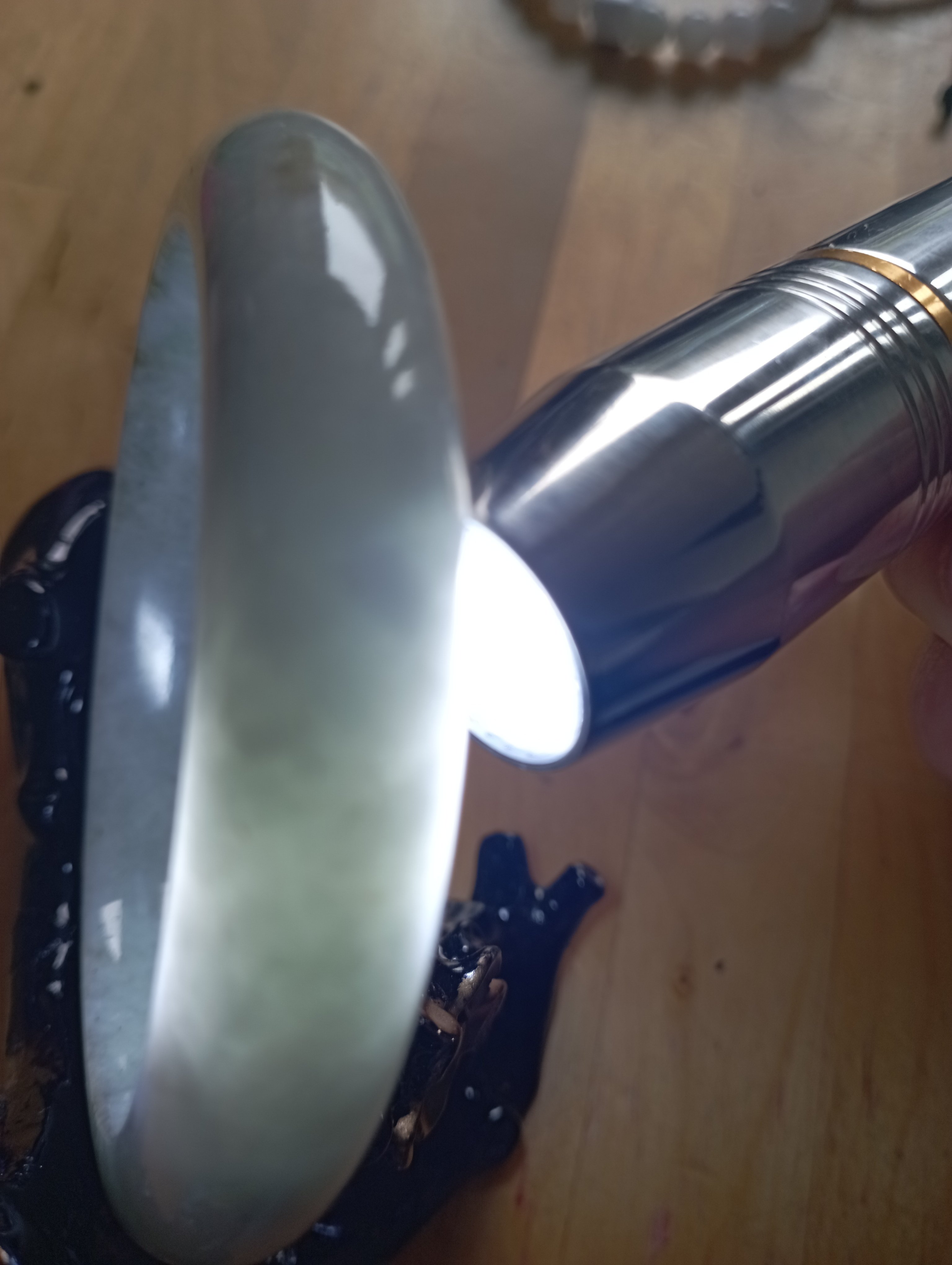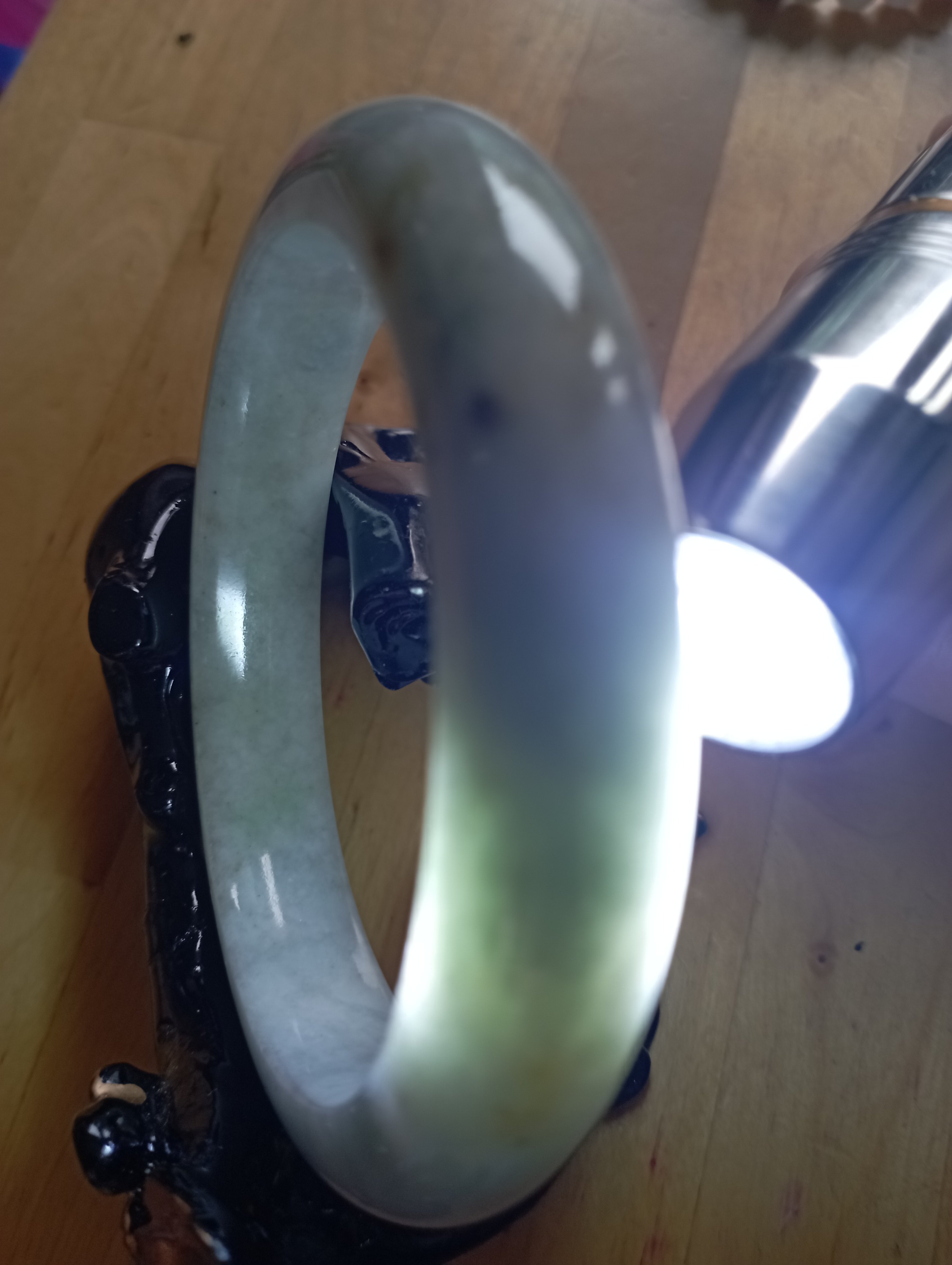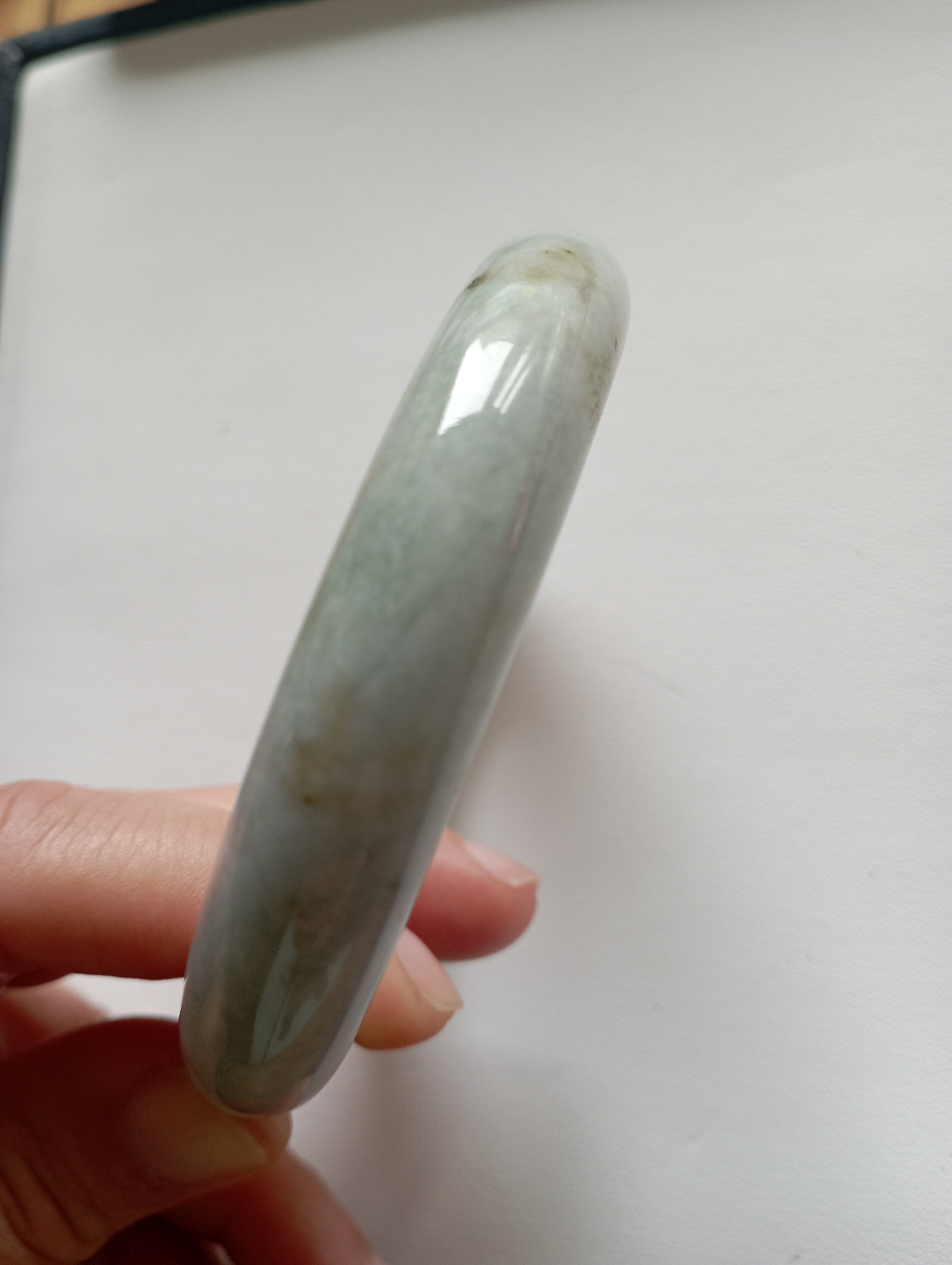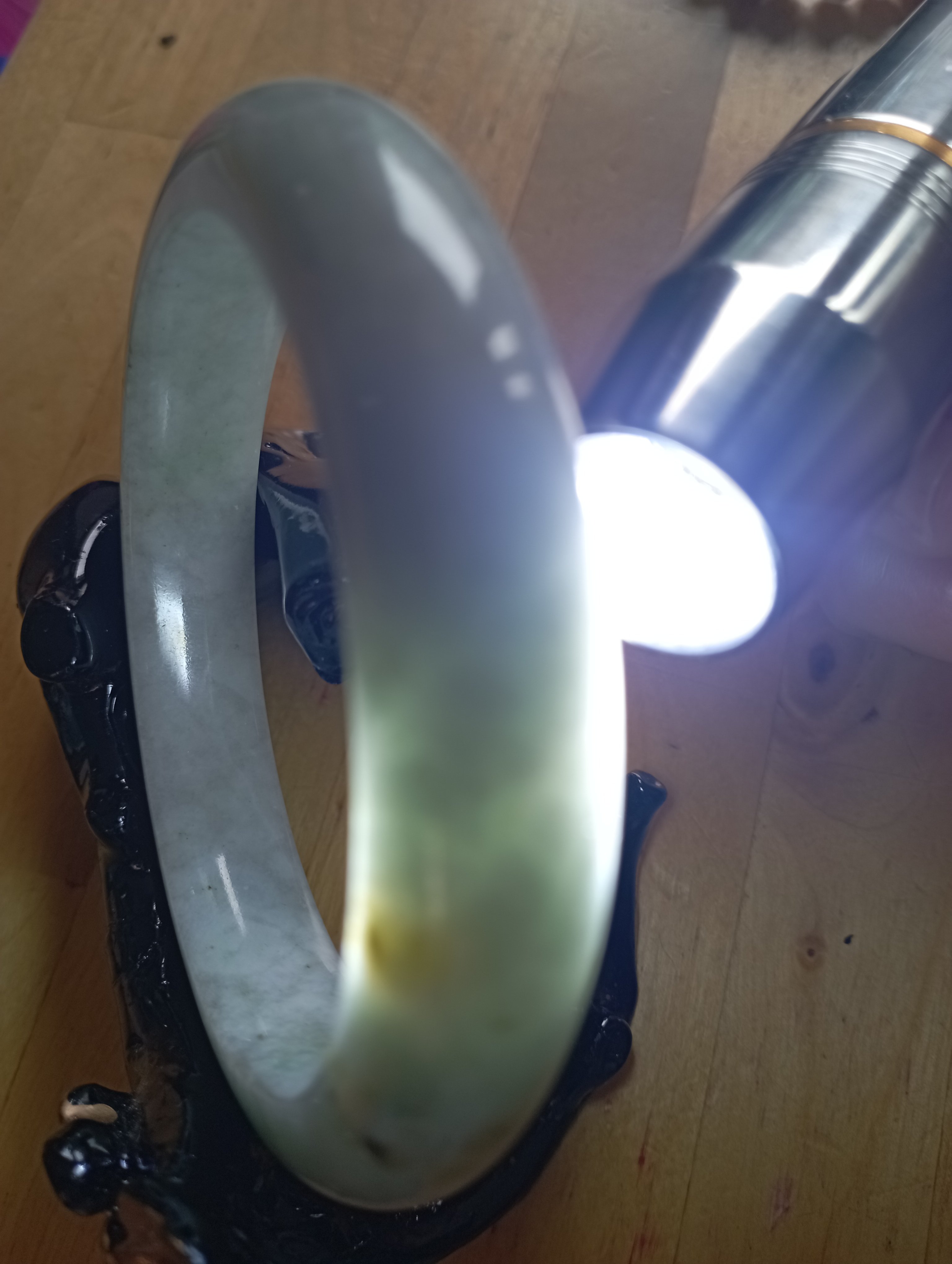 Bargain bangle in a very light green colour with yellow patches. Measures 61.8 X 12.8 x 9.7mm, should fit a small 62mm. Weighs 73.49g and comes with a certificate of authenticity £139