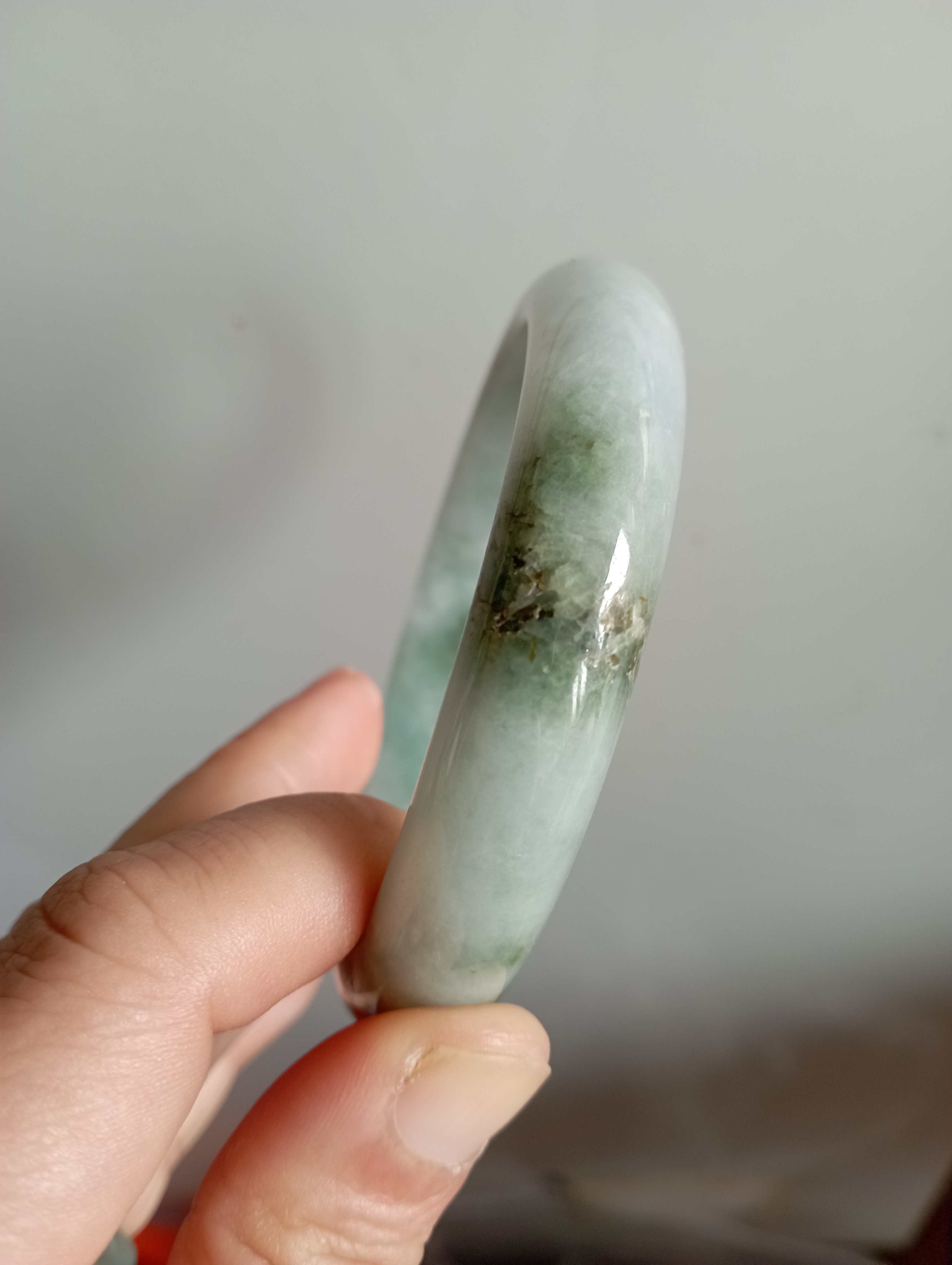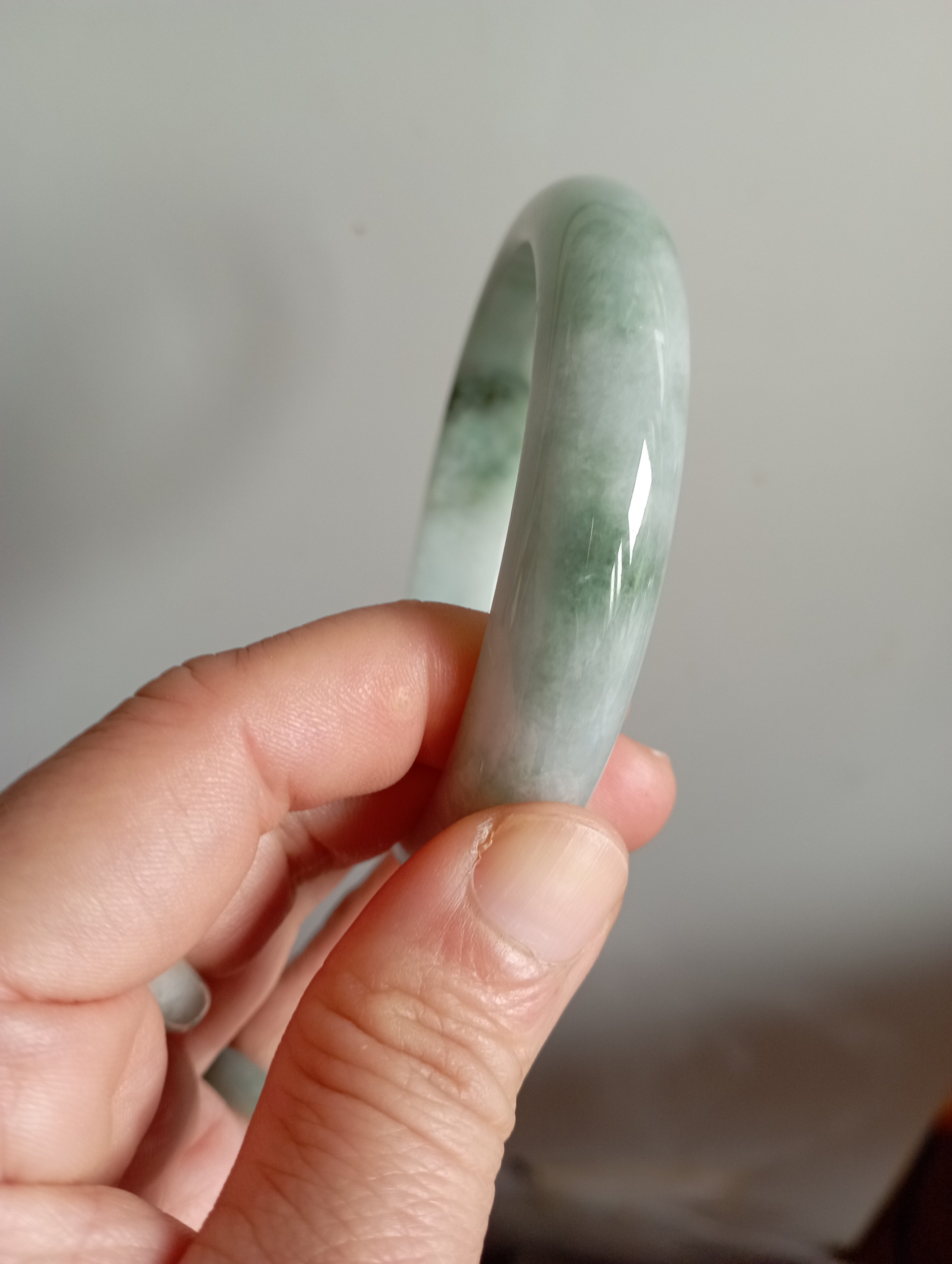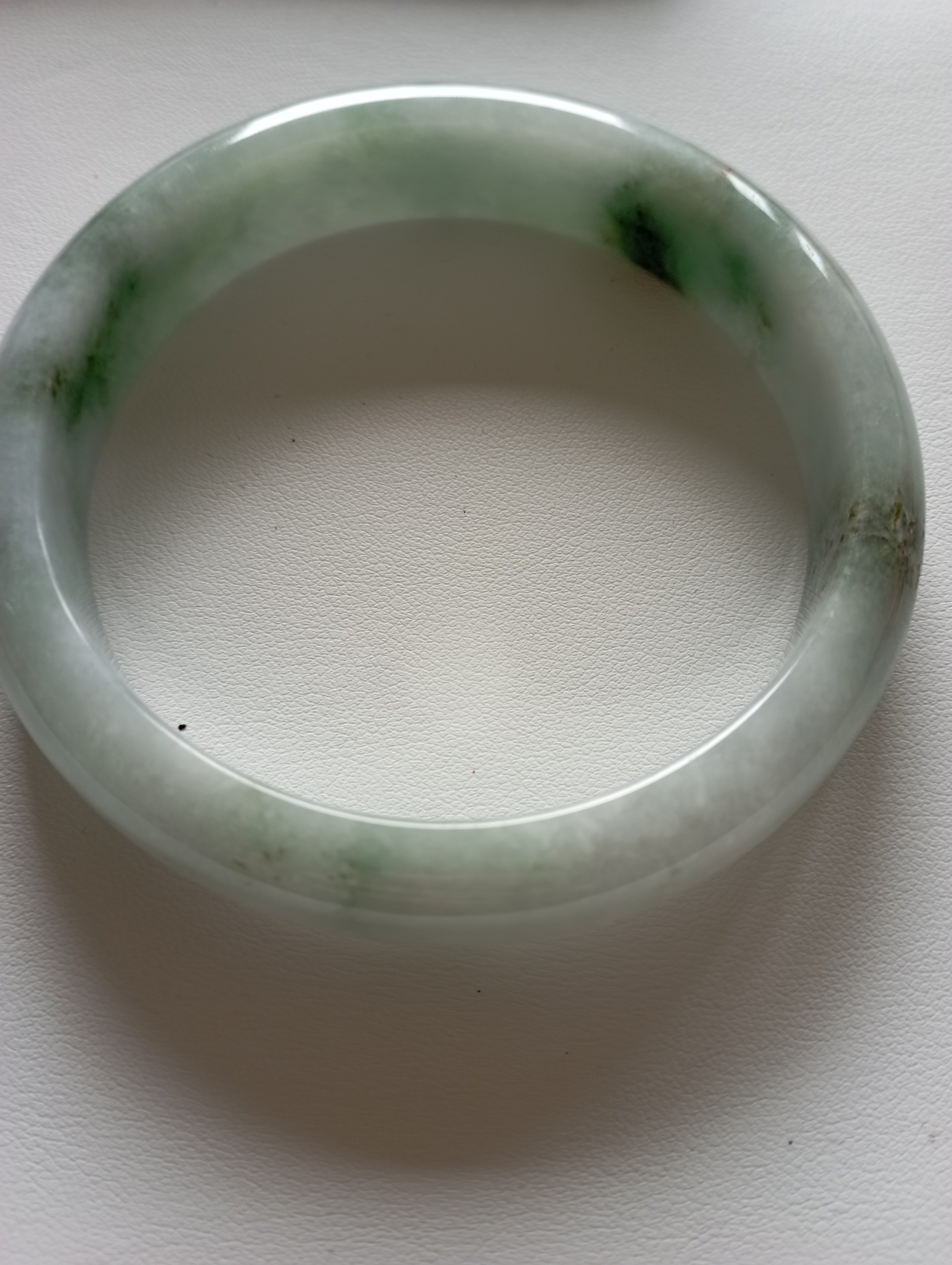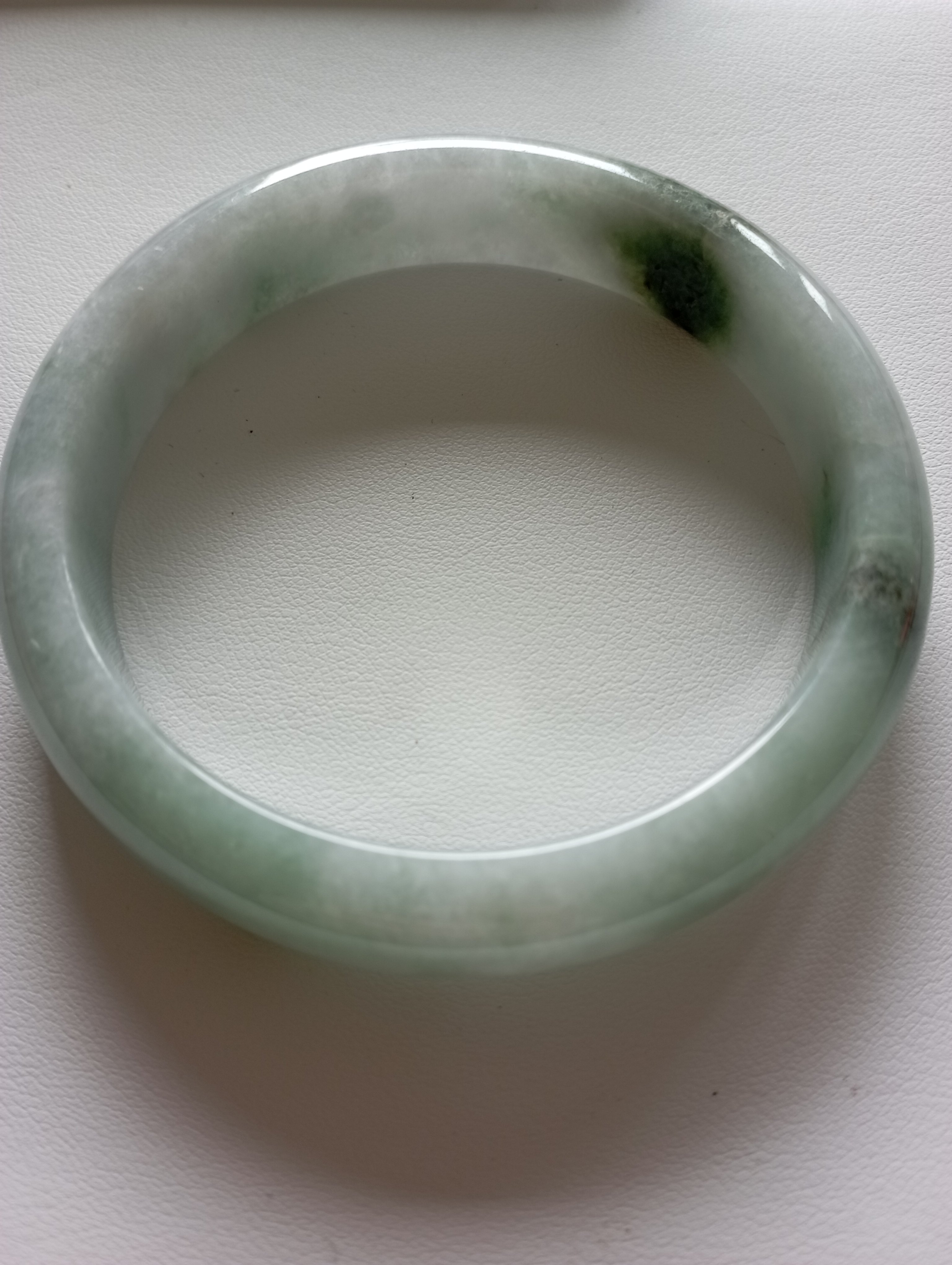 Lovely light green Burmese jadeite bangle with blooms measures 62.8 X 13.2 X 7.4mm, weighs 63.95g. The colour is gorgeous and it is icy. The only imperfection is that the skin of the stone is on the surface of the jade bangle(see last photo) which does not affect usage. Comes with a certificate of authenticity, £159