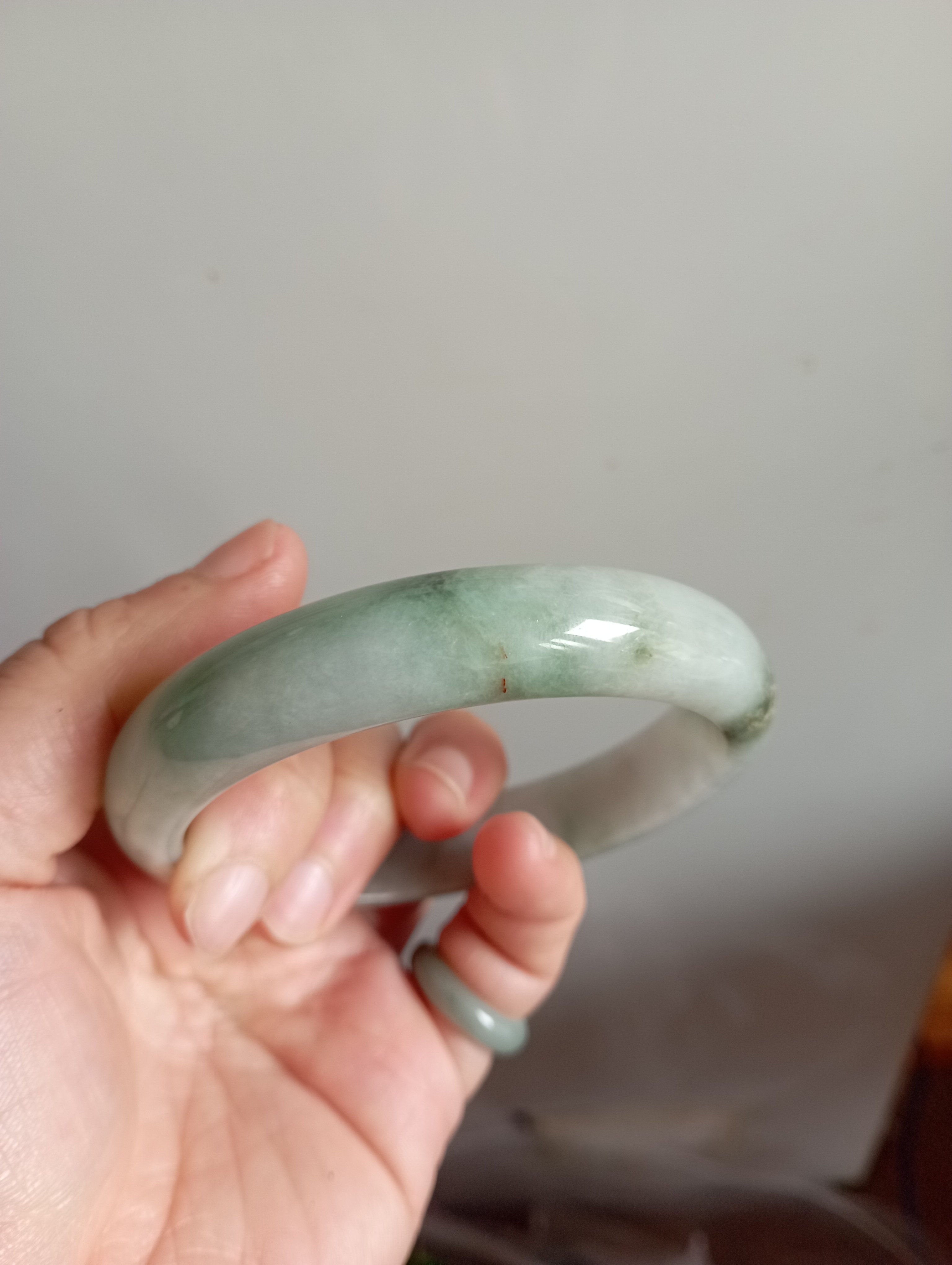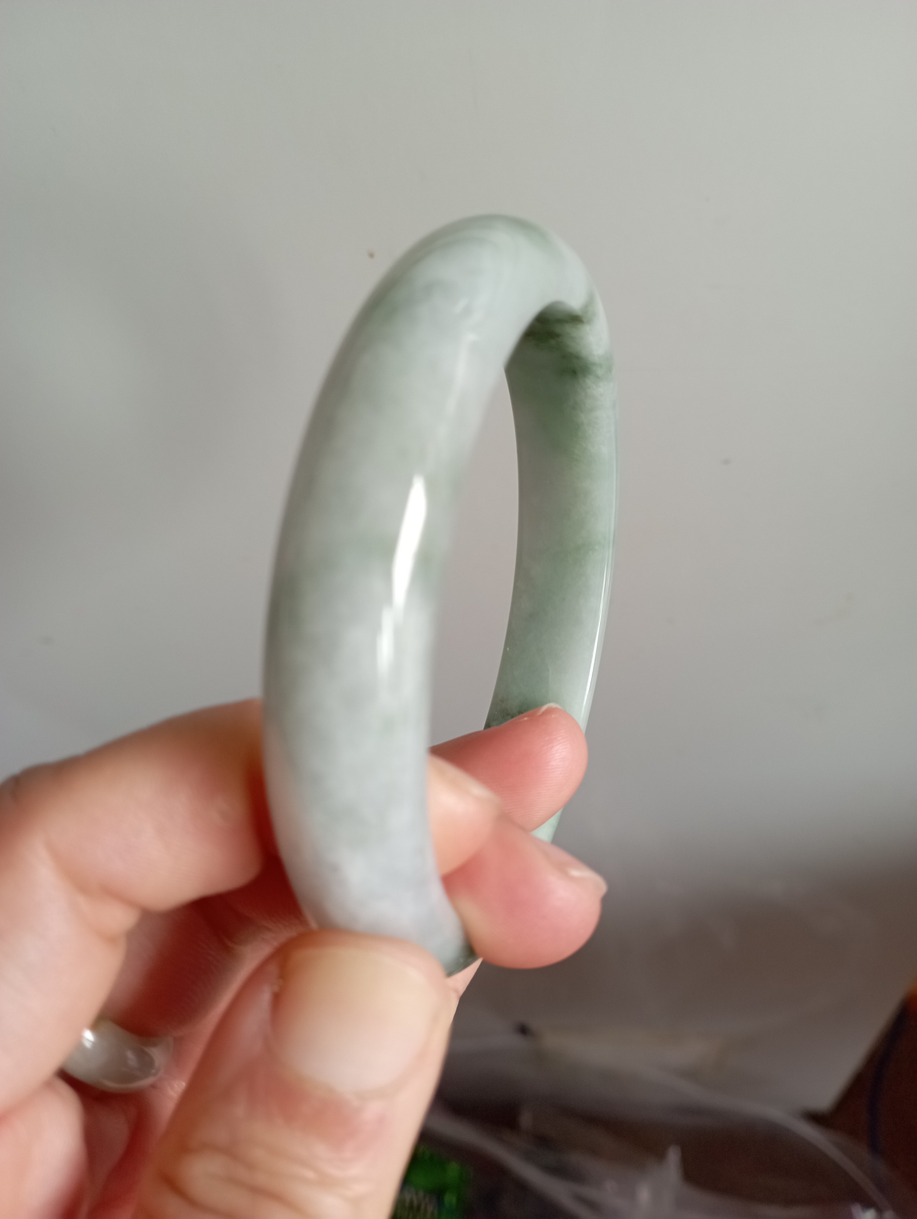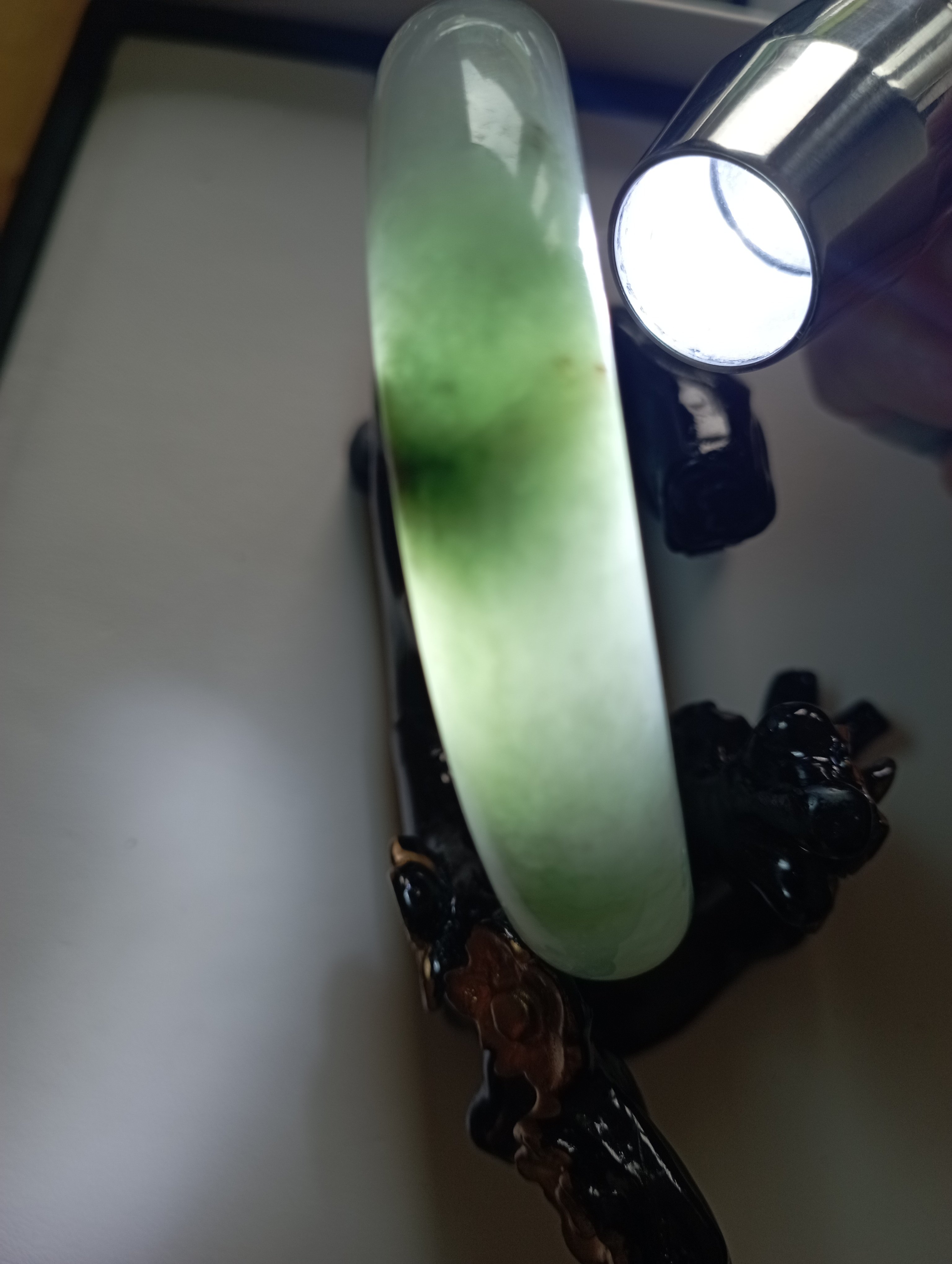 Lovely light green Burmese jadeite bangle with blooms measures 62.8 X 13.2 X 7.4mm, weighs 63.95g. The colour is gorgeous and it is icy. The only imperfection is that the skin of the stone is on the surface of the jade bangle(see last photo) which does not affect usage. Comes with a certificate of authenticity, £159