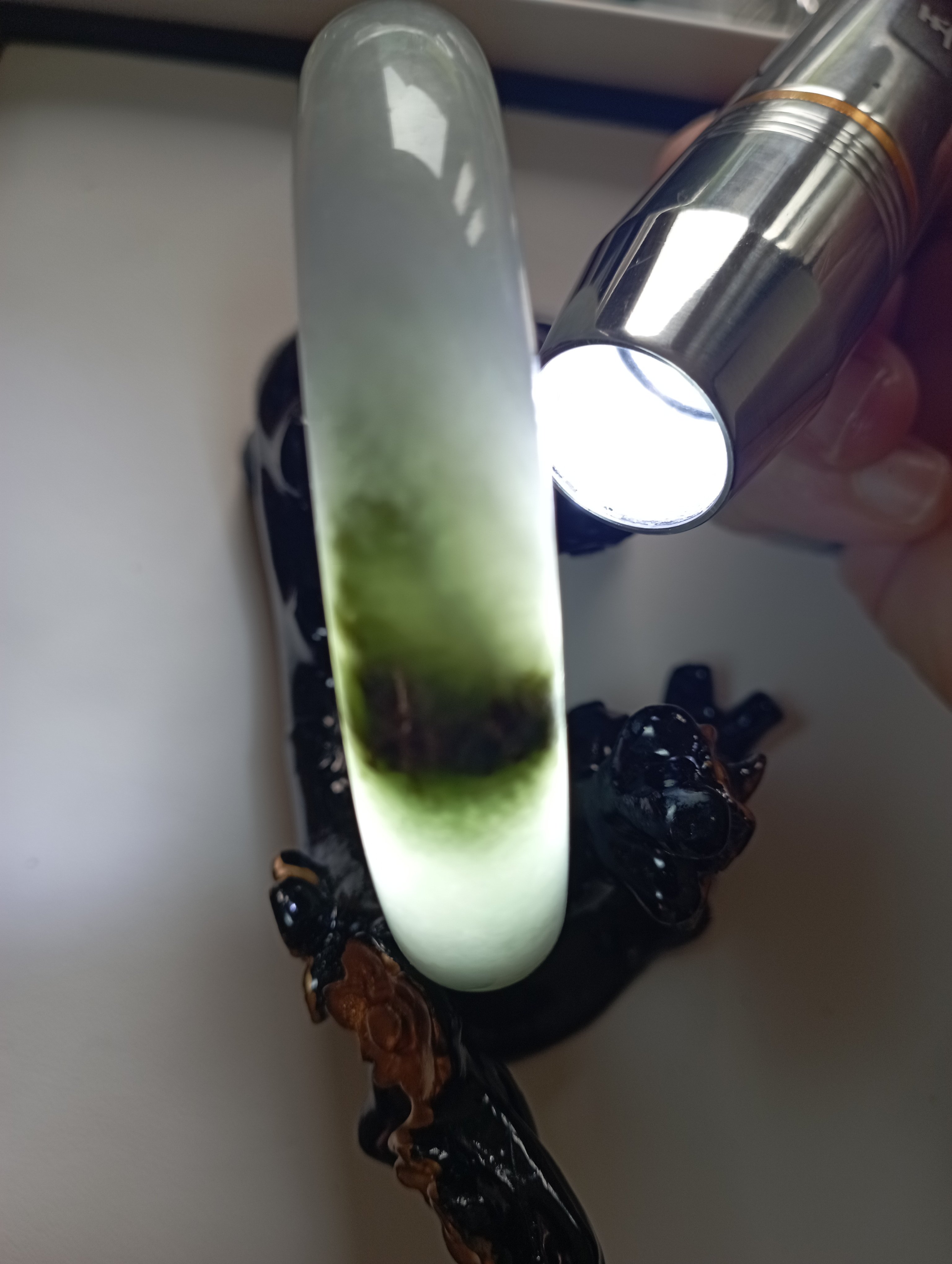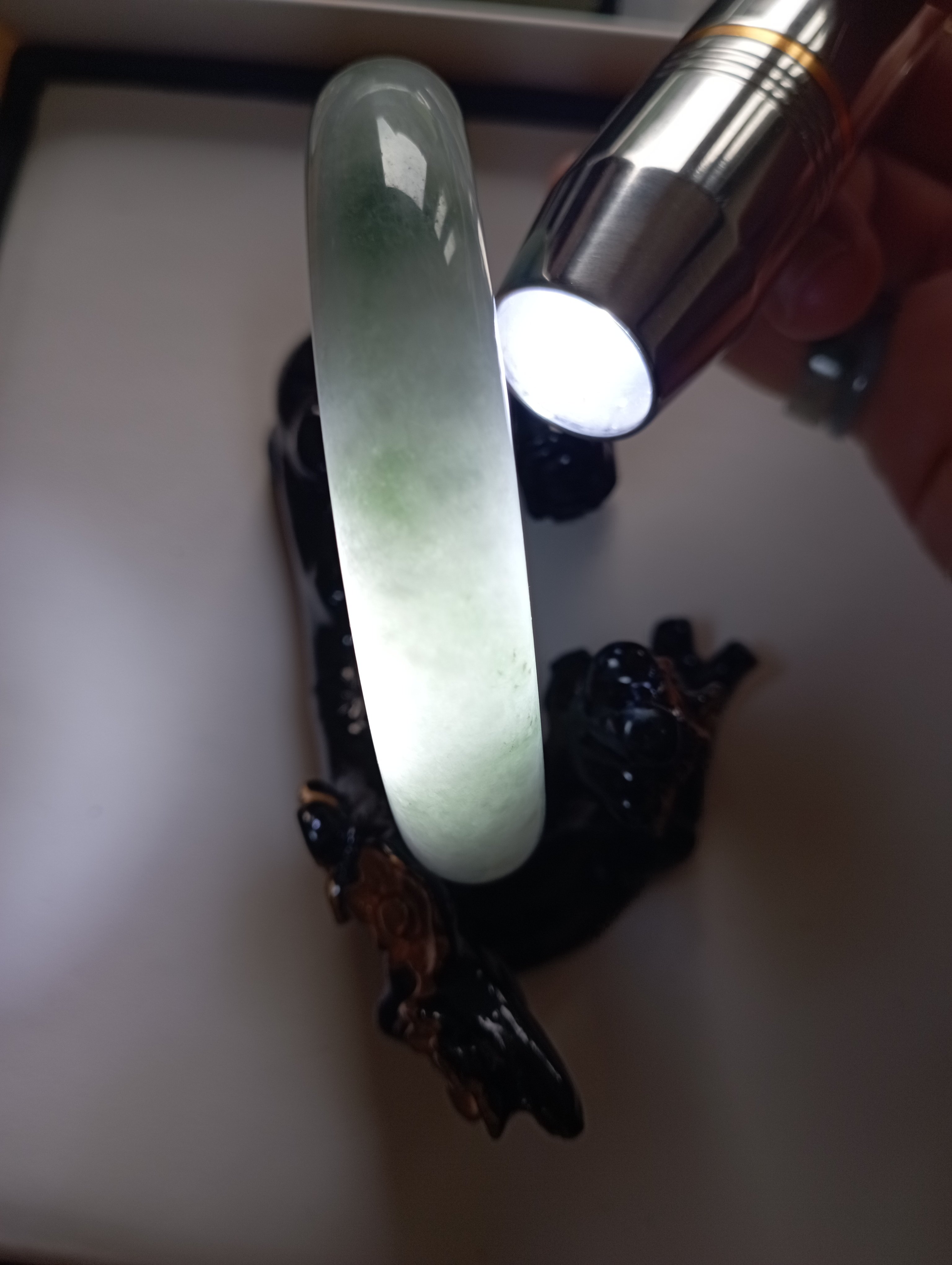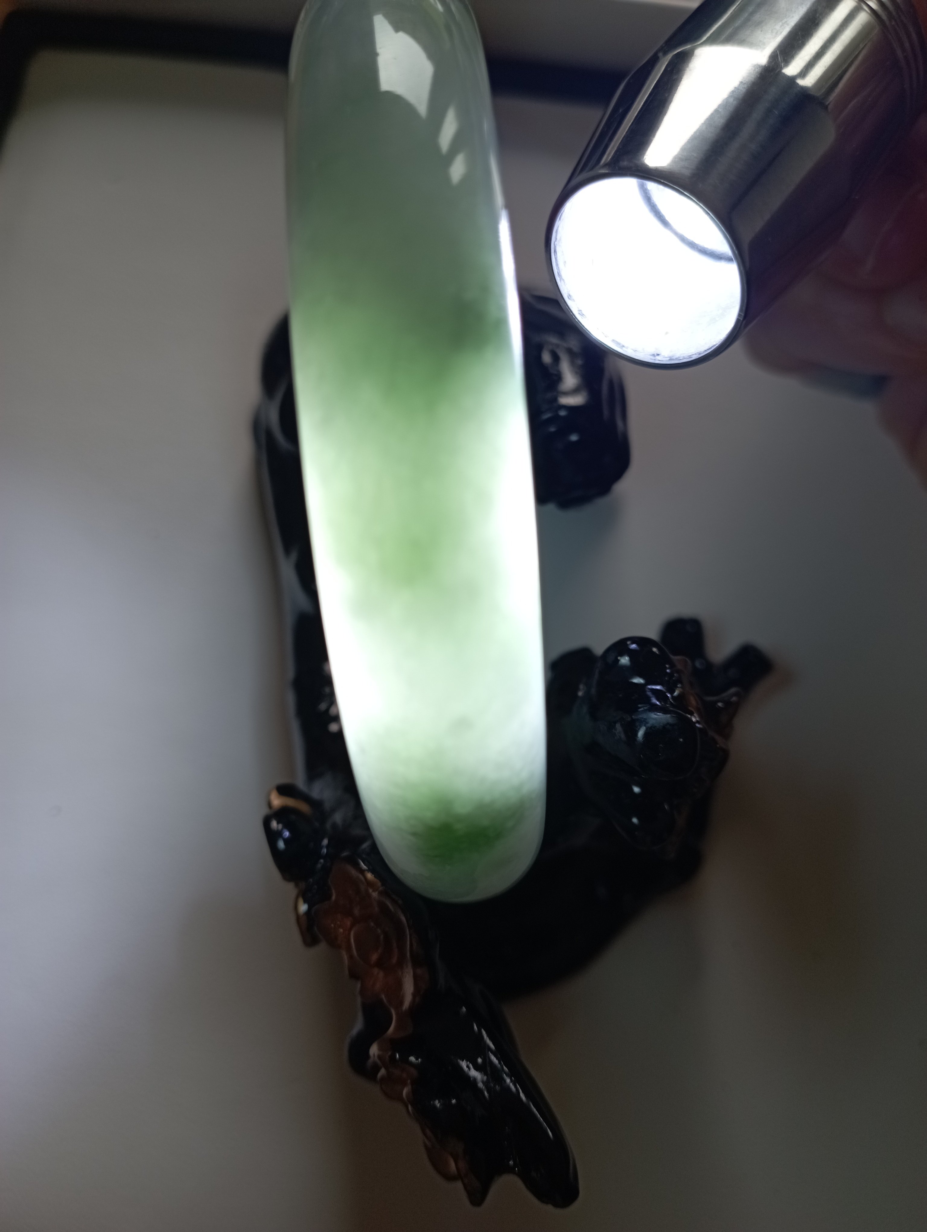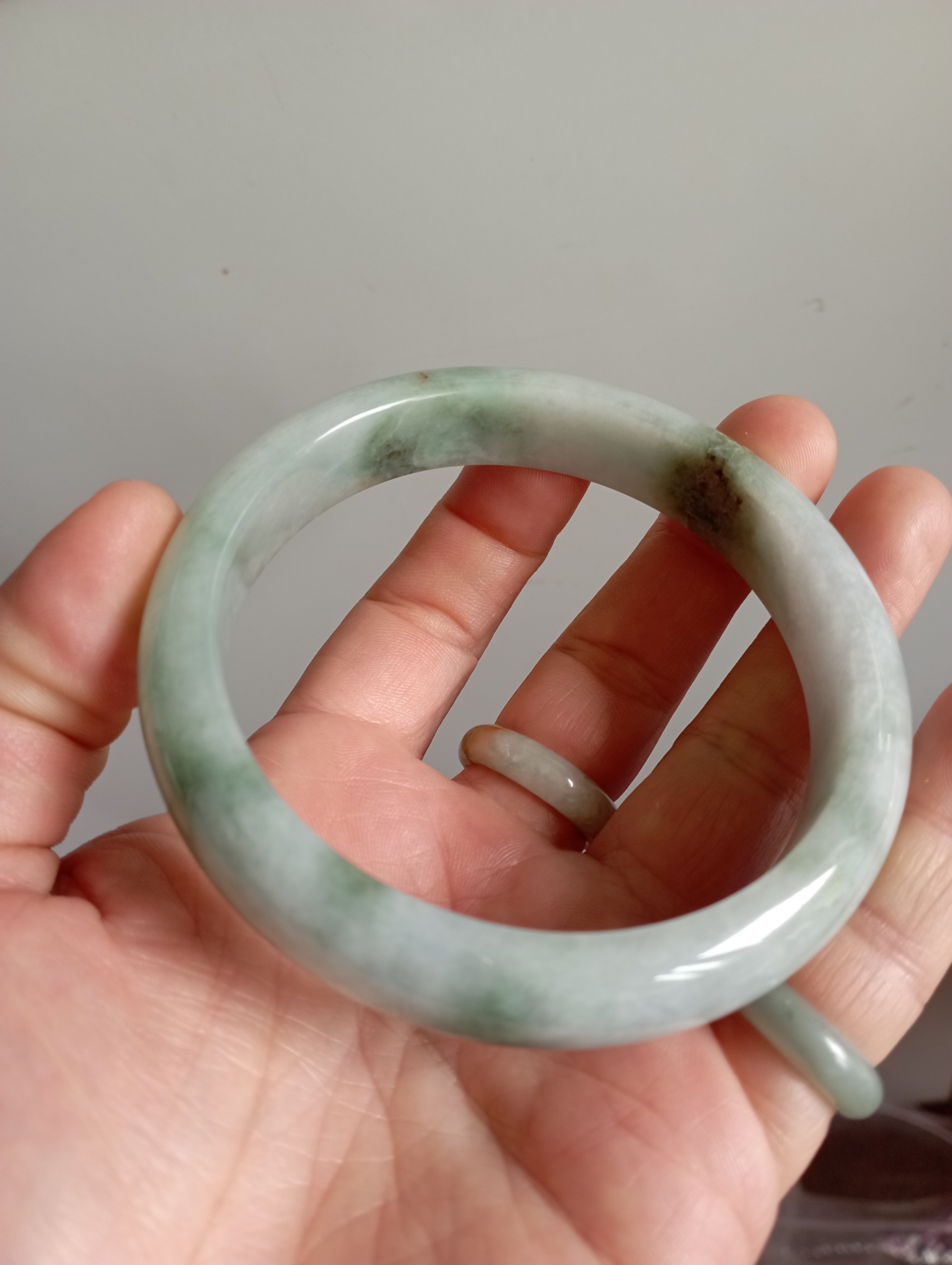 Lovely light green Burmese jadeite bangle with blooms measures 62.8 X 13.2 X 7.4mm, weighs 63.95g. The colour is gorgeous and it is icy. The only imperfection is that the skin of the stone is on the surface of the jade bangle(see last photo) which does not affect usage. Comes with a certificate of authenticity, £159