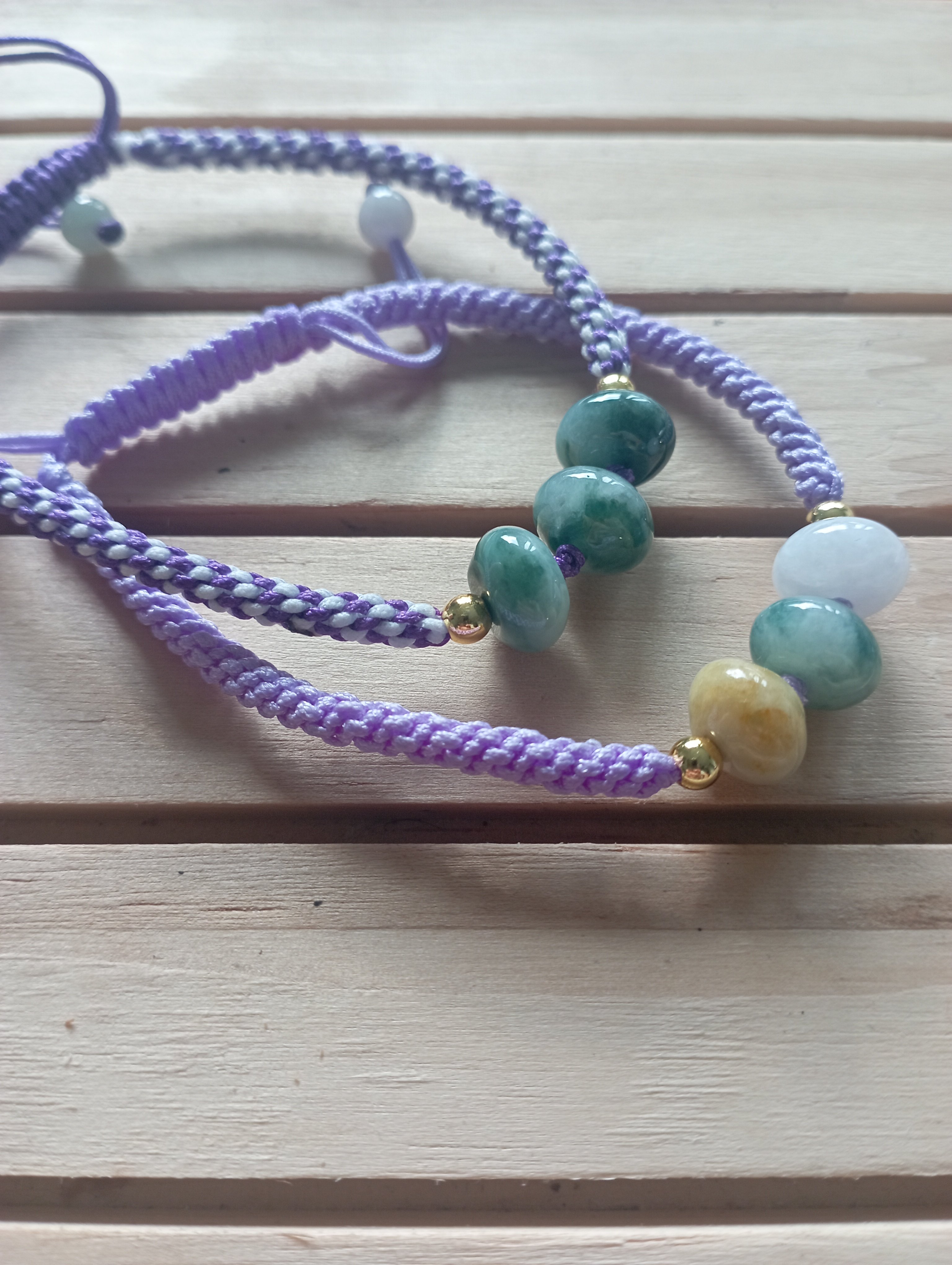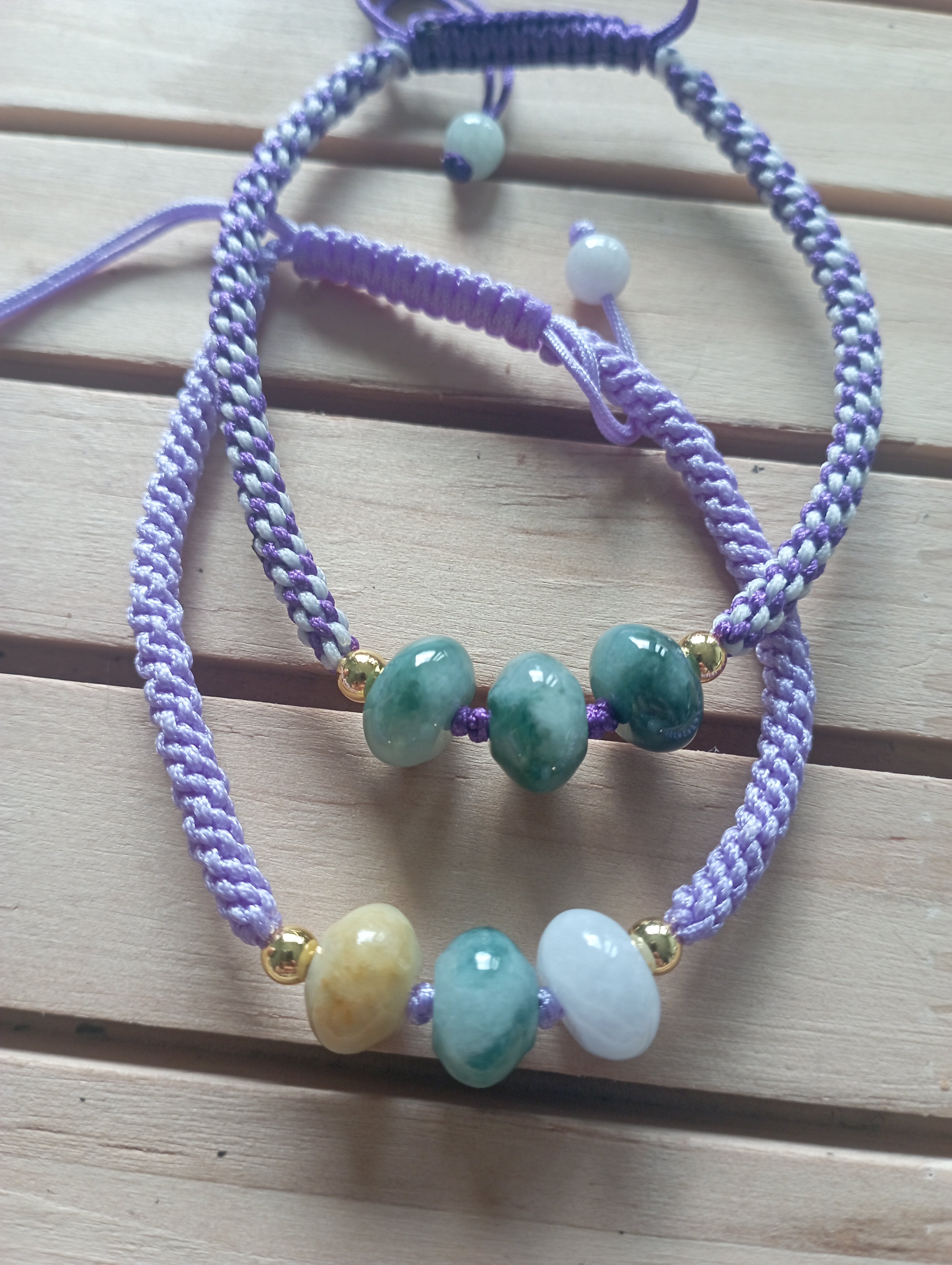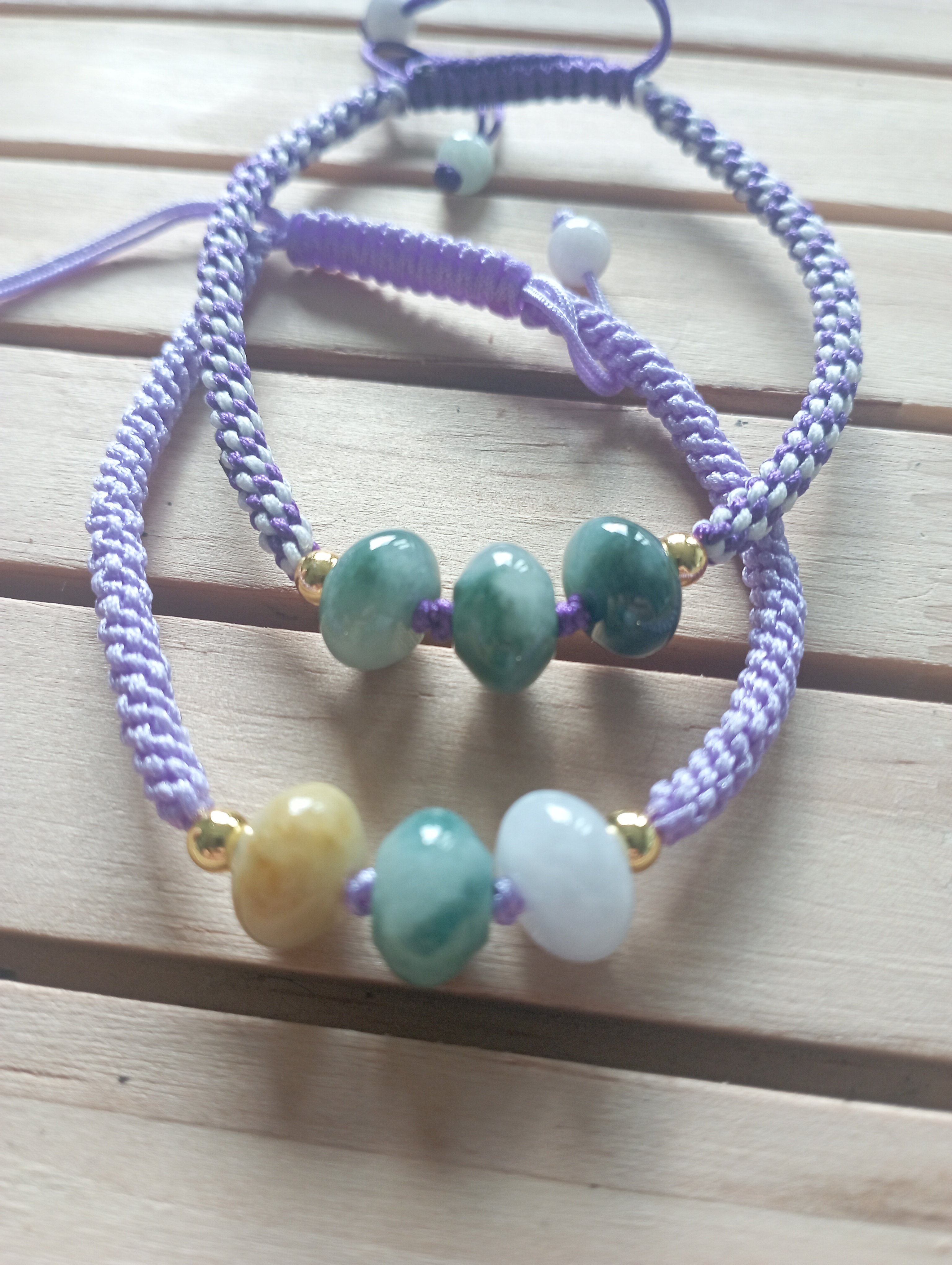Made of three lovely colour Burmese jadeites, the purple bracelet is adjustable and looks so pretty. They are suitable for everyday wear and go with most casual outfit. Each bead measures 10 x 6mm. £18 each