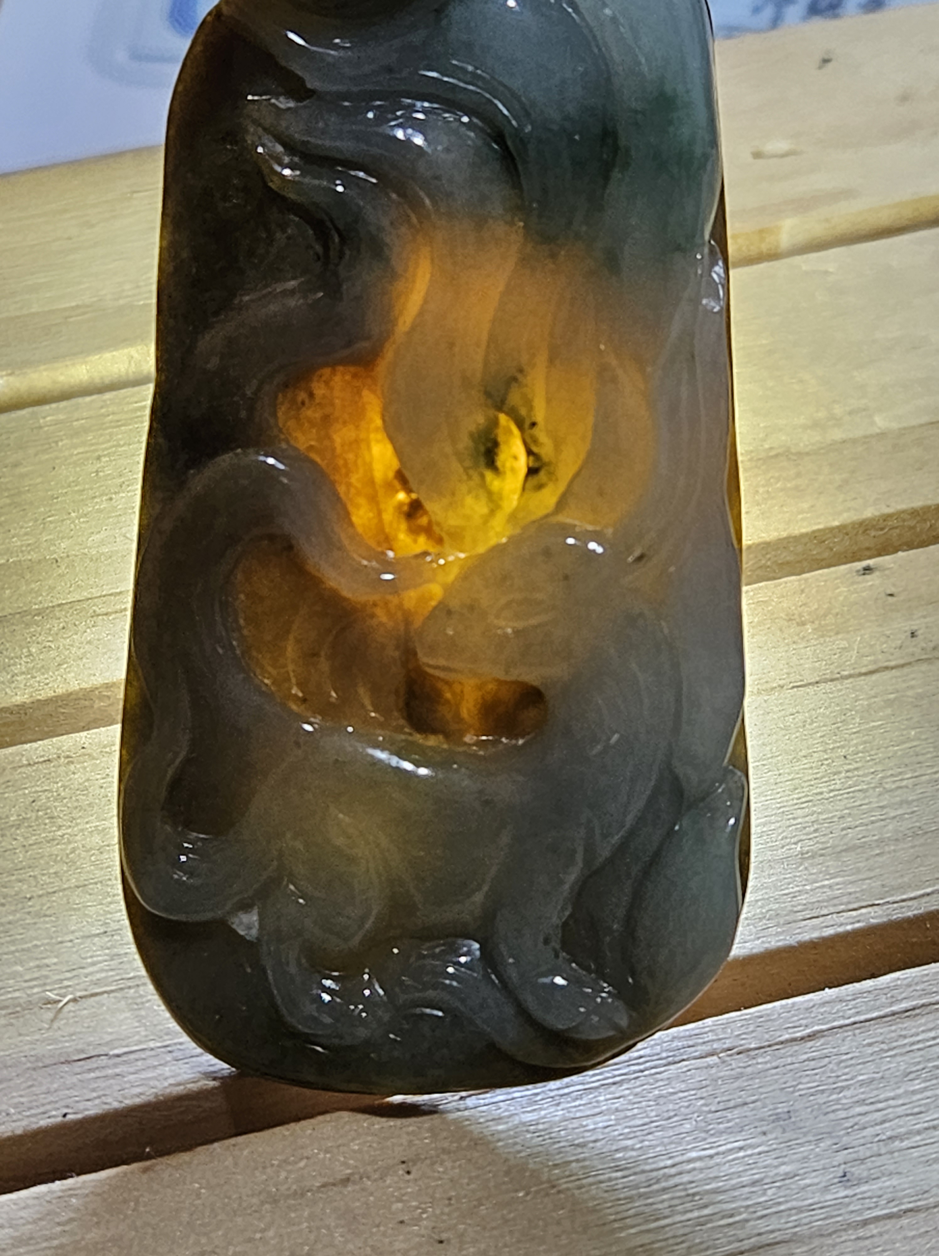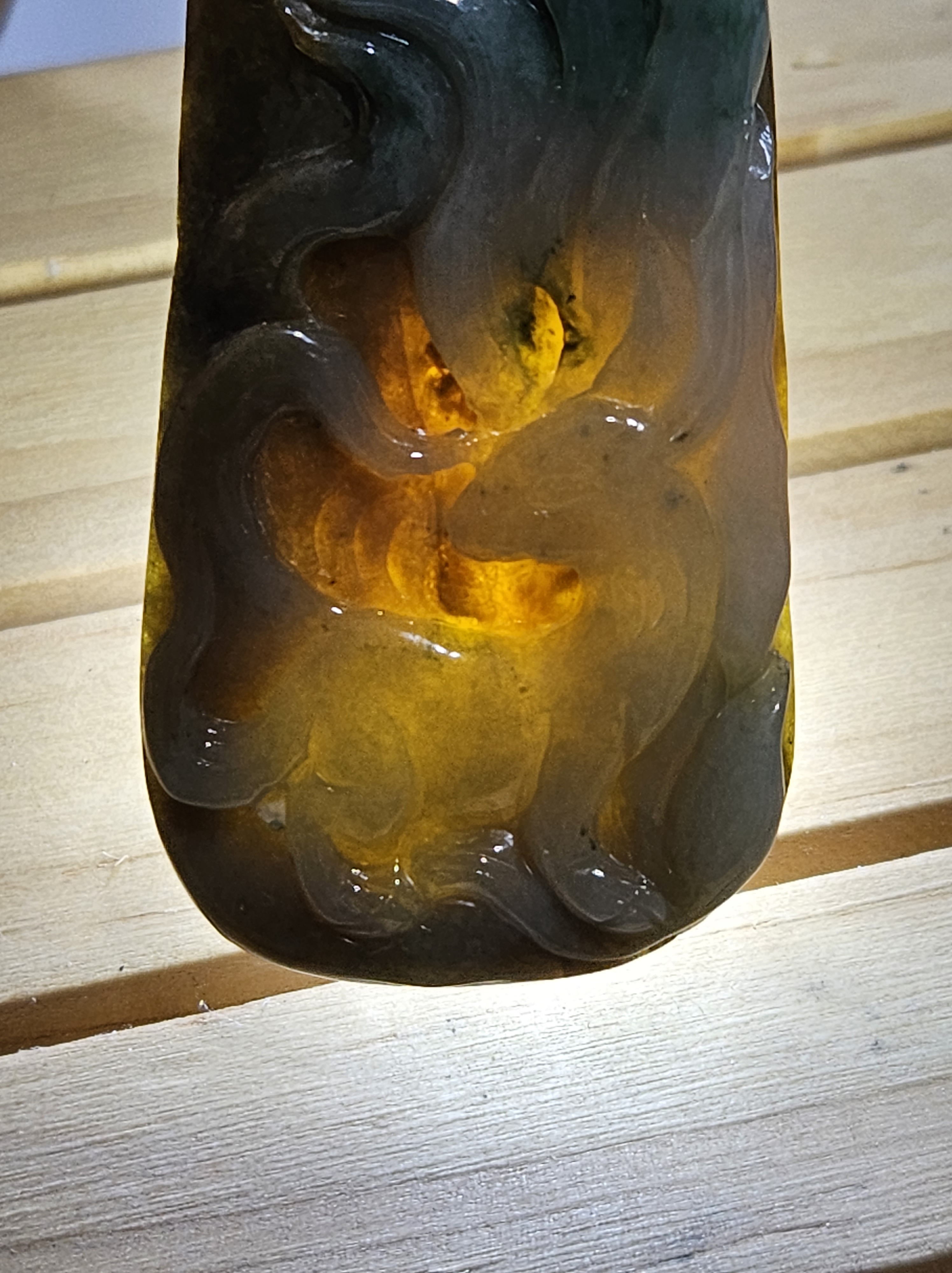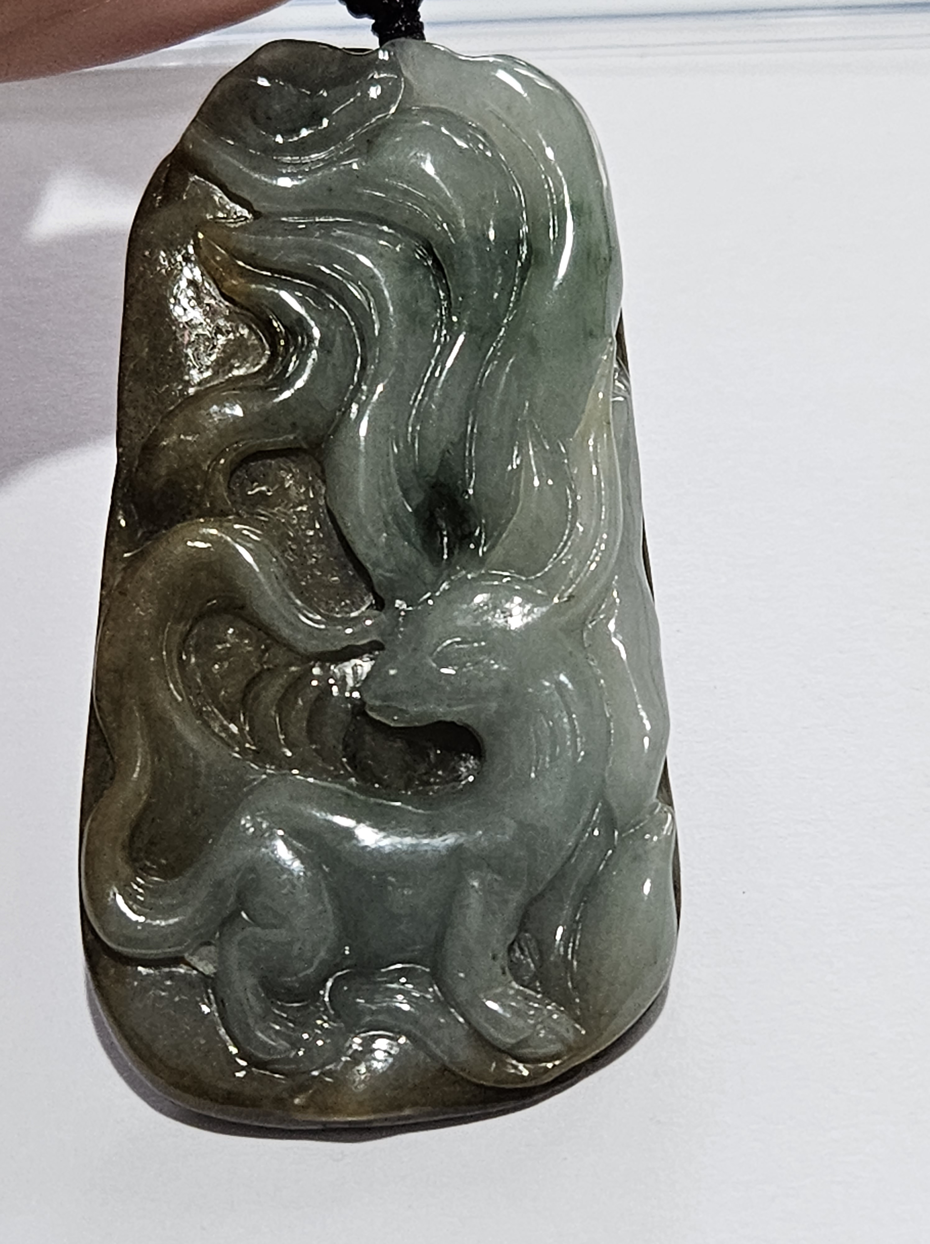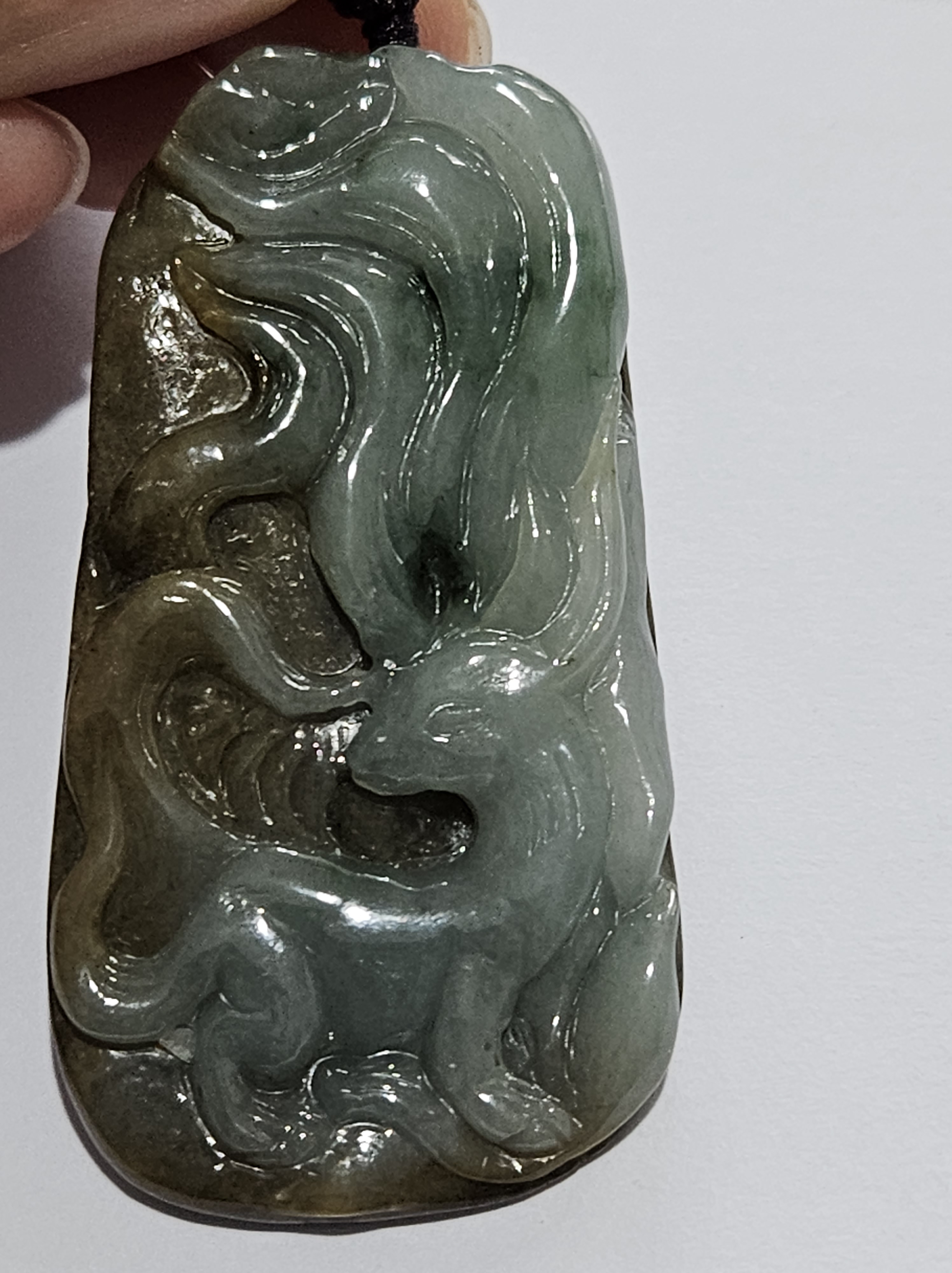 In the case of the 9-tailed fox, it helps to attract love, wealth, friendships, maintain harmony in your life, and repel negative force and people. This pendant is made of natural Burmese jadeite. The back is the smoothen skin of the jadeite stone. When the light goes through, you can see as if the fox is basking in the sun. Measure 61.6 x 32.4 x 9.9mm, excluding the adjustable string chain, comes with a certificate of authenticity £79