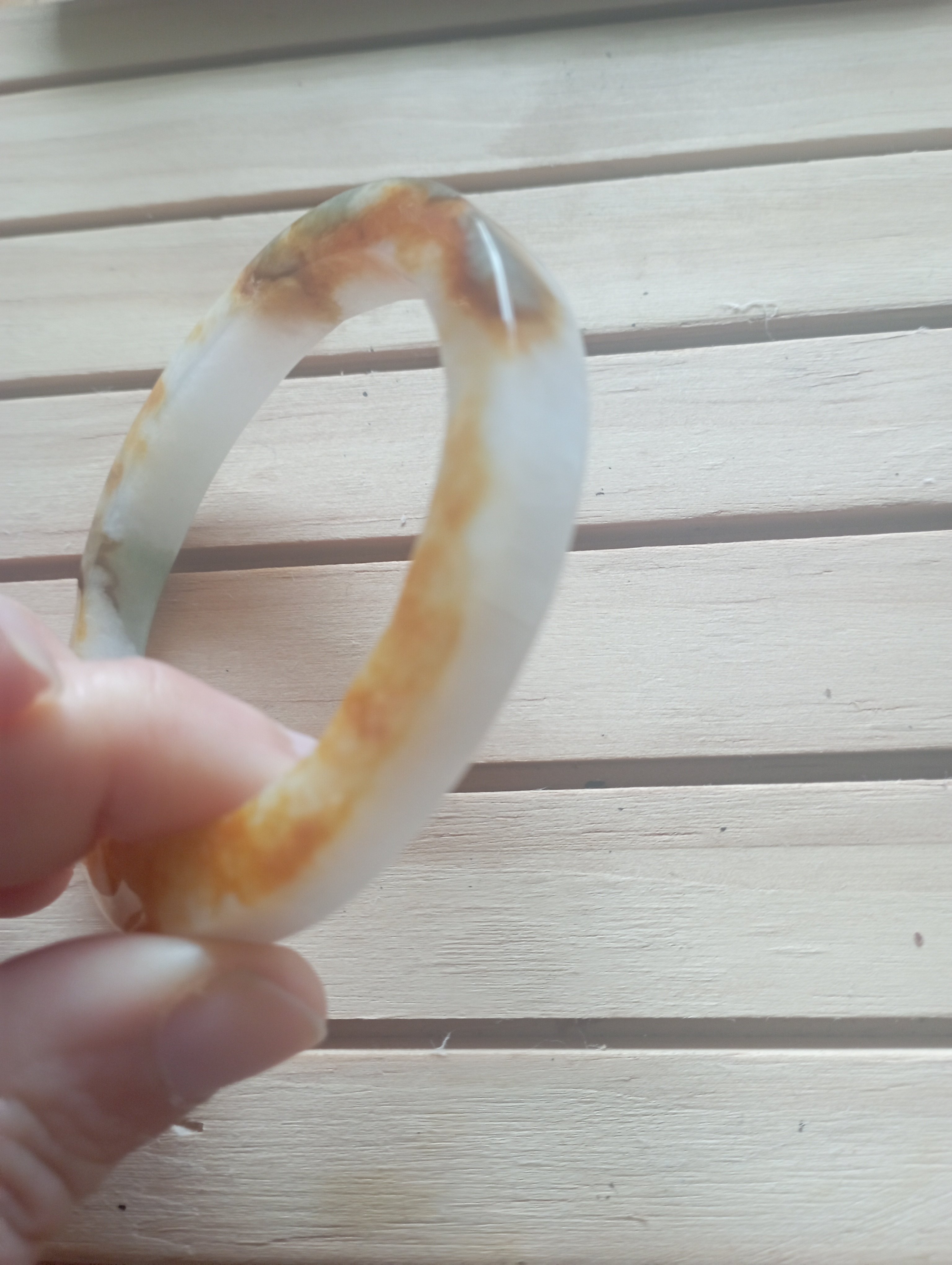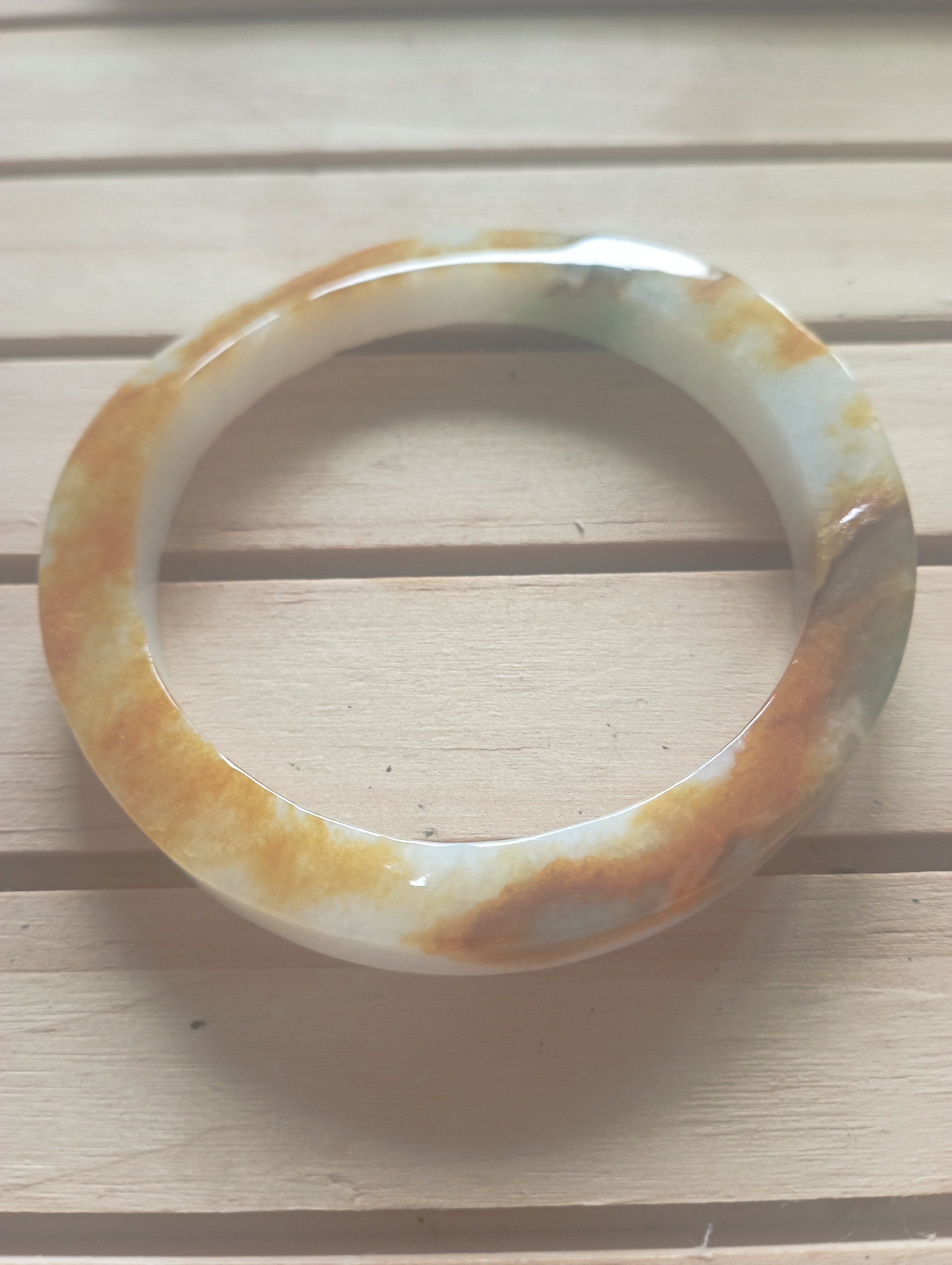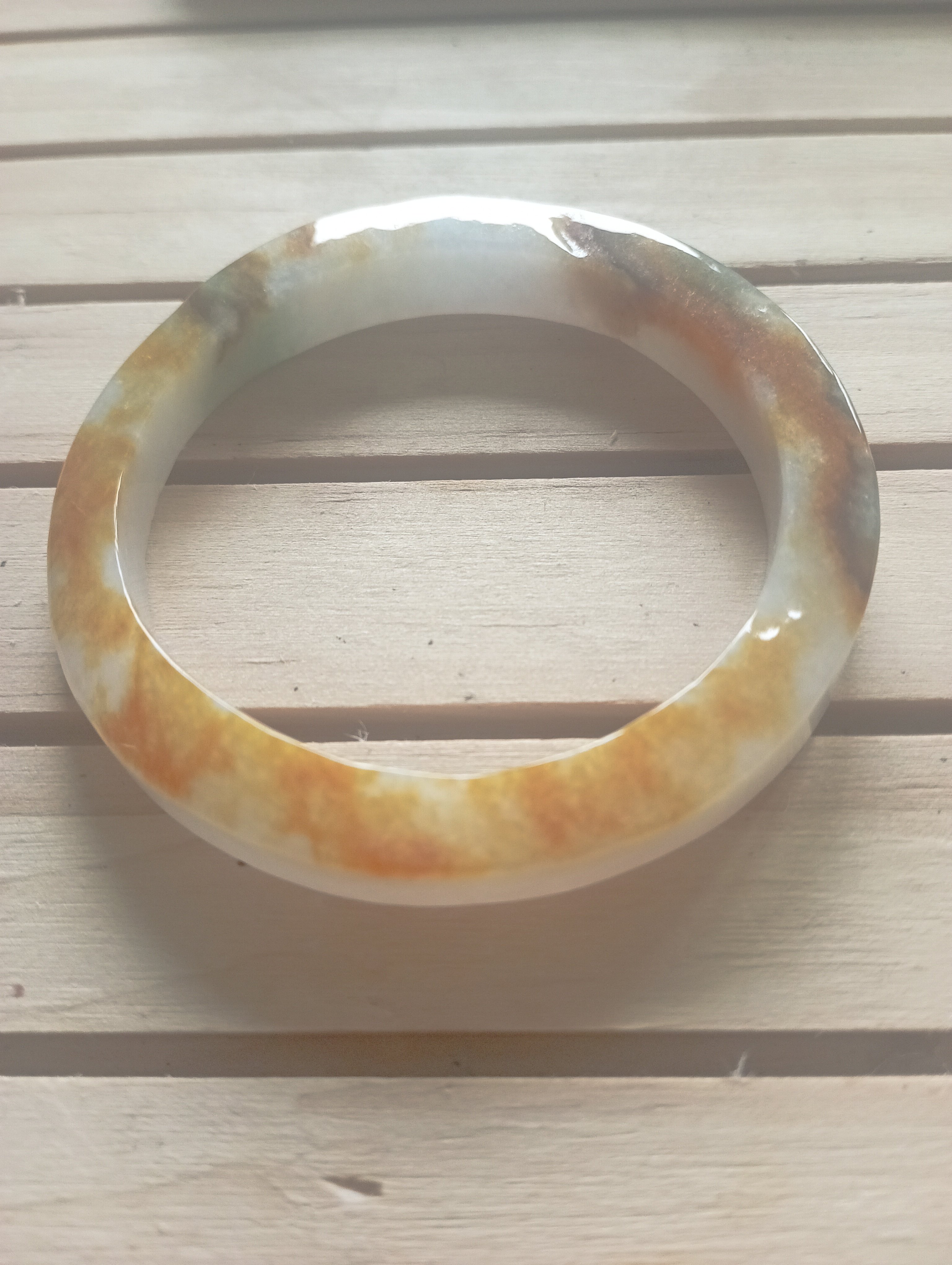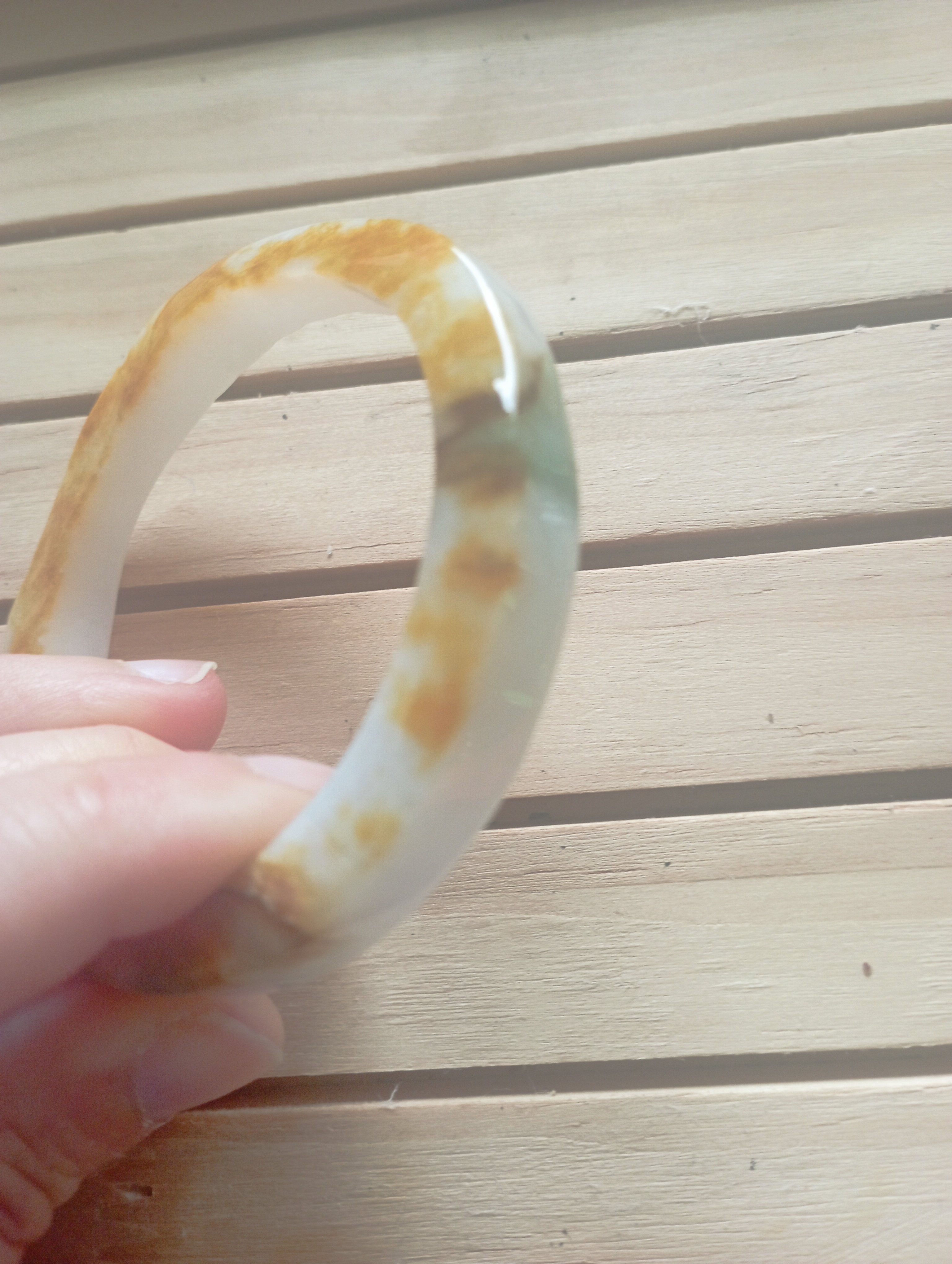 Stunning yellow the colour of sunrise on one side, white on the other. The surface is uneven but has been polished. Very interesting bangle measures 54.4 X 7.2 X 8.7mm, weighs 38.98g, comes with a certificate of authenticity £120