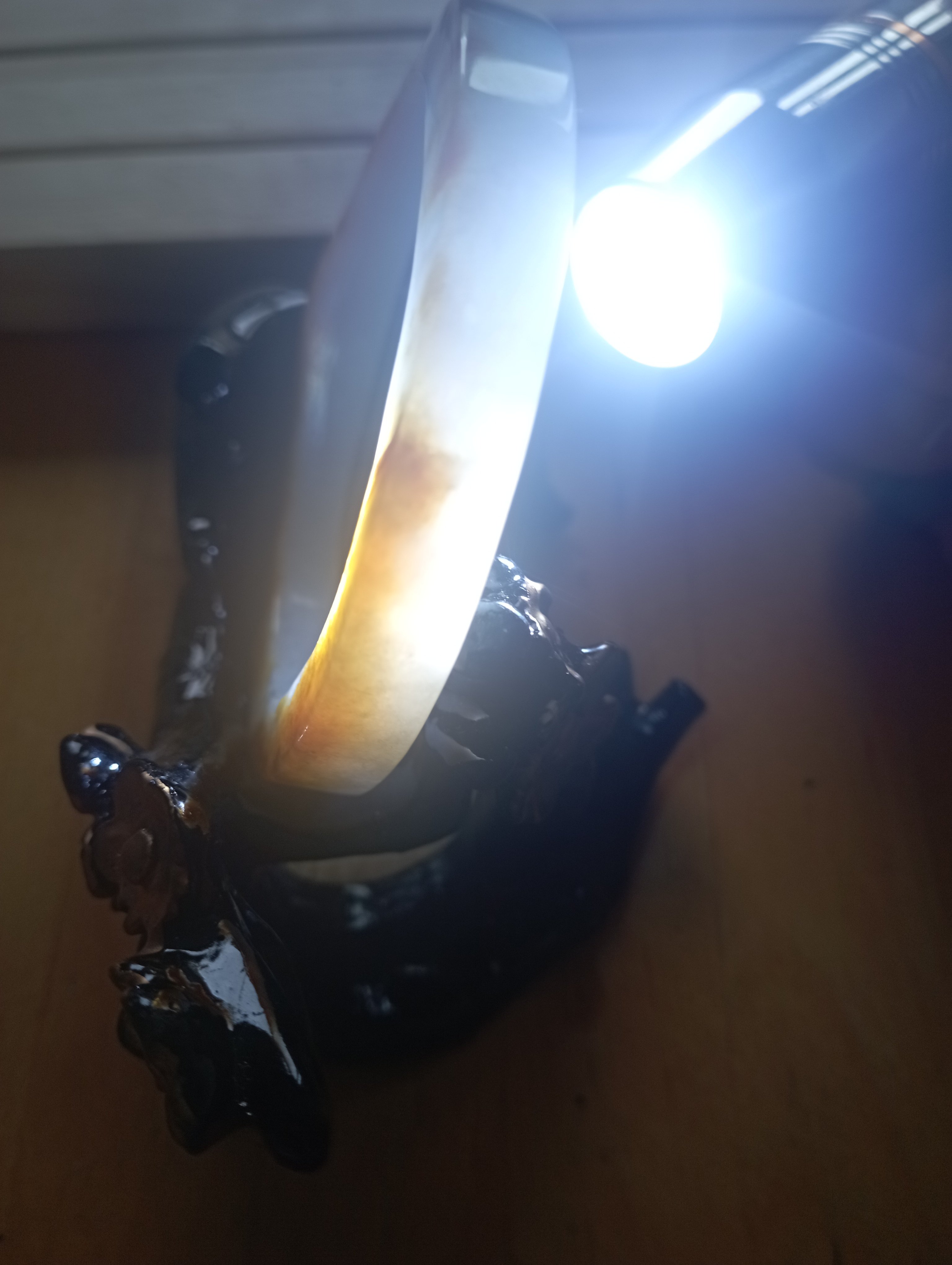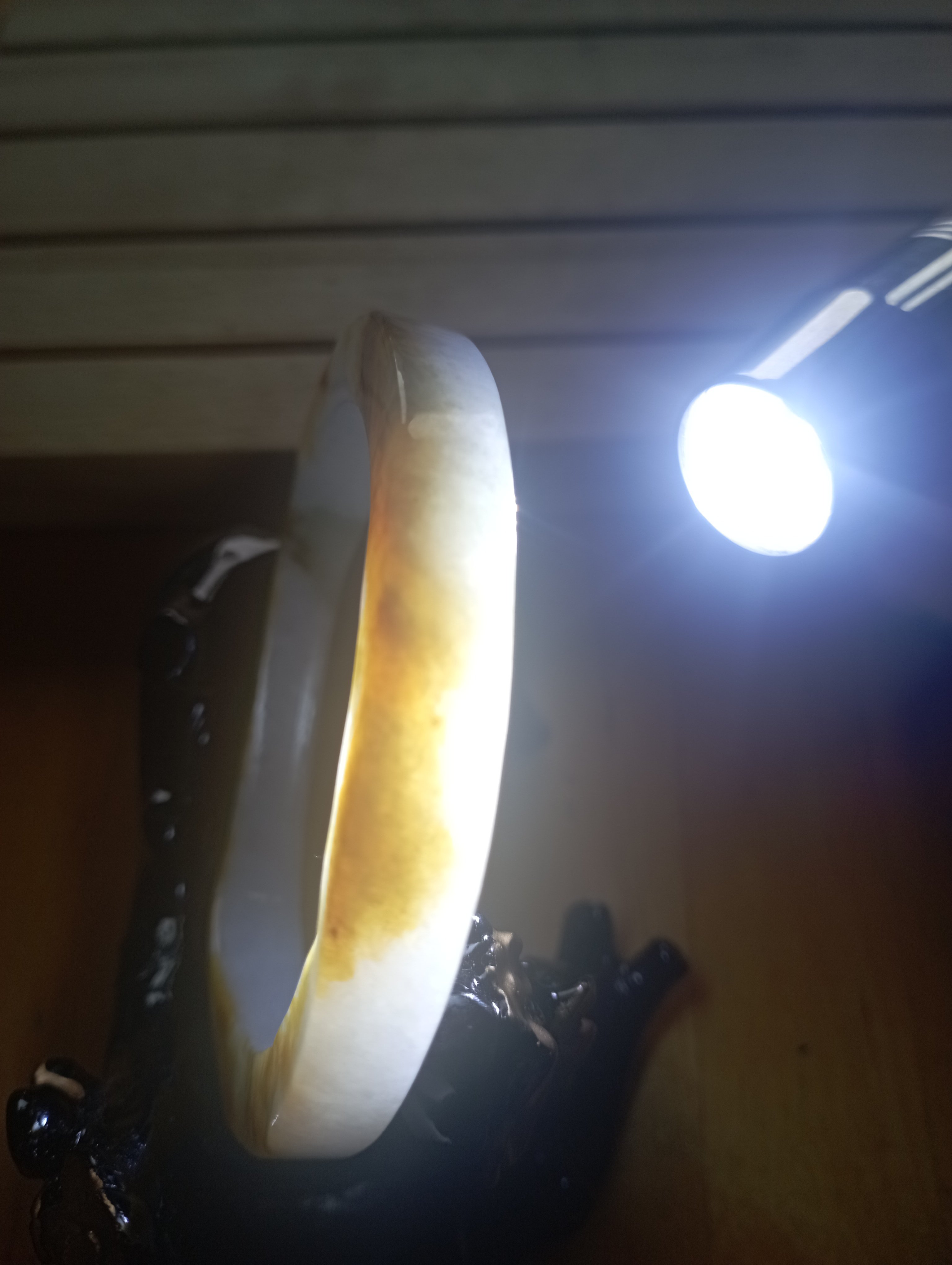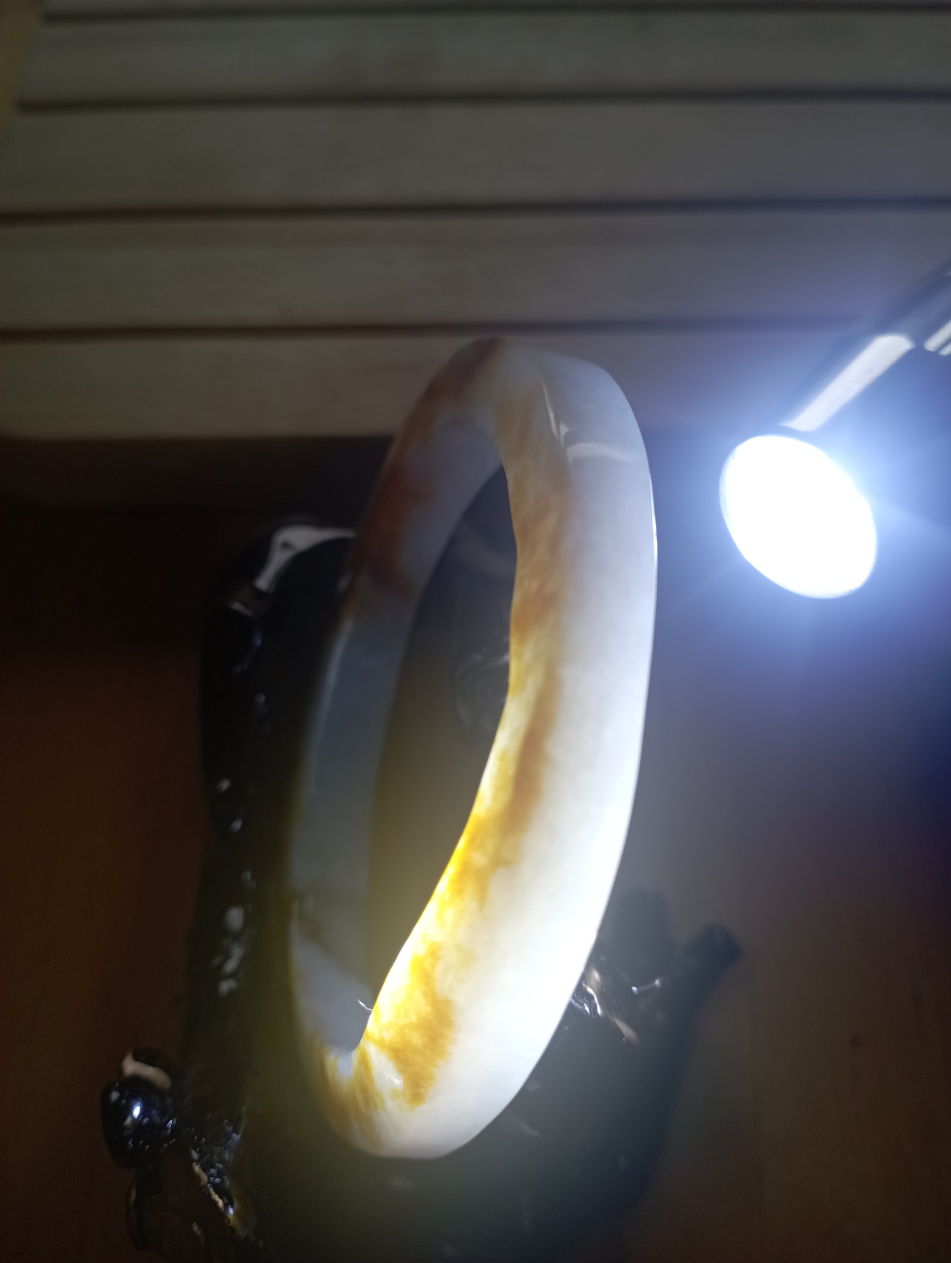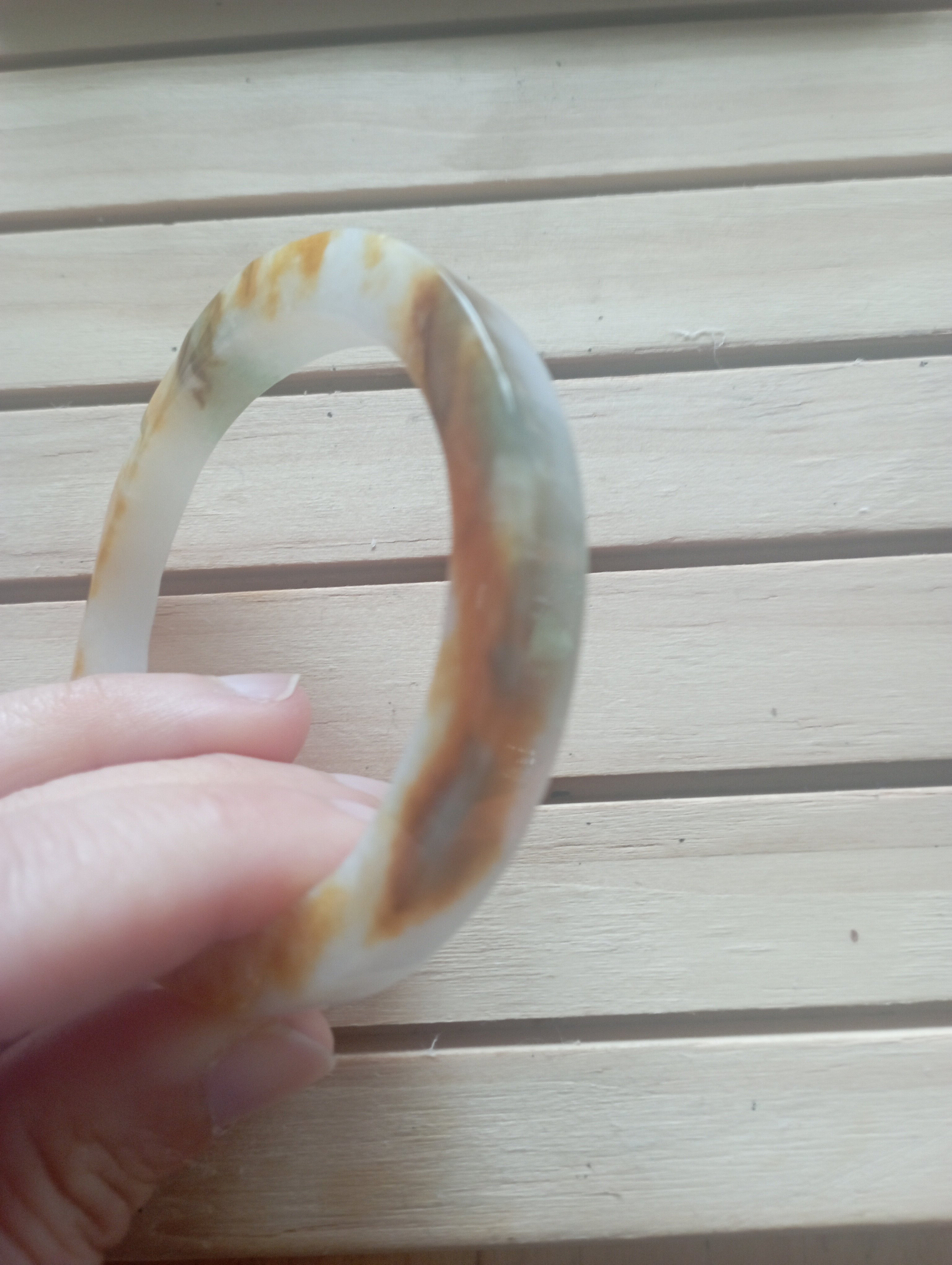 Stunning yellow the colour of sunrise on one side, white on the other. The surface is uneven but has been polished. Very interesting bangle measures 54.4 X 7.2 X 8.7mm, weighs 38.98g, comes with a certificate of authenticity £120