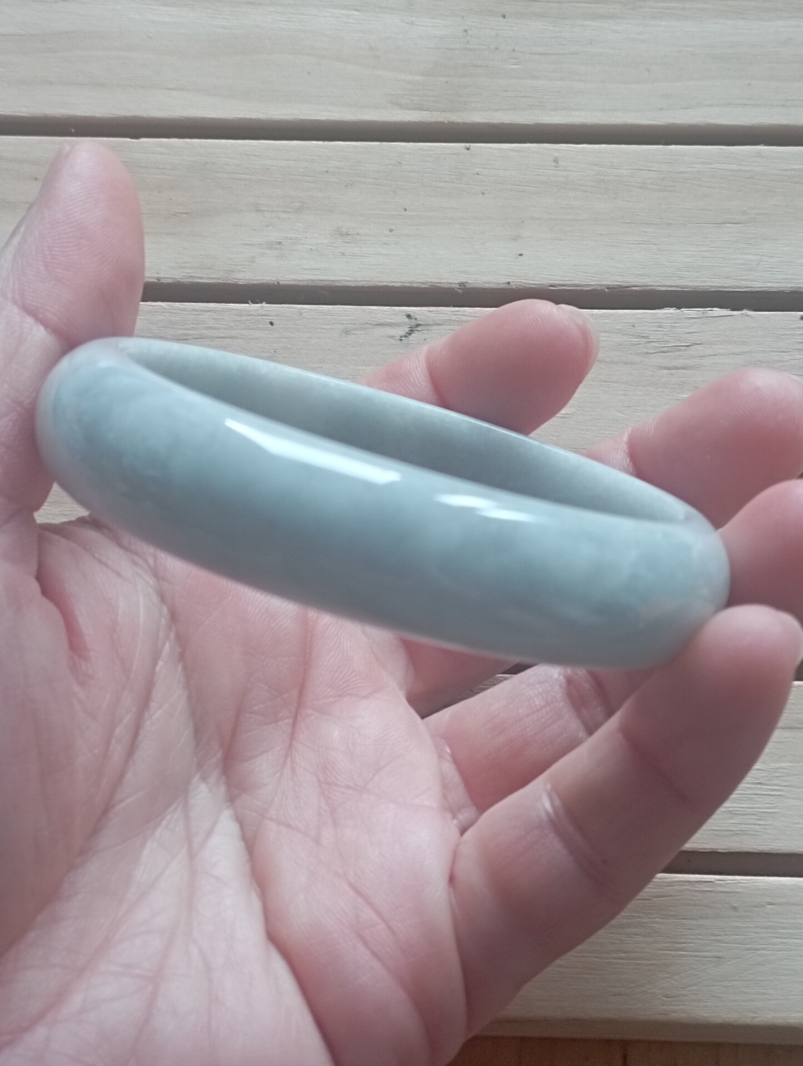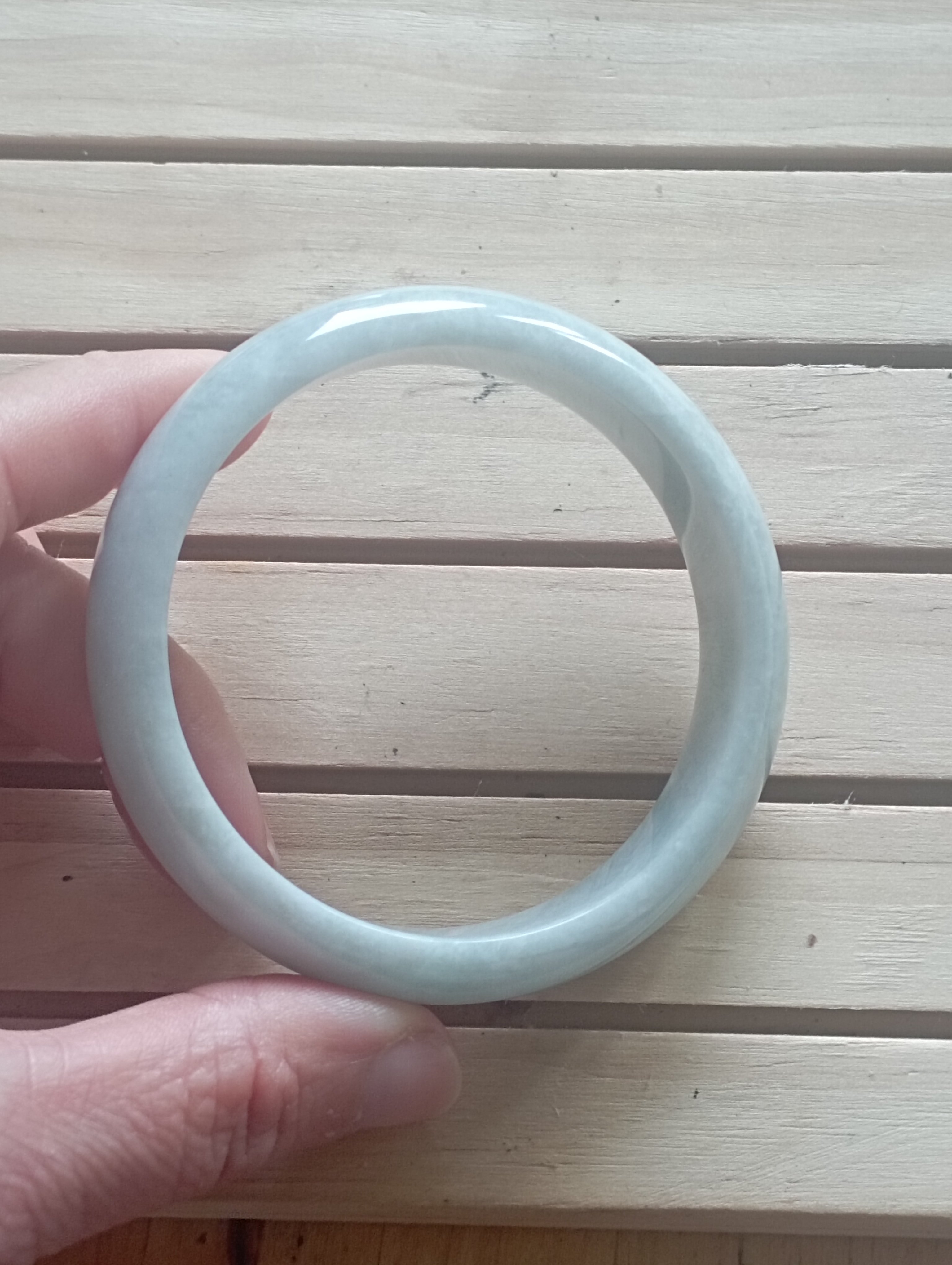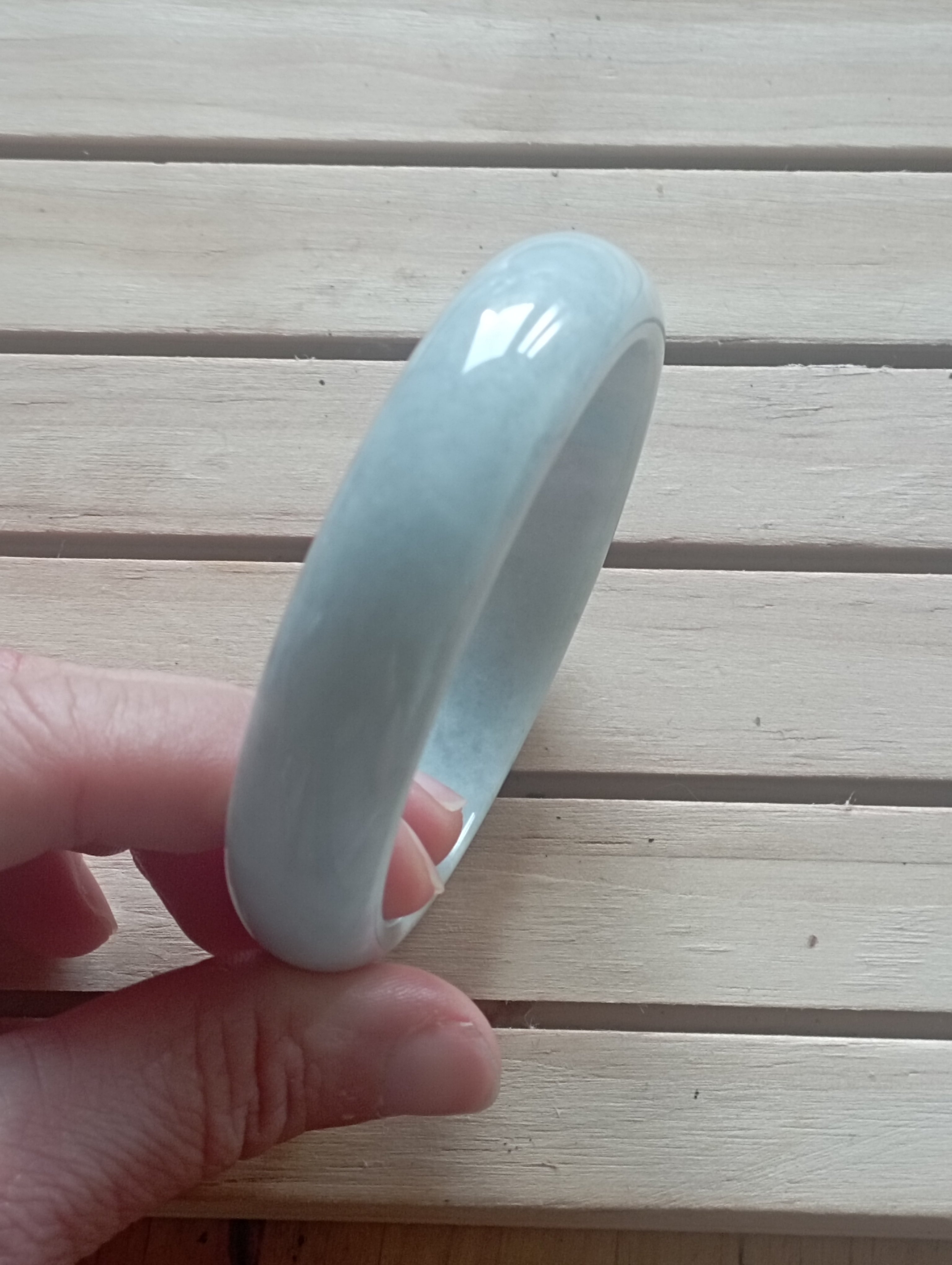 If you are looking for a light green bangle, here might be the one. The whole bangle is the same colour with an internal diameter of 59.3mm, the width is 14.8mm making it a tyre, the thickness of the bangle is 7.1mm and weighs 60.34g, comes with a certificate of authenticity £88