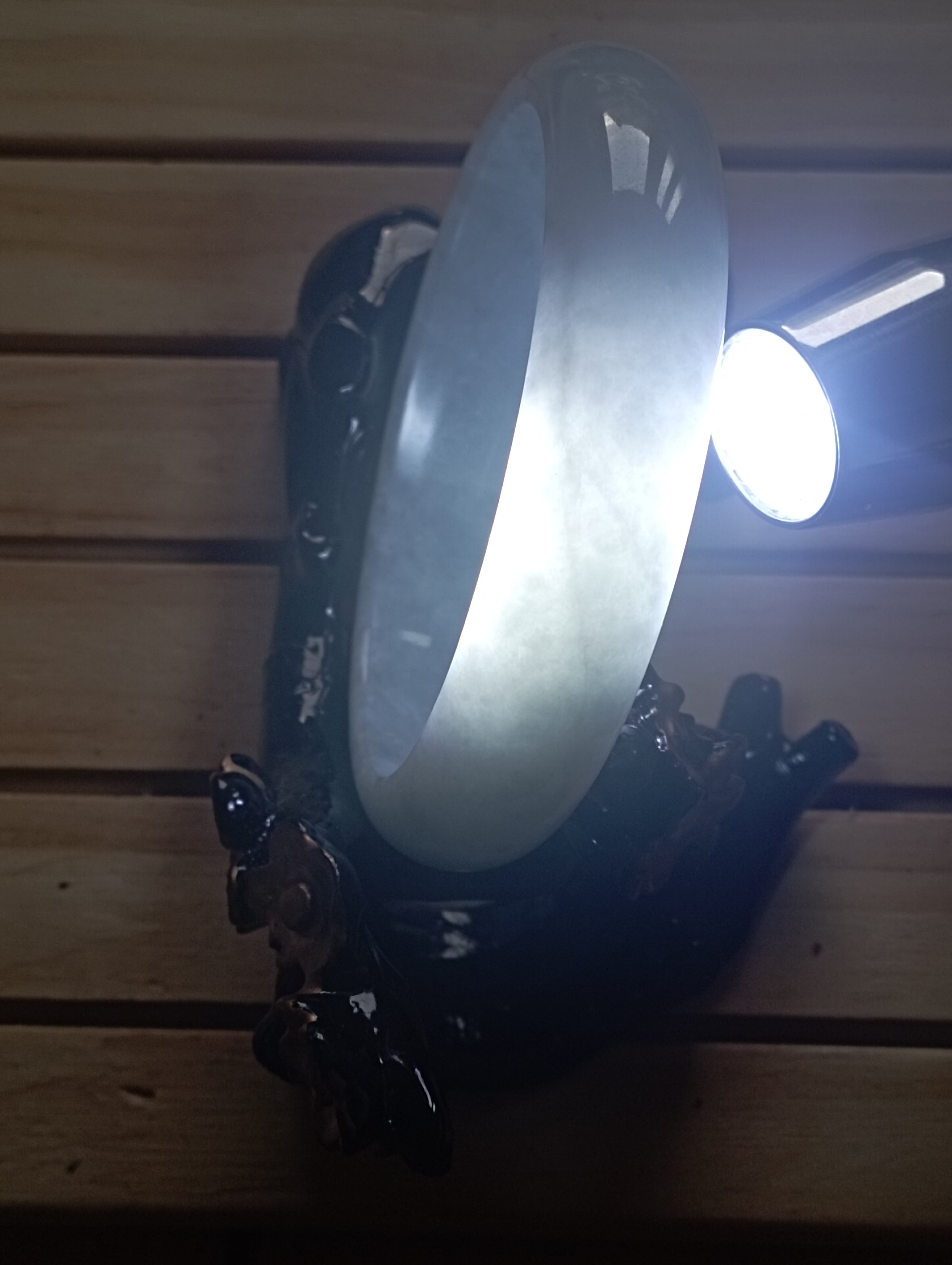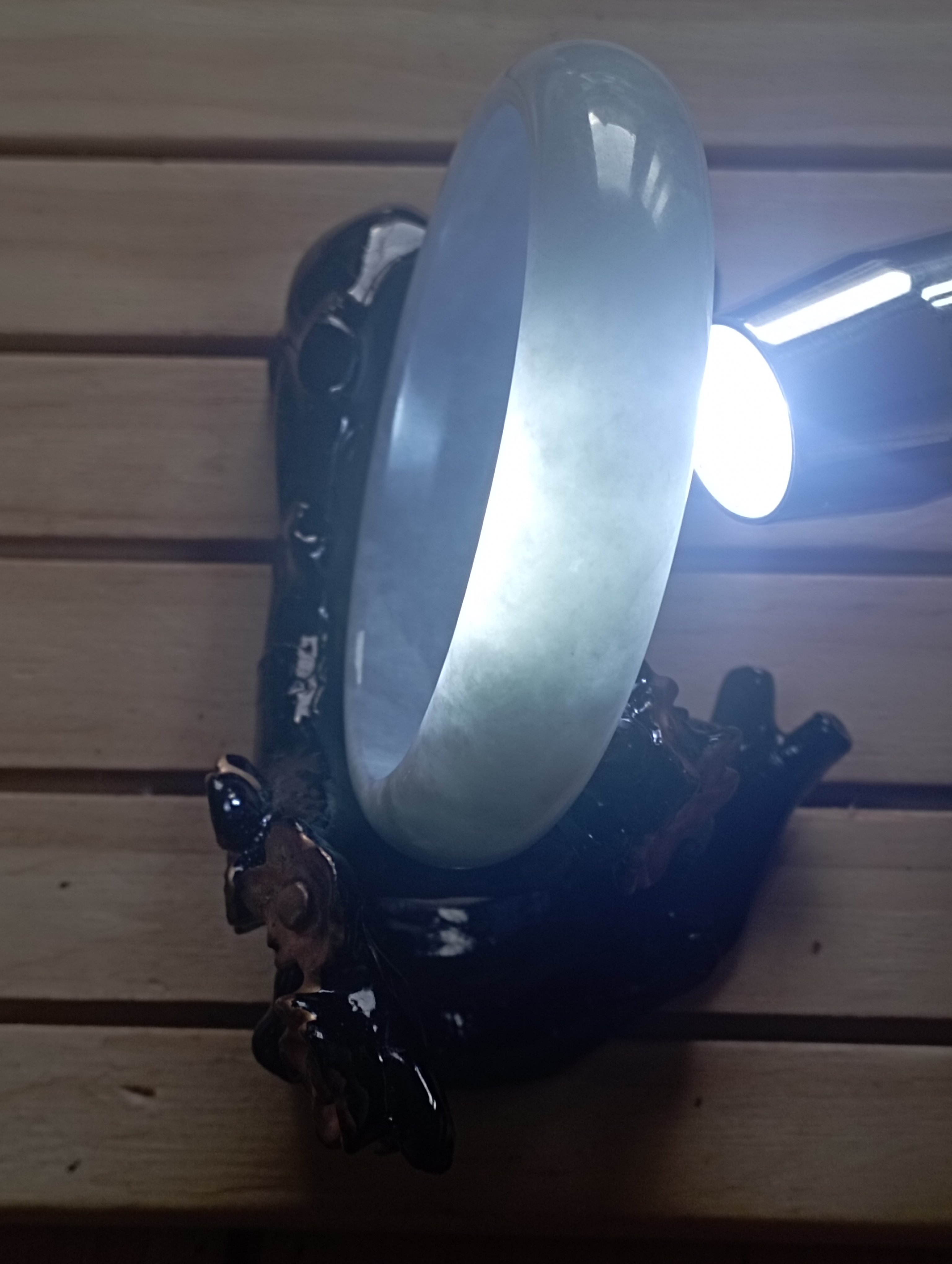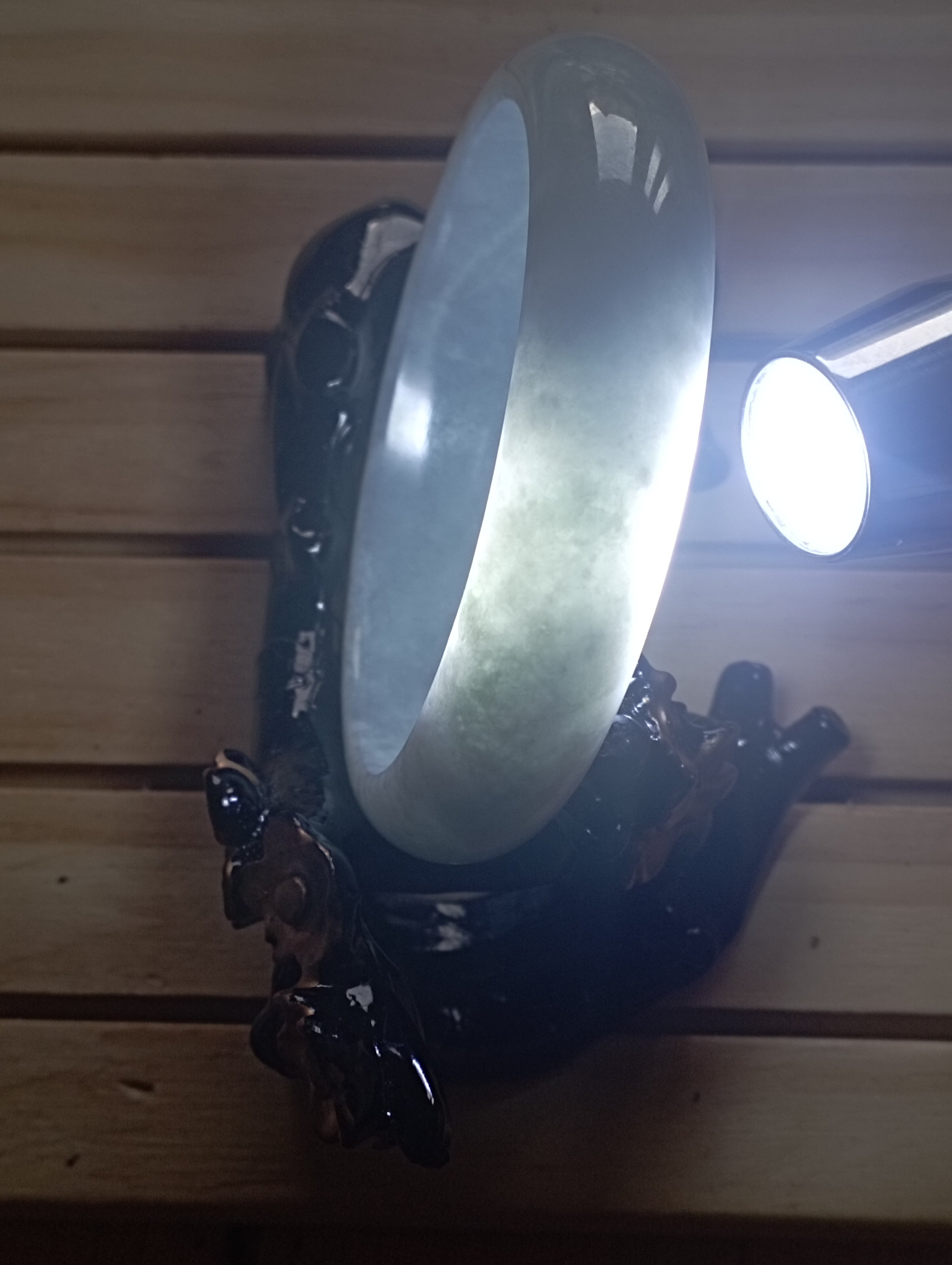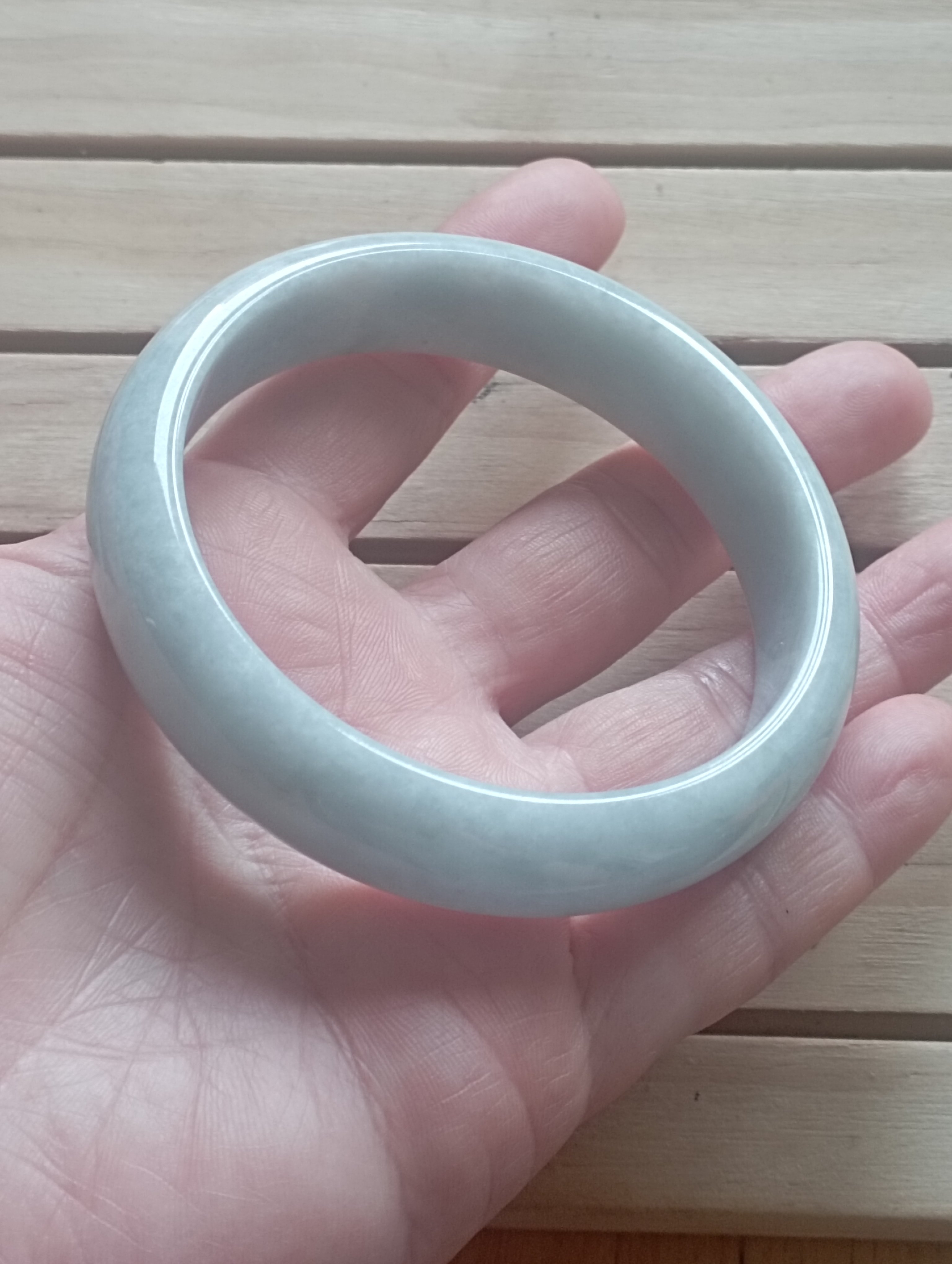 If you are looking for a light green bangle, here might be the one. The whole bangle is the same colour with an internal diameter of 59.3mm, the width is 14.8mm making it a tyre, the thickness of the bangle is 7.1mm and weighs 60.34g, comes with a certificate of authenticity £88