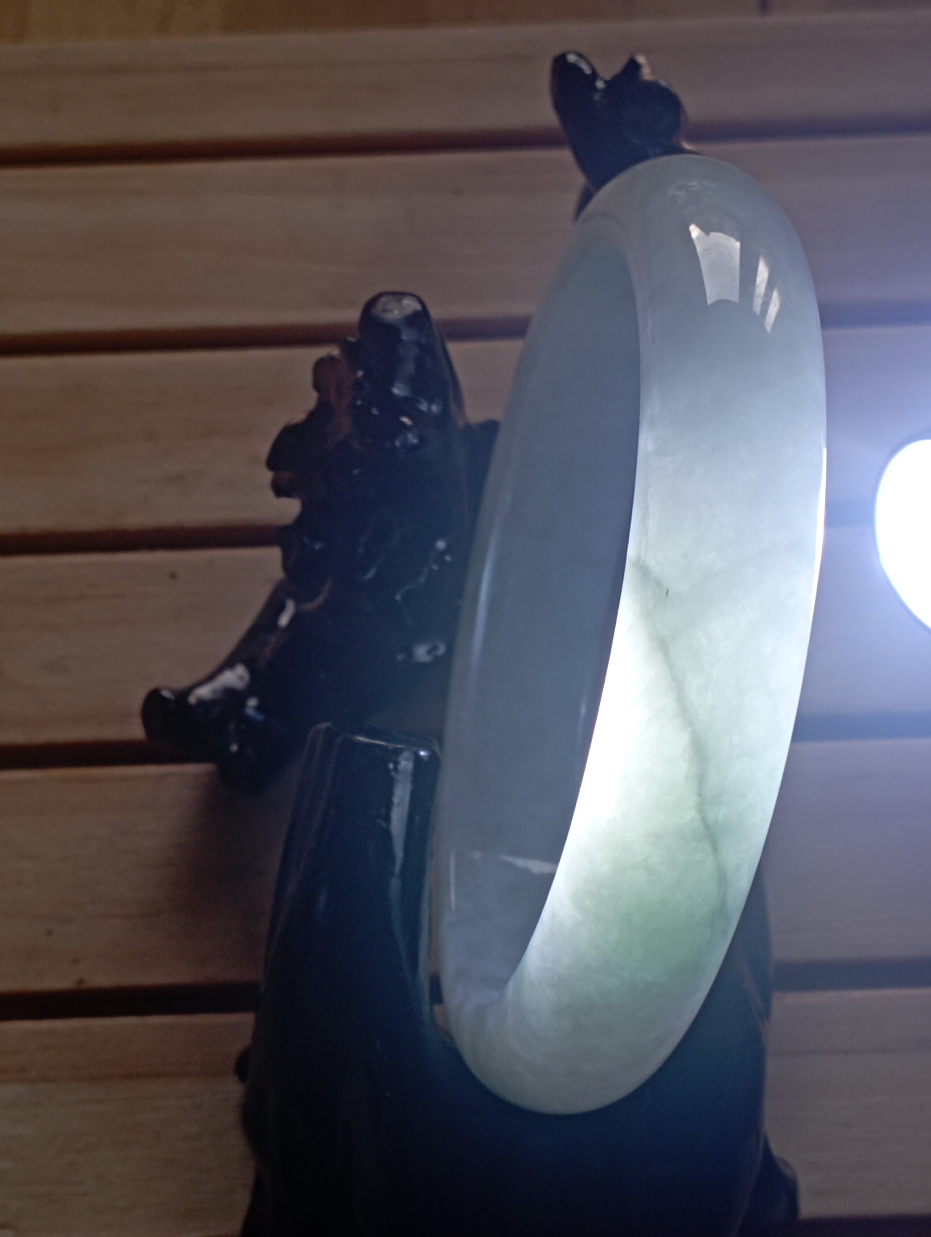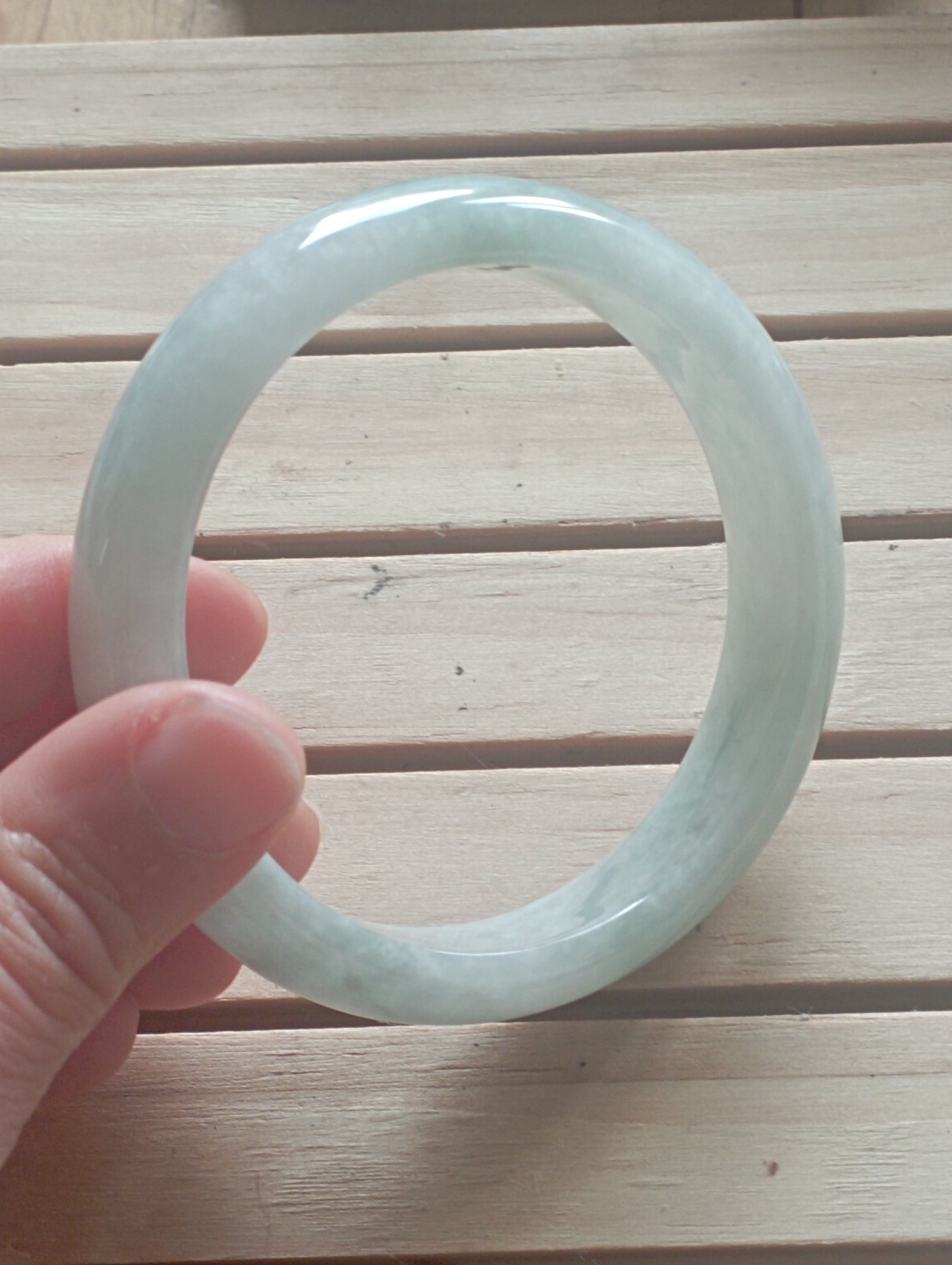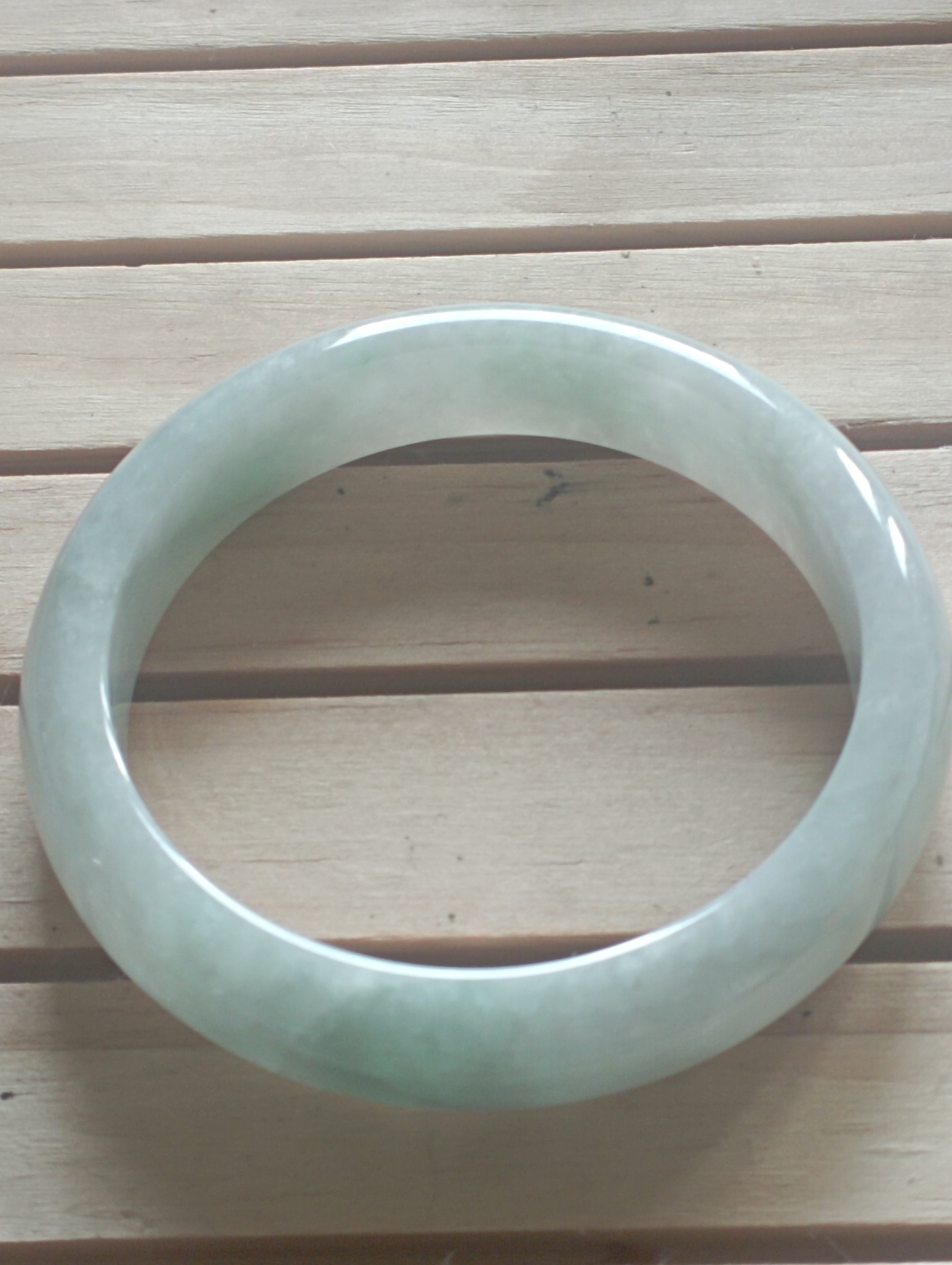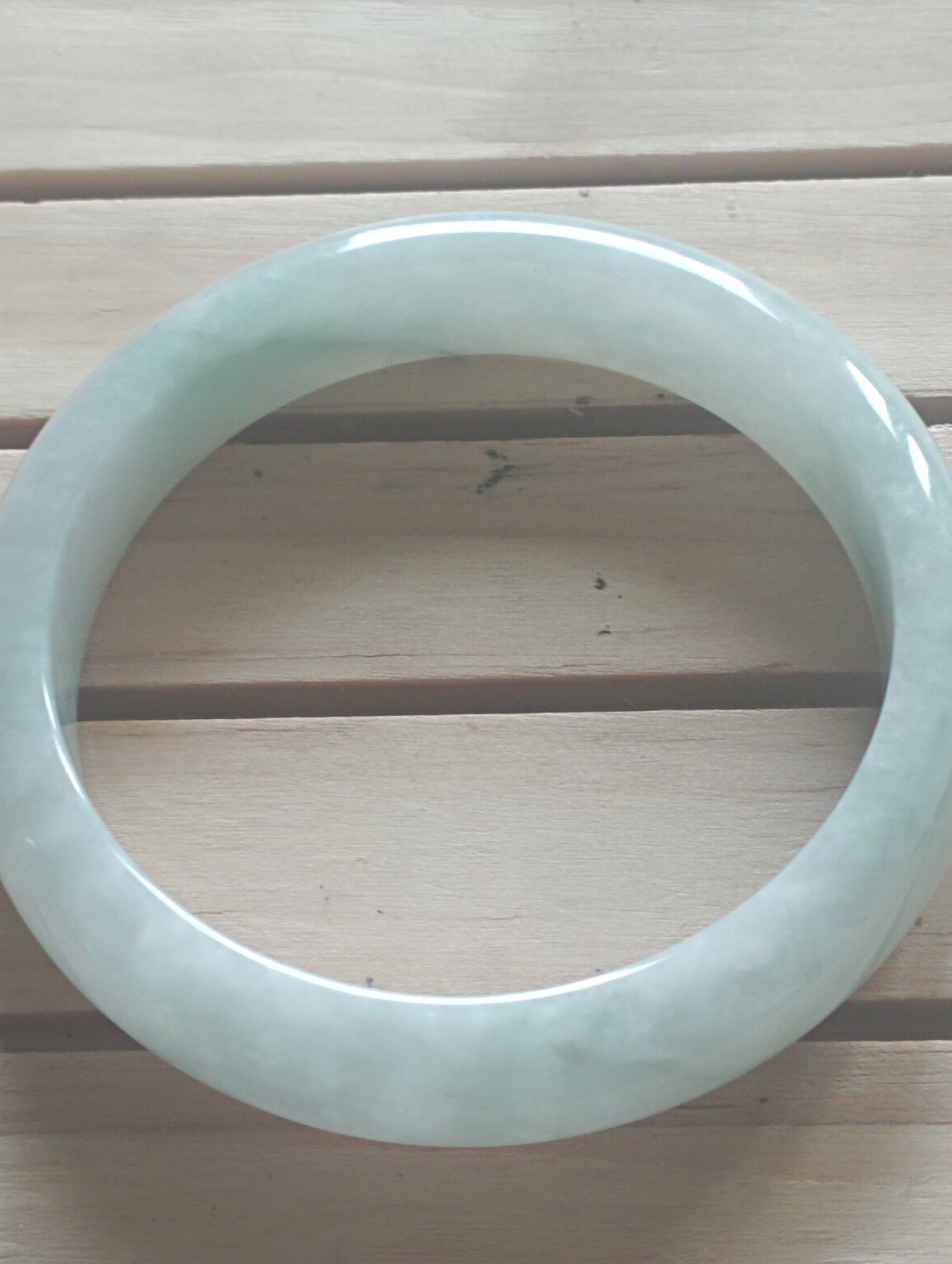 What an icy light green jadeite bangle! Measures 61.3 X 13.5 X 9mm, weighs 65.88g, it has two internal lines, not cracks, does not affect usage at all. Comes with a certificate of authenticity £199