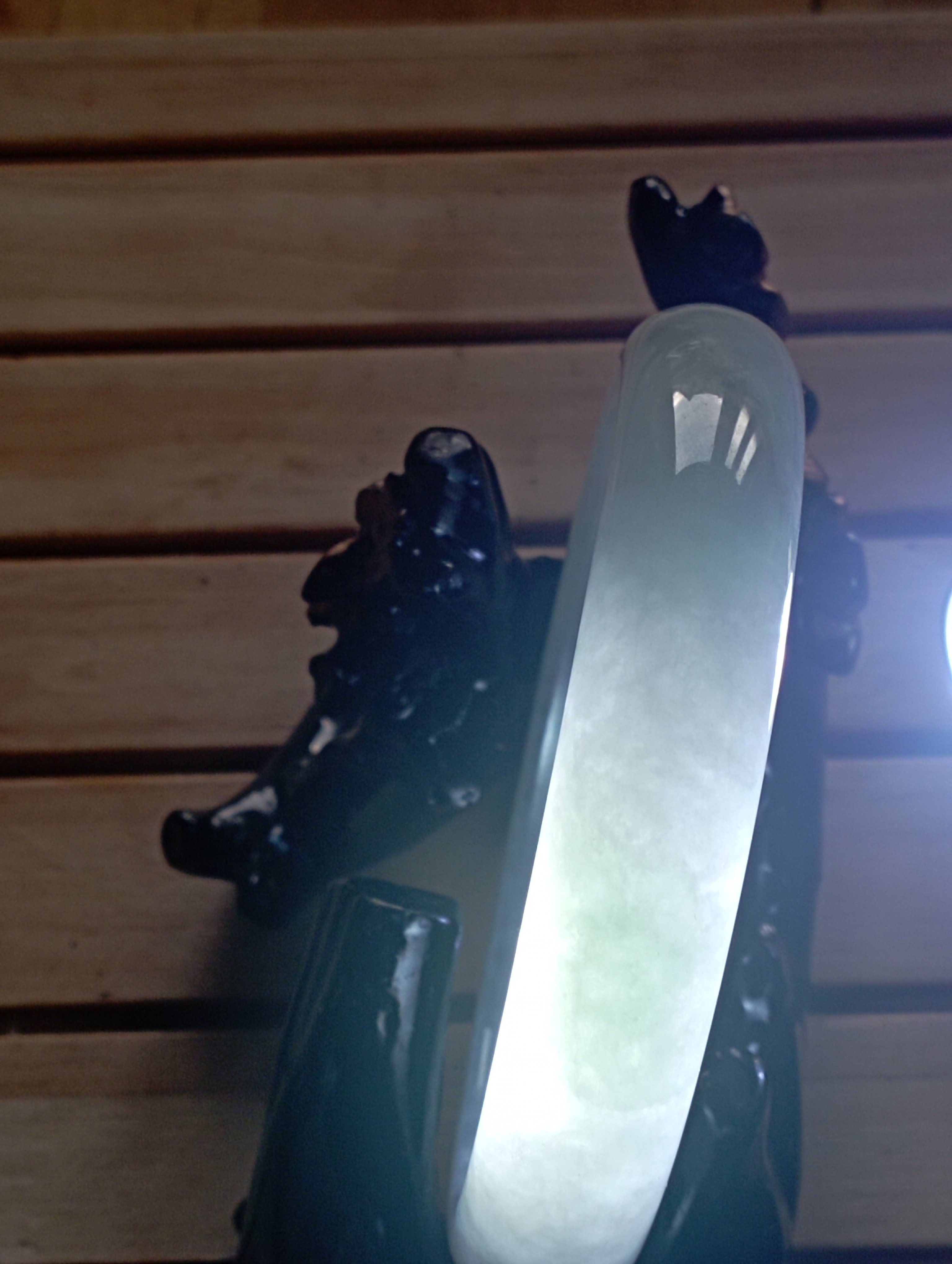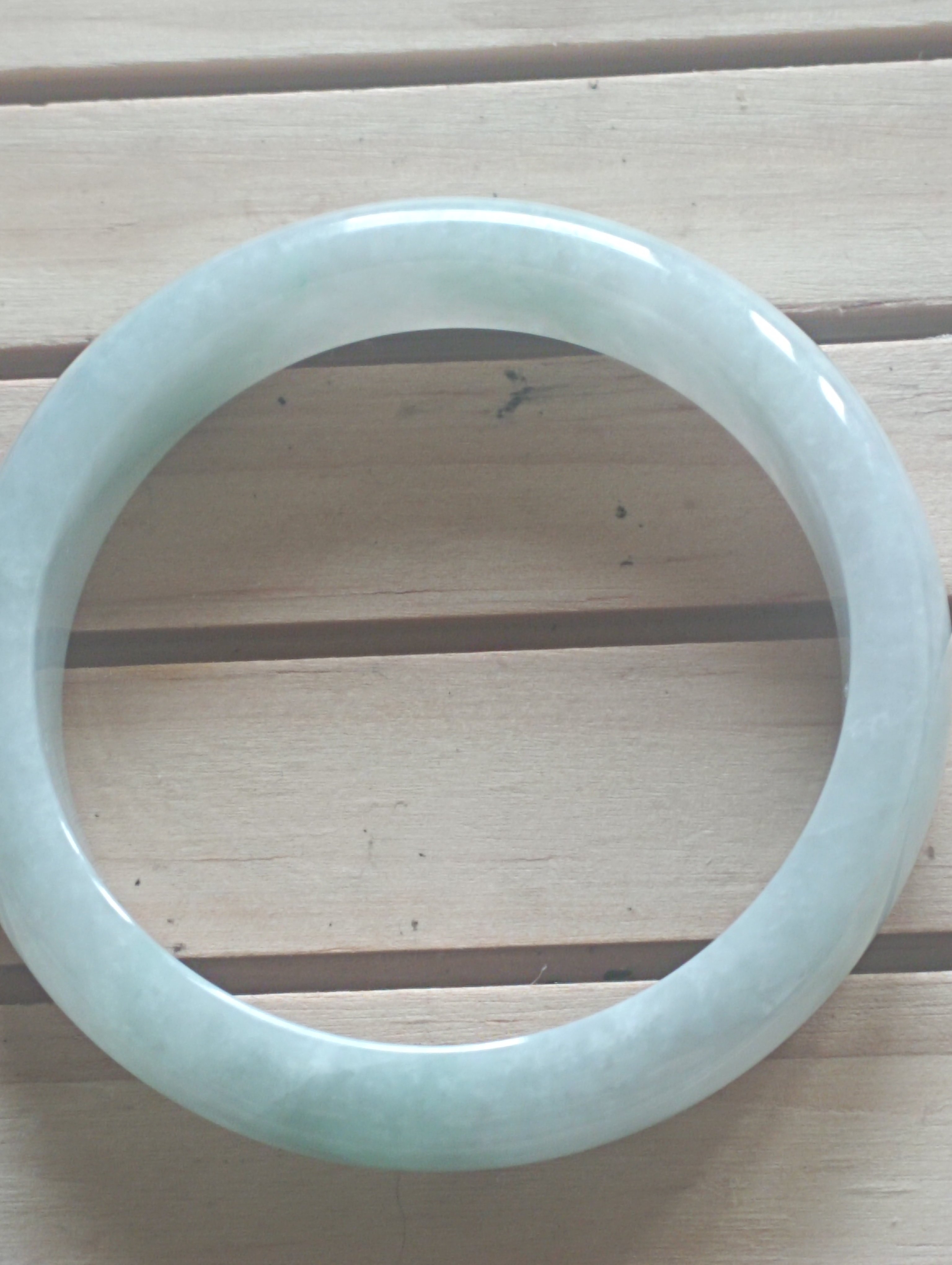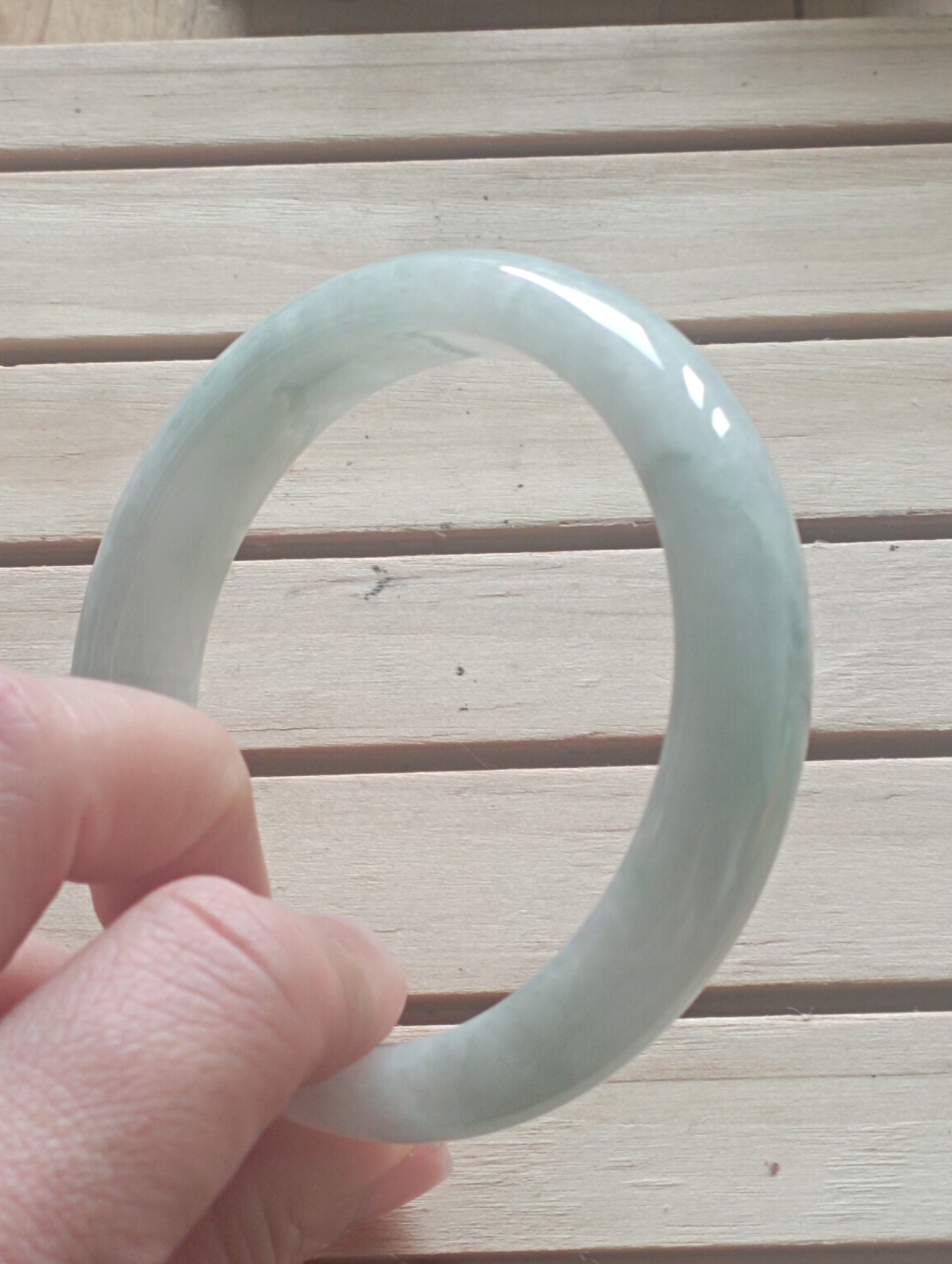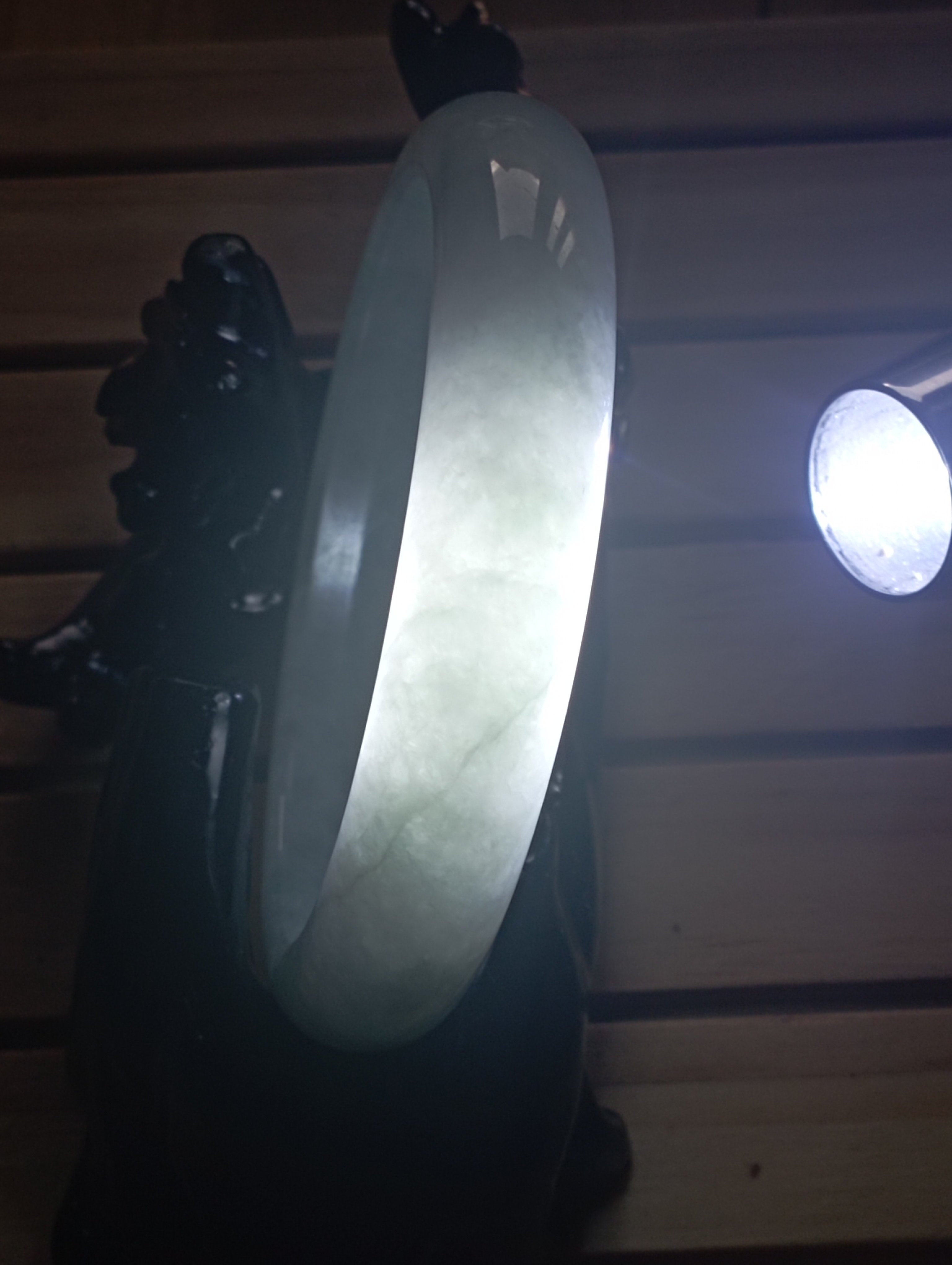 What an icy light green jadeite bangle! Measures 61.3 X 13.5 X 9mm, weighs 65.88g, it has two internal lines, not cracks, does not affect usage at all. Comes with a certificate of authenticity £199