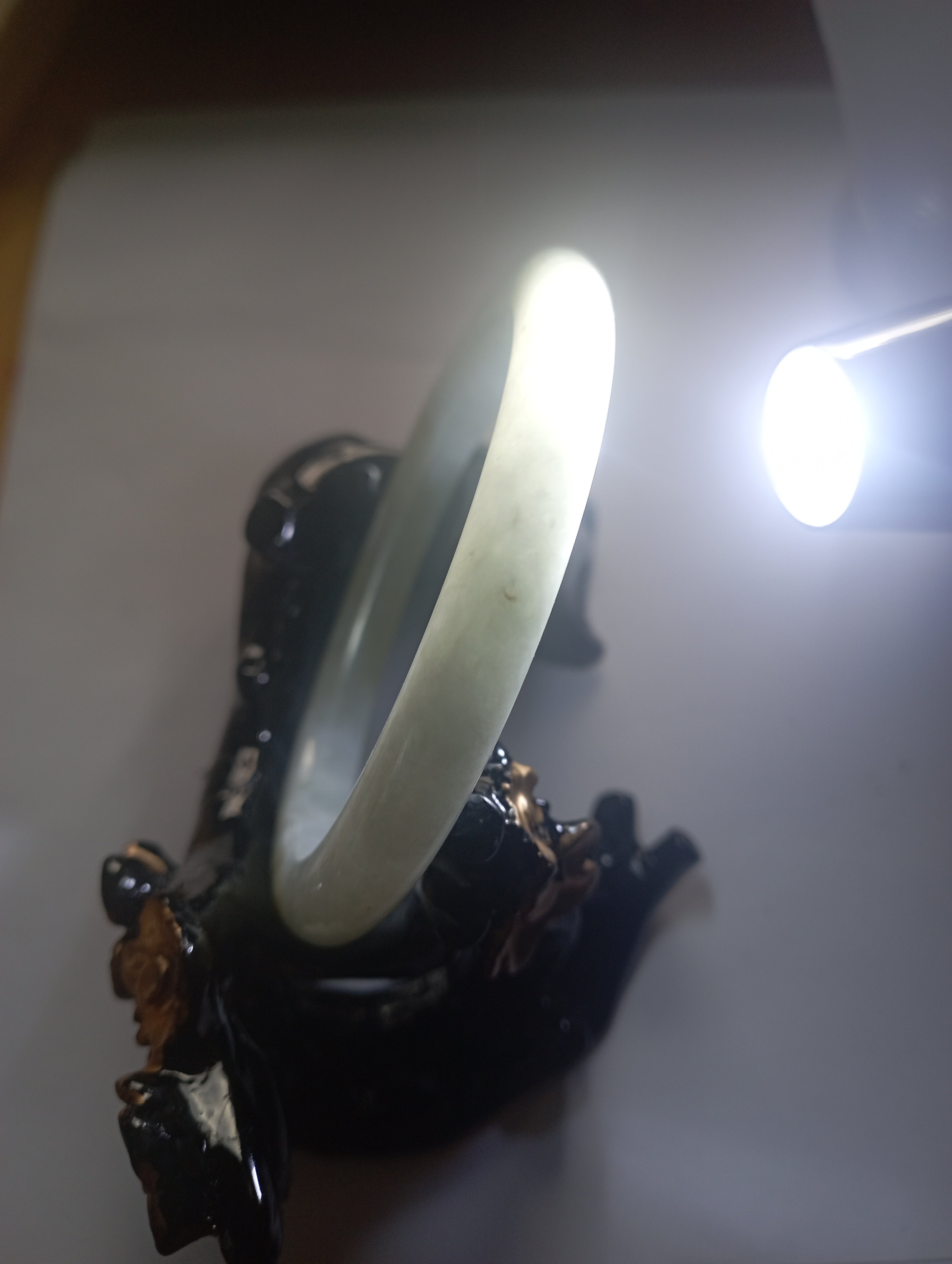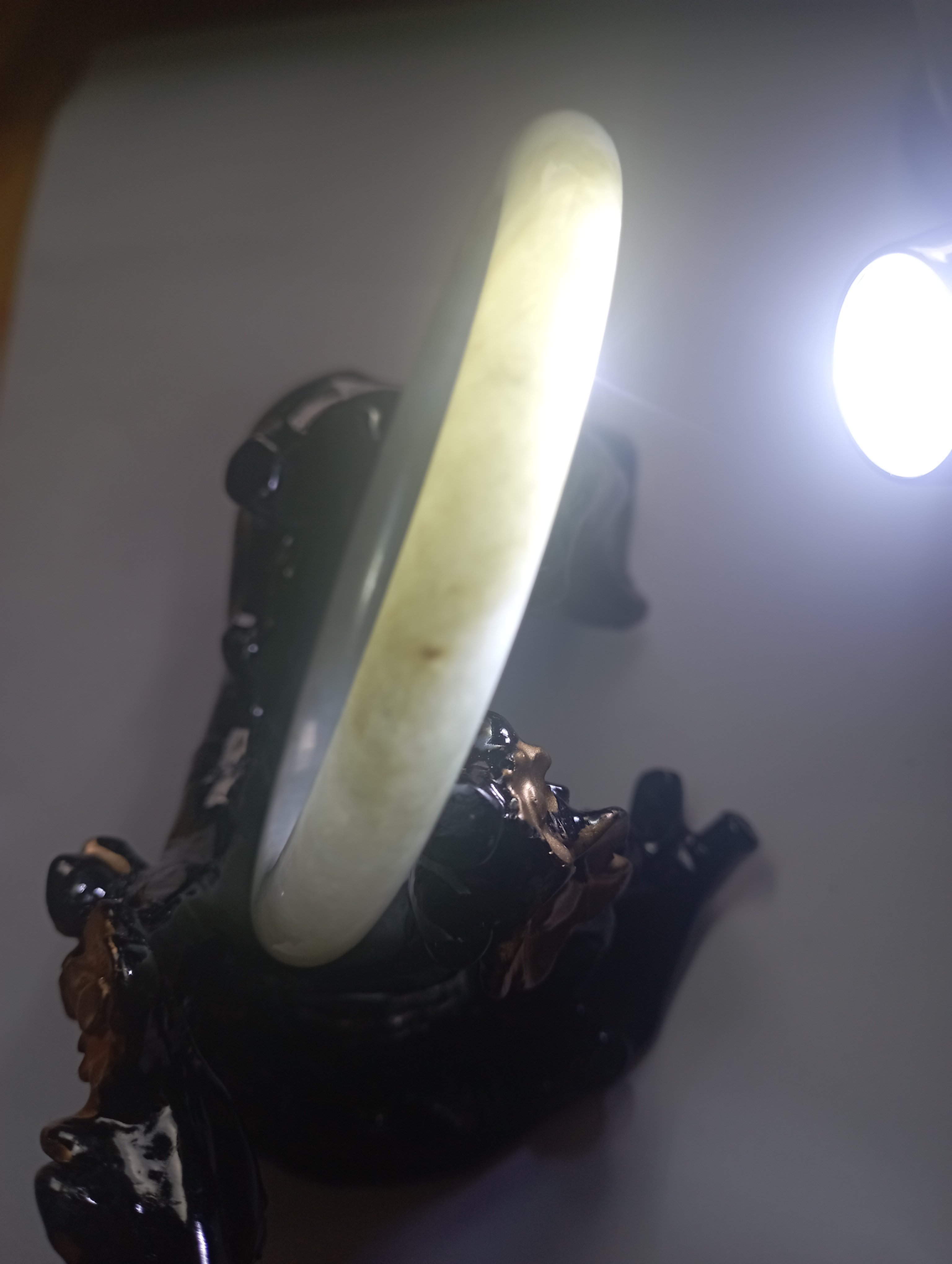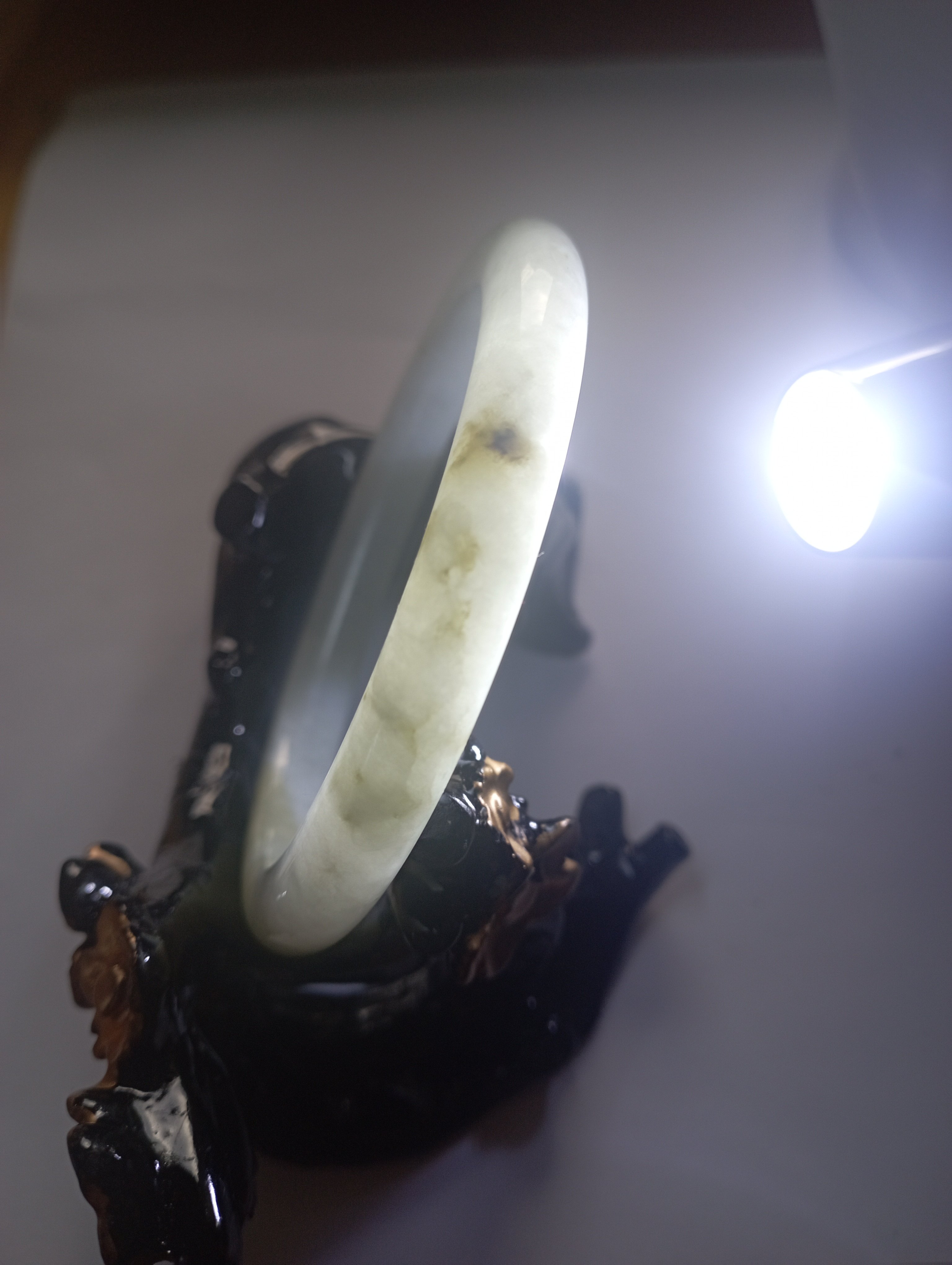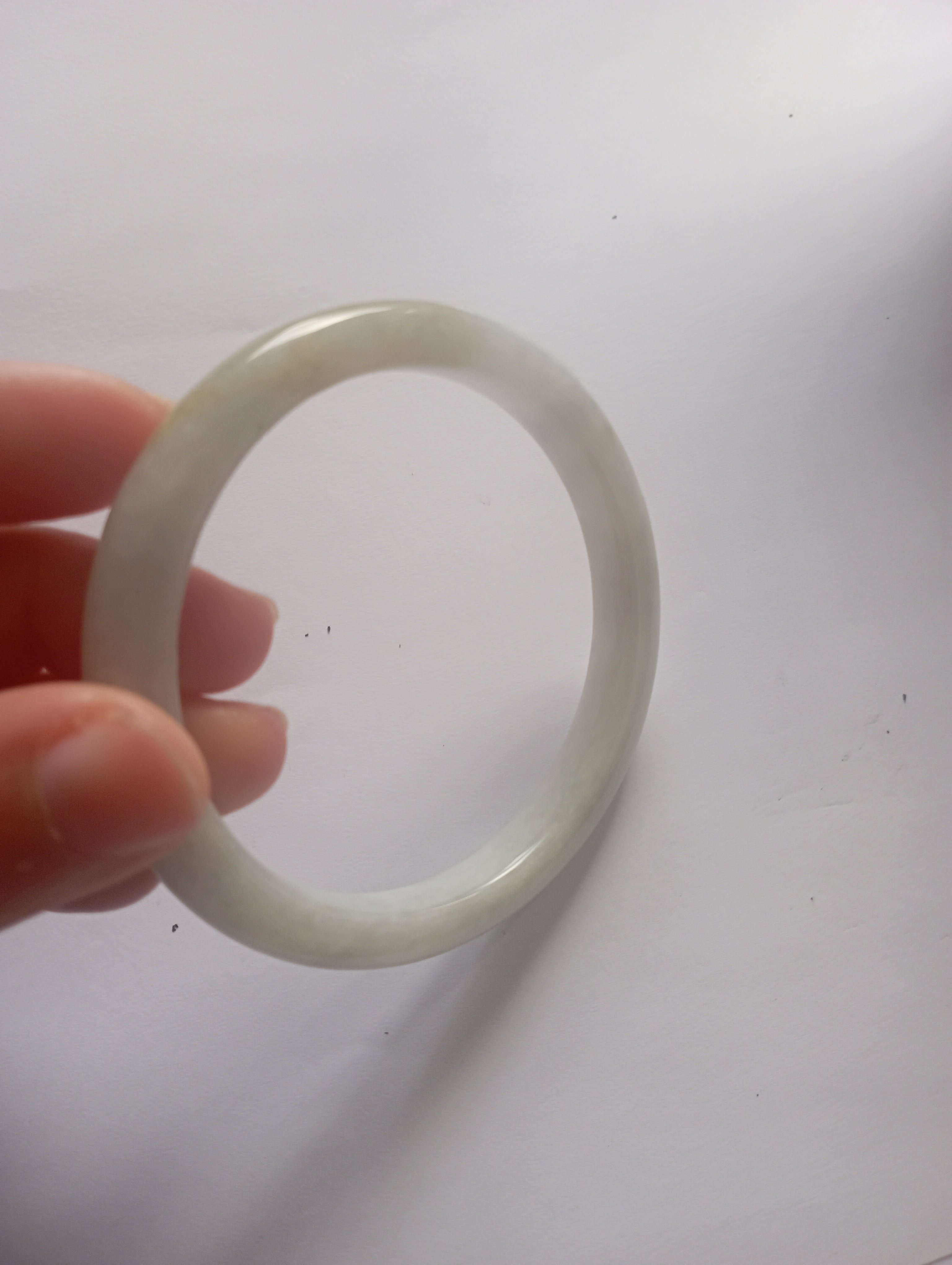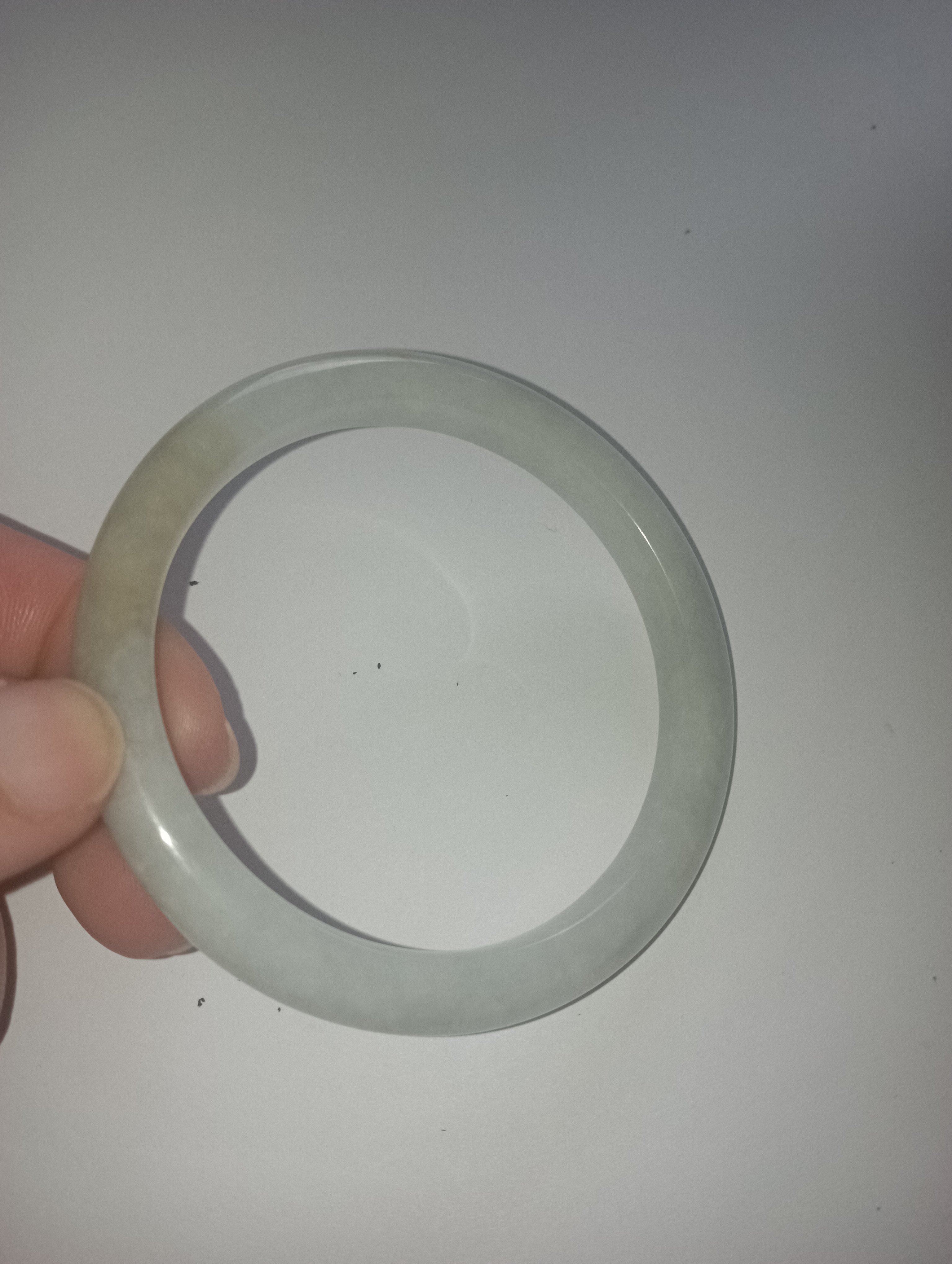 Slim bangle in a light colour with a patch of light green that measures 57.3 X 8.1 X 8.1mm, weighs 34.94g, comes with a certificate of authenticity £110