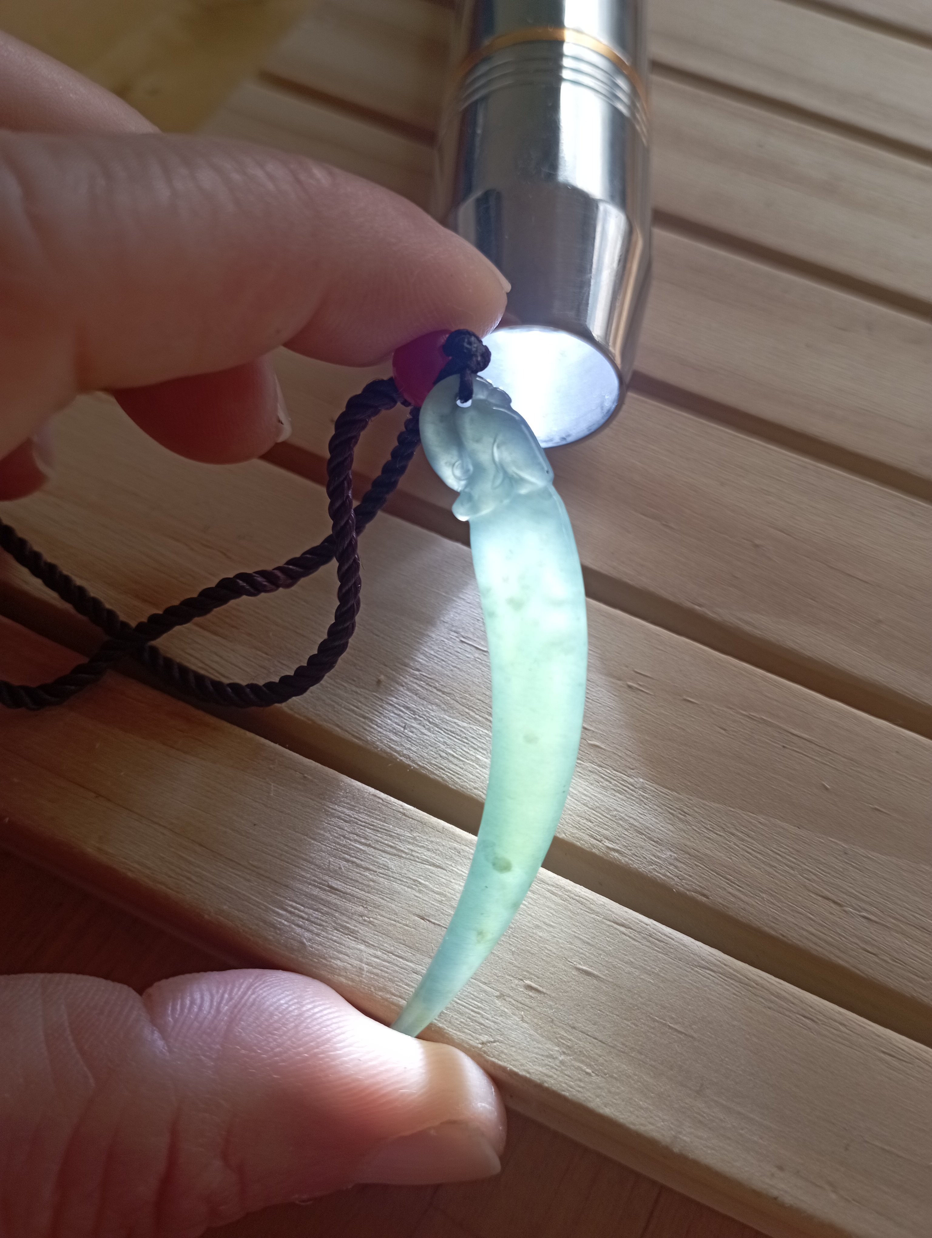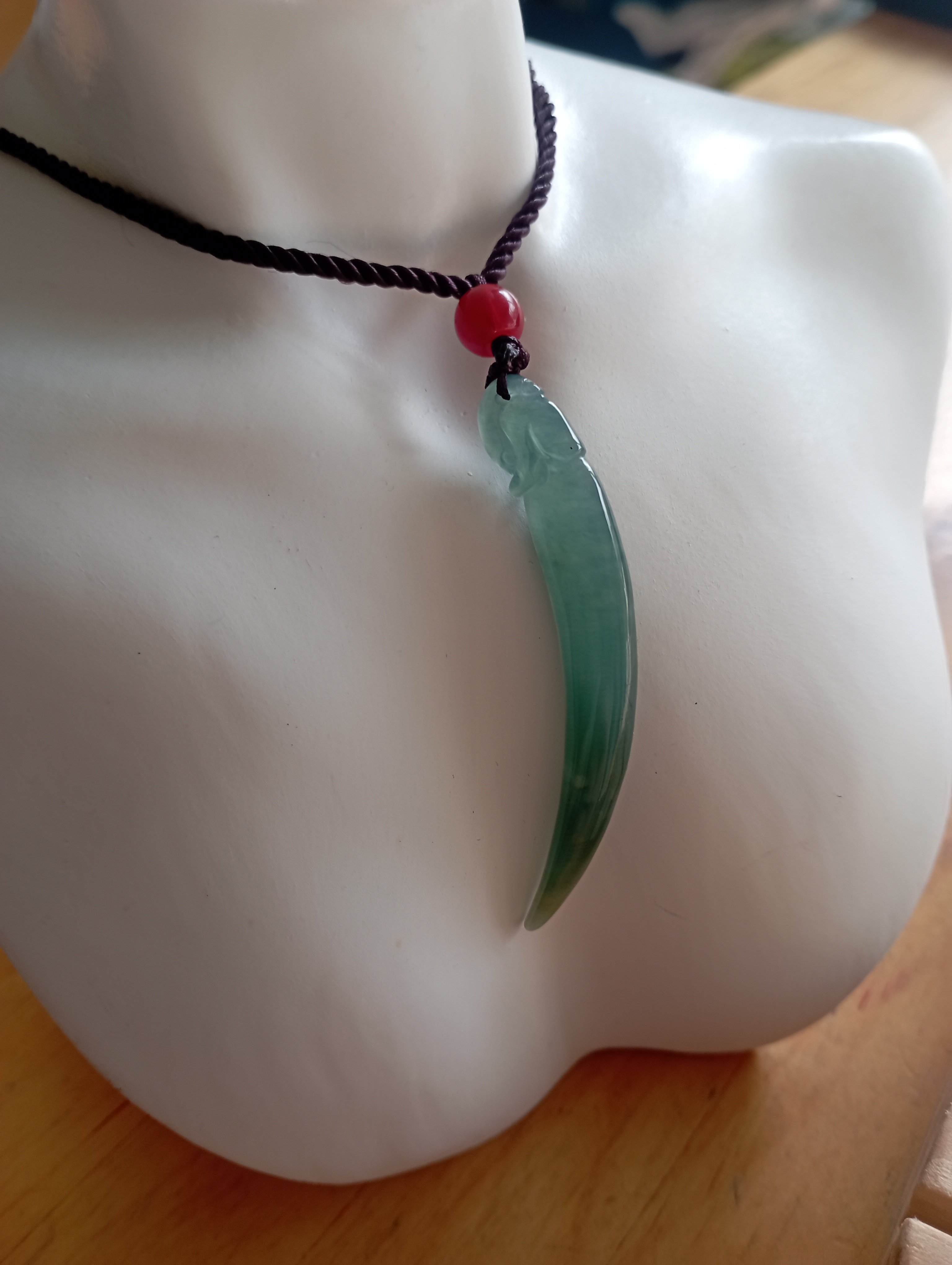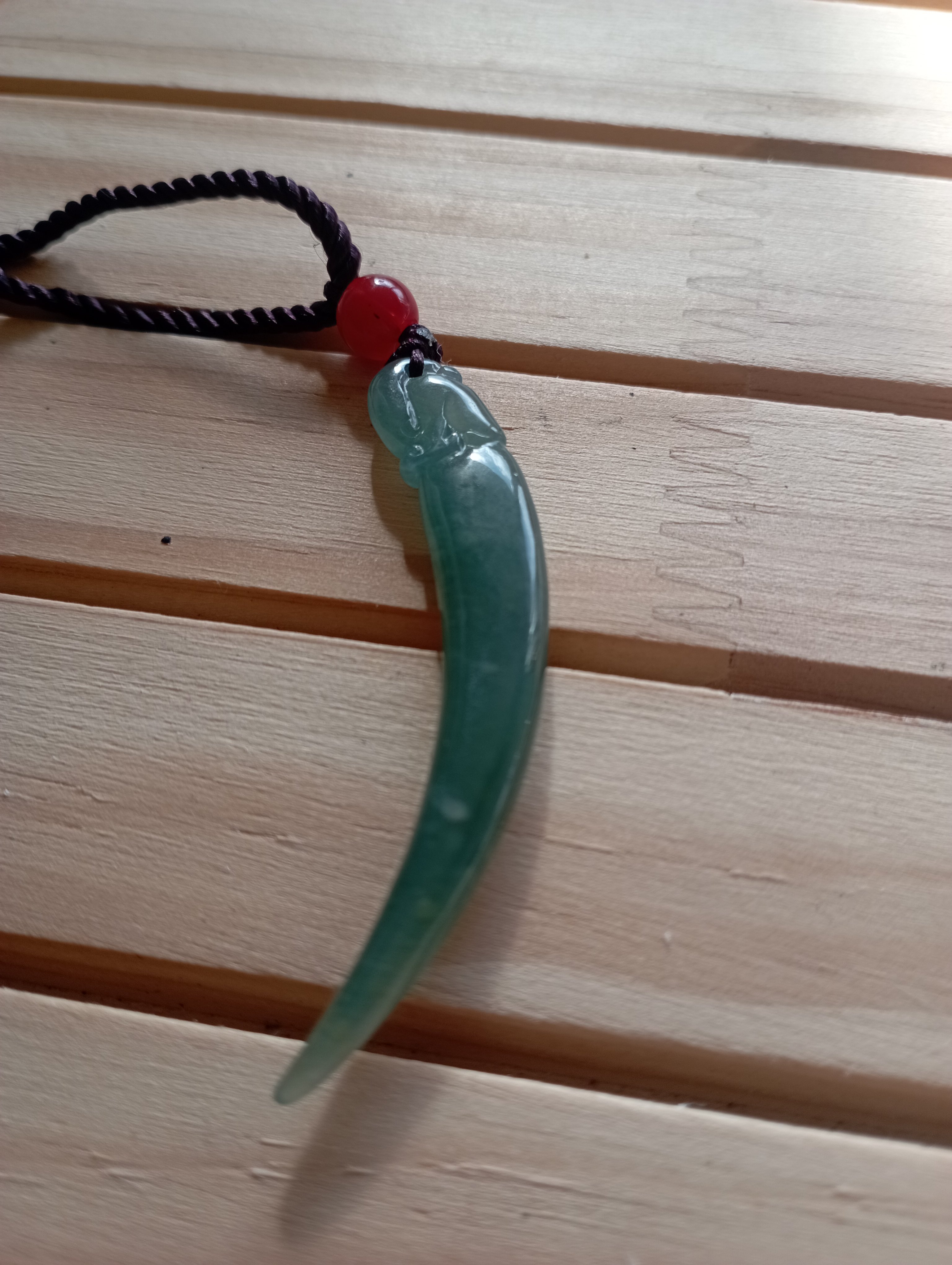Dragon tooth help to lead the wearer towards a smoother journey in life. As the dragon soars all over the world, it aids to welcome prosperity in your life and business, good luck and fortune and may your dreams come true. Measures 51.7 X 9 x 5.5mk, this is a very lovely icy jadeite pendant , comes with string chain. £45