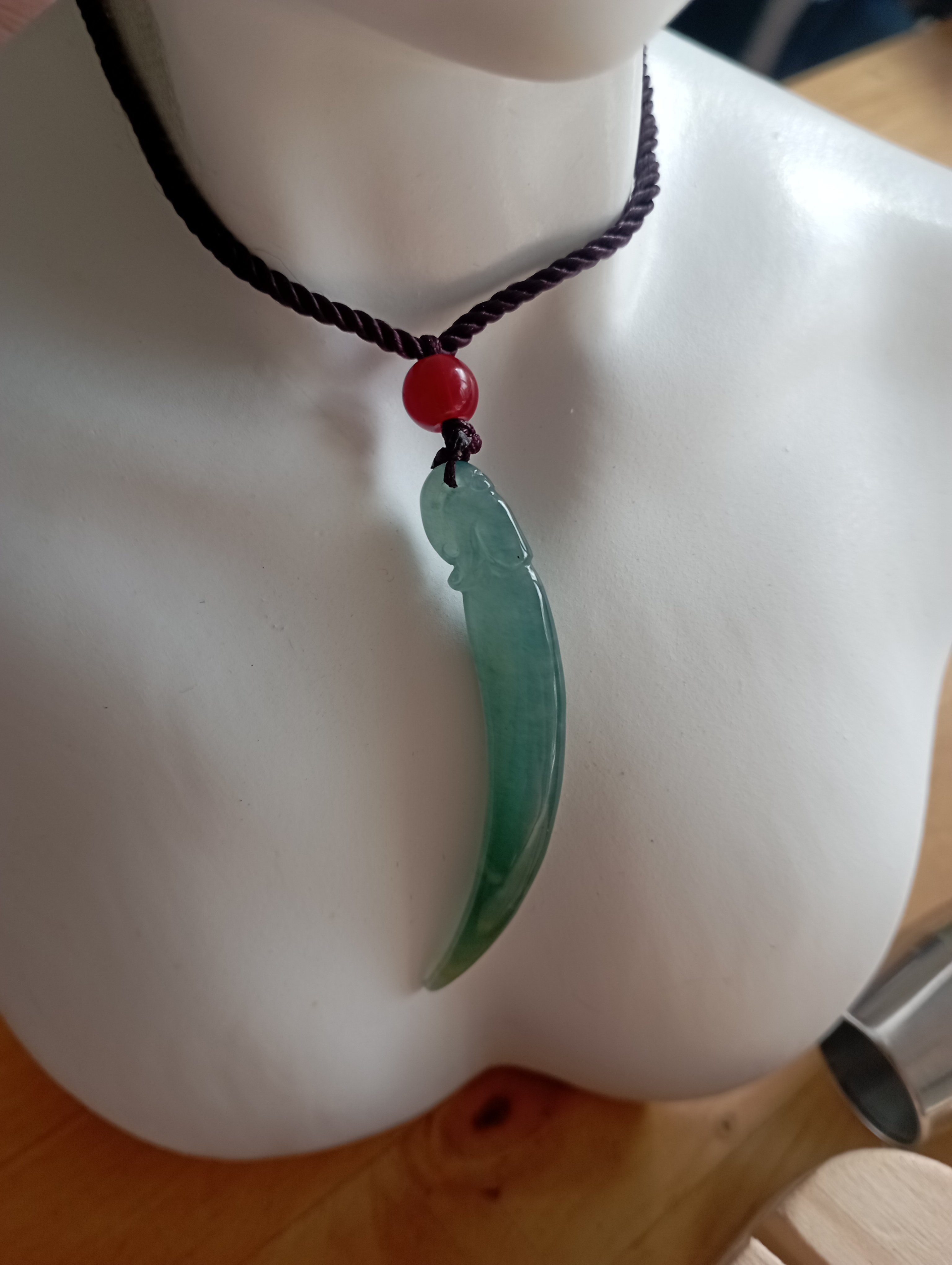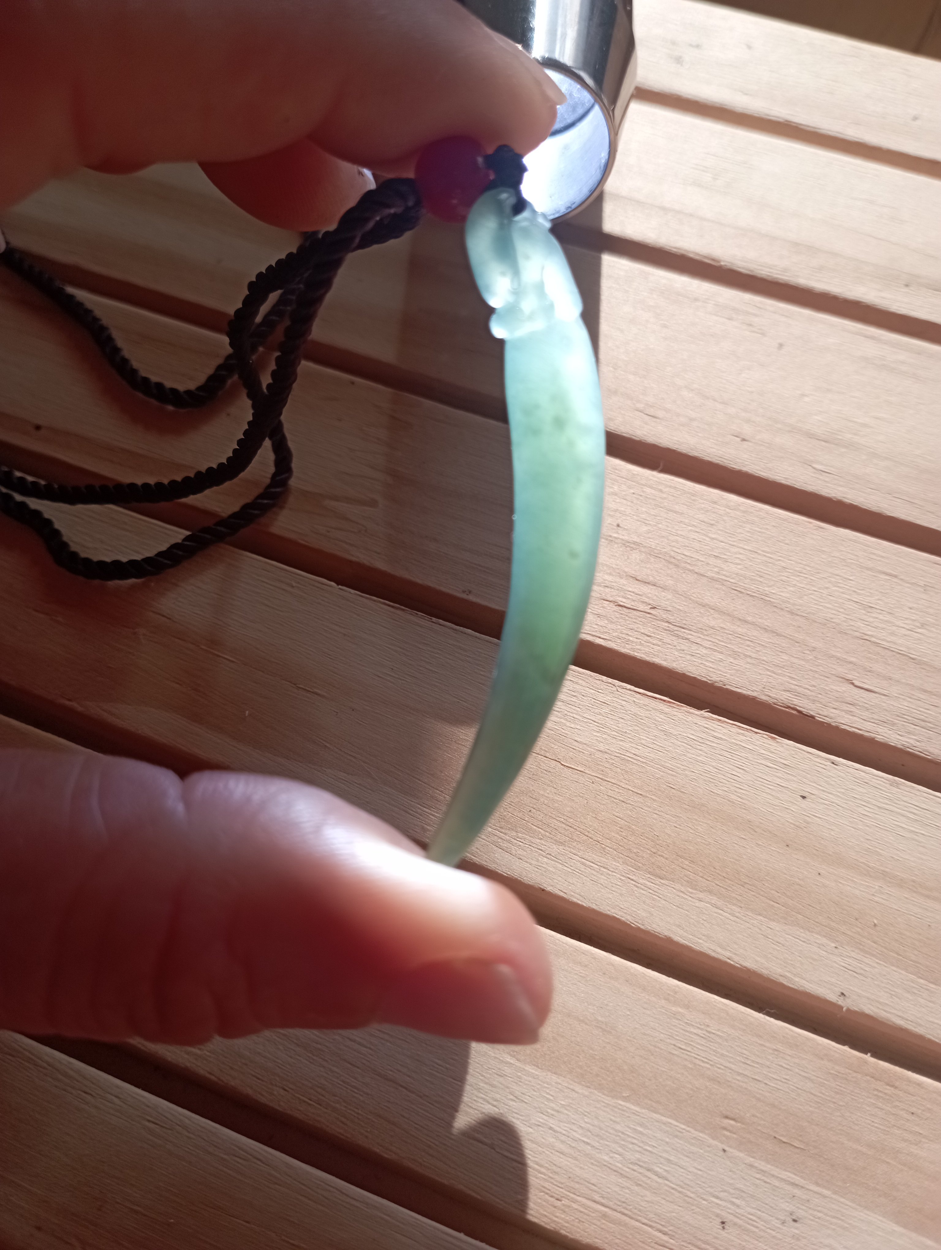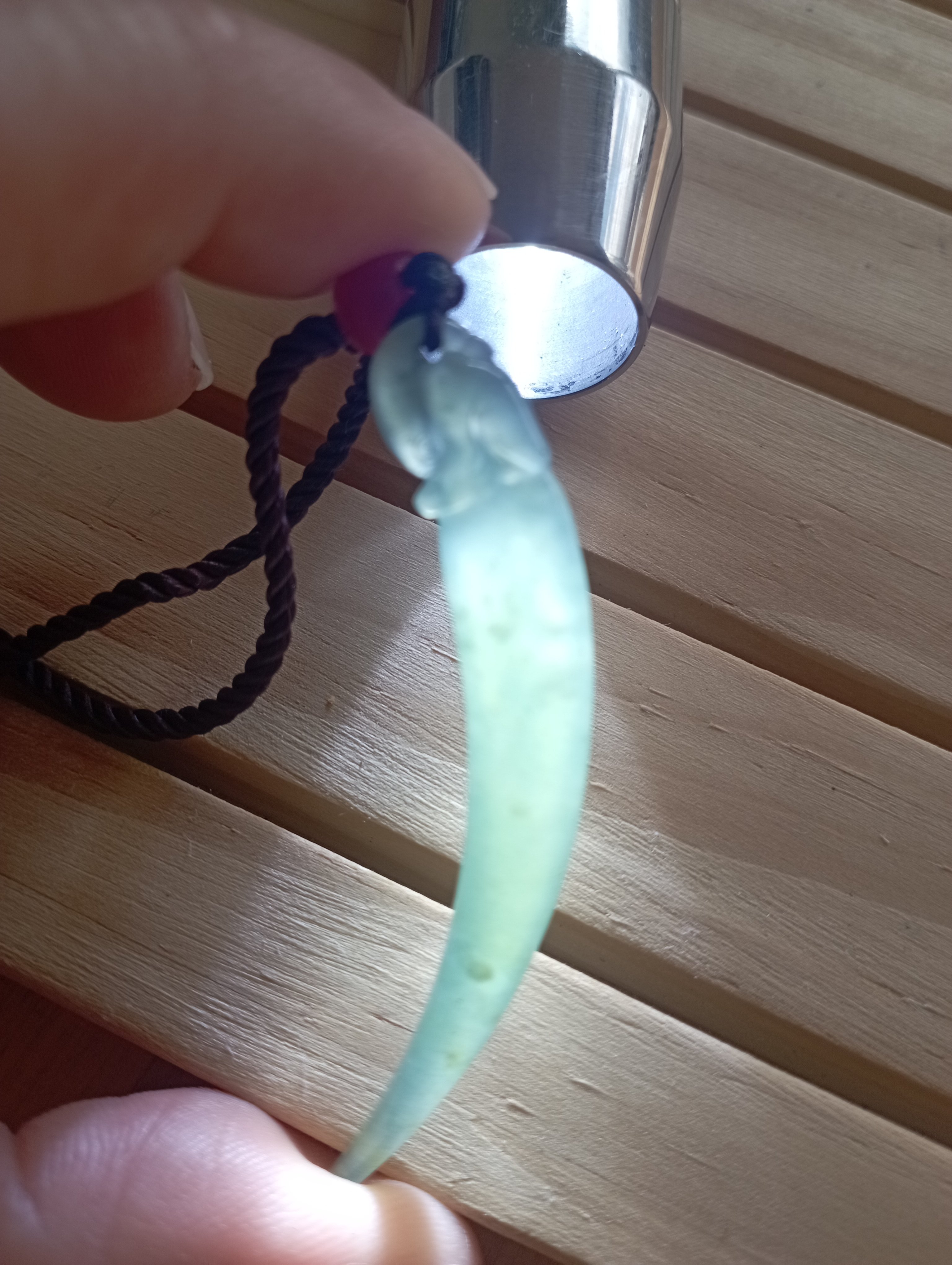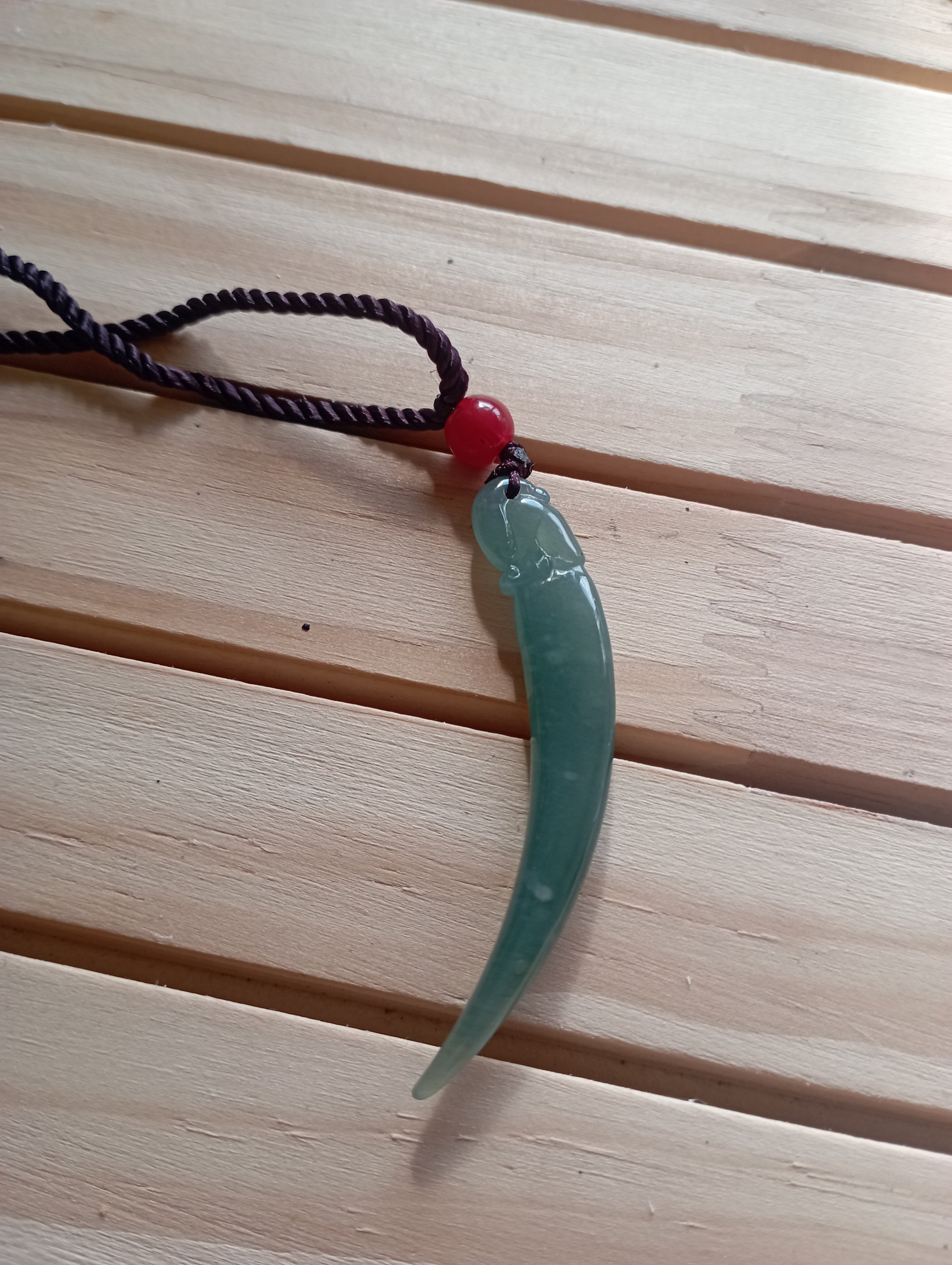 Dragon tooth help to lead the wearer towards a smoother journey in life. As the dragon soars all over the world, it aids to welcome prosperity in your life and business, good luck and fortune and may your dreams come true. Measures 51.7 X 9 x 5.5mk, this is a very lovely icy jadeite pendant , comes with string chain. £45