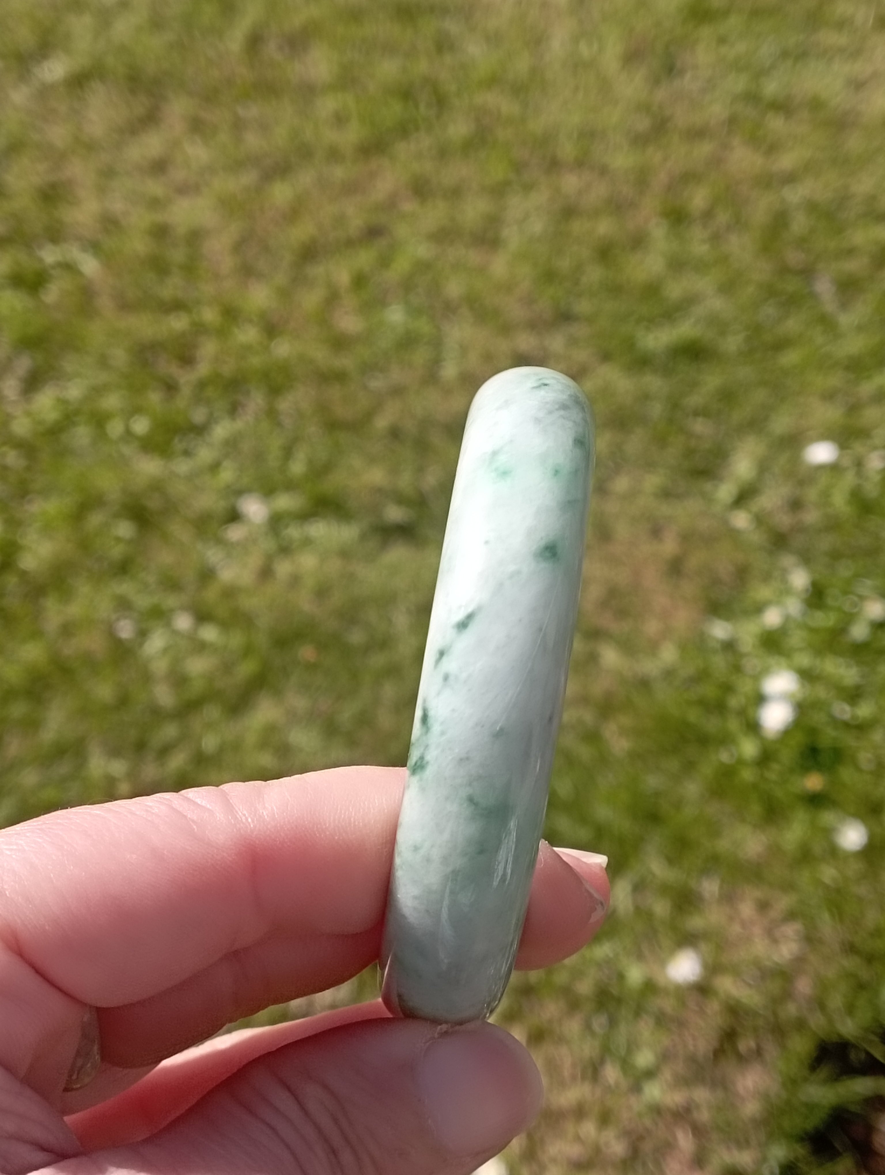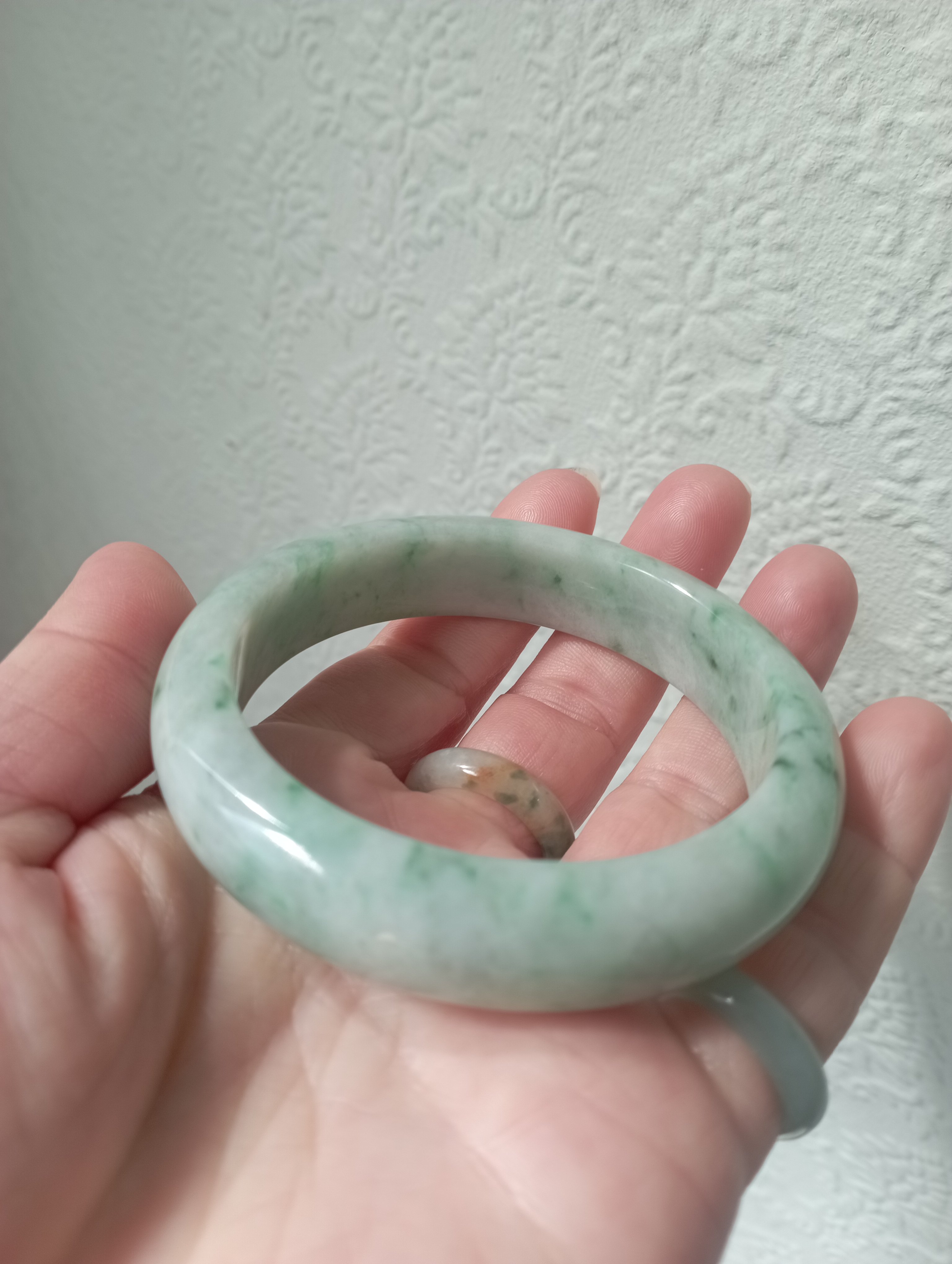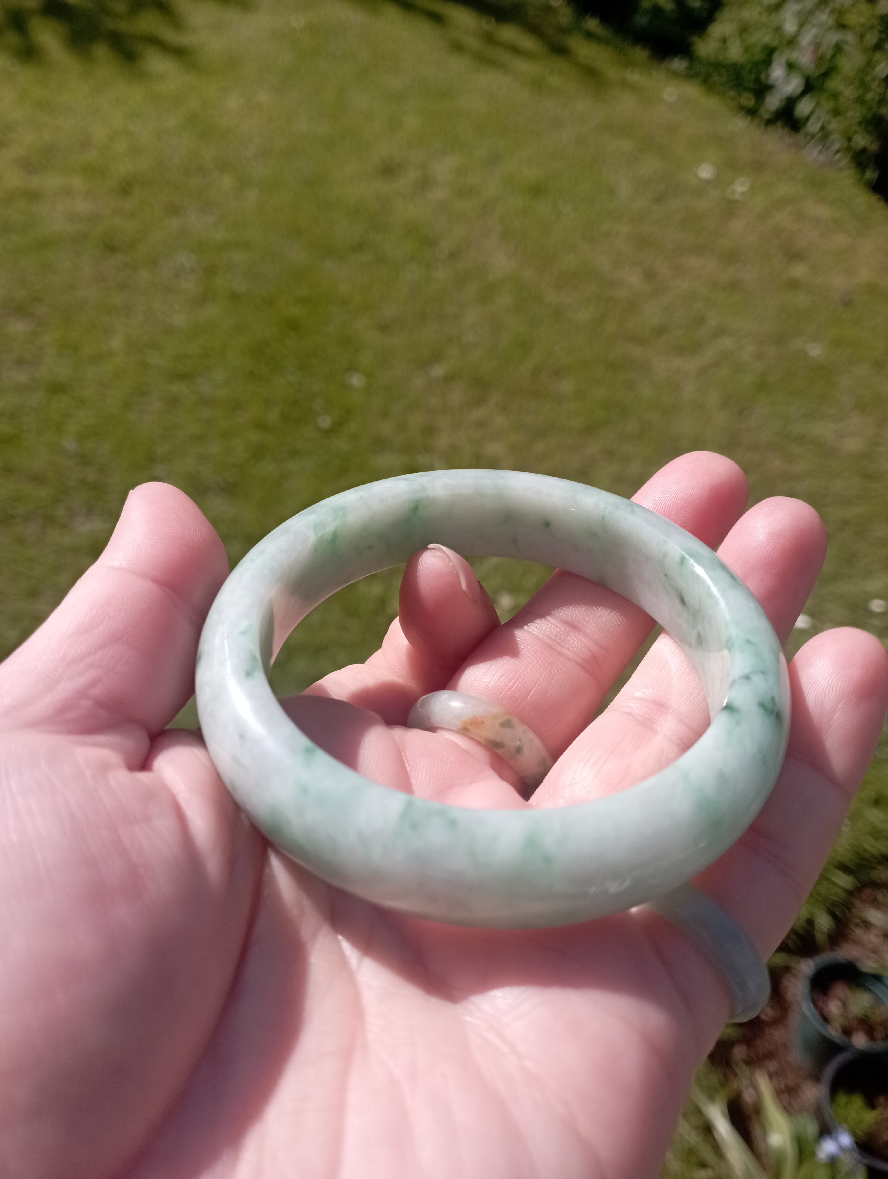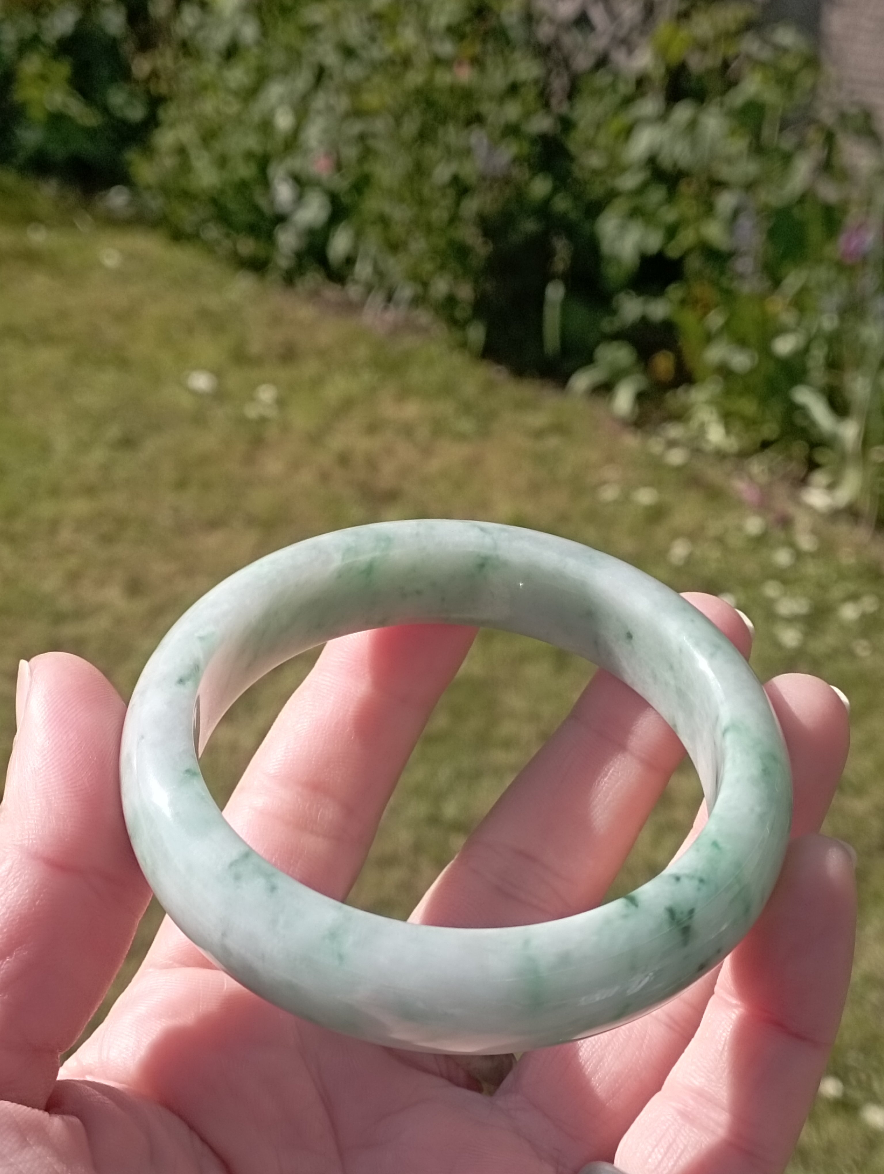 Apple green jadeite bangle with lovely darker apple green blooms measures 56.3 X 13.5 X 8.3mm, weighs 62.11g, comes with a certificate of authenticity £399