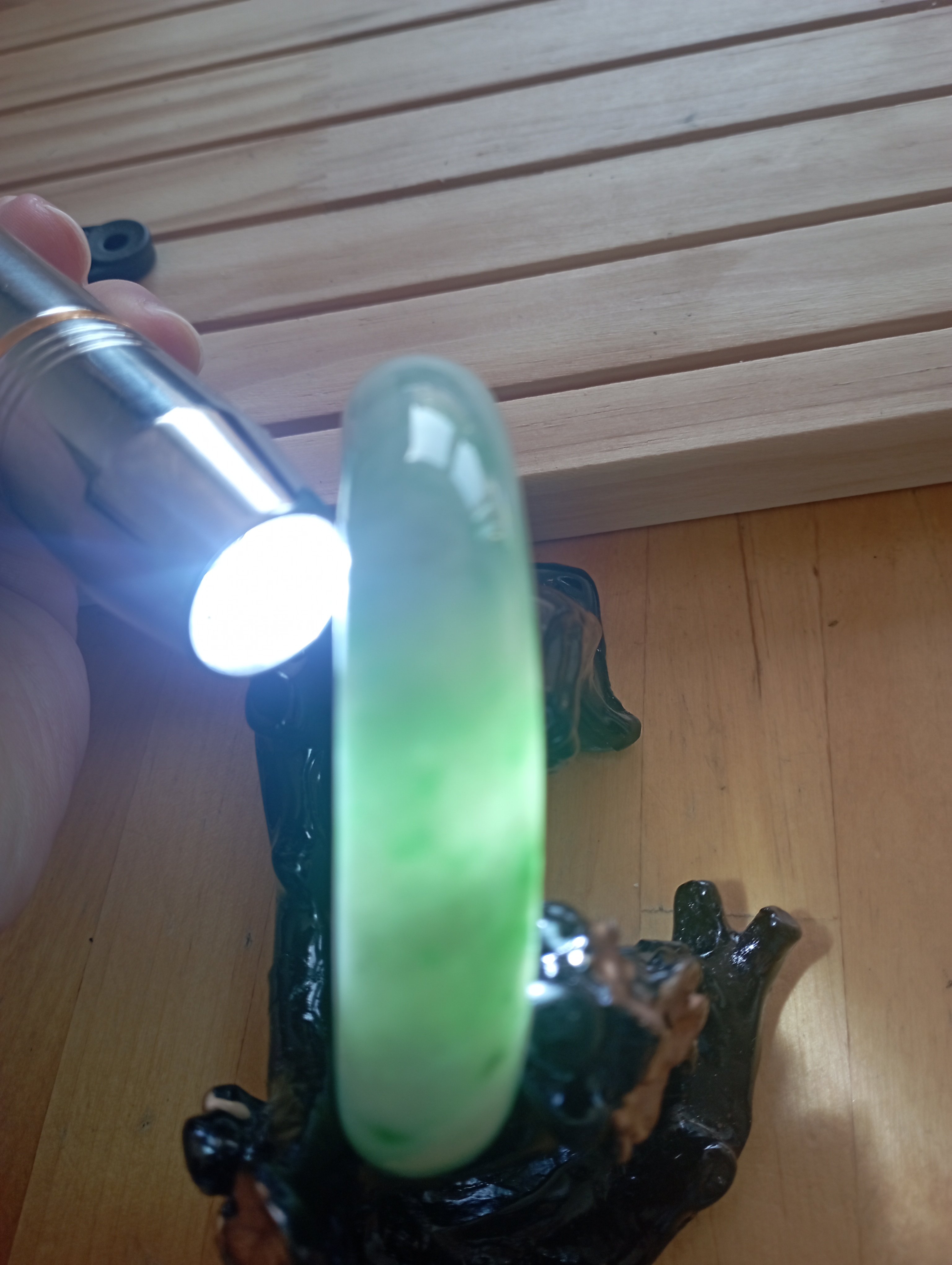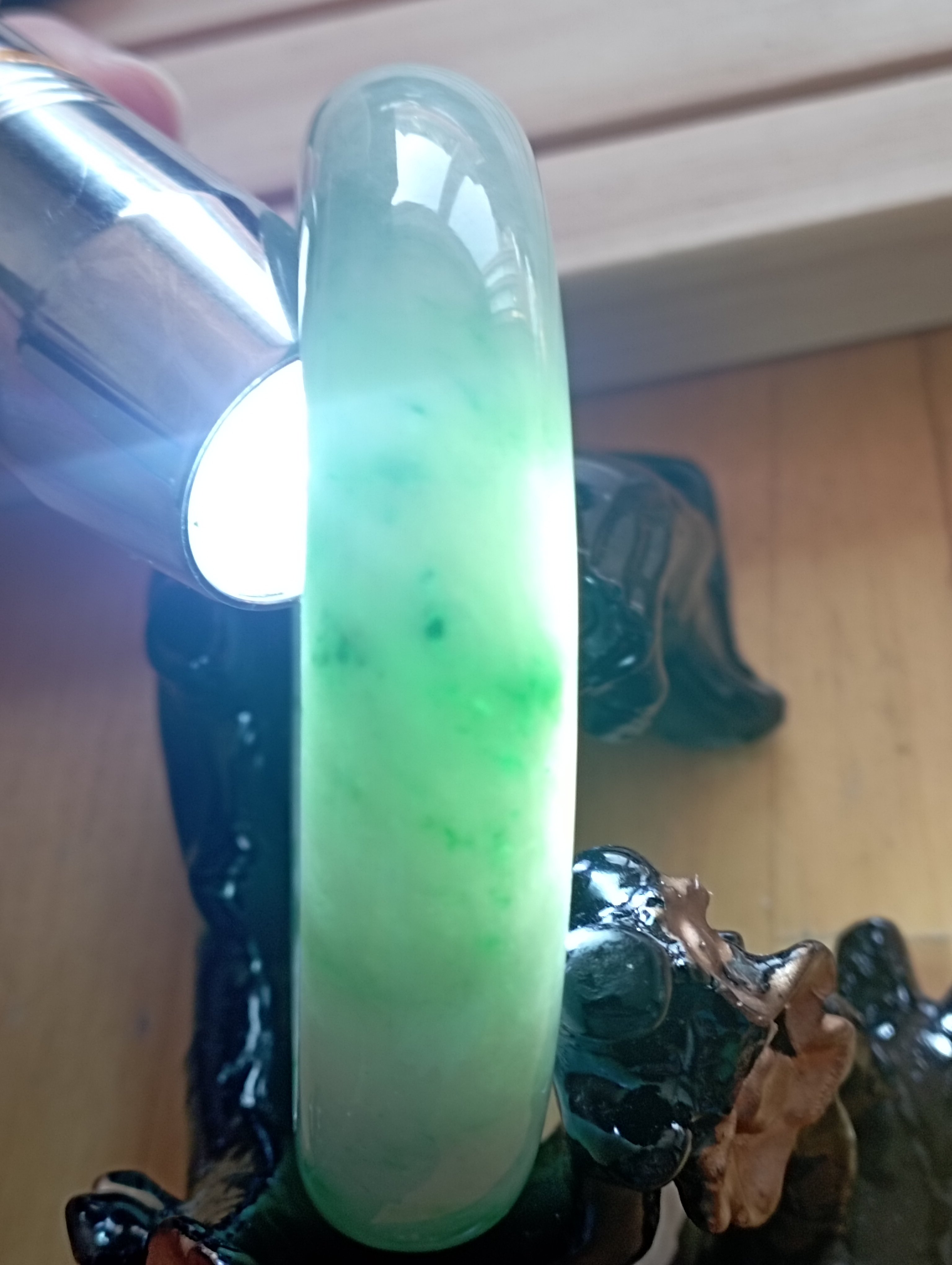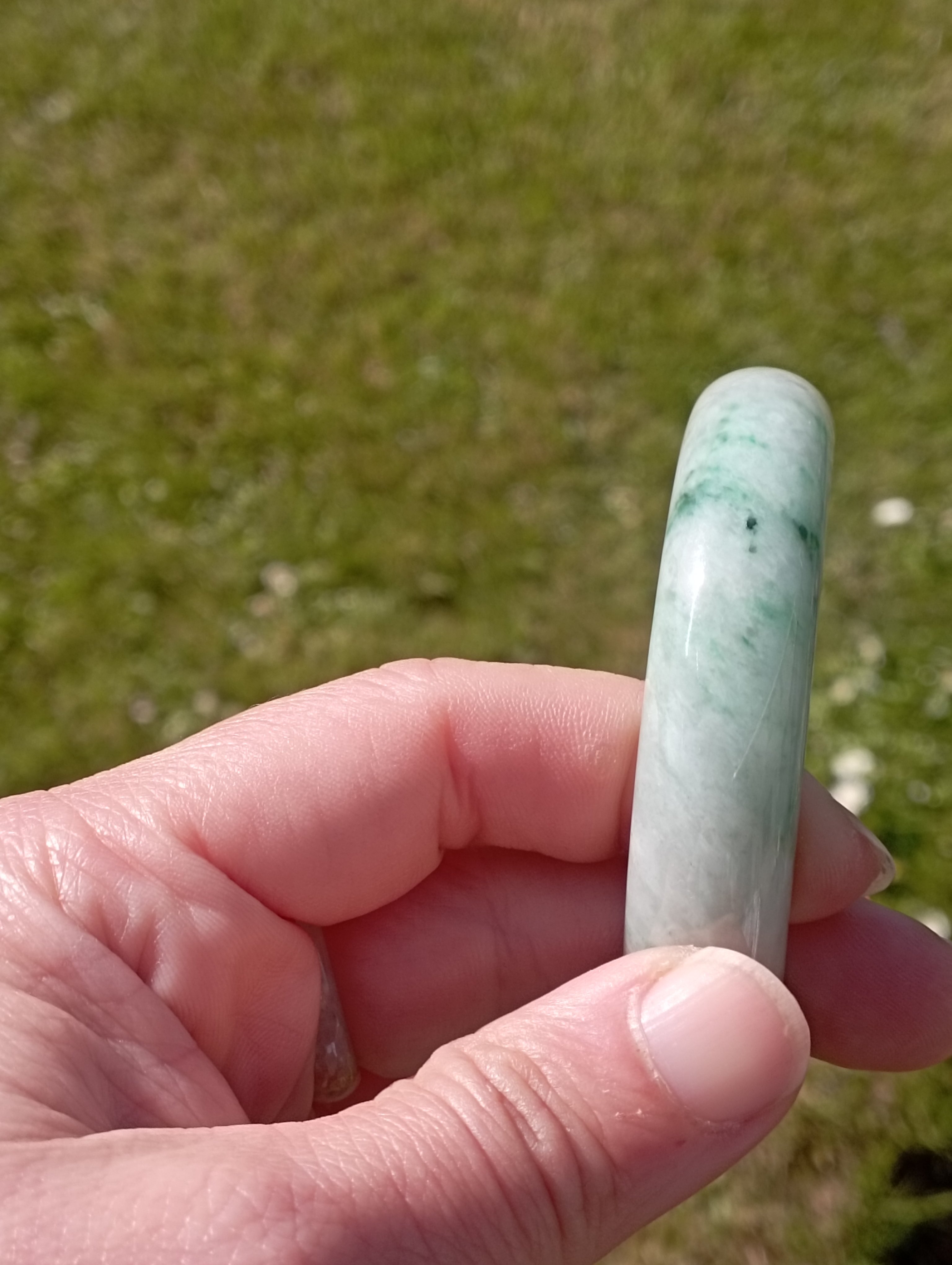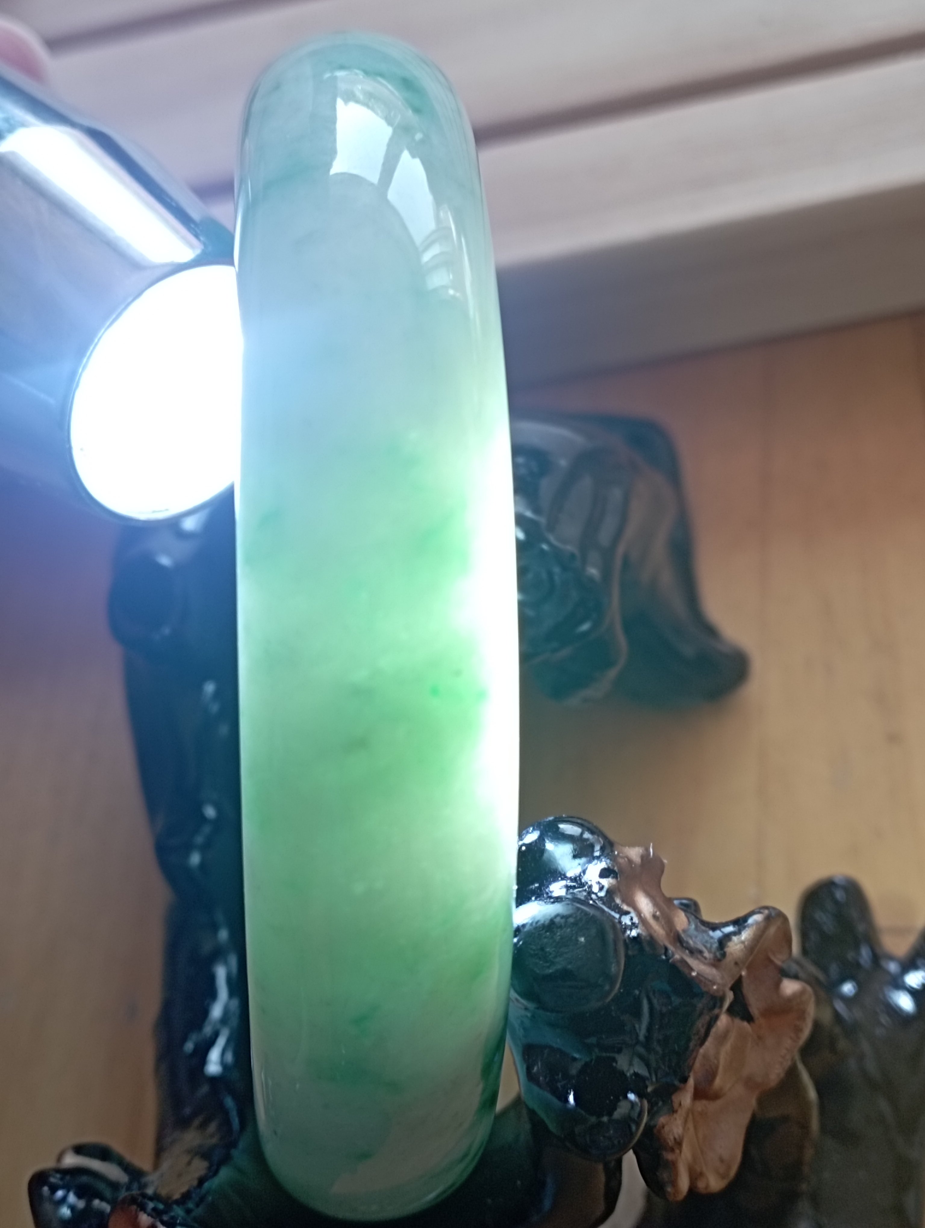 Apple green jadeite bangle with lovely darker apple green blooms measures 56.3 X 13.5 X 8.3mm, weighs 62.11g, comes with a certificate of authenticity £399
