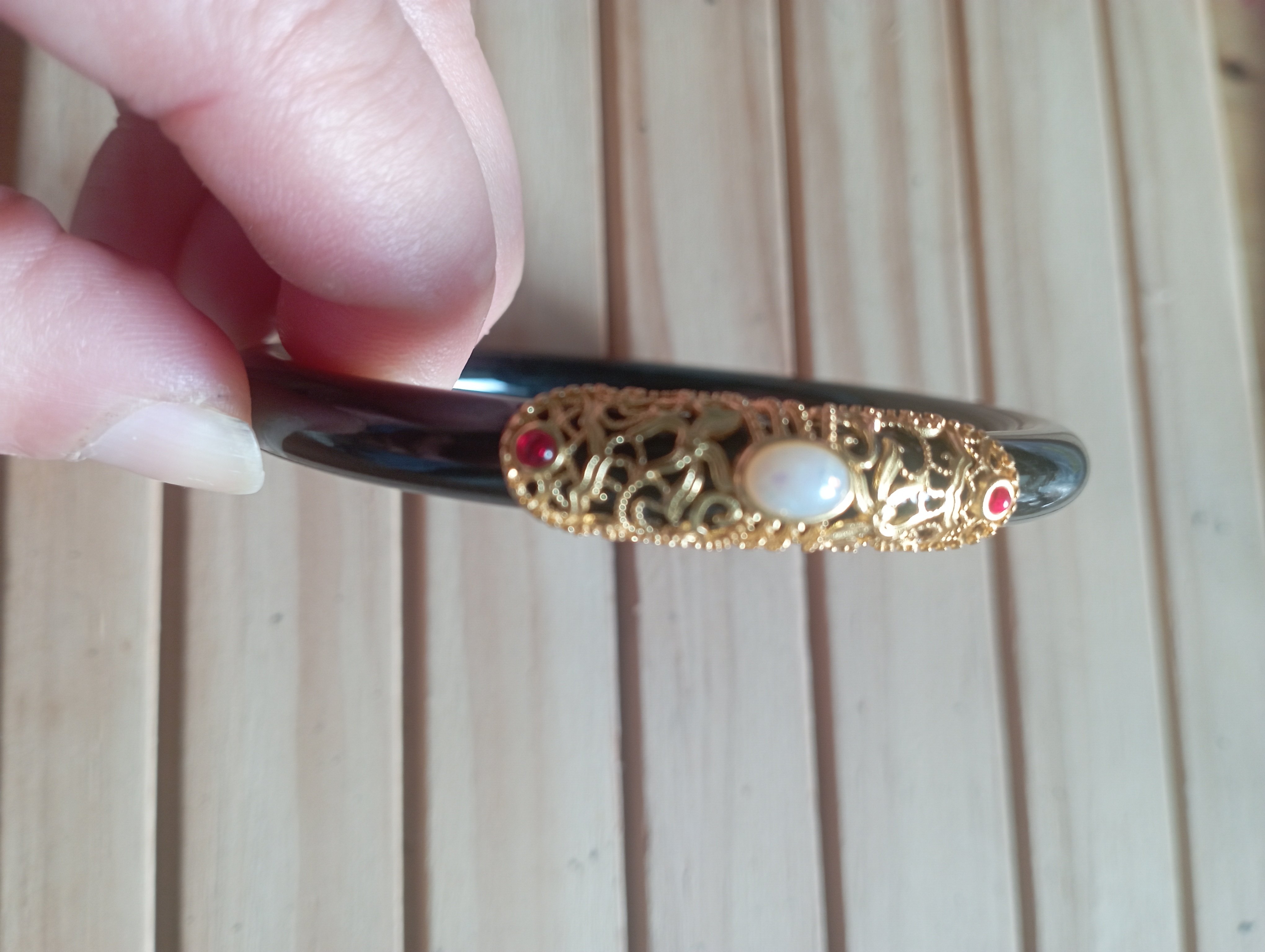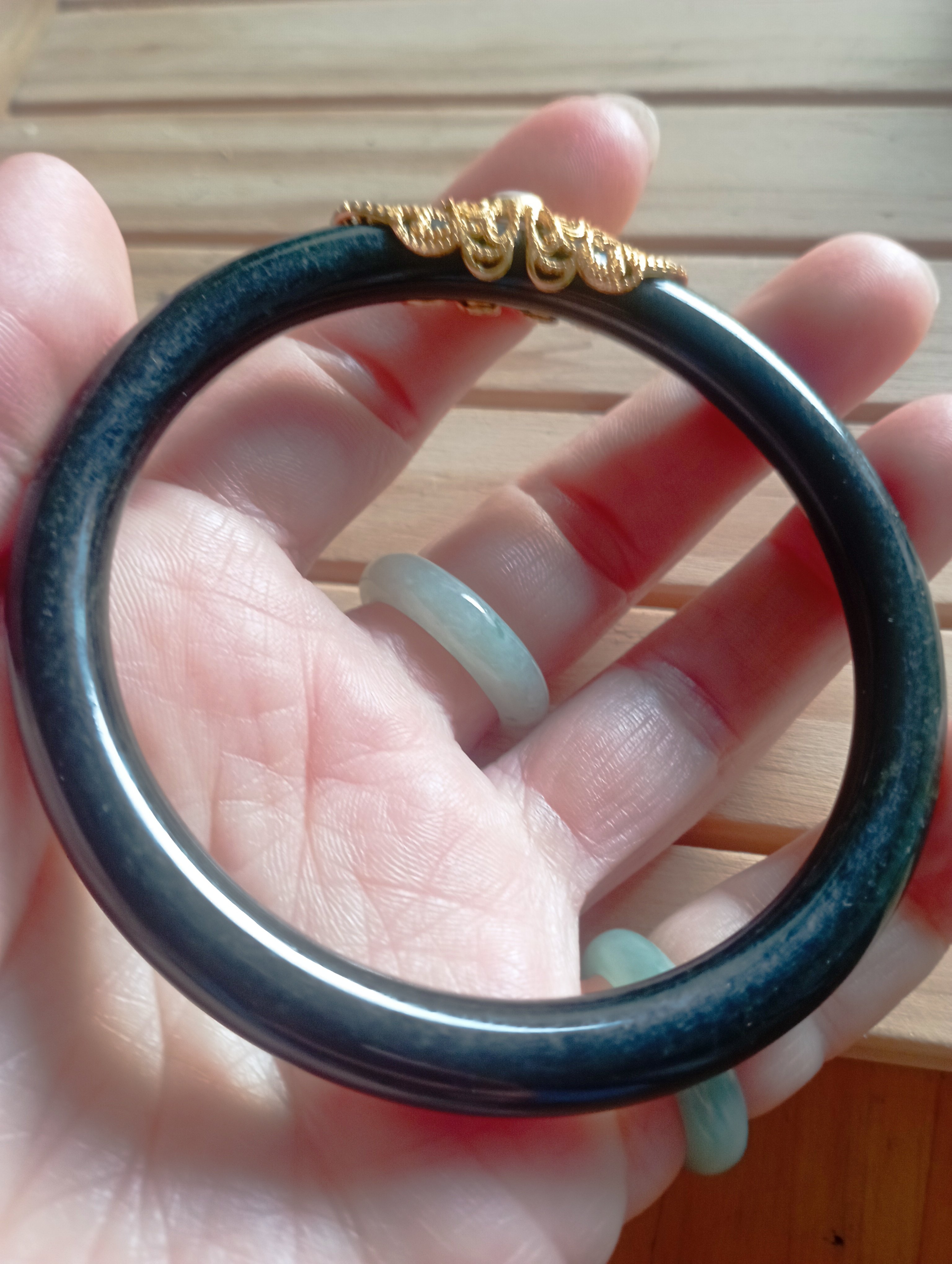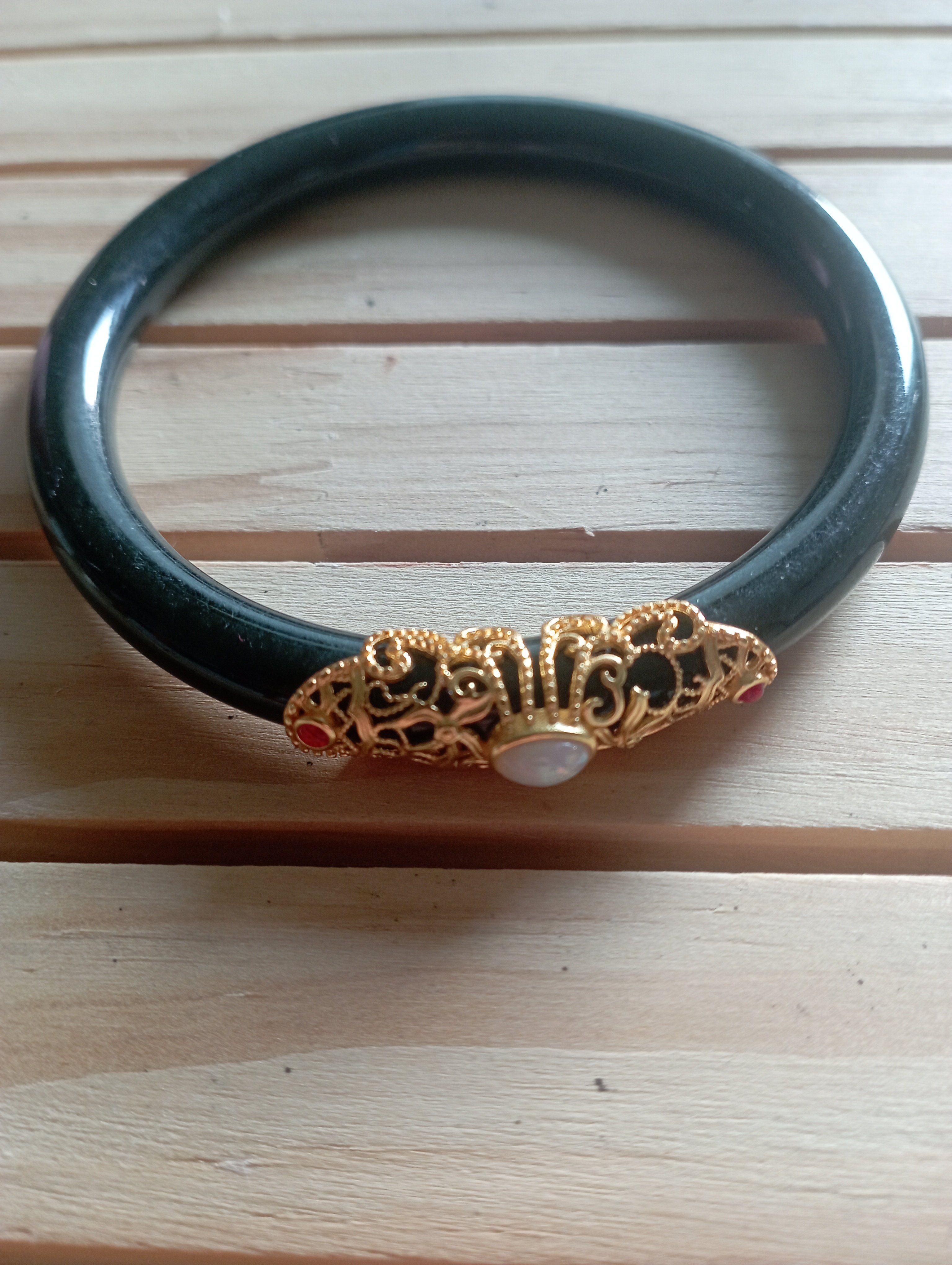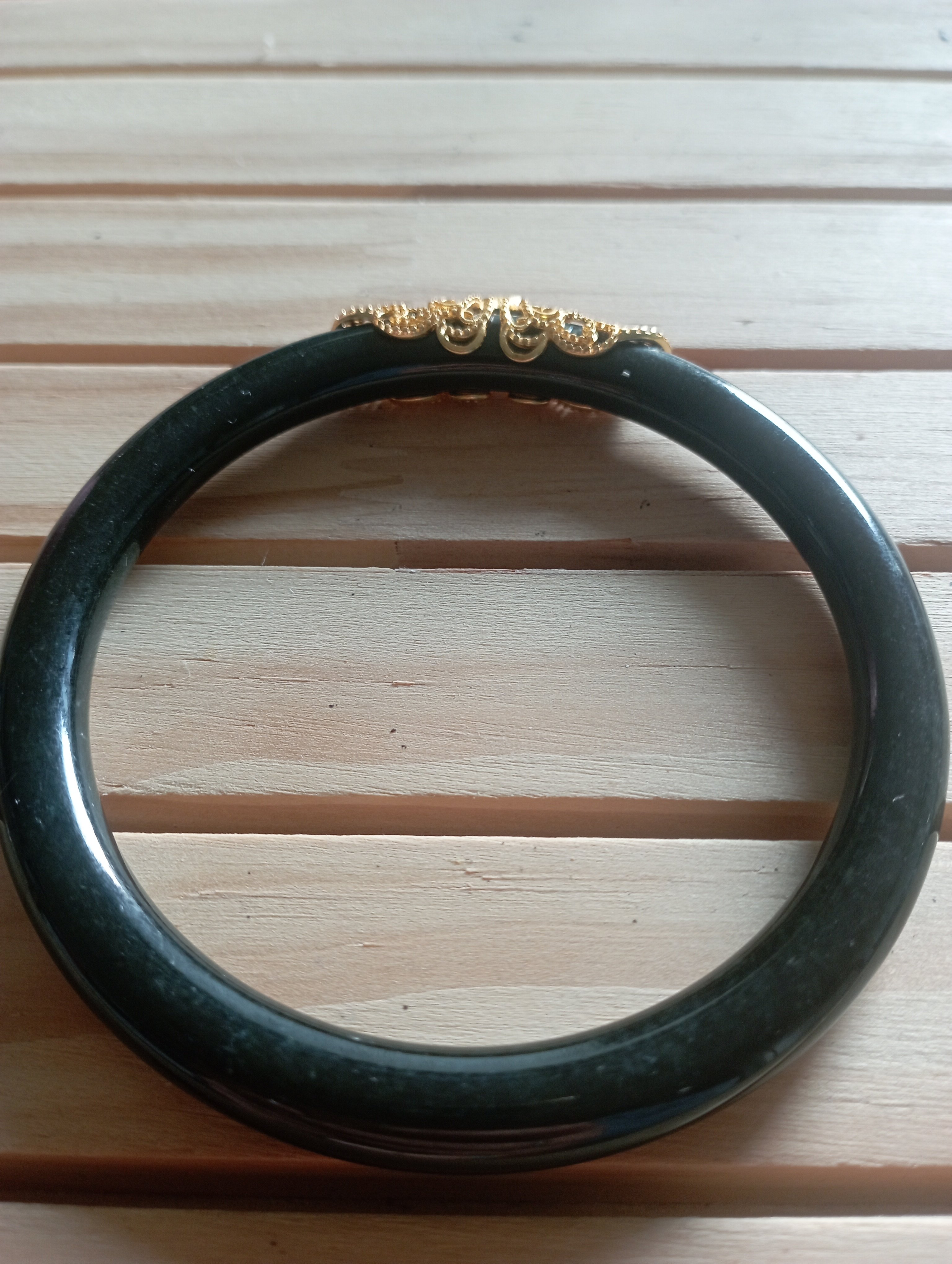 Gorgeous round bangle made of Hetian jade, one of the four famous jade in China, the bangle is the same black colour.The adornment on top of the bangle is sterling silver plated gold to give it an unusual look. Measures 61 X 6.7 X 7.9mm weighs 29.36g, comes with a certificate of authenticity £69