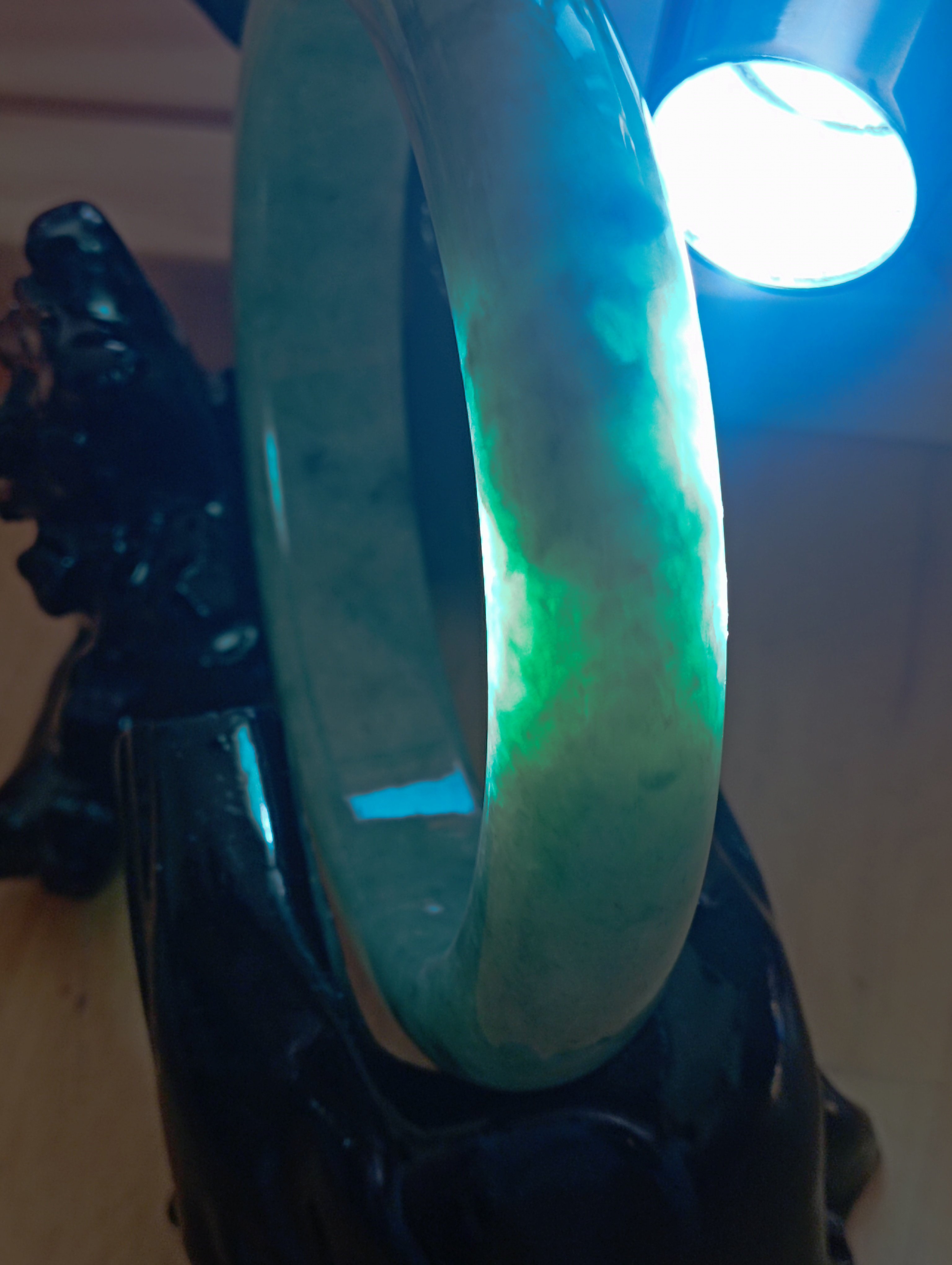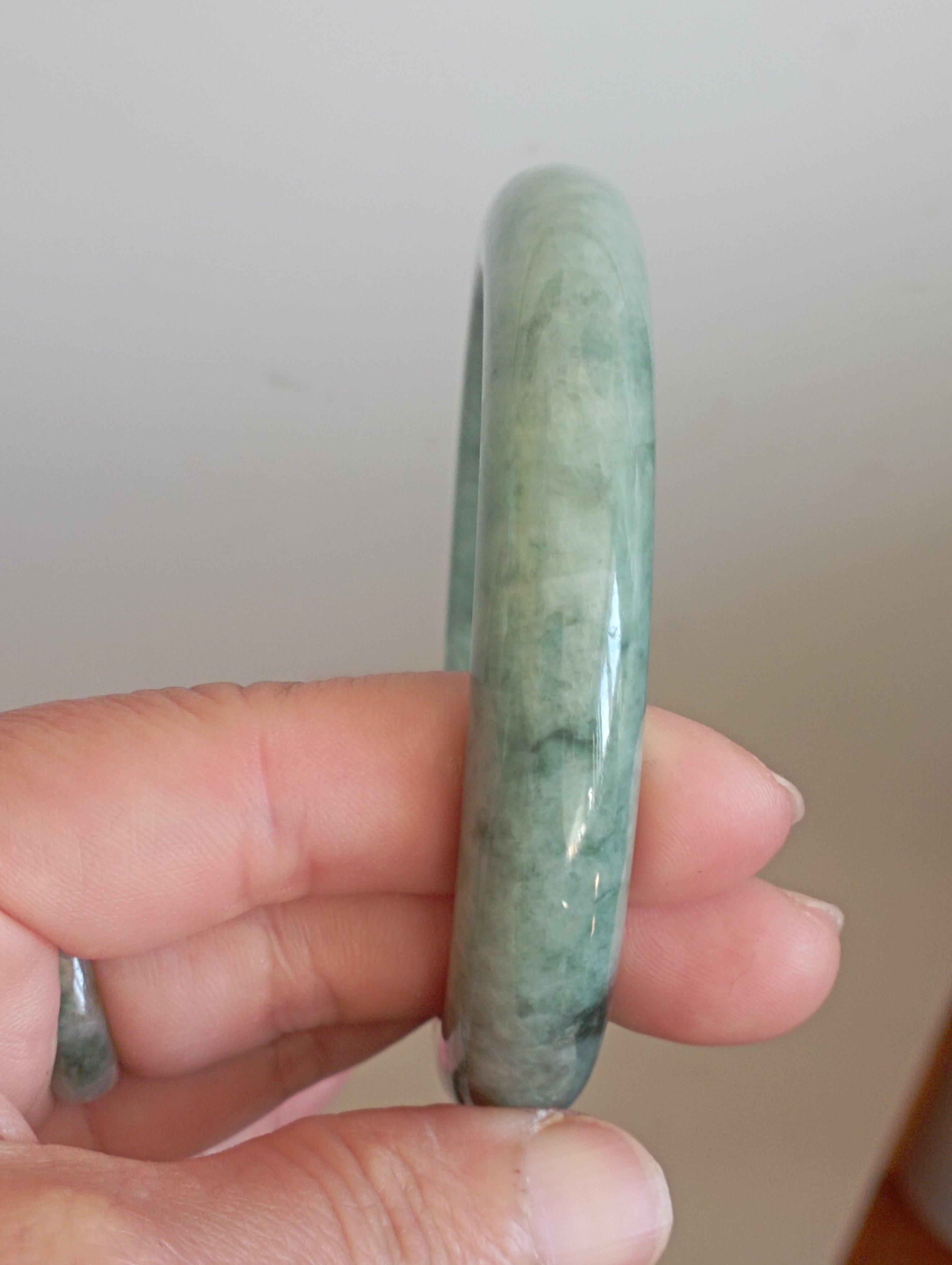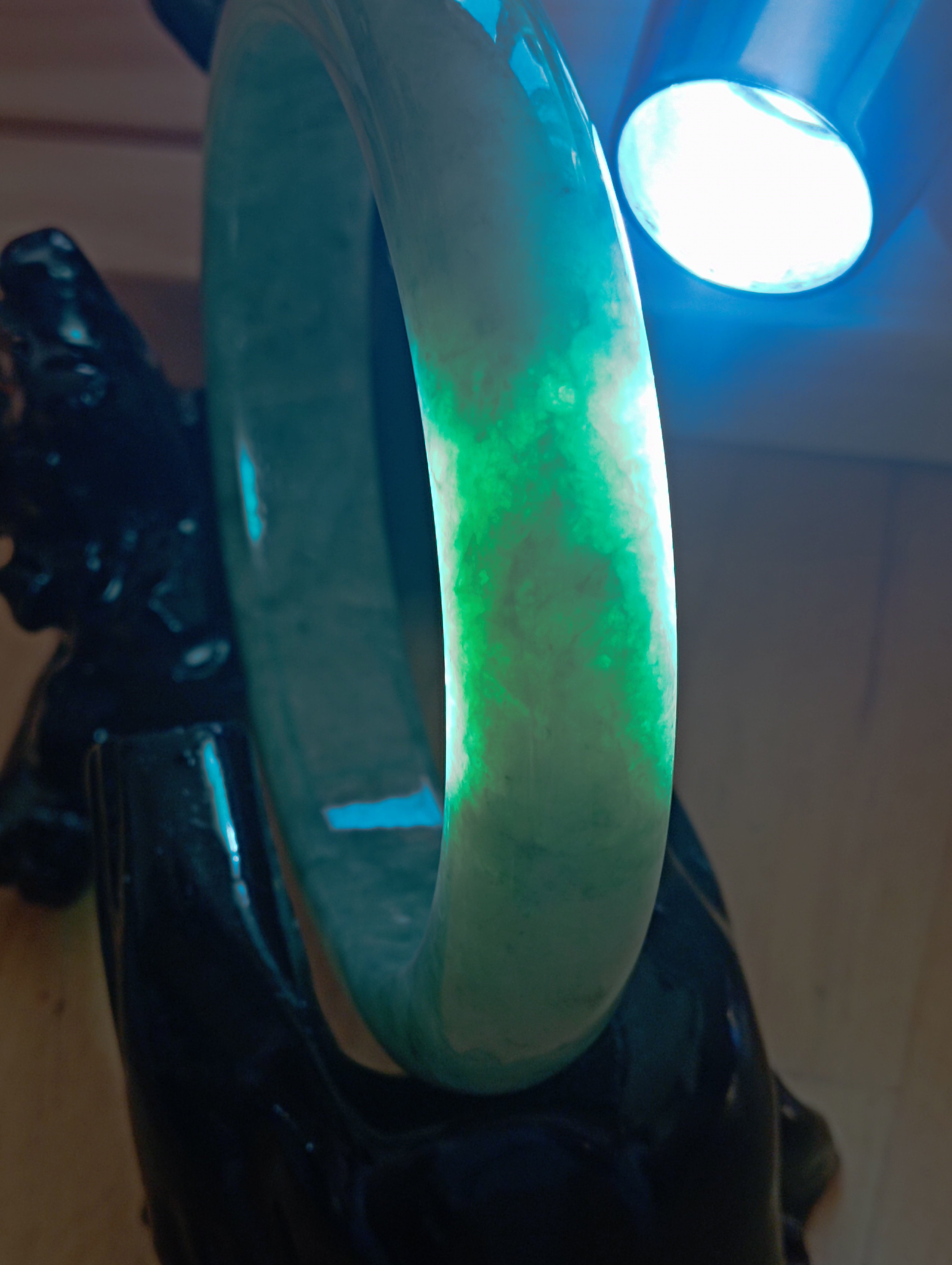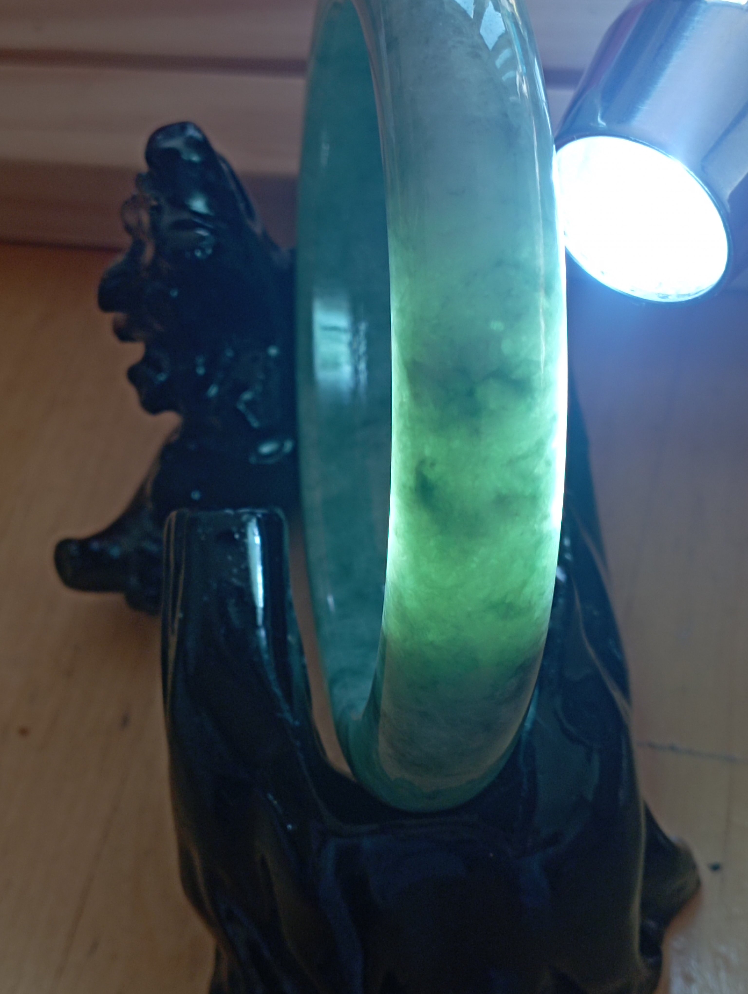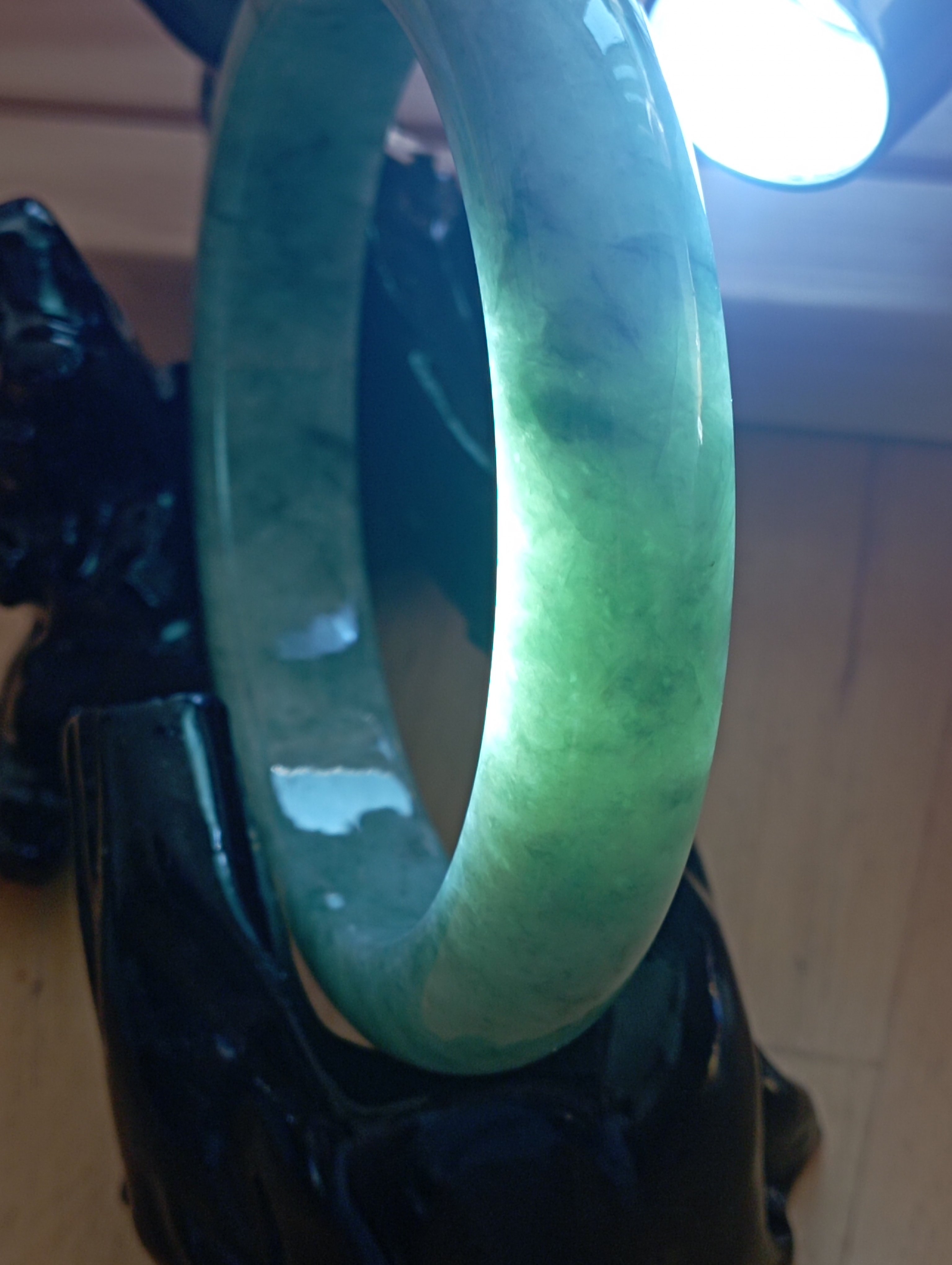 Full green with blooms bangle made of jadeite from Myanmar. A beautiful vibrant green when lights go through, measures 60.4 X 12.1 X 8.6mm, weighs 70.70g, comes with a certificate of authenticity £199