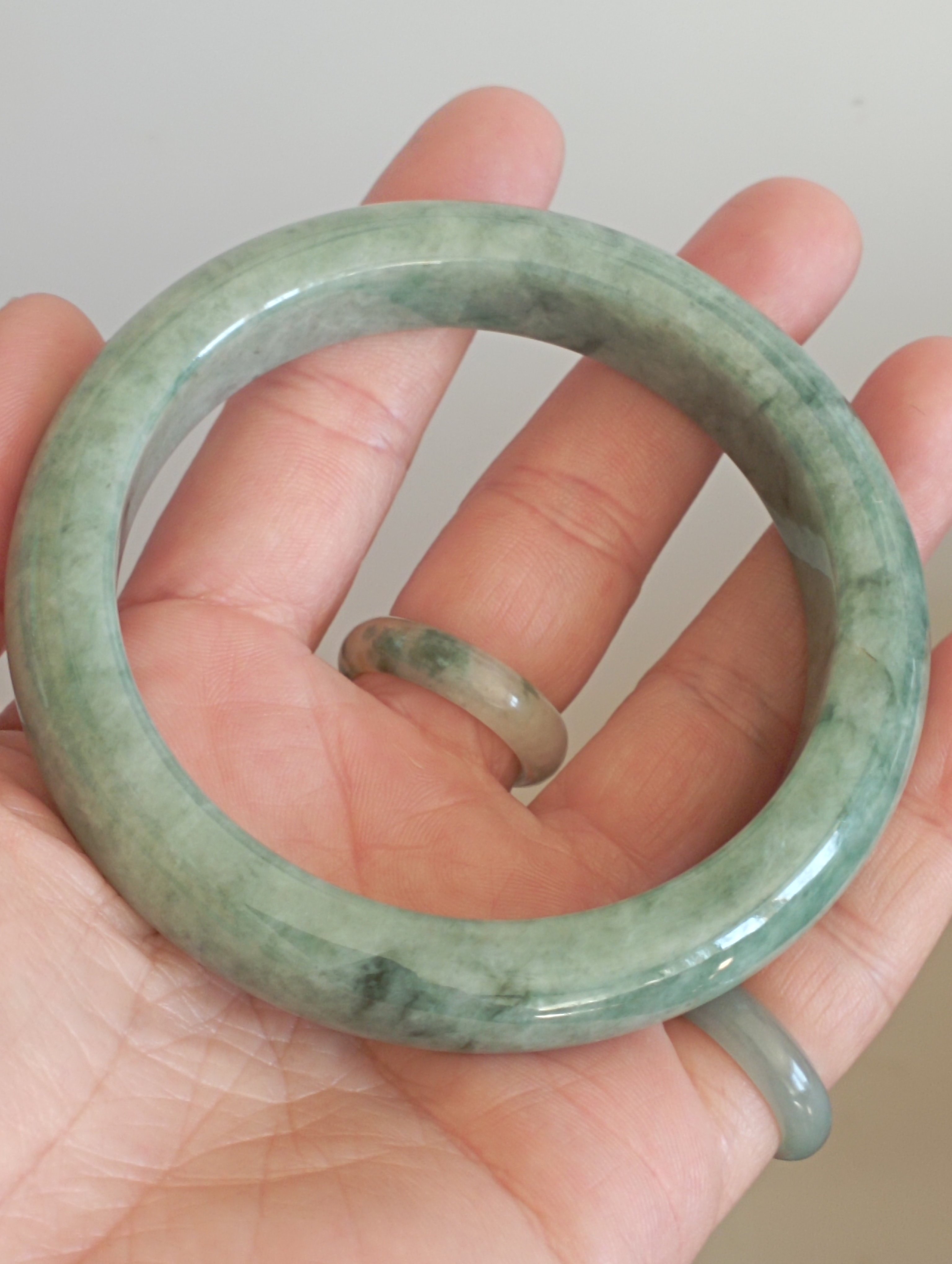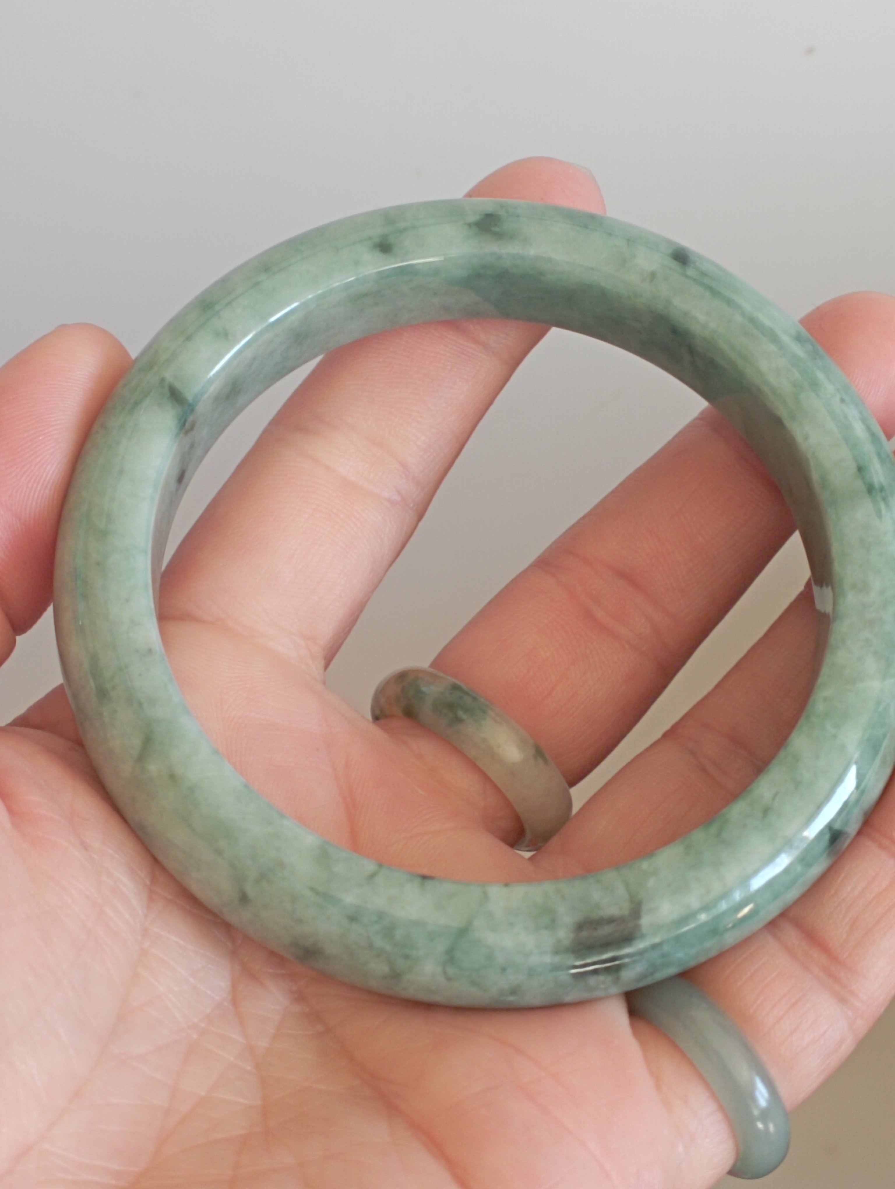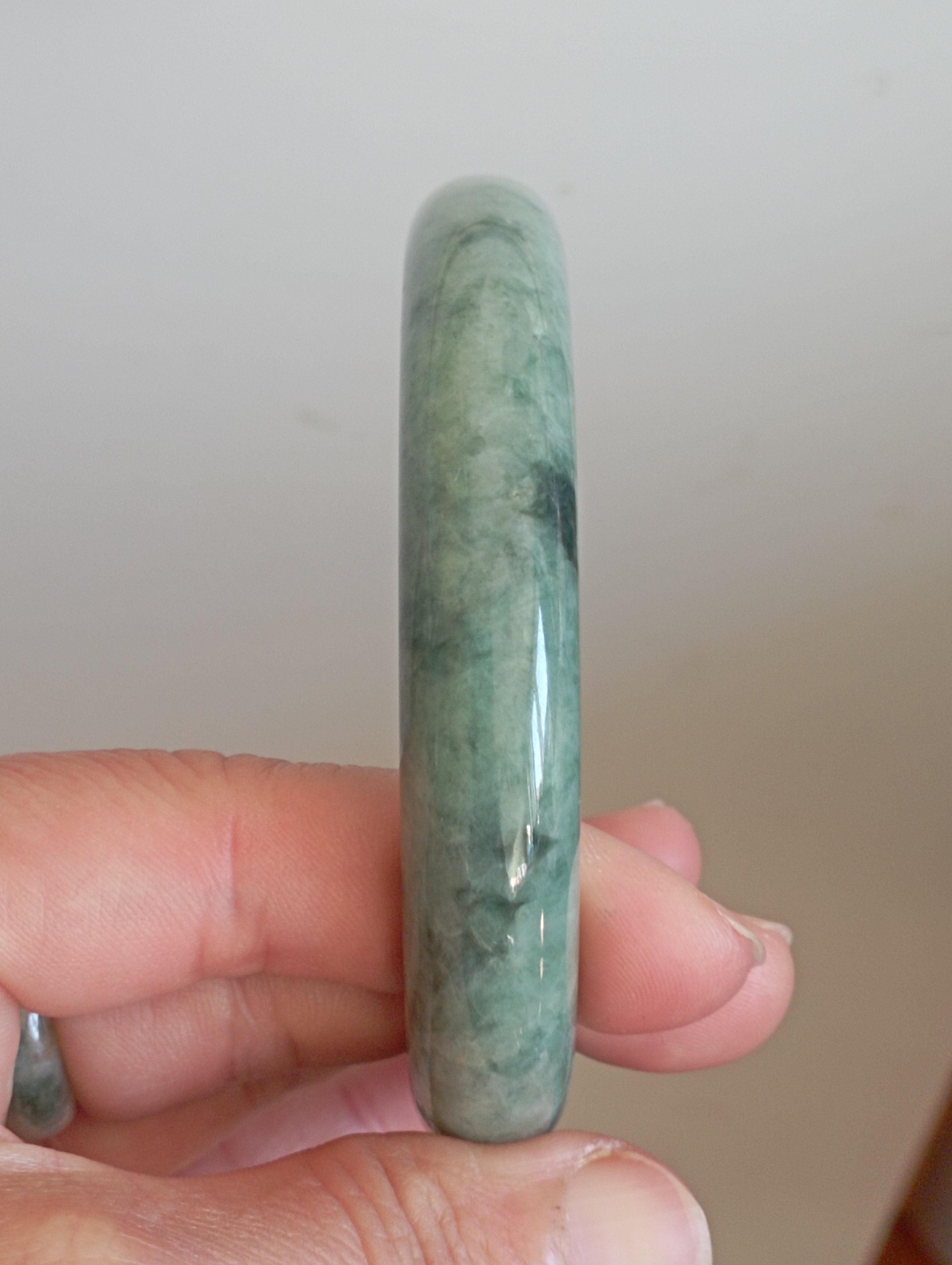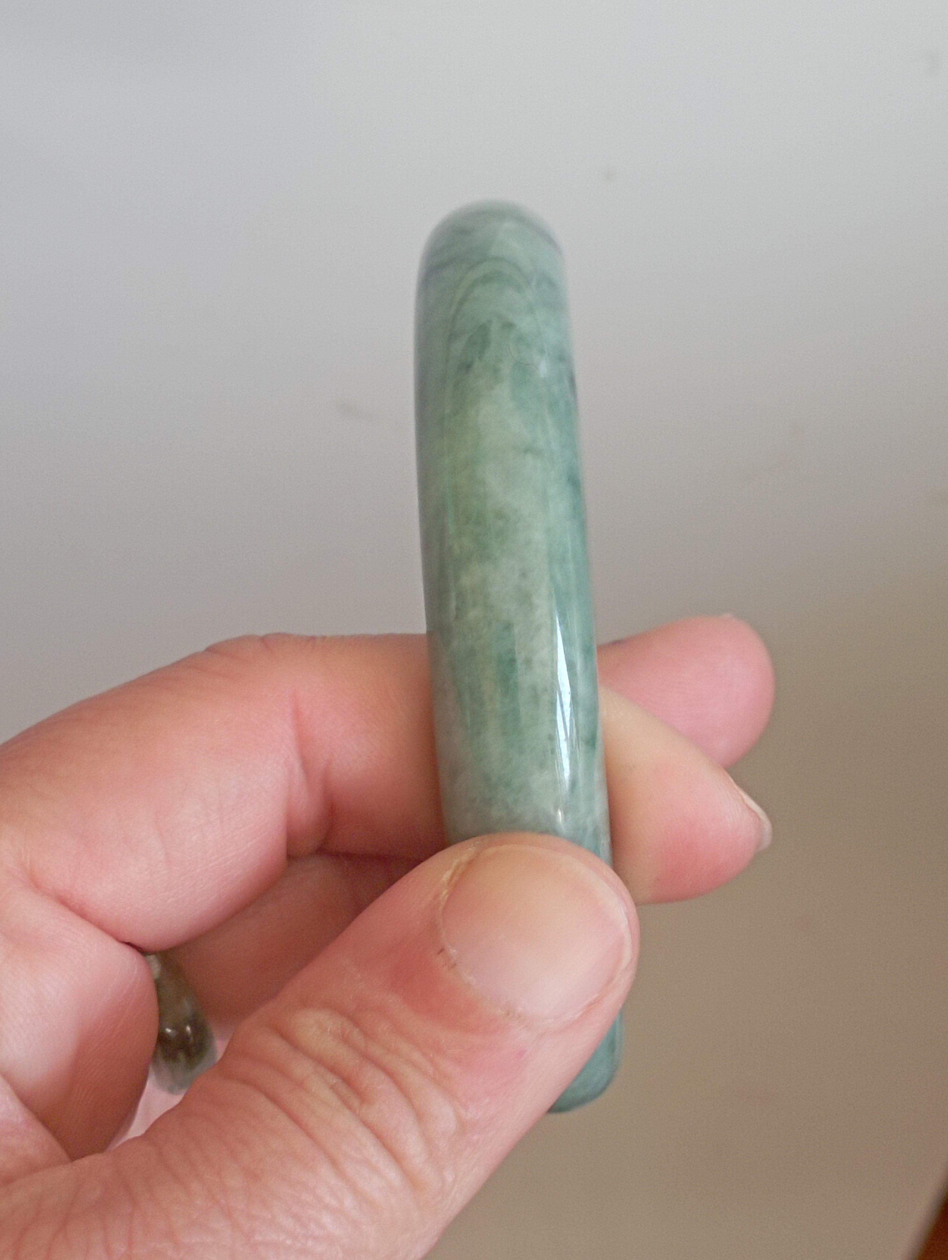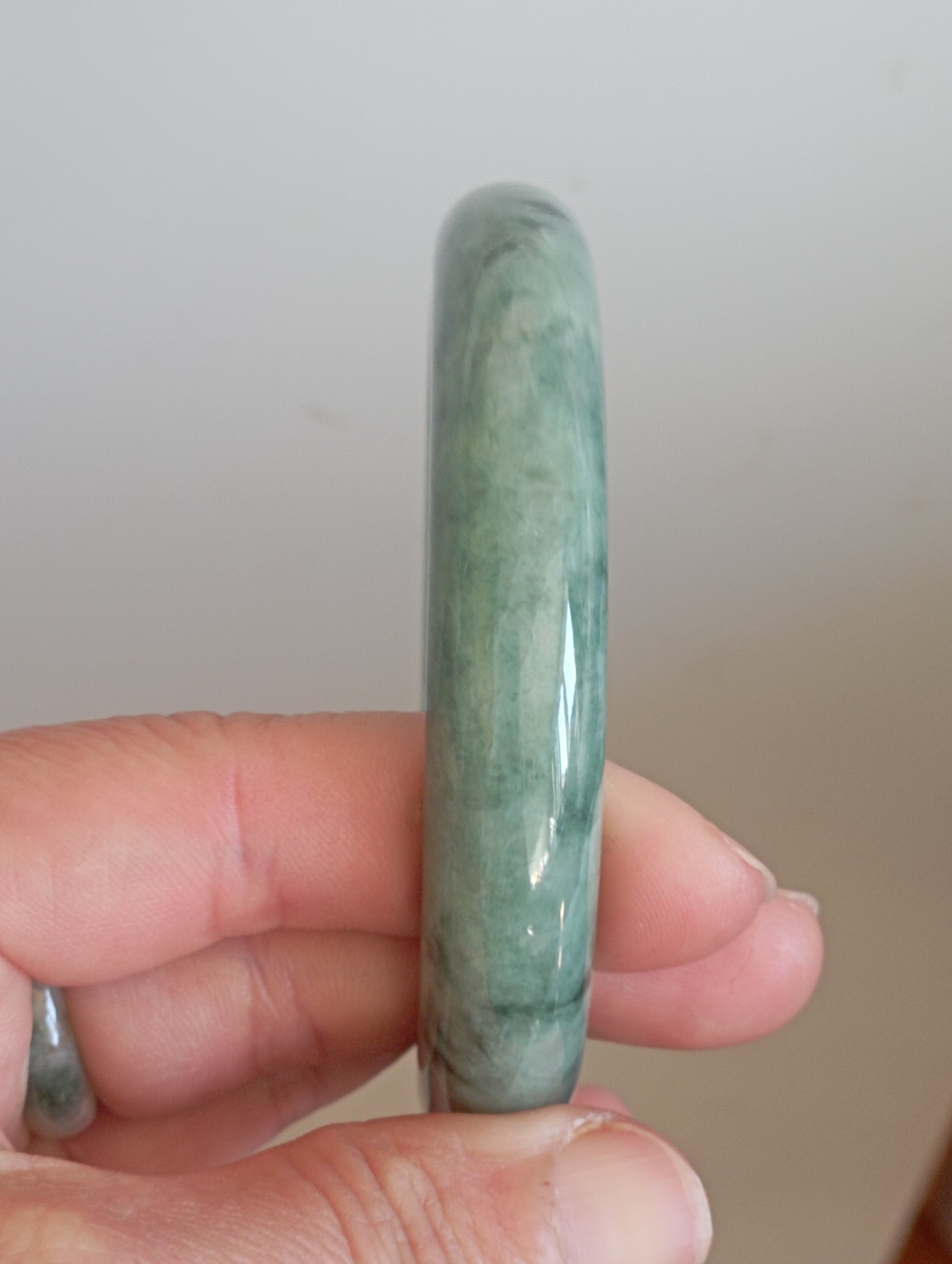 Full green with blooms bangle made of jadeite from Myanmar. A beautiful vibrant green when lights go through, measures 60.4 X 12.1 X 8.6mm, weighs 70.70g, comes with a certificate of authenticity £199