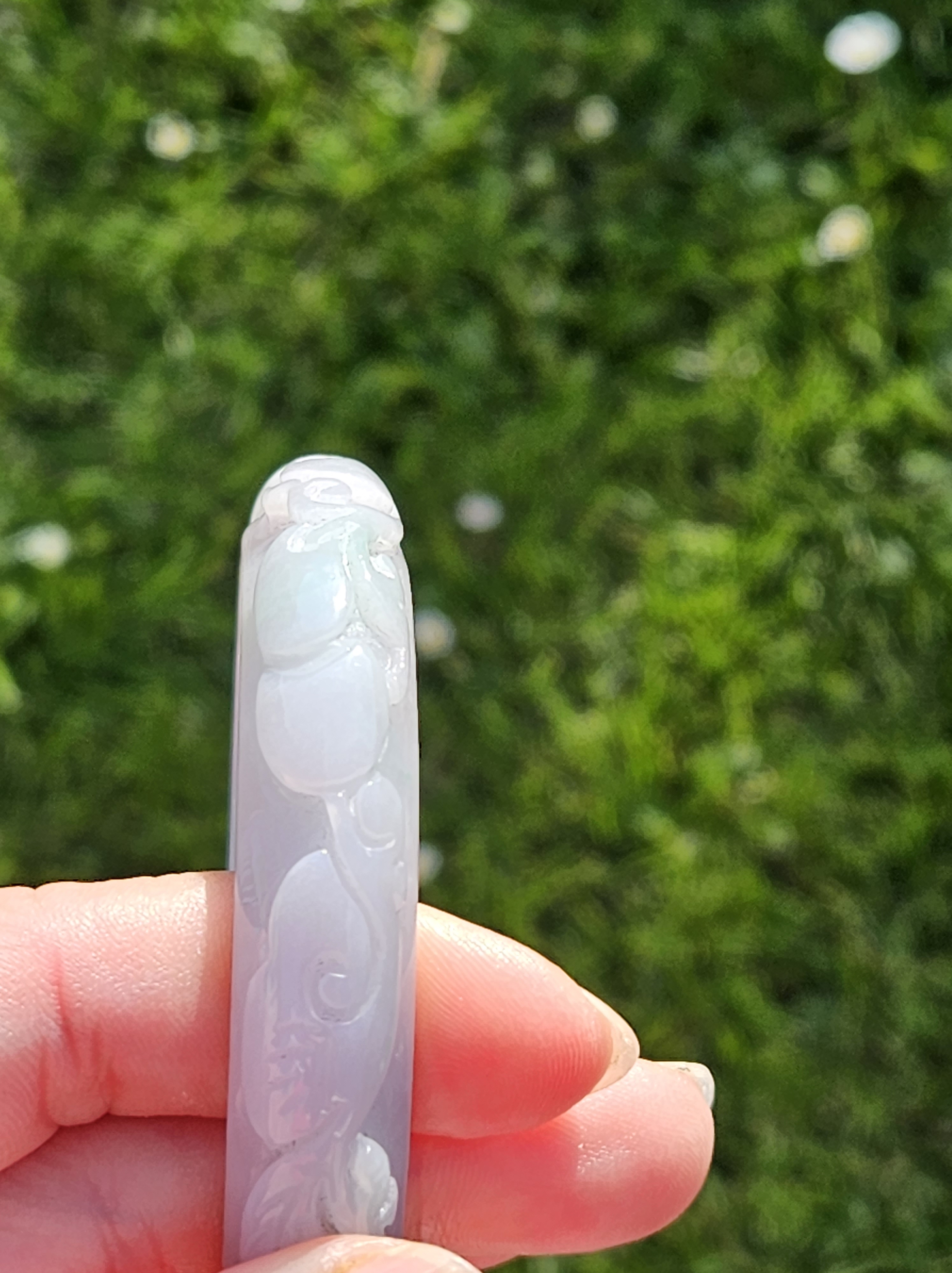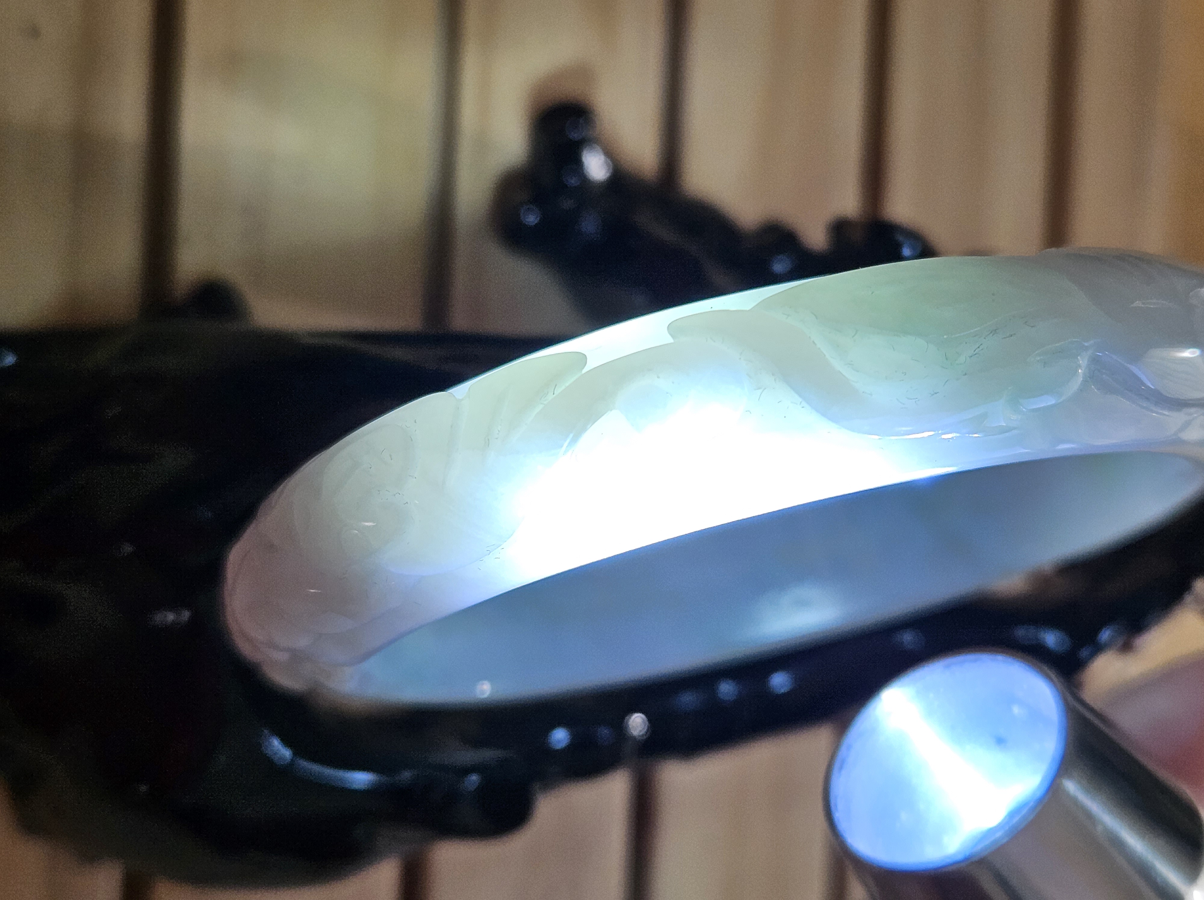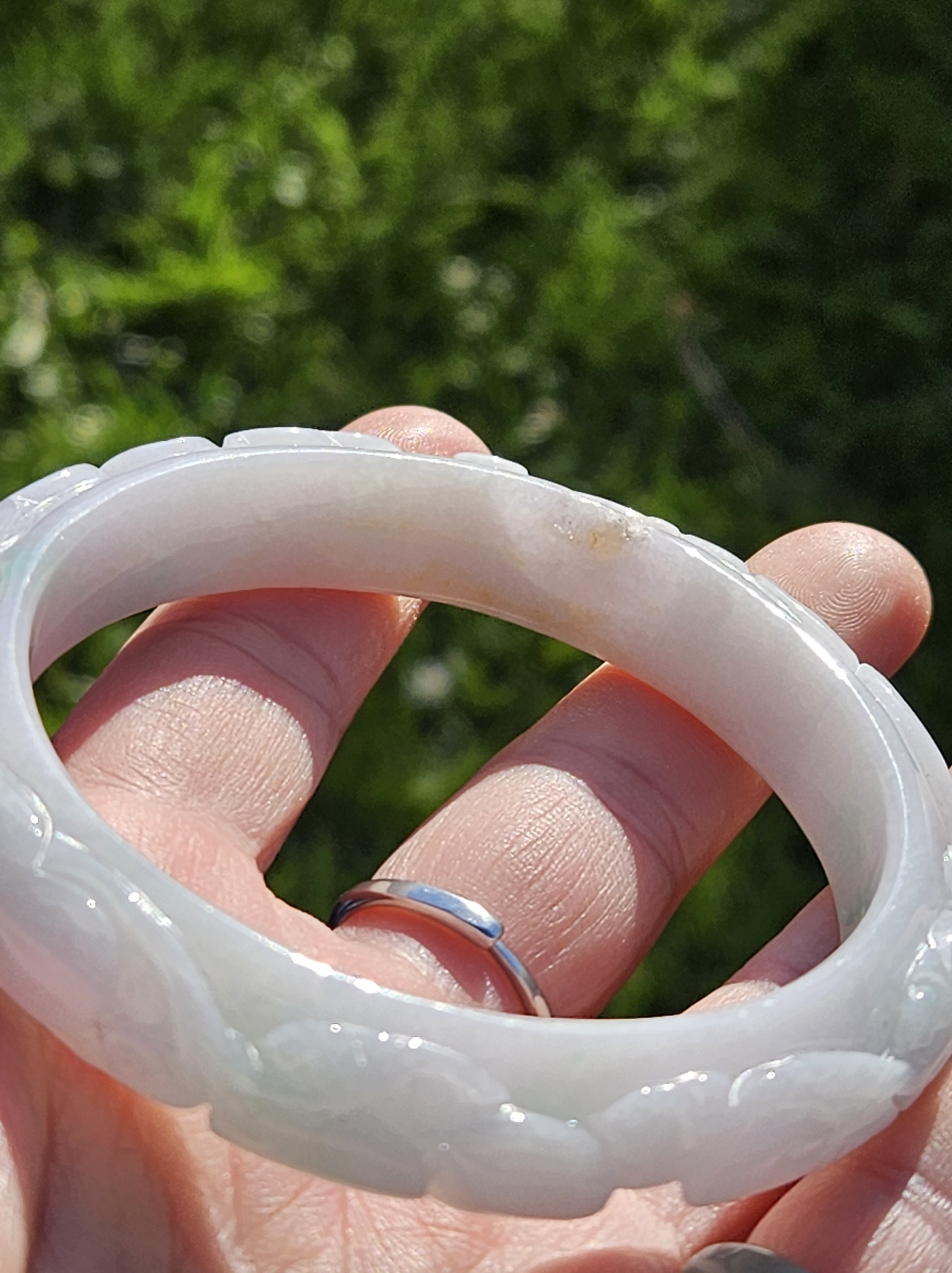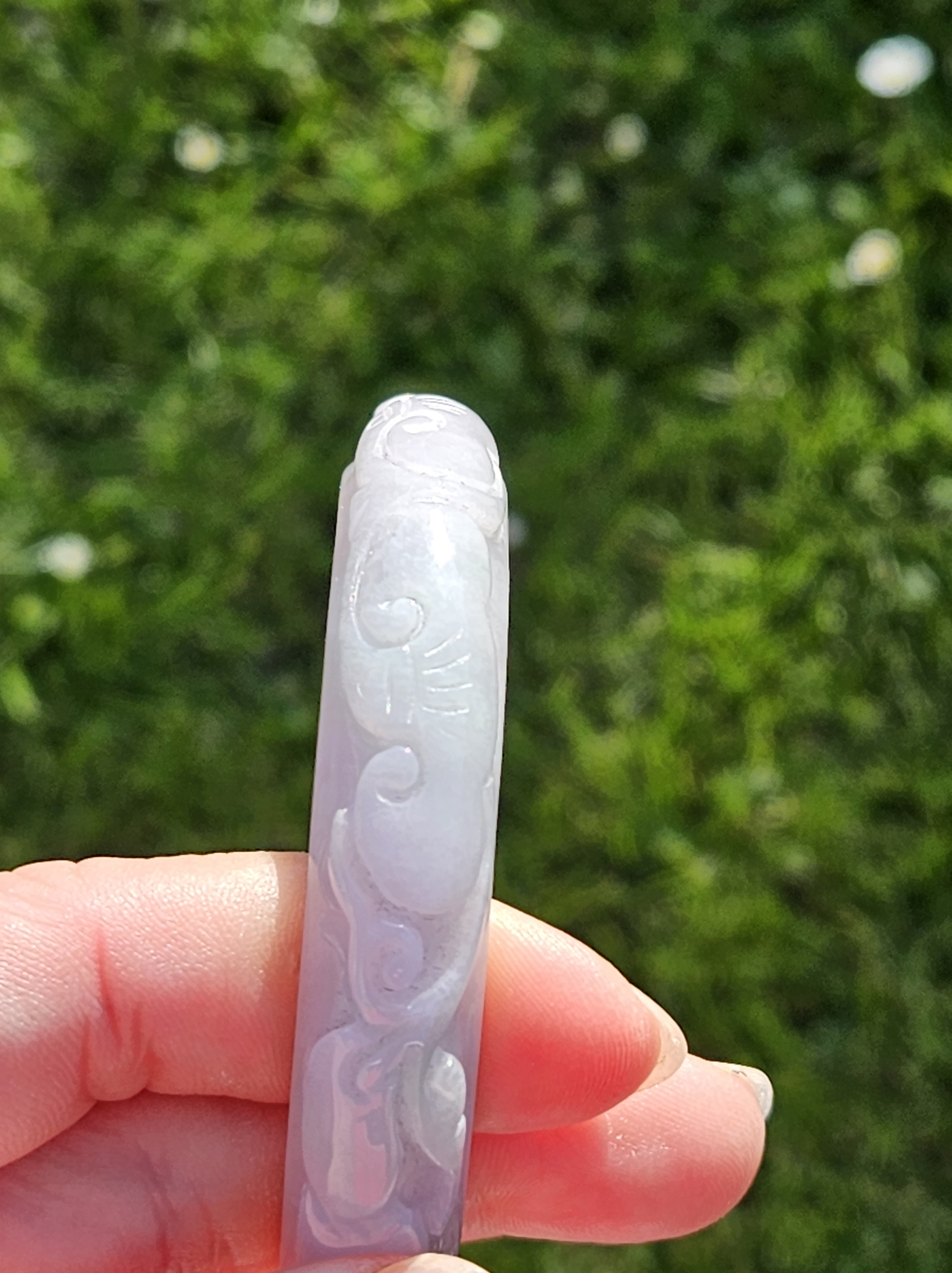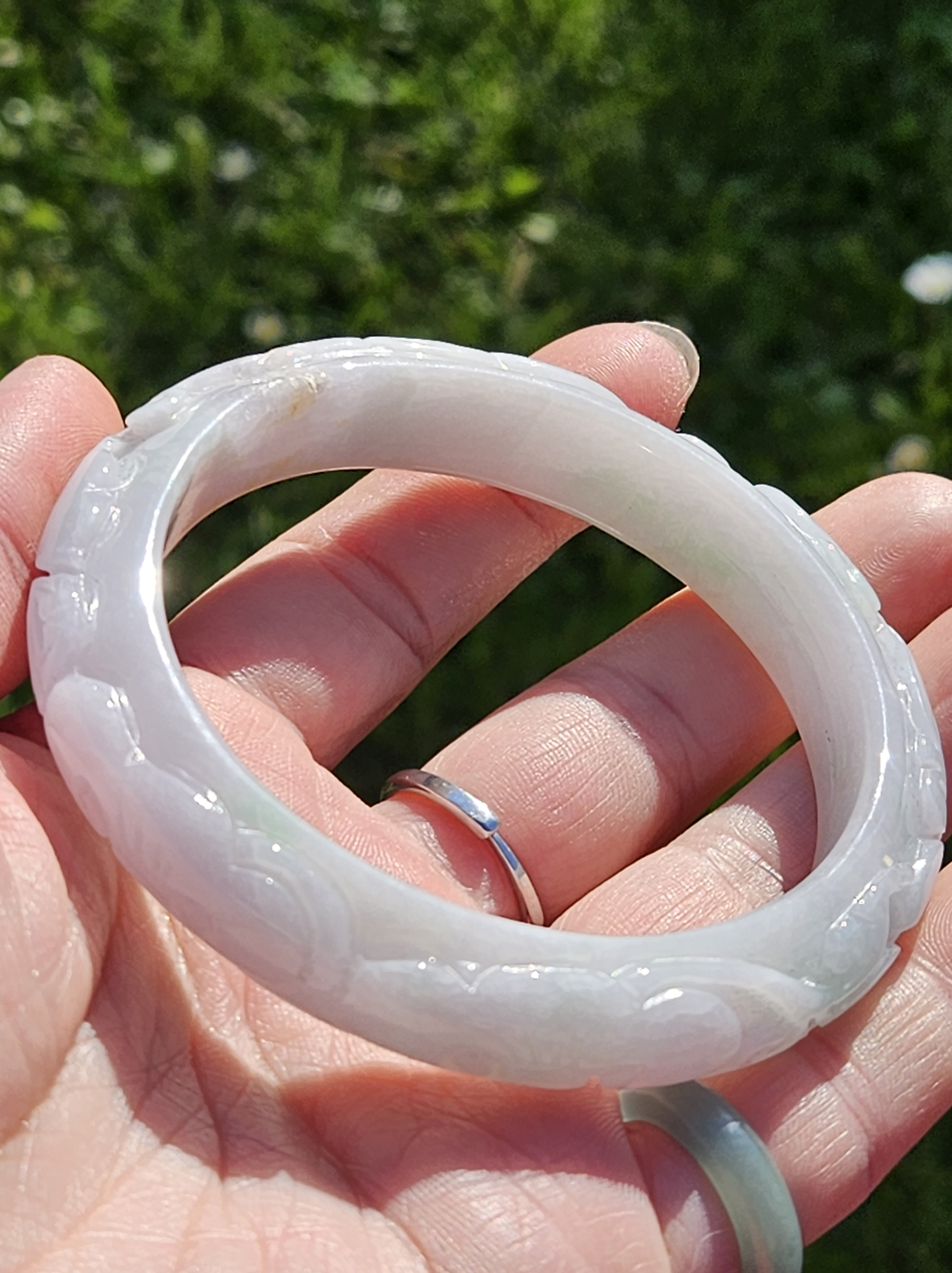 Carved Burmese jadeite bangle with ruyi and lotus as well as coins that signify wealth, may everything goes smoothly, resilience and good luck measures 58.5 x 12.3 x 8.8mm, weighs 66.64g. It has bits of apple green and on the part where there is a dot of red, there is a tiny patch of roughness as seen in photo which is part of the skin of the original stone. Comes with a certificate of authenticity. £120