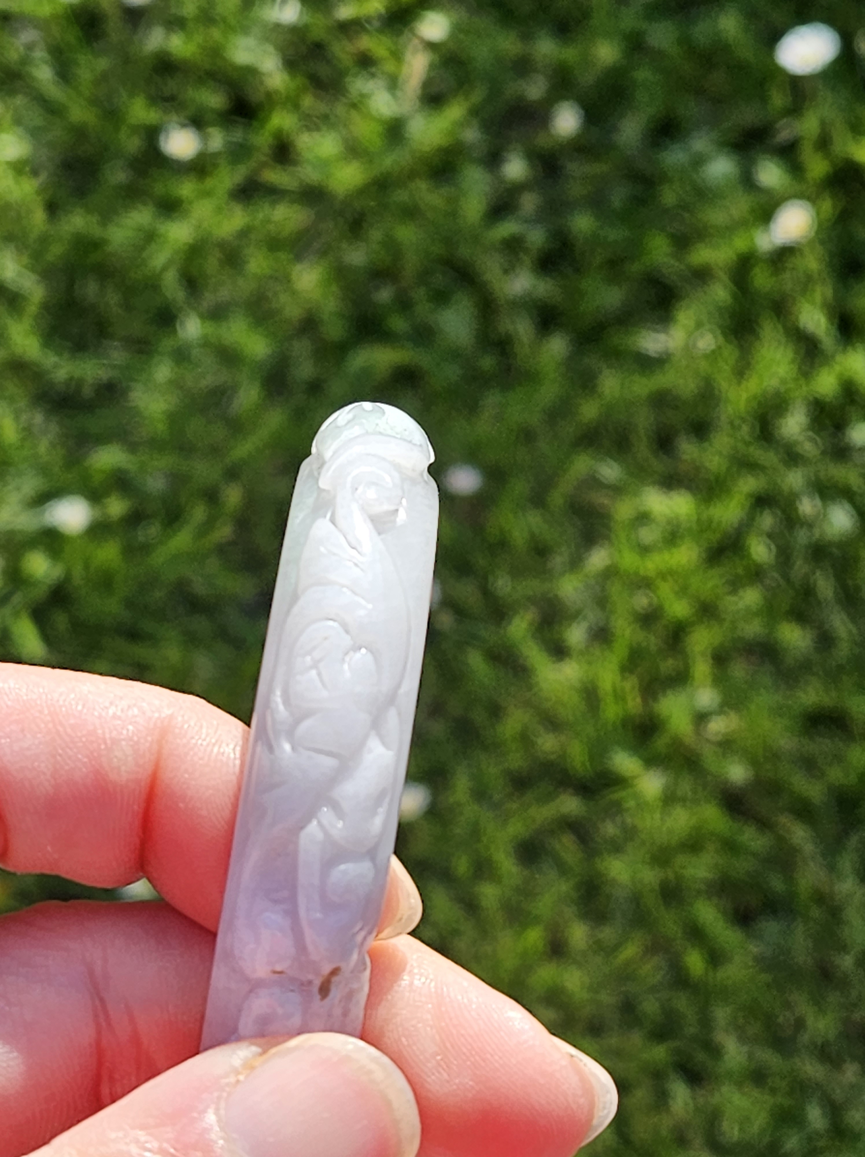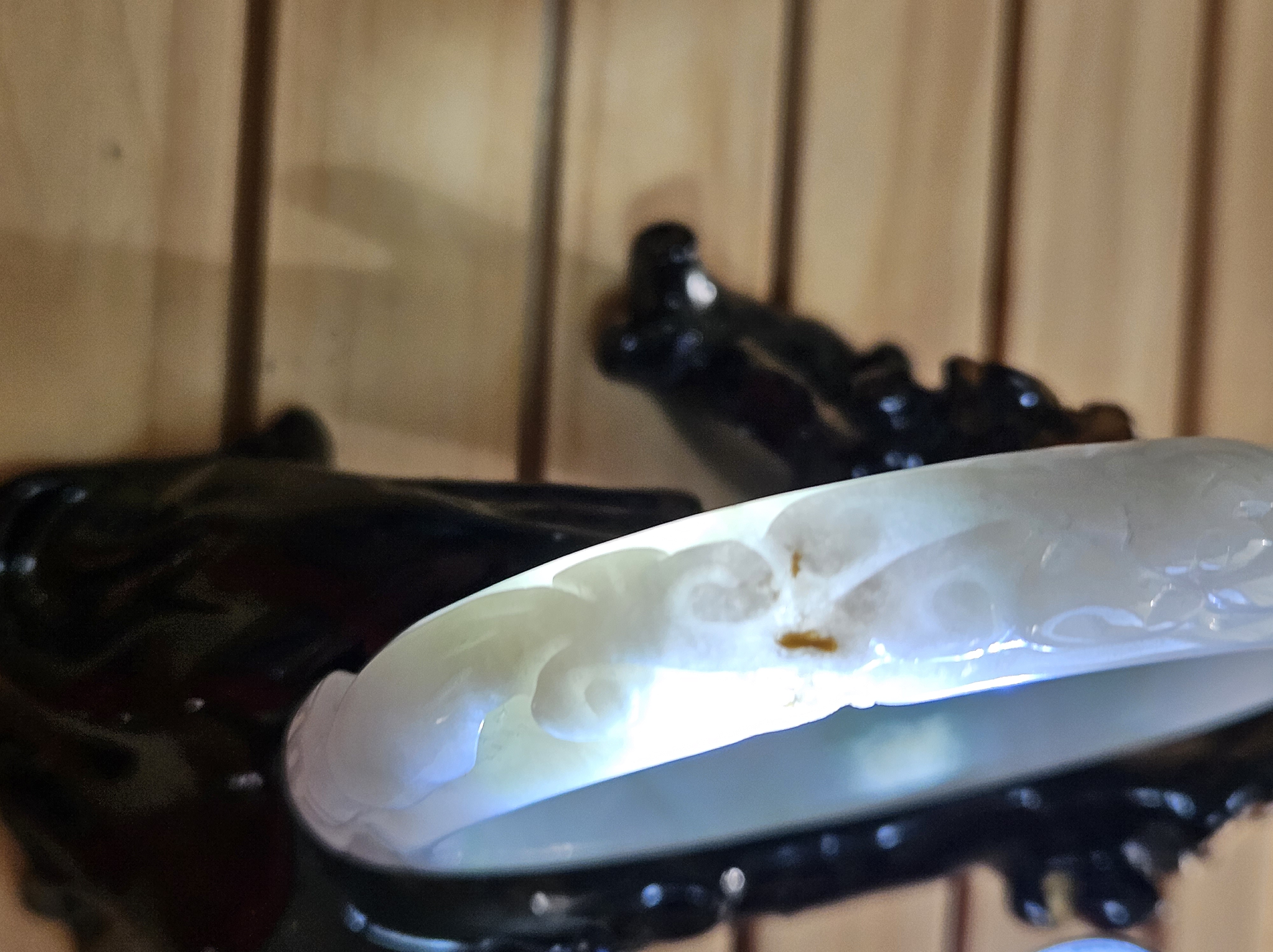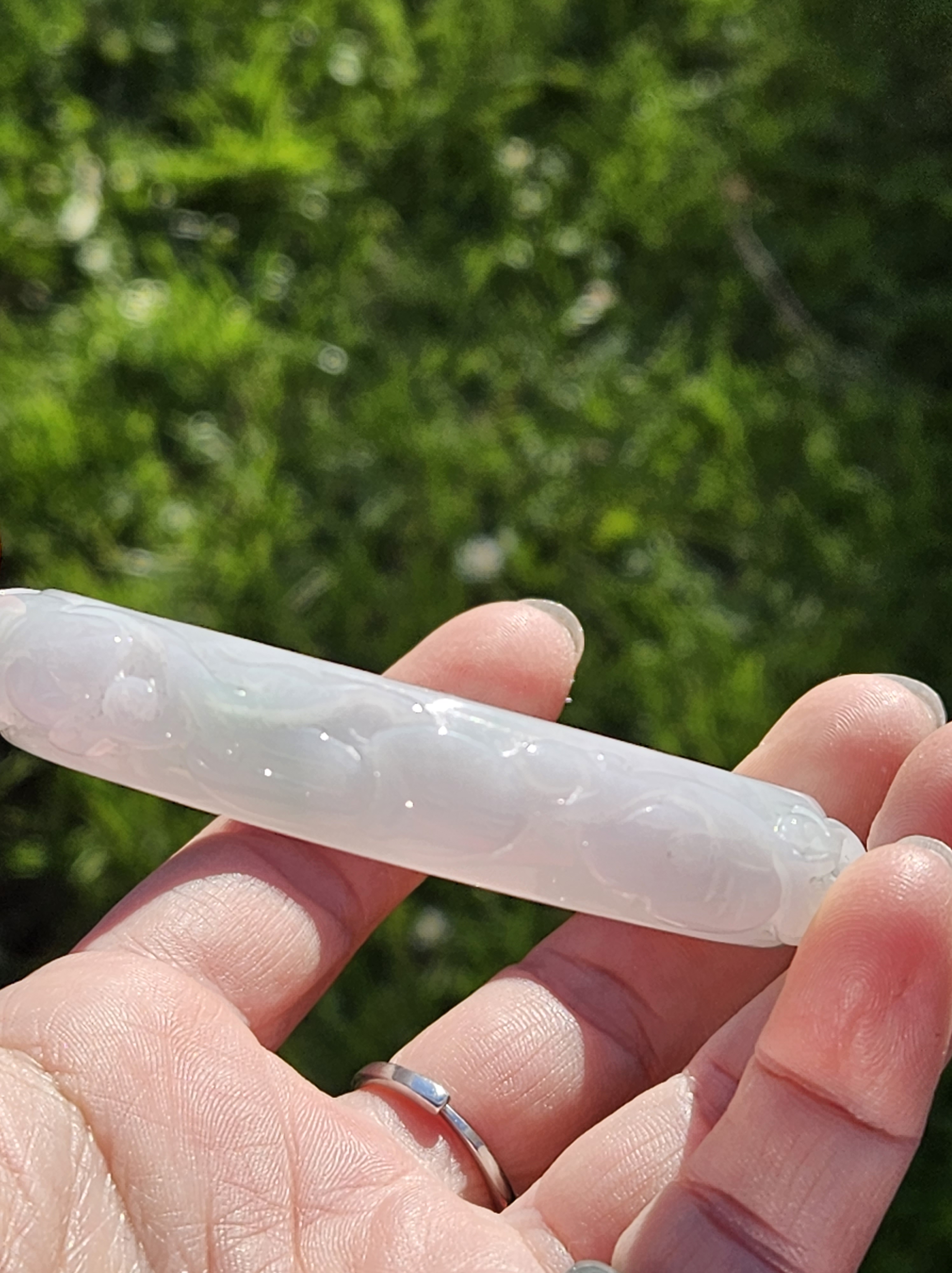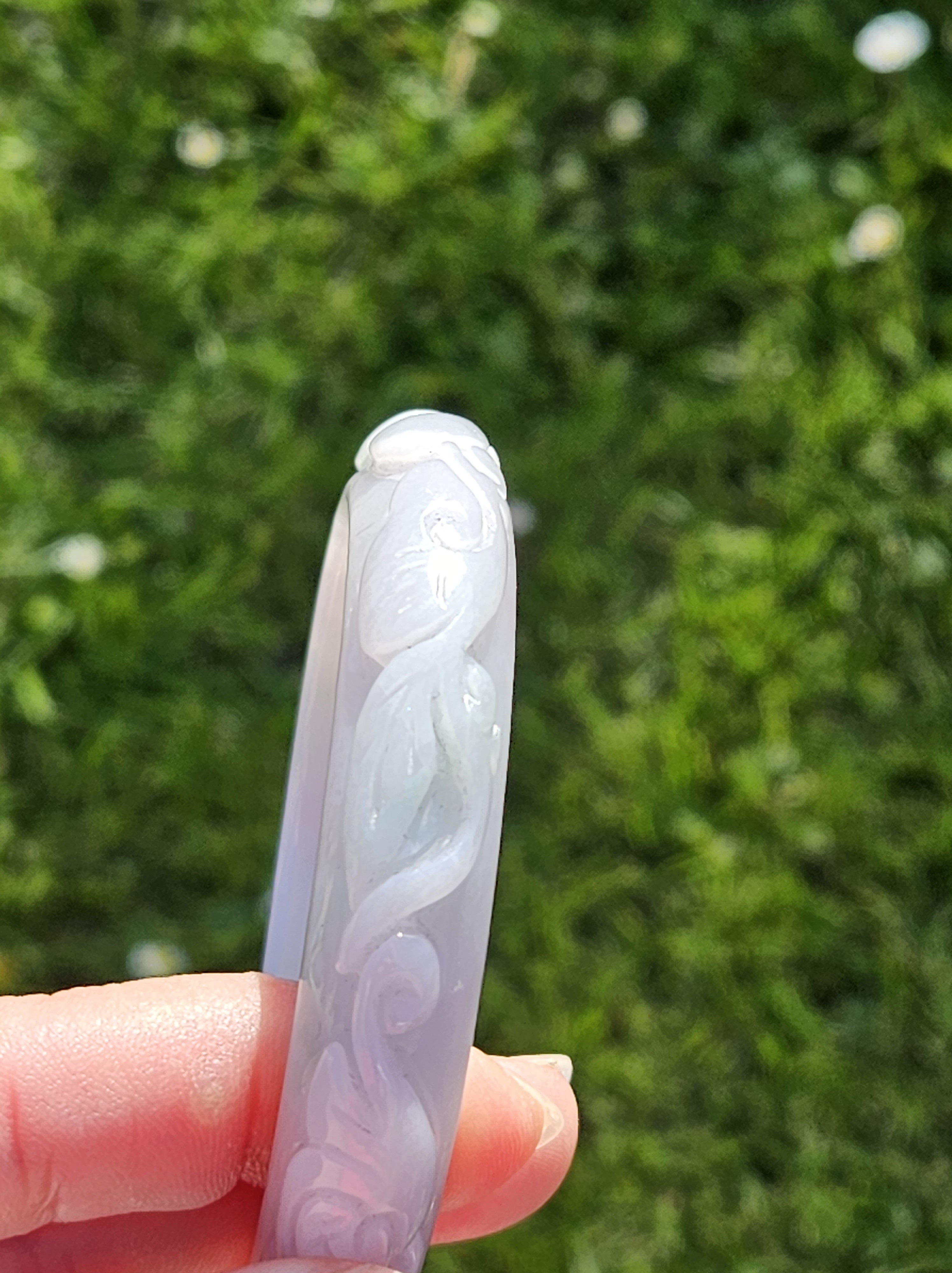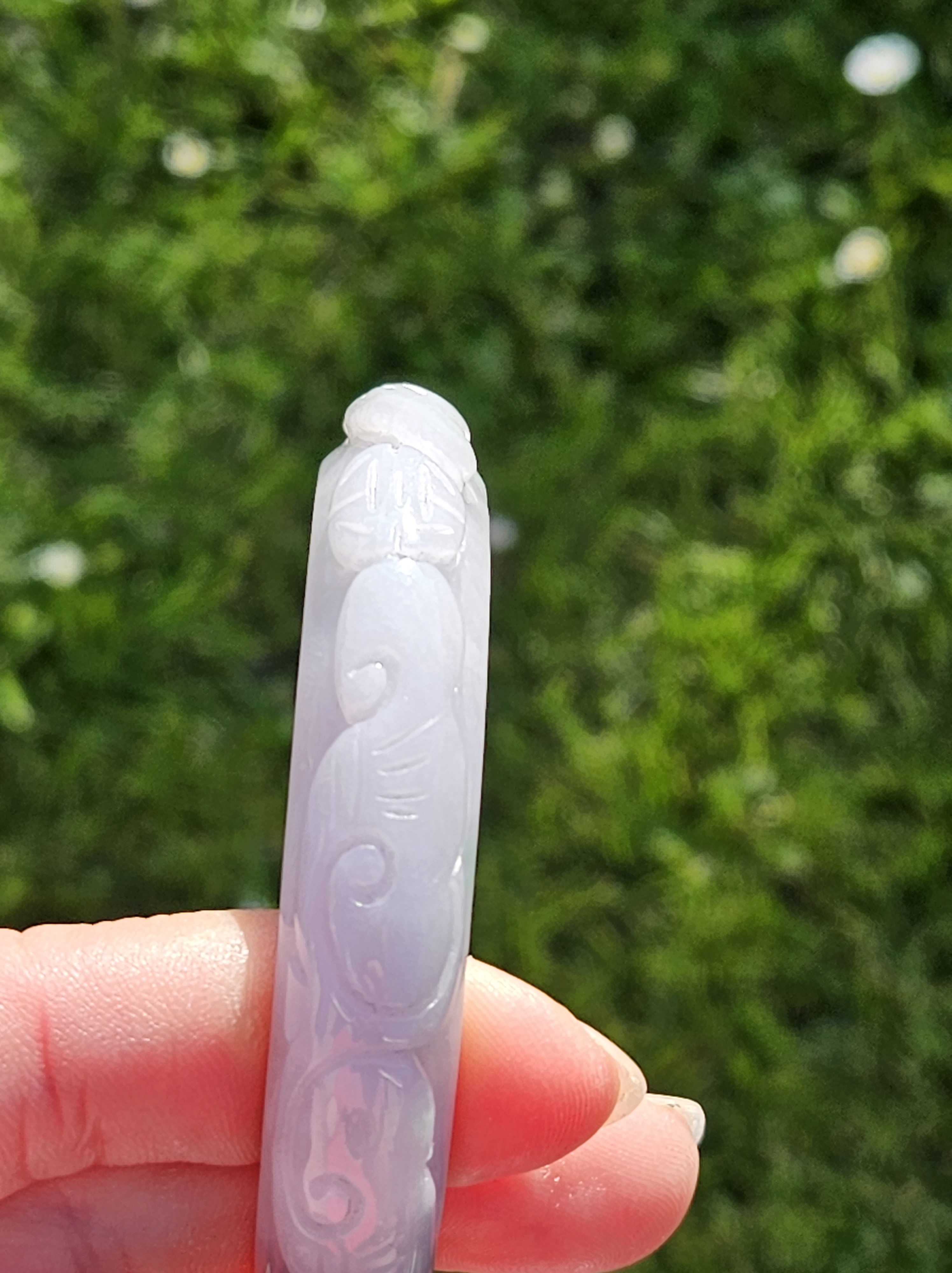 Carved Burmese jadeite bangle with ruyi and lotus as well as coins that signify wealth, may everything goes smoothly, resilience and good luck measures 58.5 x 12.3 x 8.8mm, weighs 66.64g. It has bits of apple green and on the part where there is a dot of red, there is a tiny patch of roughness as seen in photo which is part of the skin of the original stone. Comes with a certificate of authenticity. £120