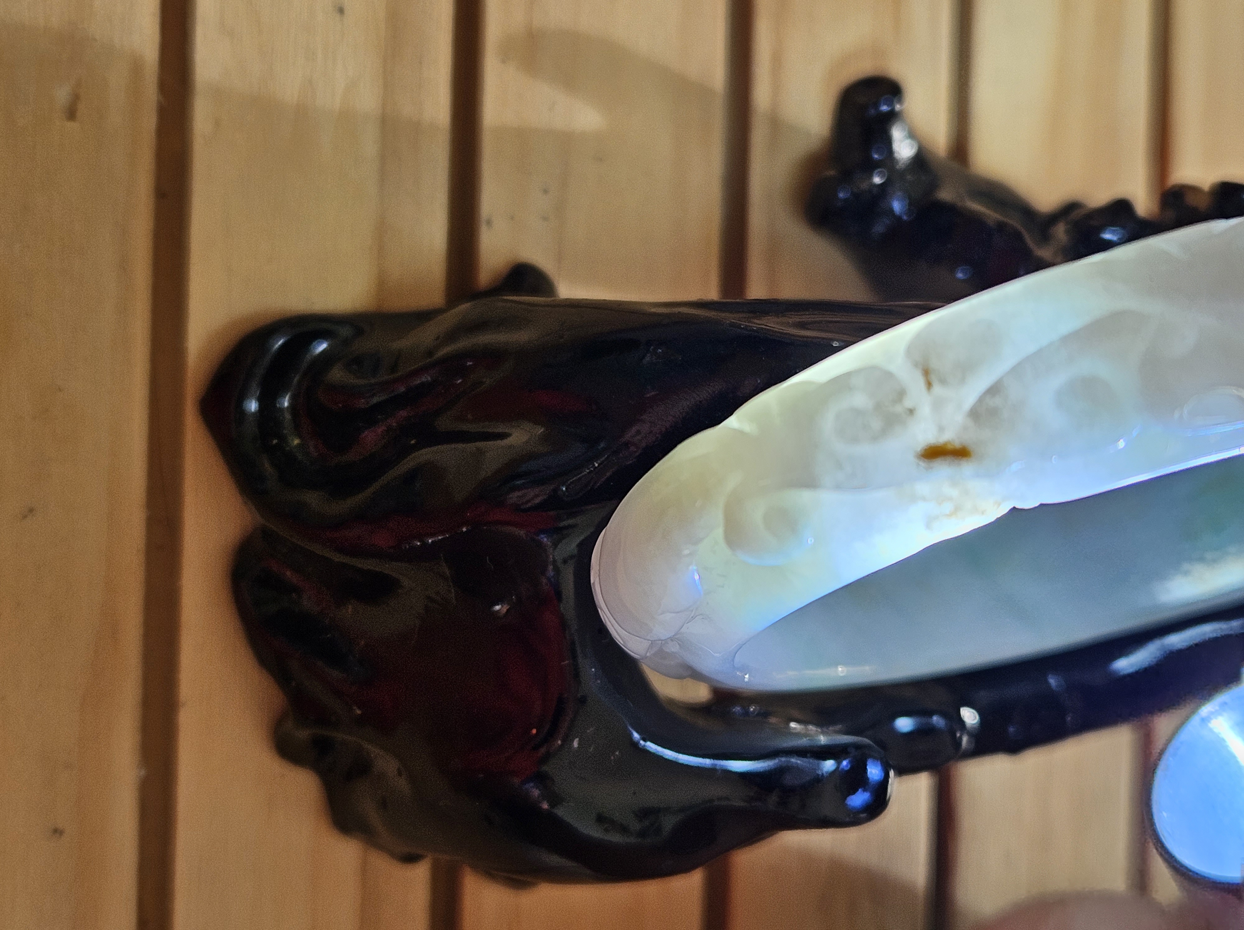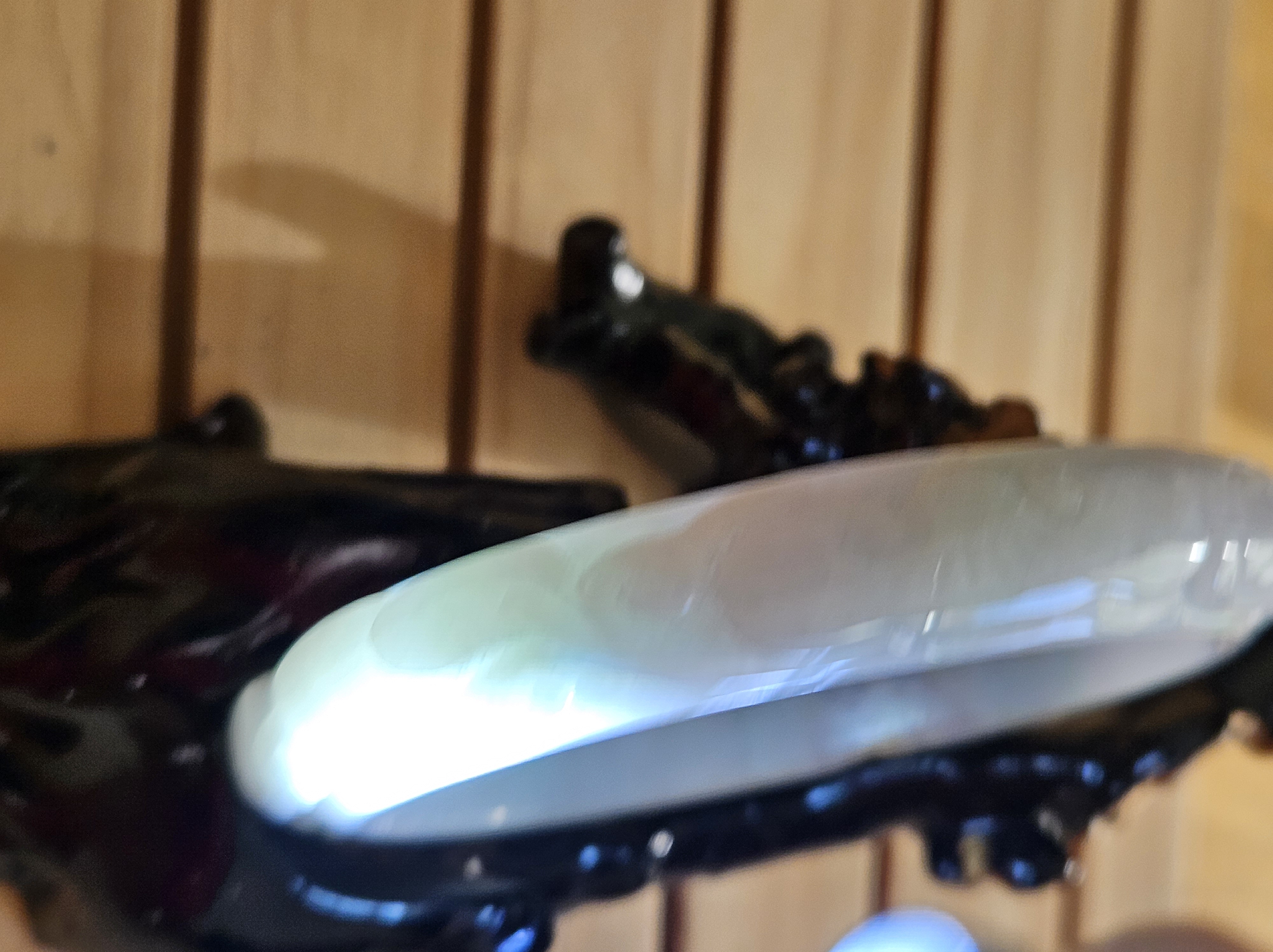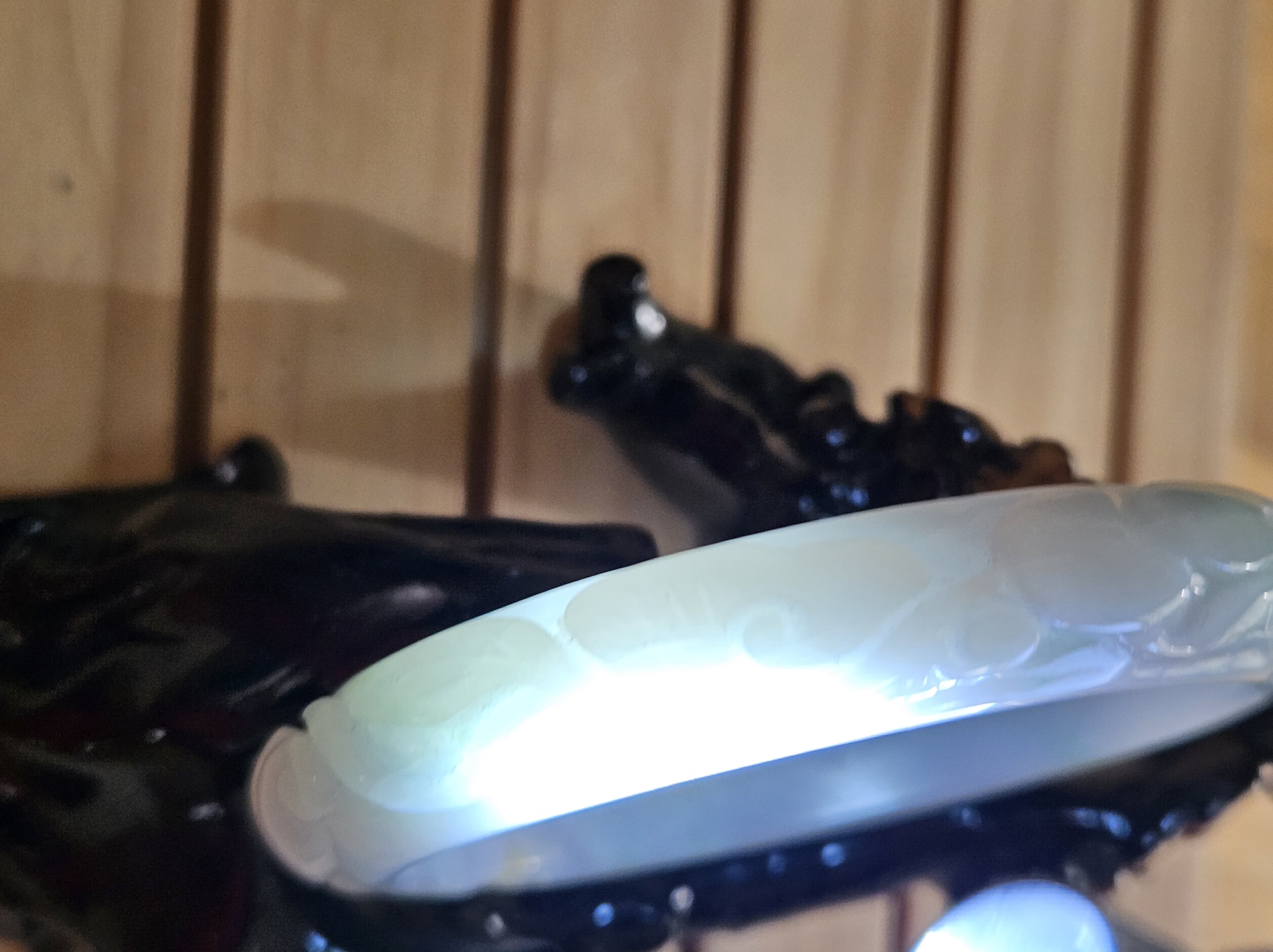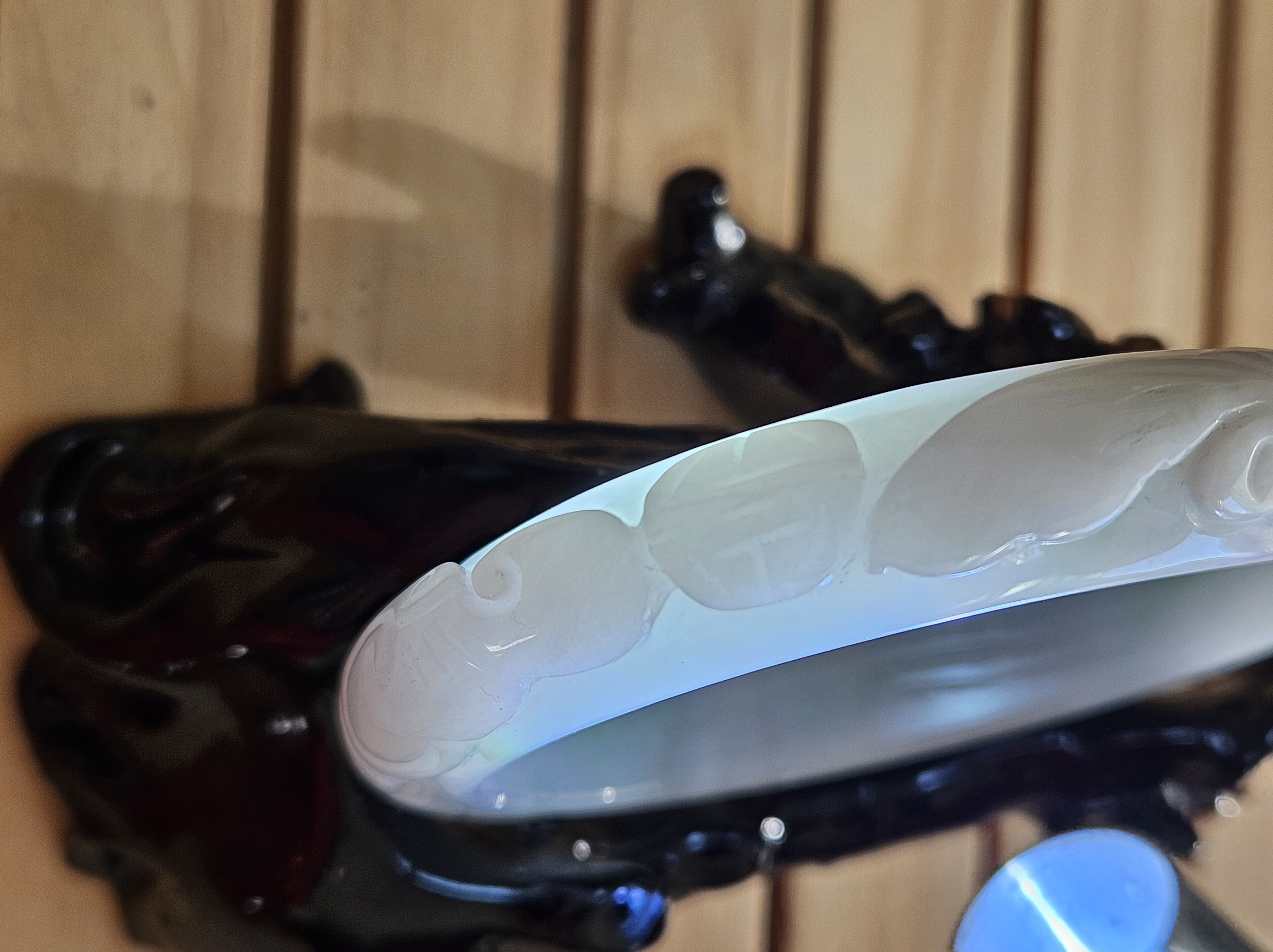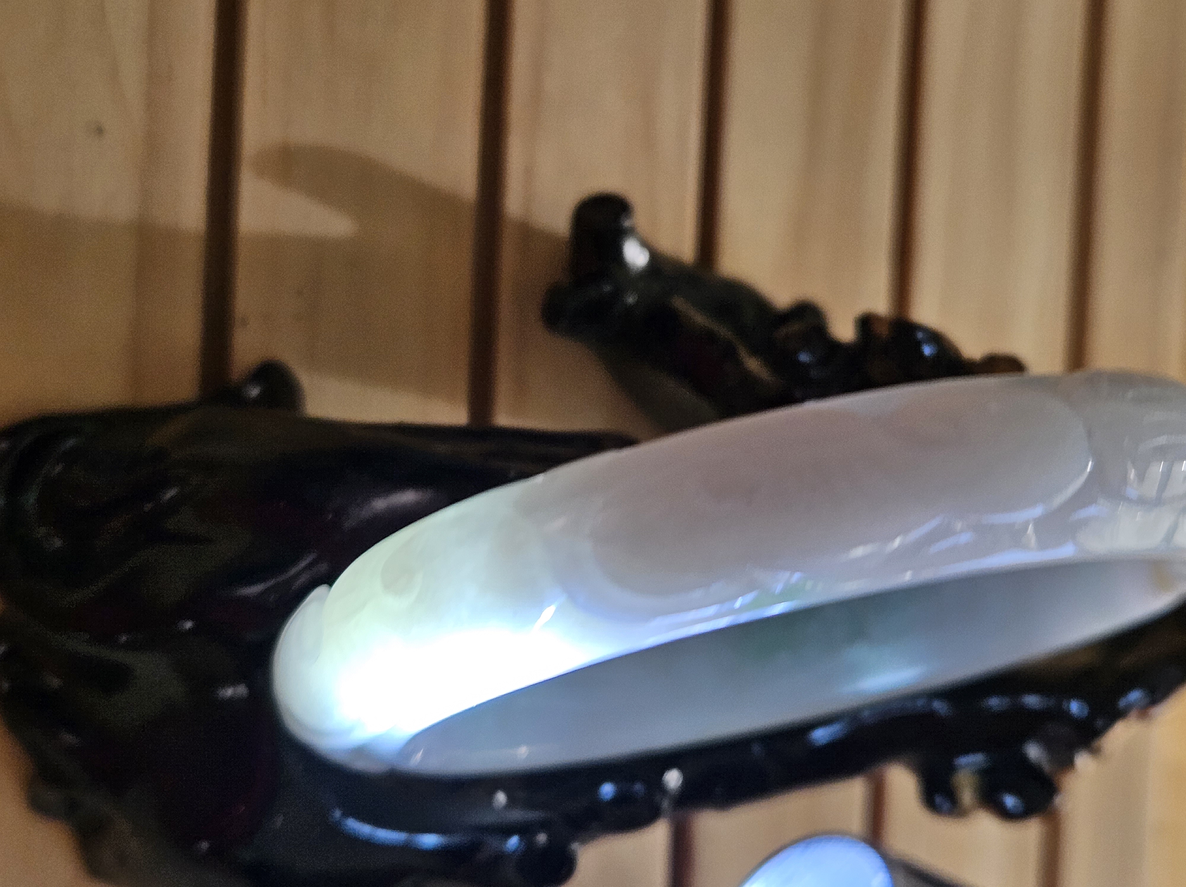 Carved Burmese jadeite bangle with ruyi and lotus as well as coins that signify wealth, may everything goes smoothly, resilience and good luck measures 58.5 x 12.3 x 8.8mm, weighs 66.64g. It has bits of apple green and on the part where there is a dot of red, there is a tiny patch of roughness as seen in photo which is part of the skin of the original stone. Comes with a certificate of authenticity. £120