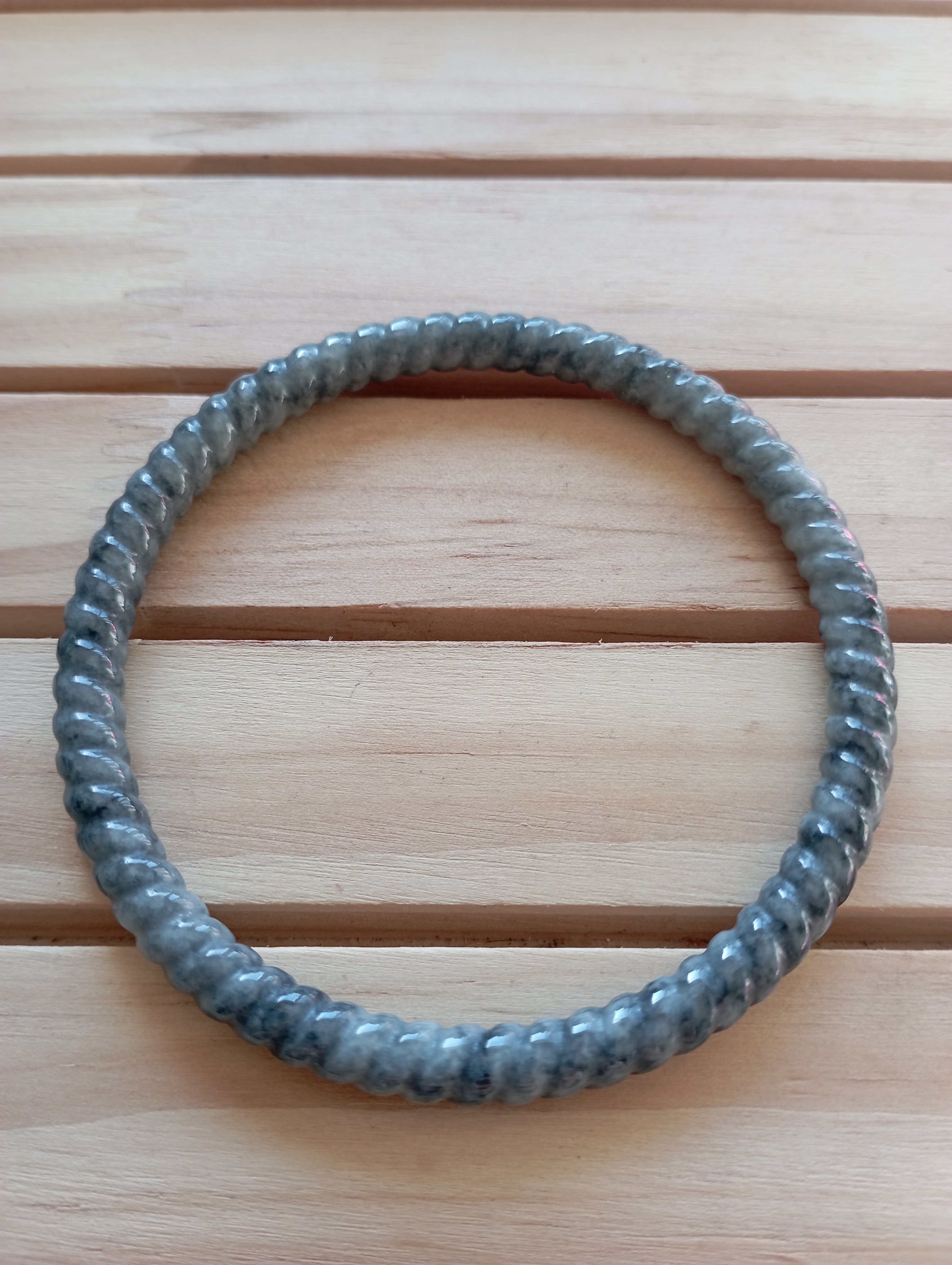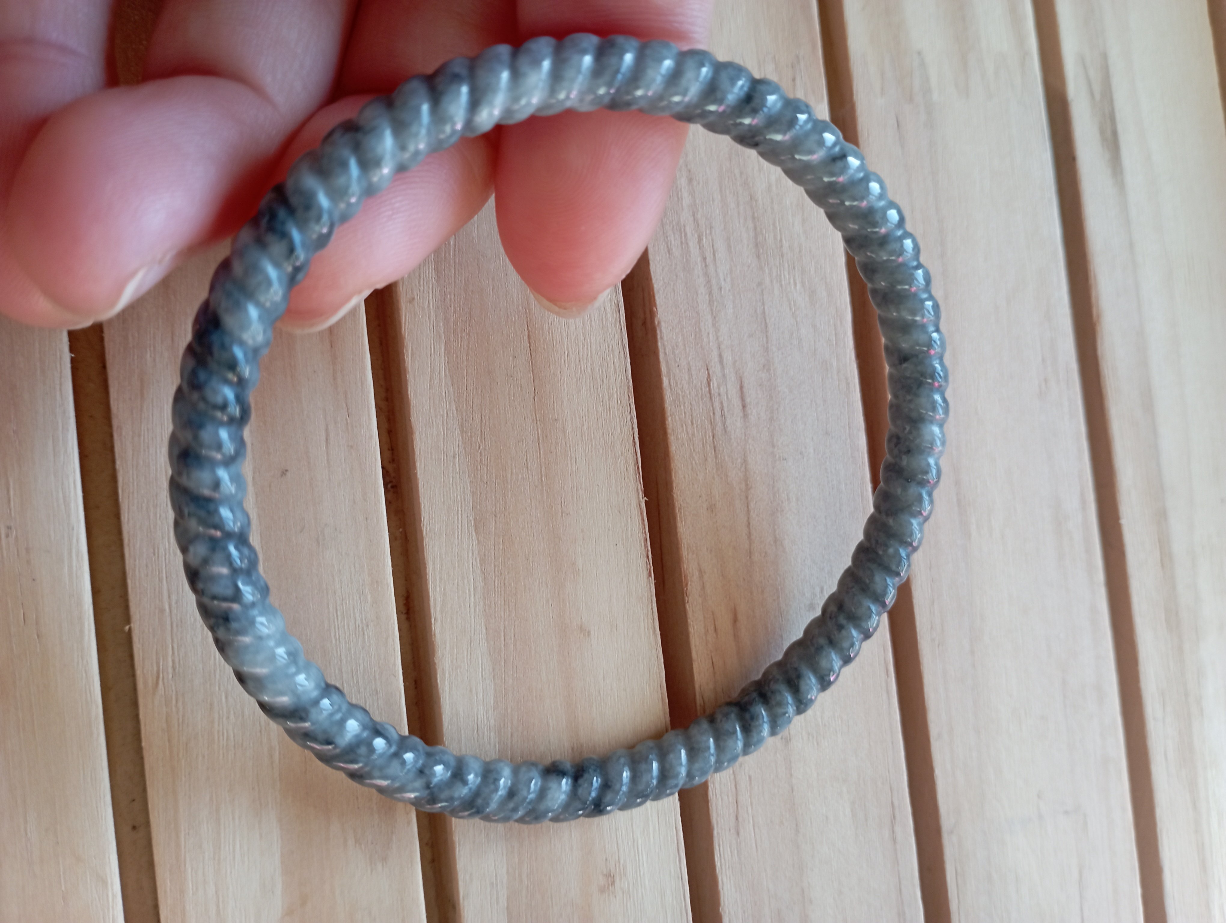 Engraved braid all over, measures 58.5 X 5.5 X 6.2mm fits up to 60mm. Smoky grey in colour, everyday wear and go well dressed up or down. Will make a nice dingdang with another of similar size, colour and design. £69