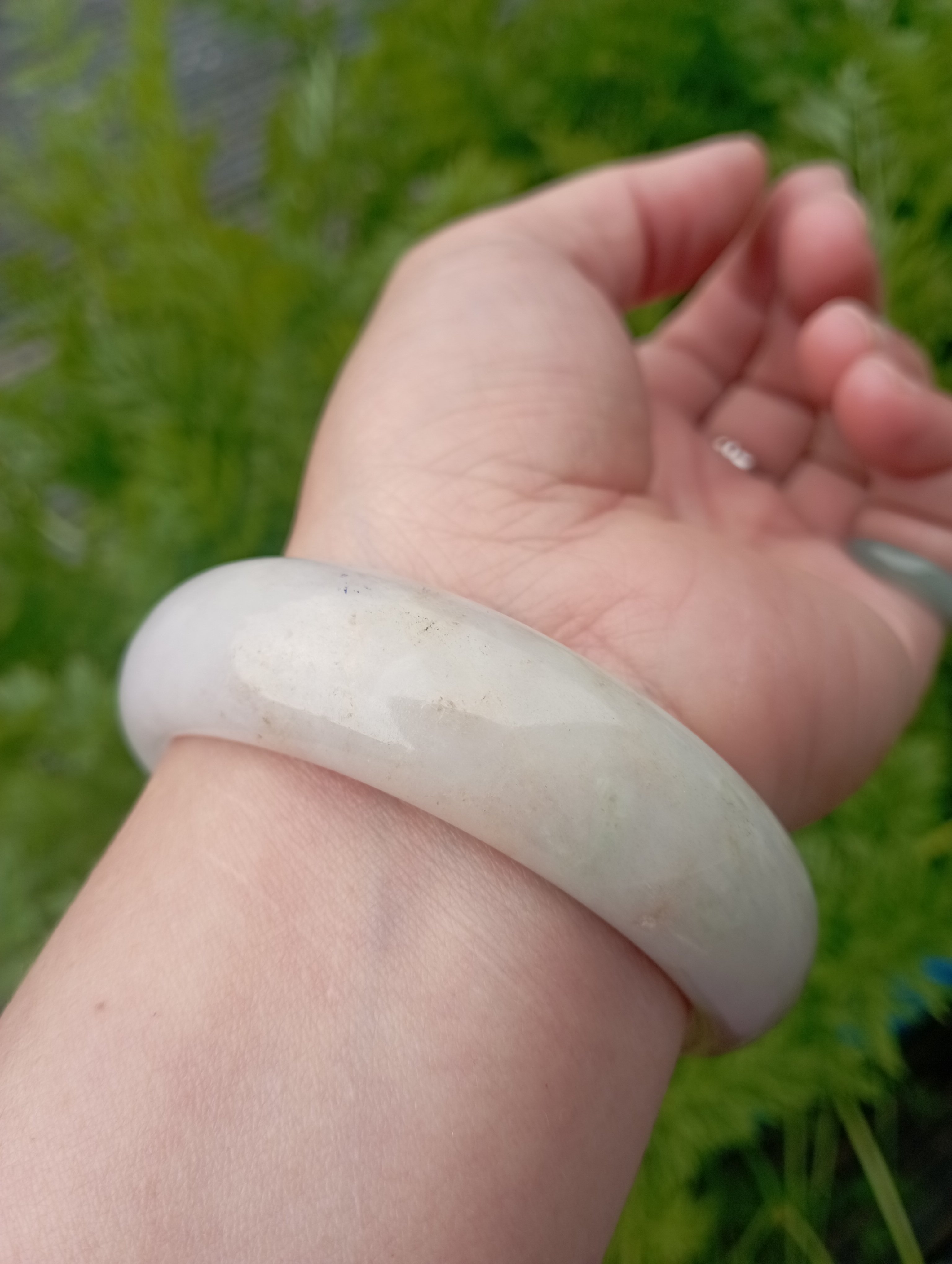 Very pretty light pinkish purple bangle with green blooms. Measures 57.4 X 17.2 X 8.9mm, weighs 83.63g.