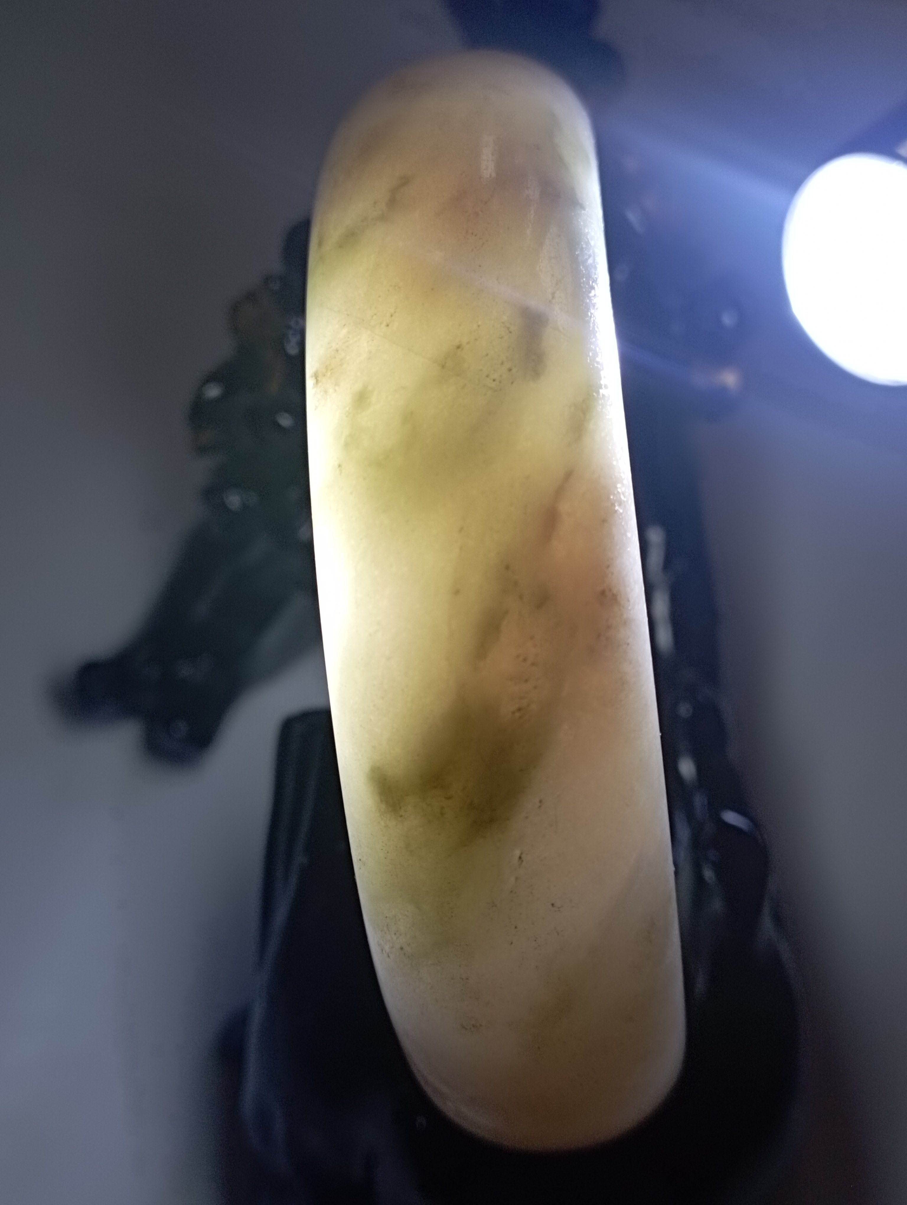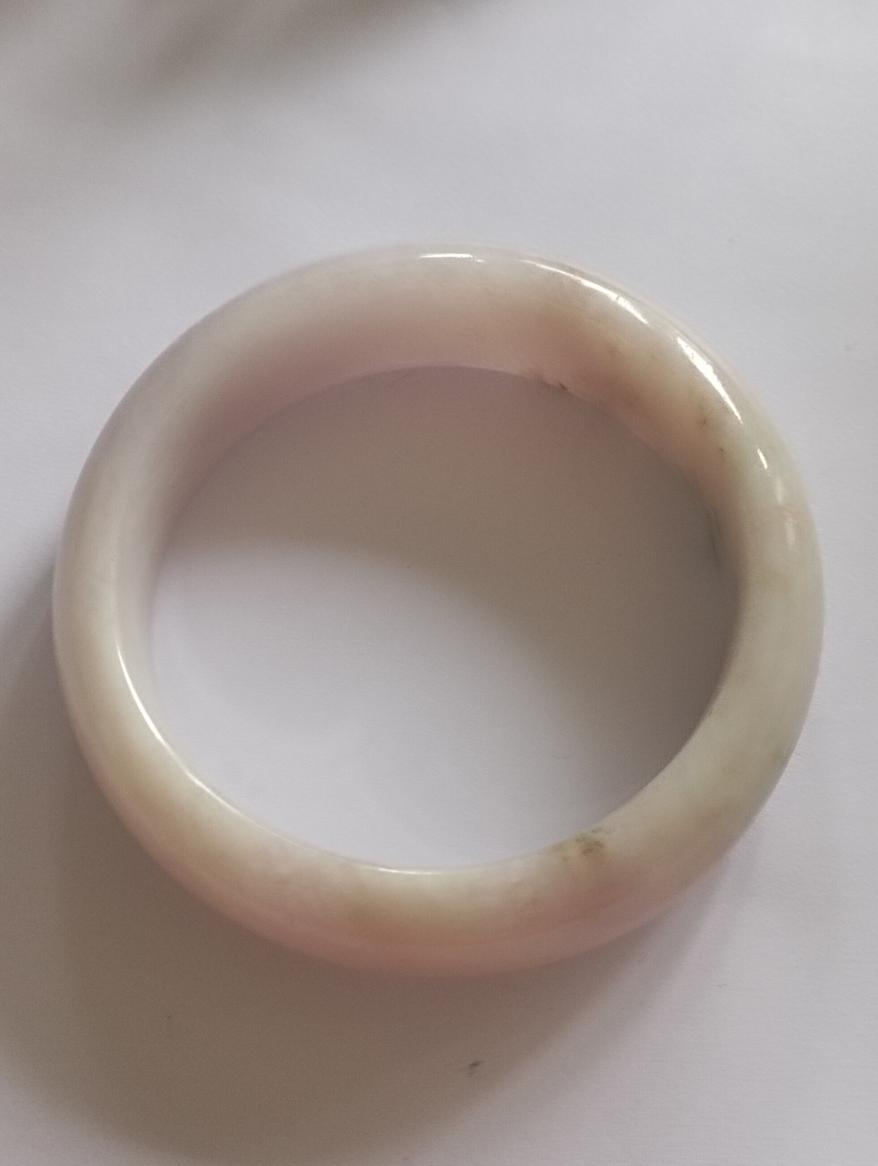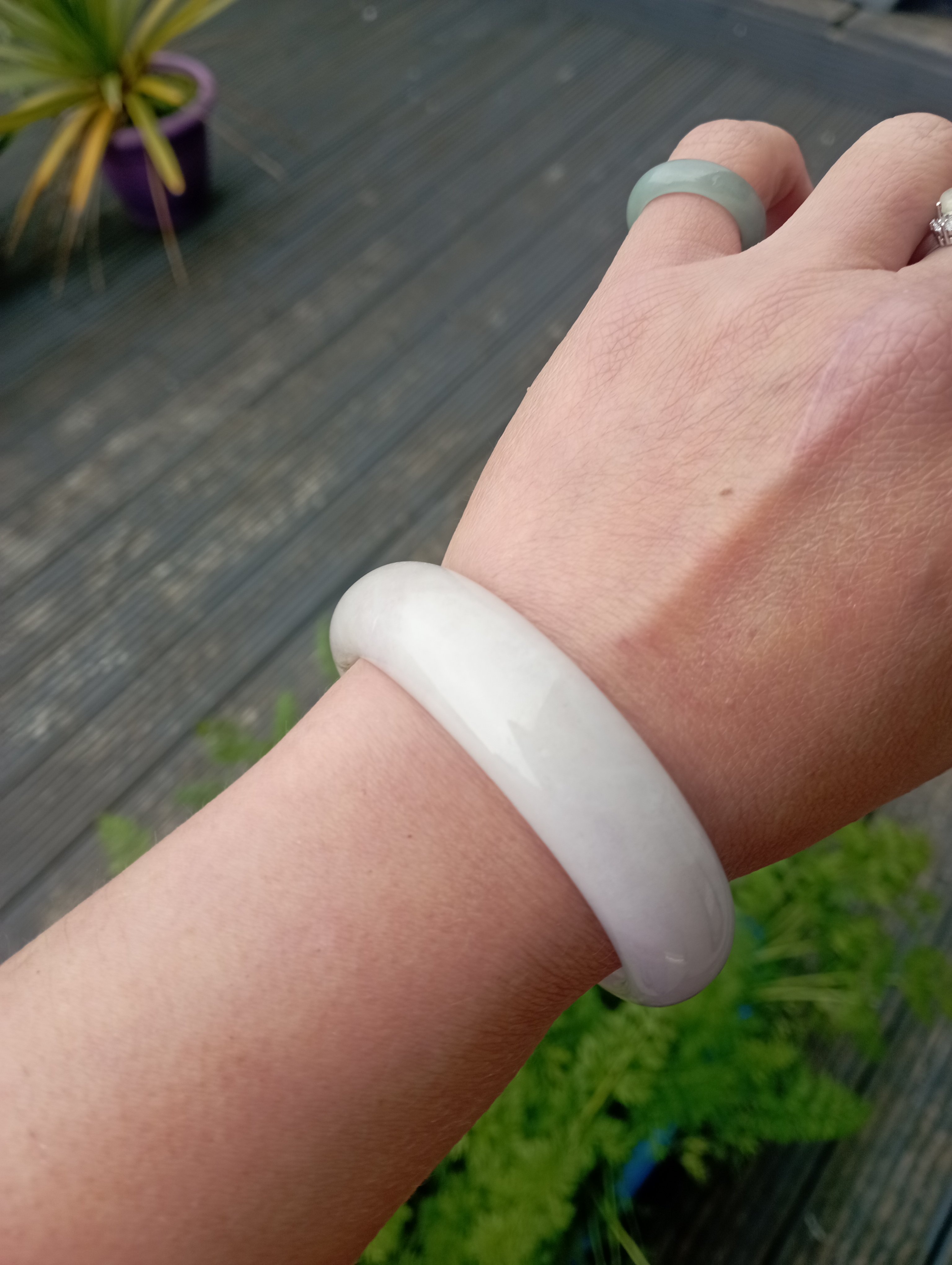 The colours are gorgeous as you can see in the picture. There are internal lines/cracks/formations that do not affect usage which also makes part of the charm of a natural jadeite bangle. ££198