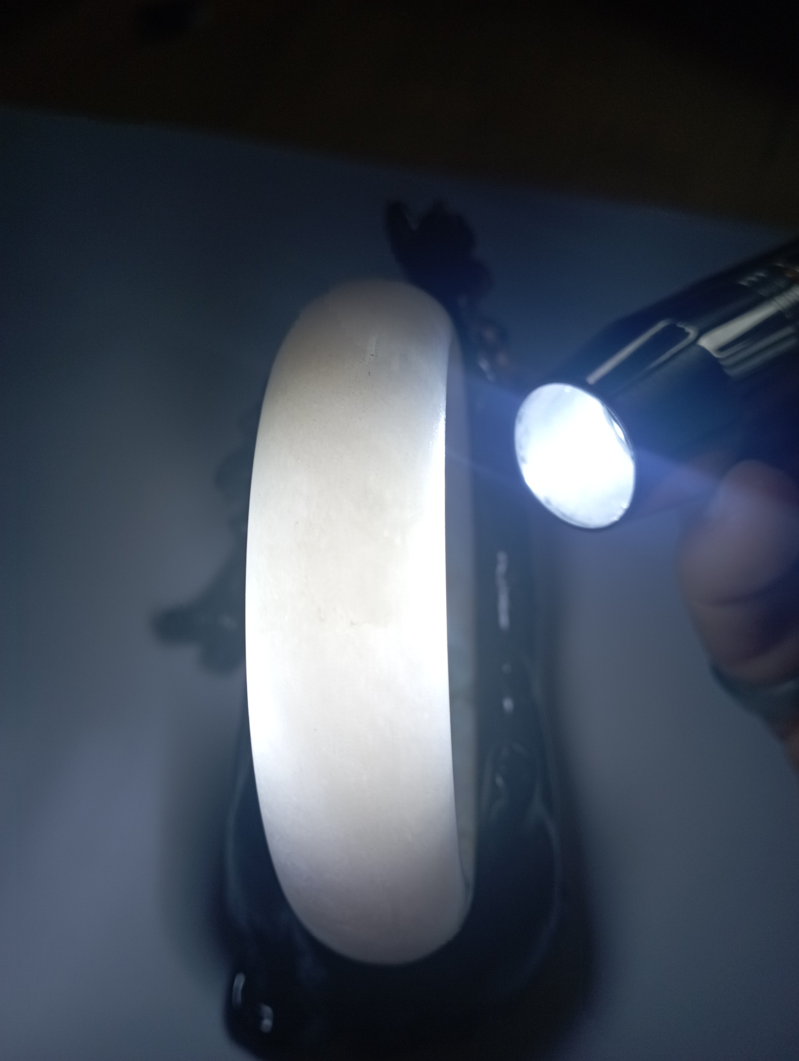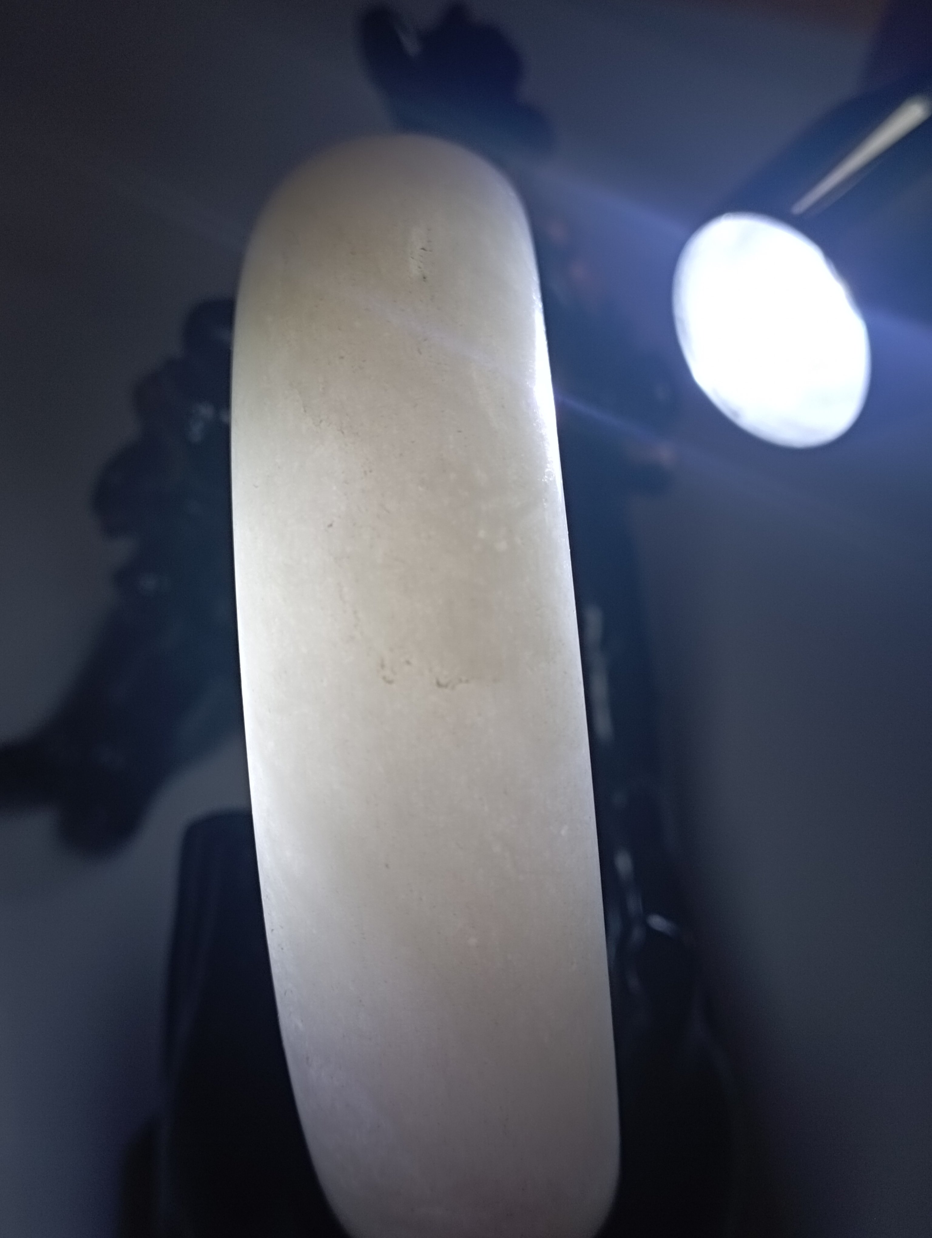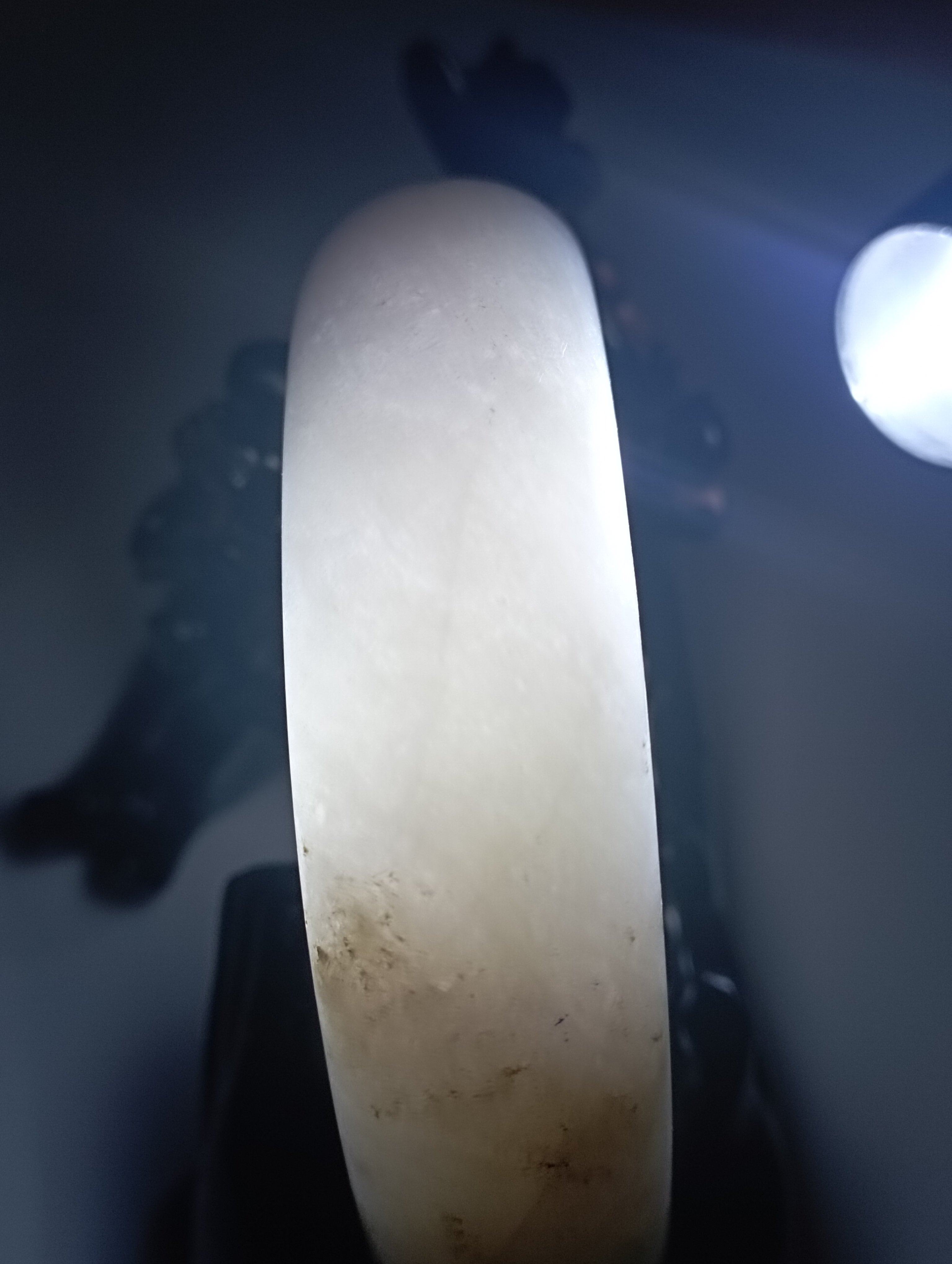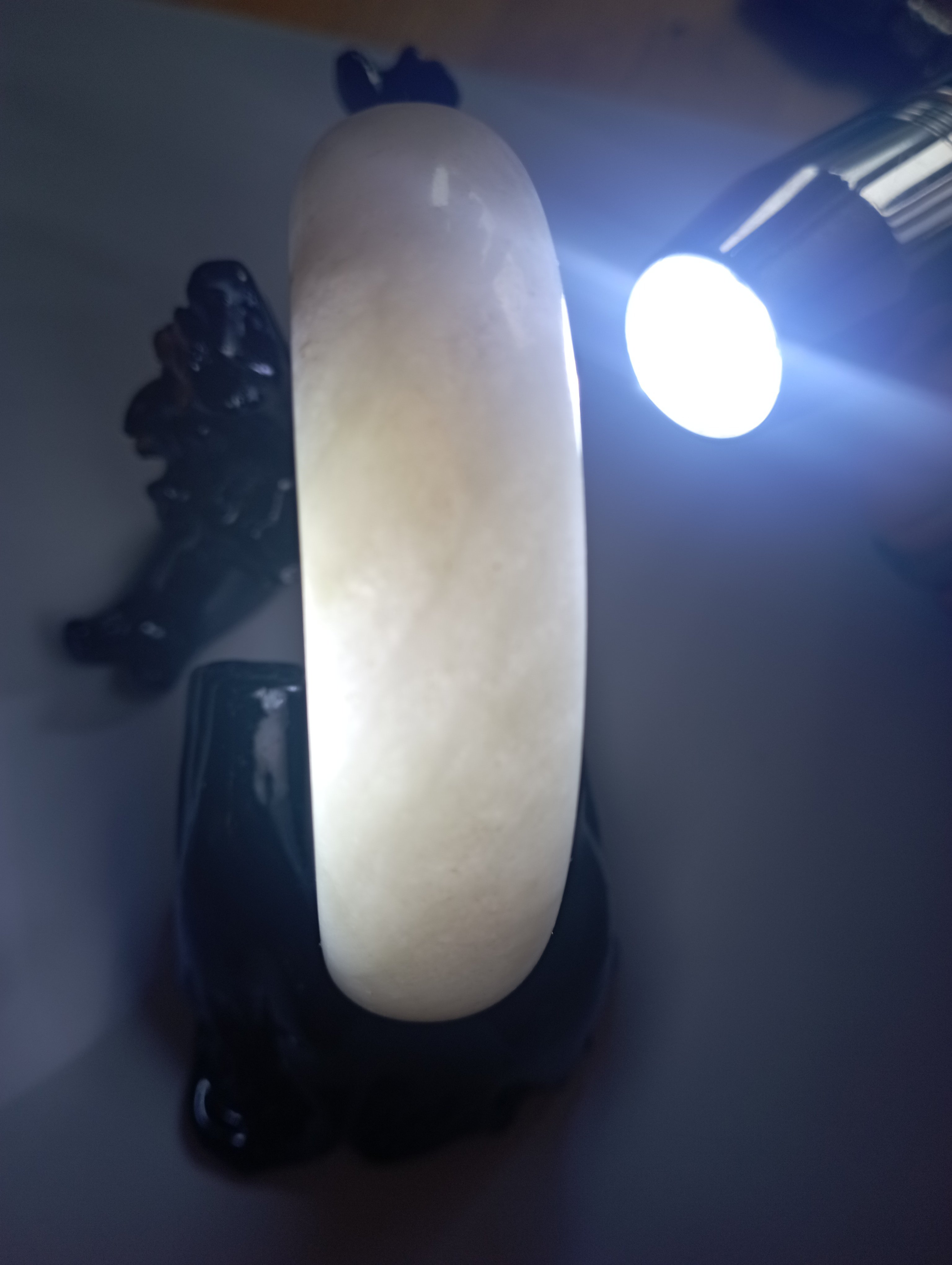 The colours are gorgeous as you can see in the picture. There are internal lines/cracks/formations that do not affect usage which also makes part of the charm of a natural jadeite bangle. ££198