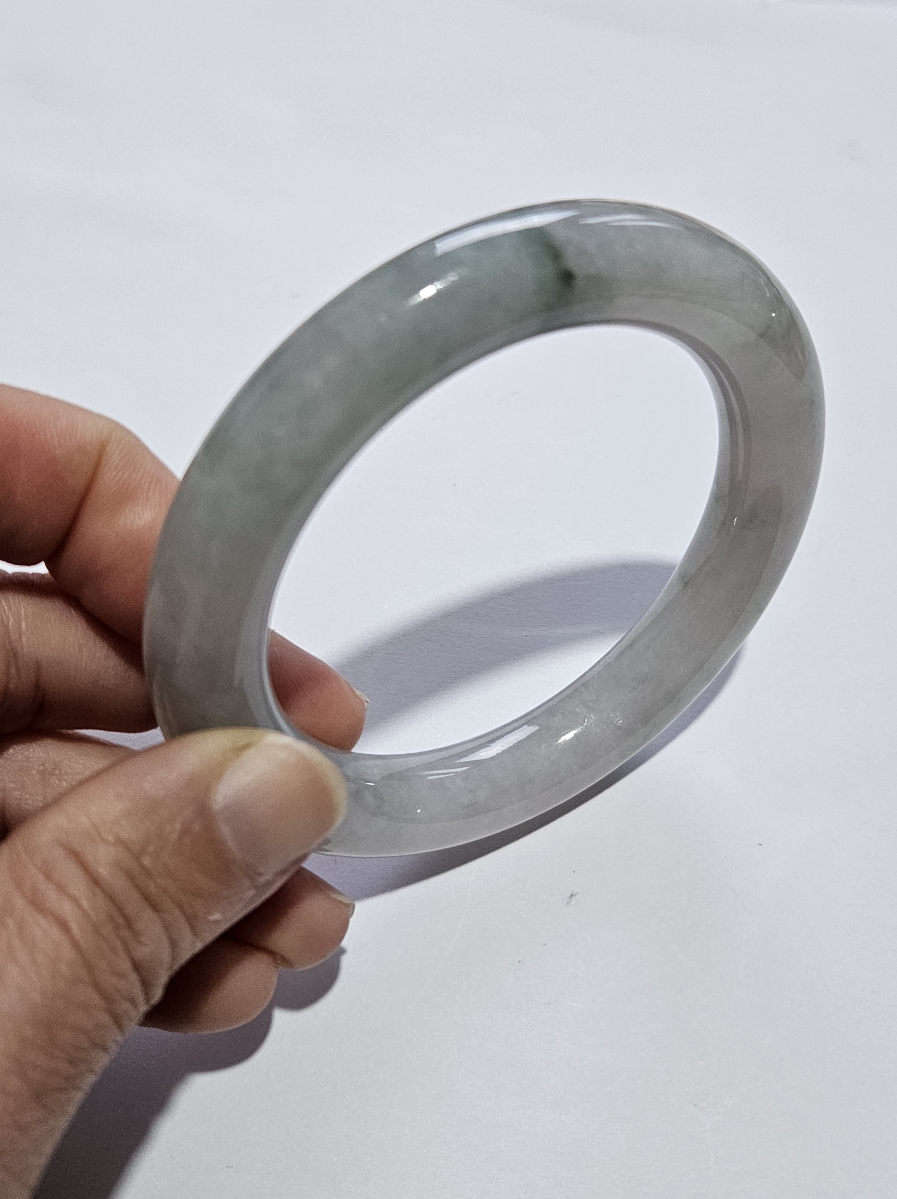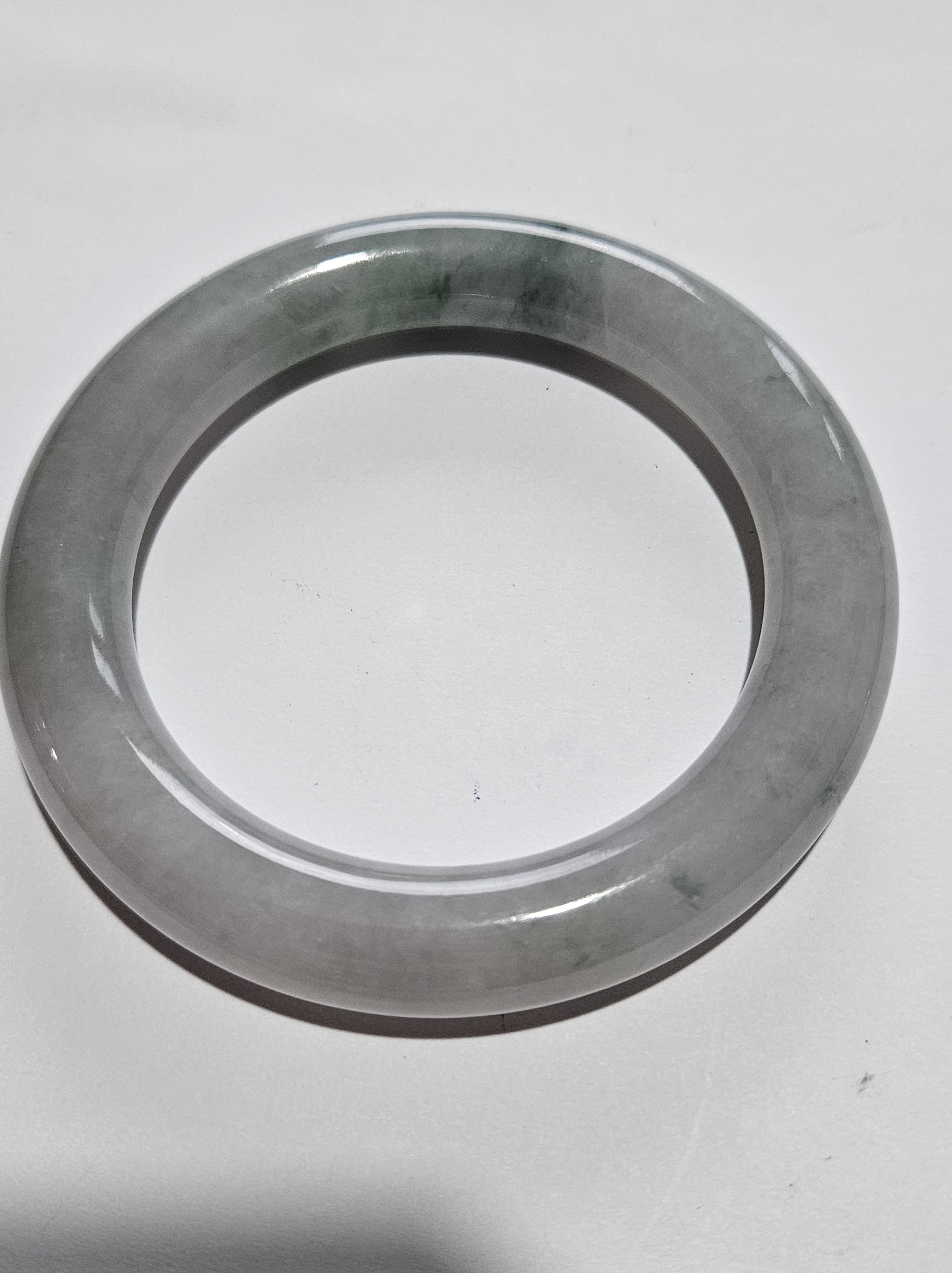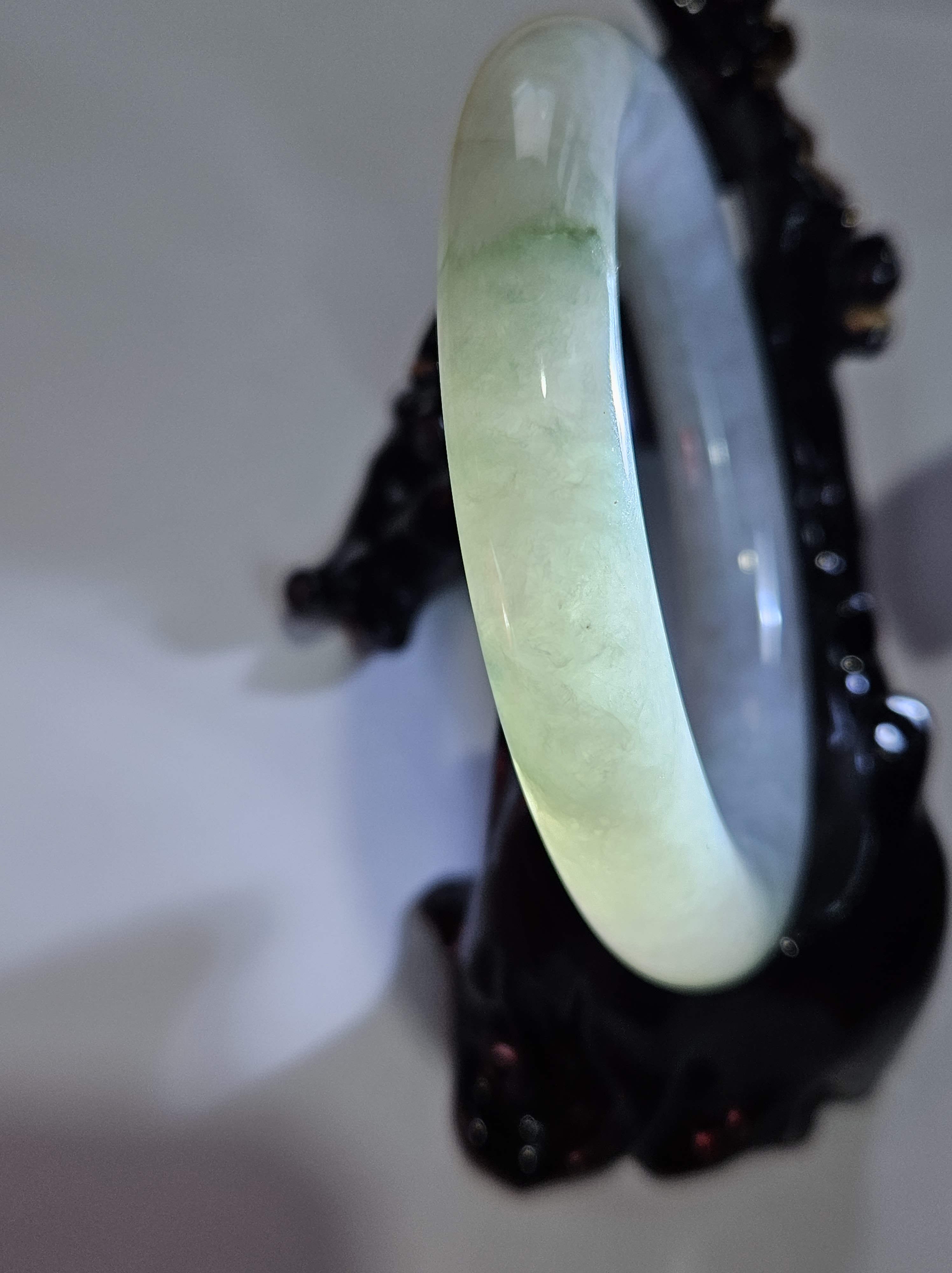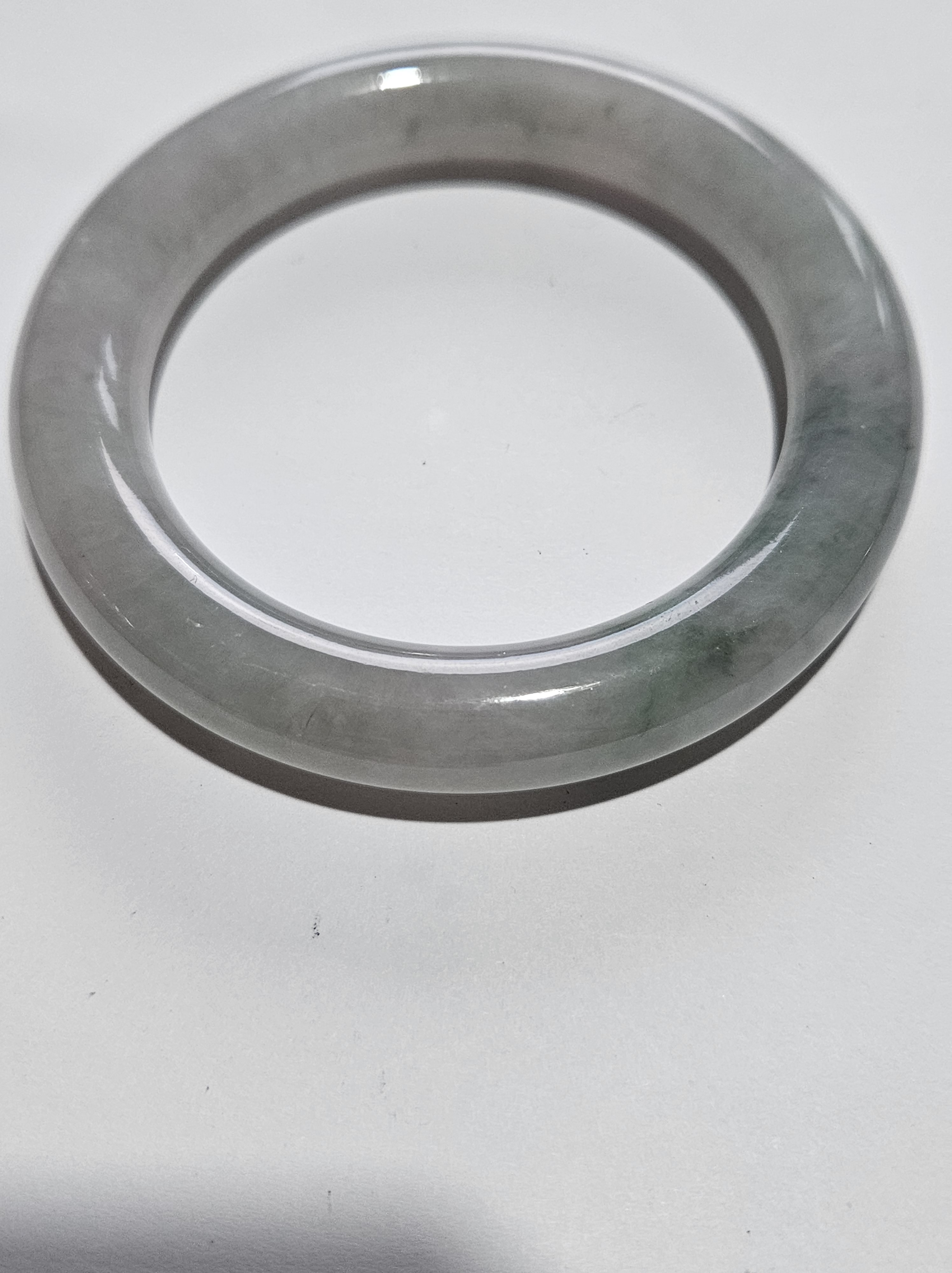 Lovely icy light green wide round Burmese jadeite bangle that fits up to 57mm. Measures 55.1 x 11.5 x 12mm, weighs 73.01g, comes with a certificate of authenticity £580