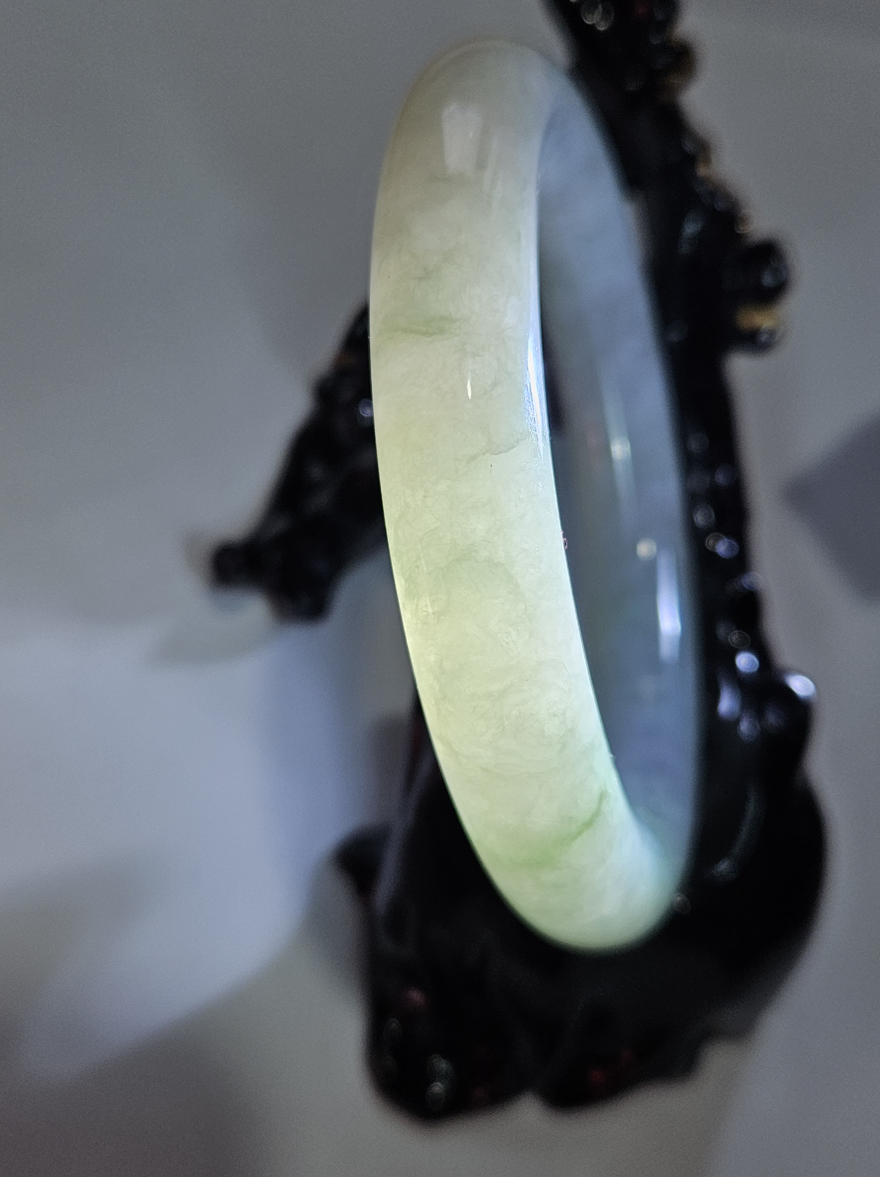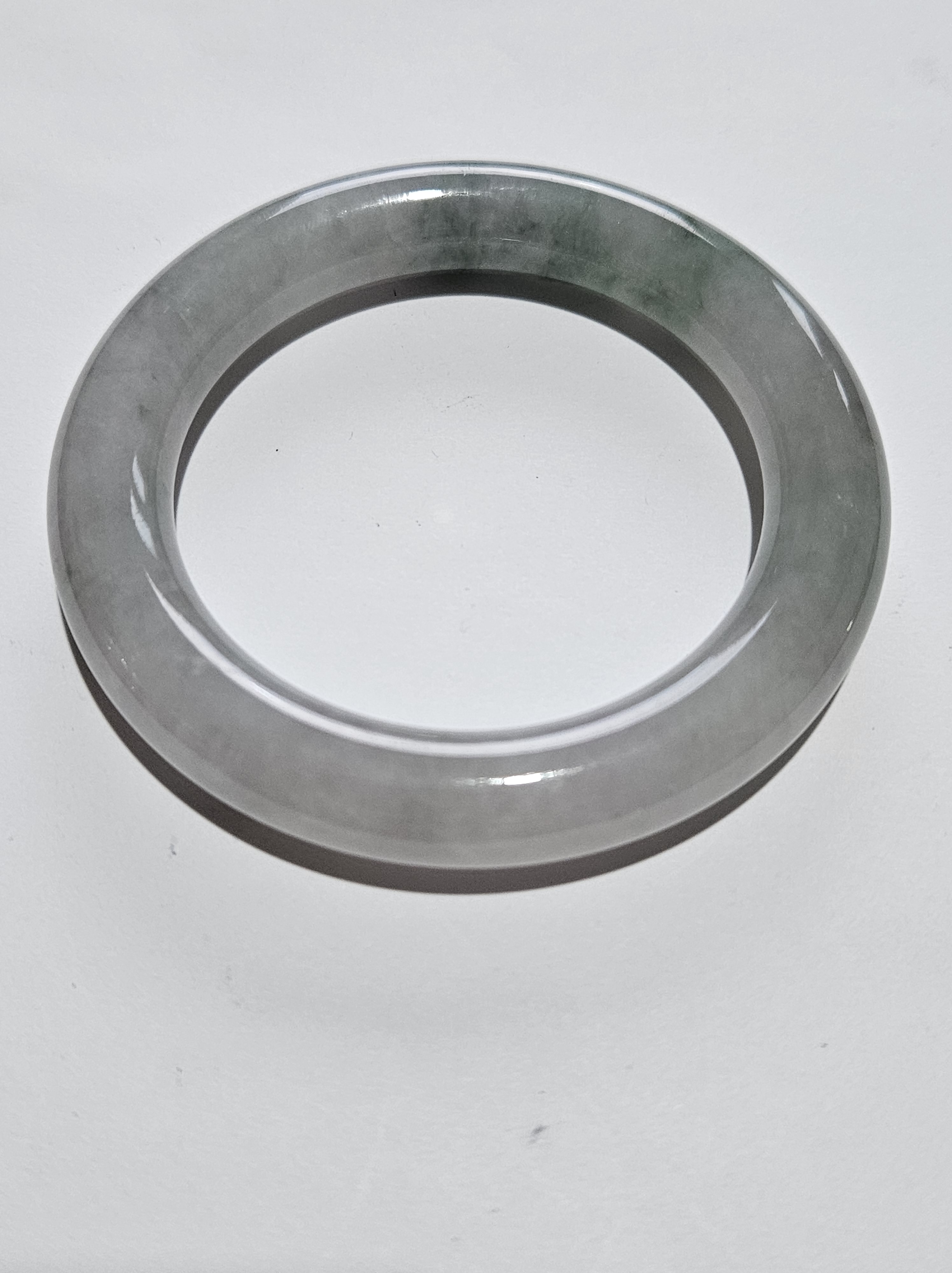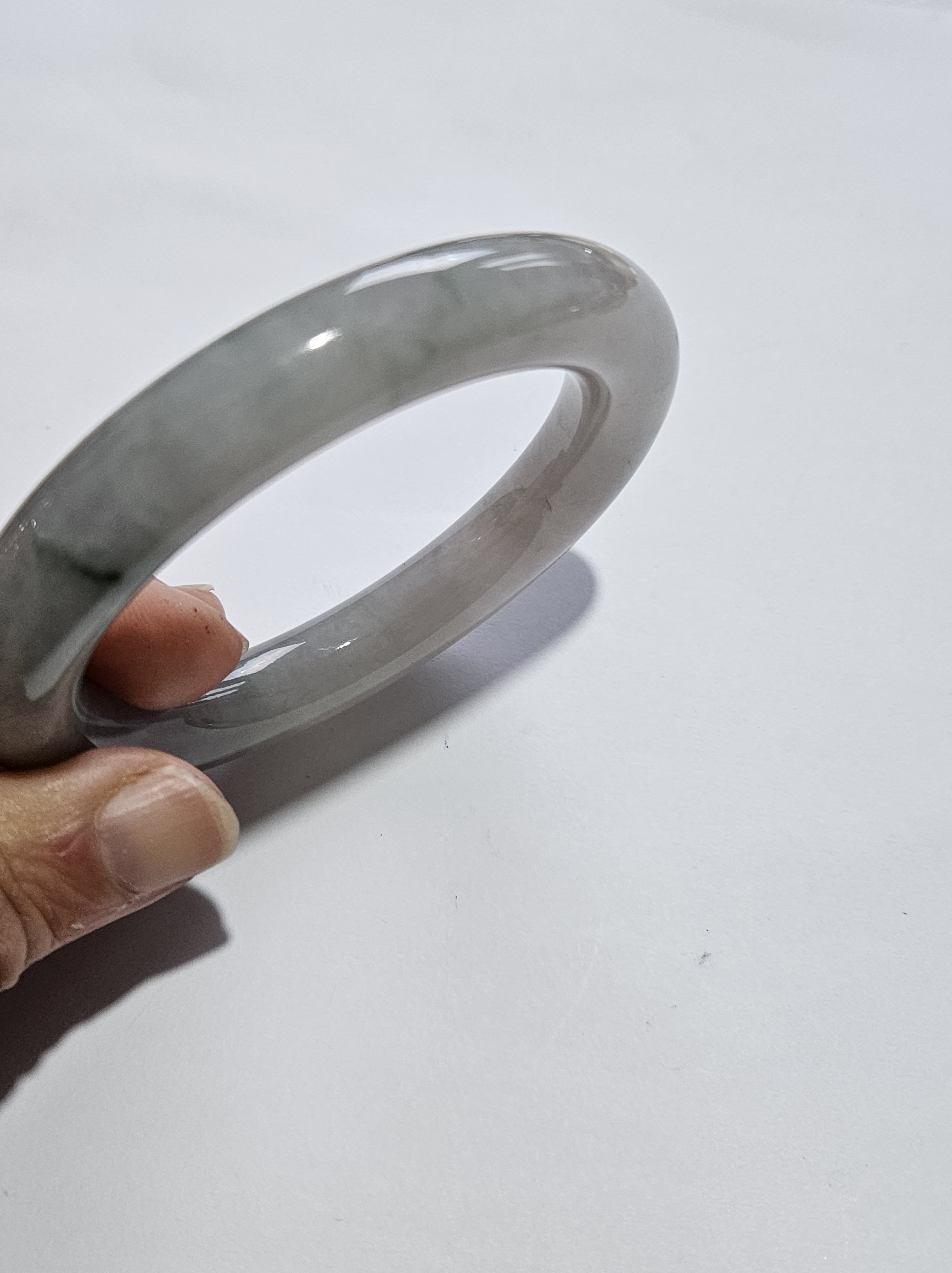 Lovely icy light green wide round Burmese jadeite bangle that fits up to 57mm. Measures 55.1 x 11.5 x 12mm, weighs 73.01g, comes with a certificate of authenticity £580