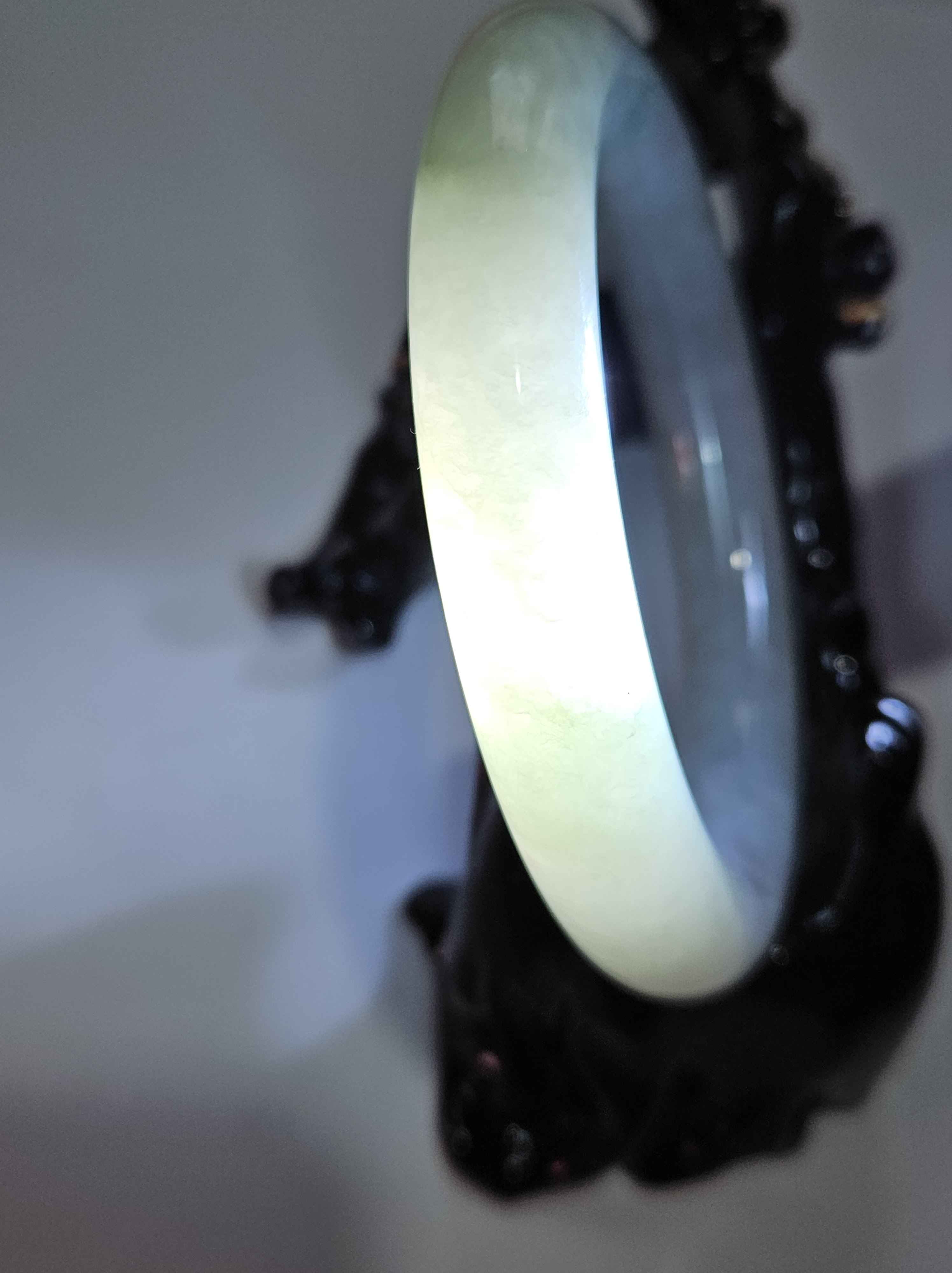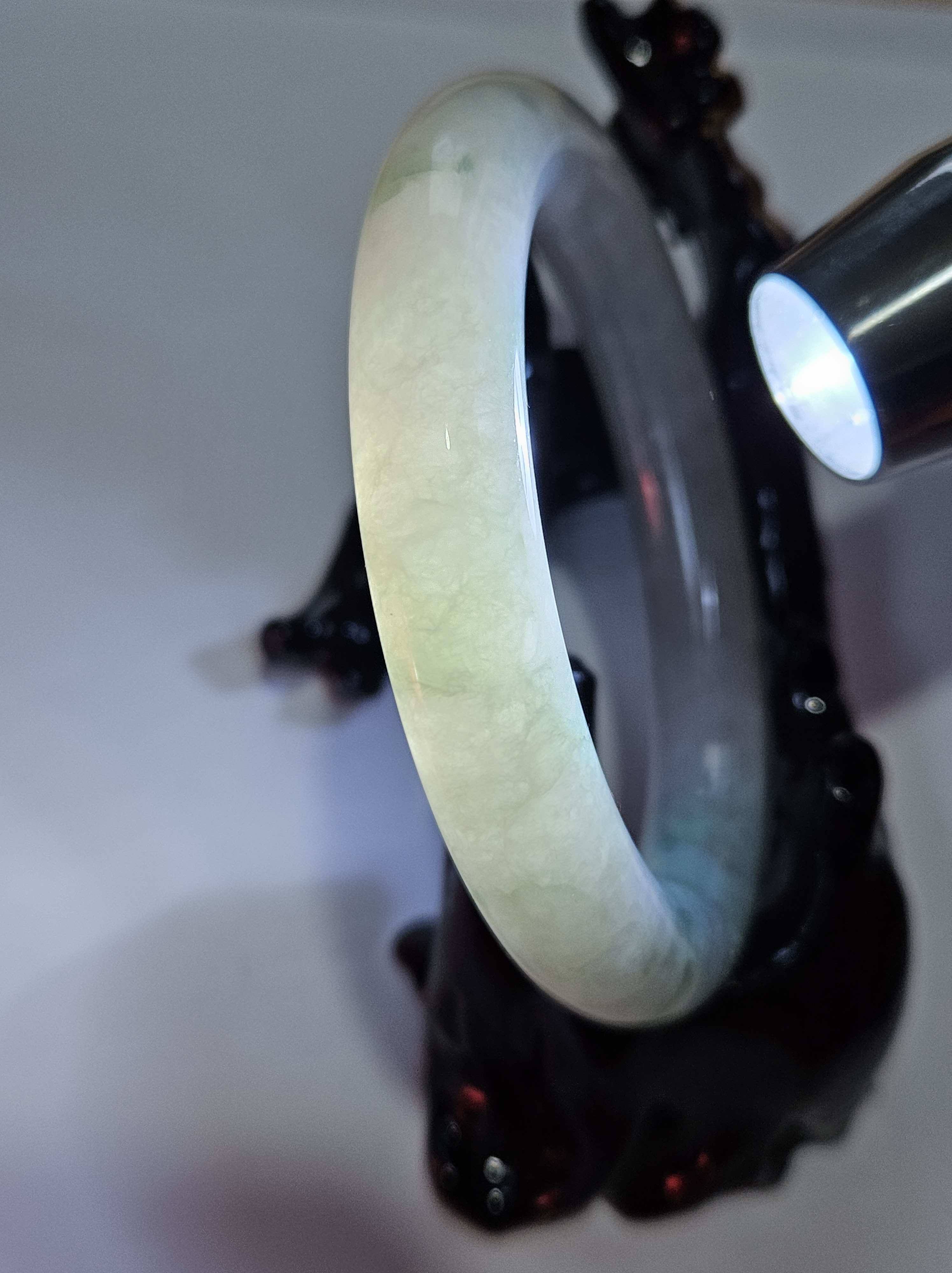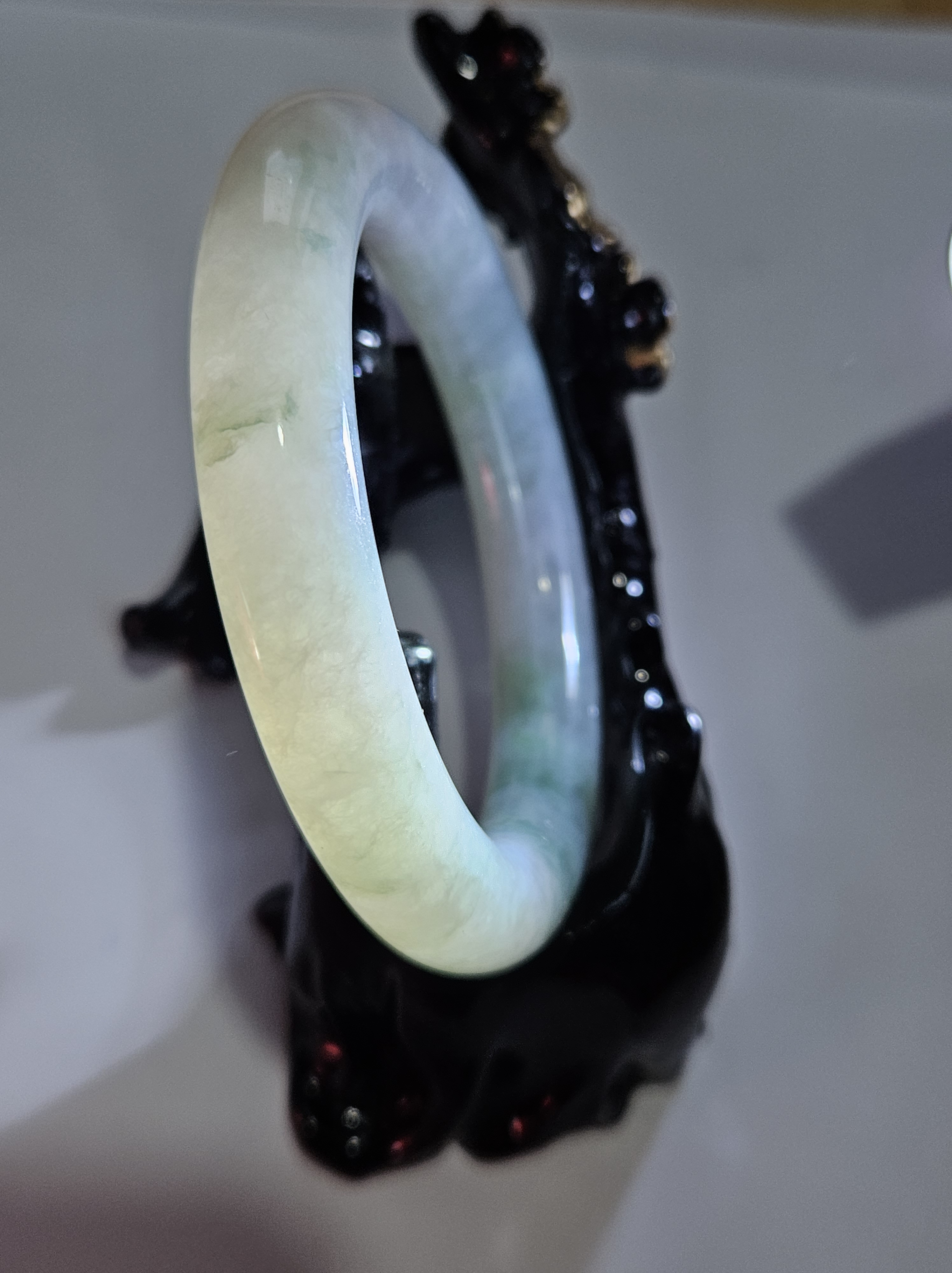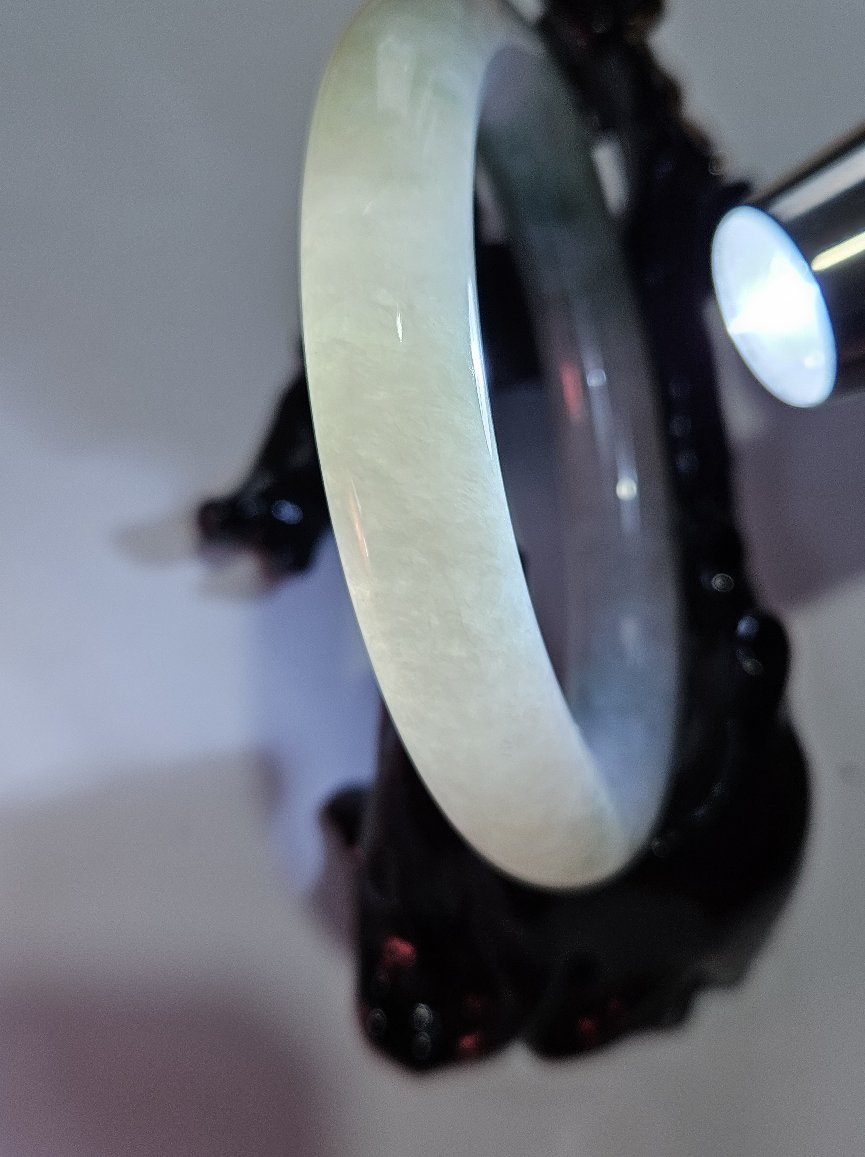 Lovely icy light green wide round Burmese jadeite bangle that fits up to 57mm. Measures 55.1 x 11.5 x 12mm, weighs 73.01g, comes with a certificate of authenticity £580