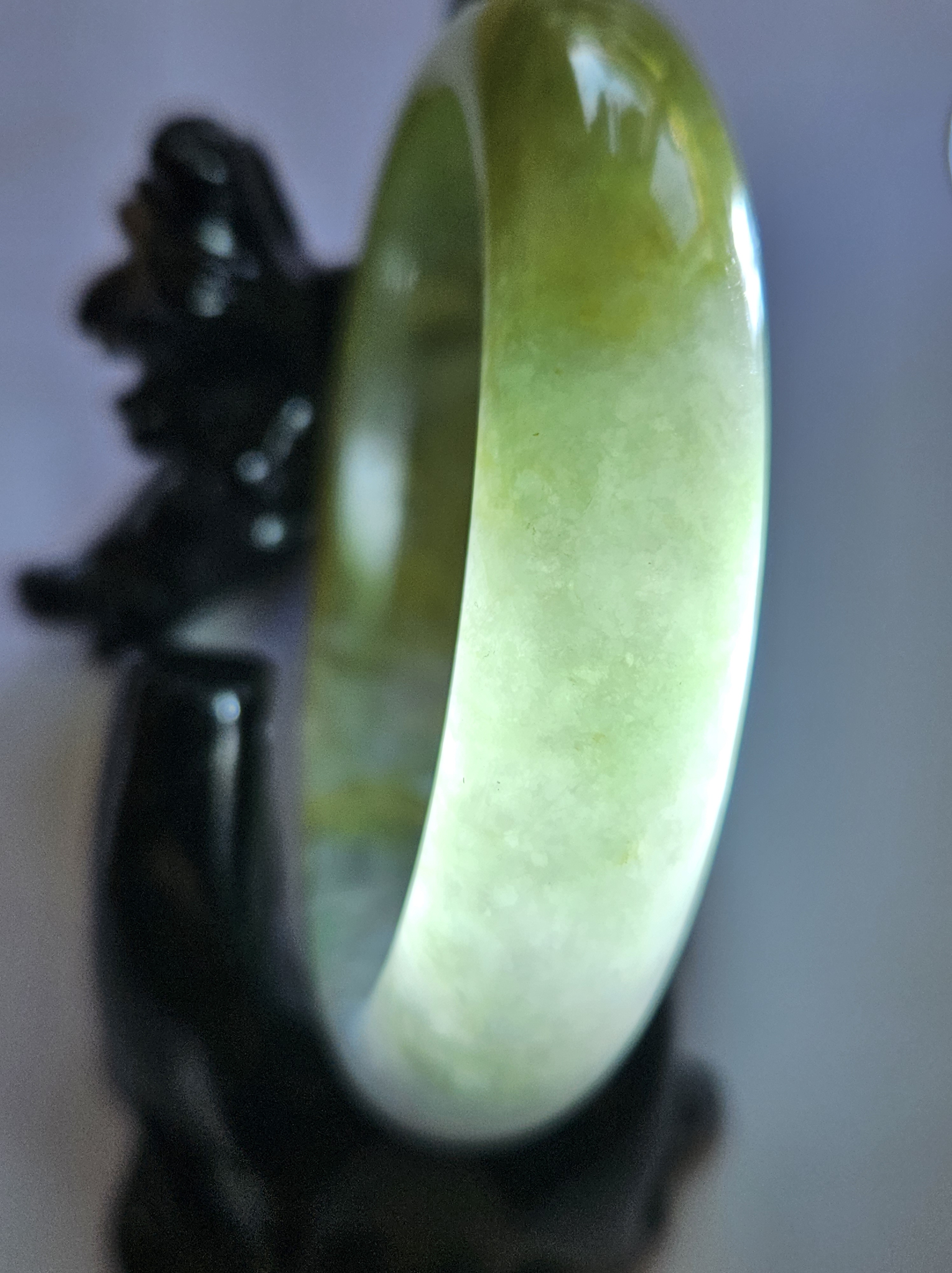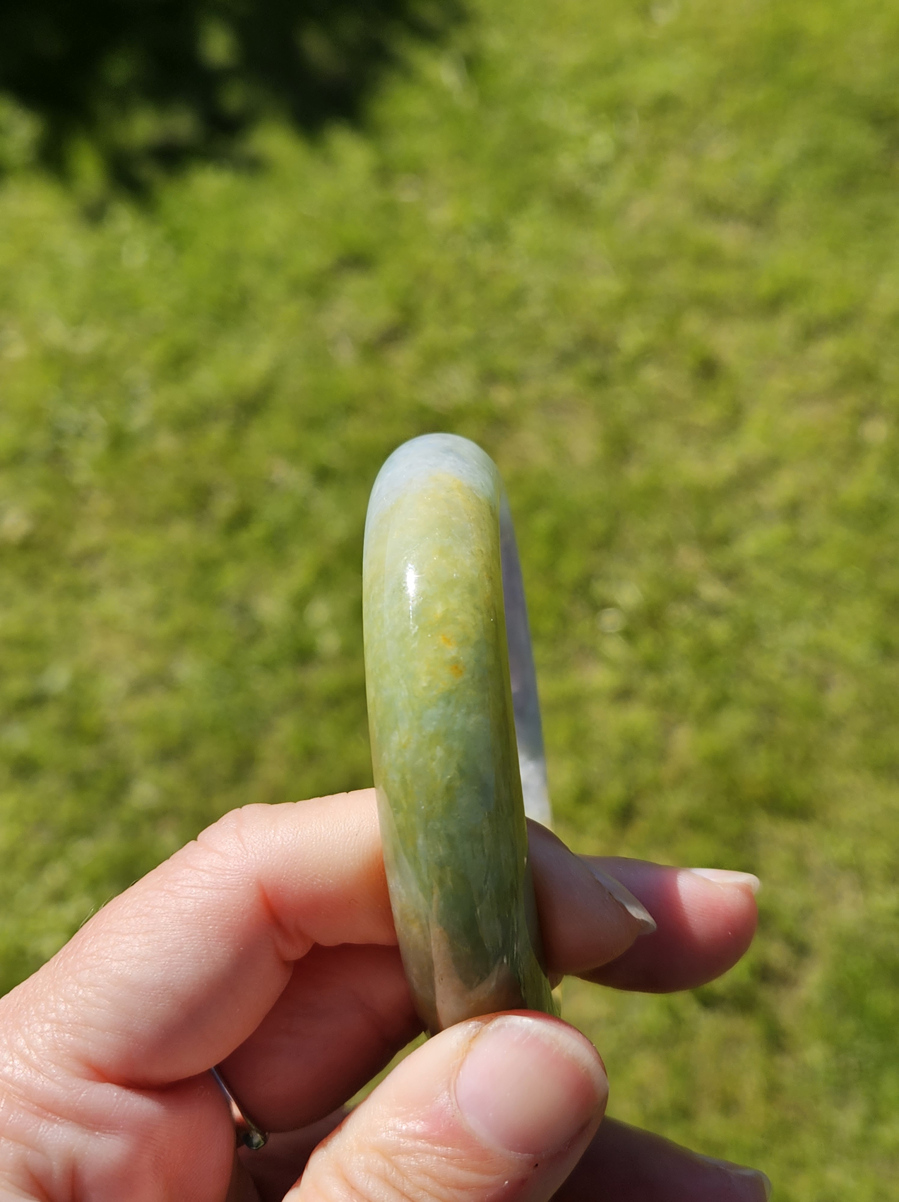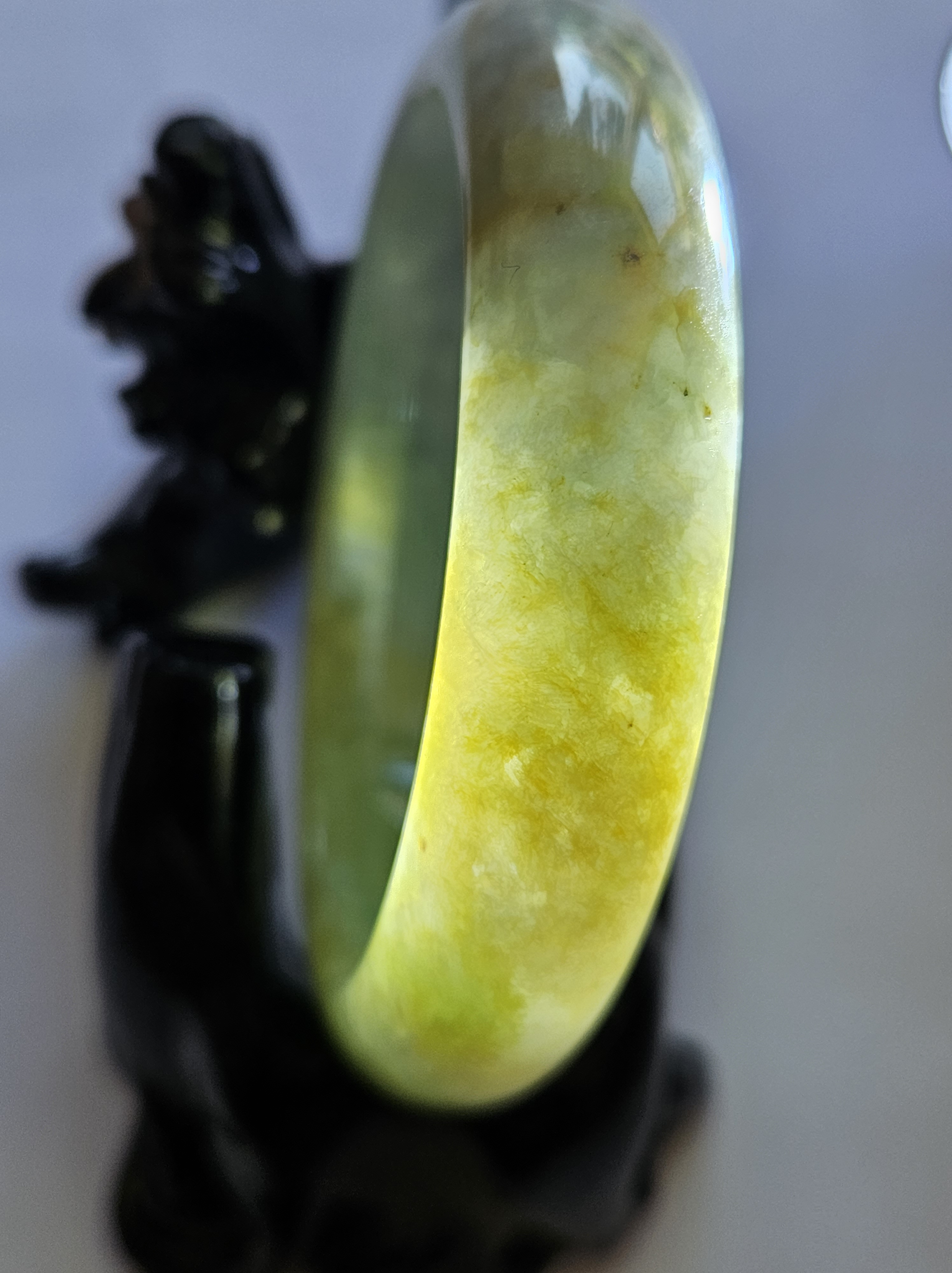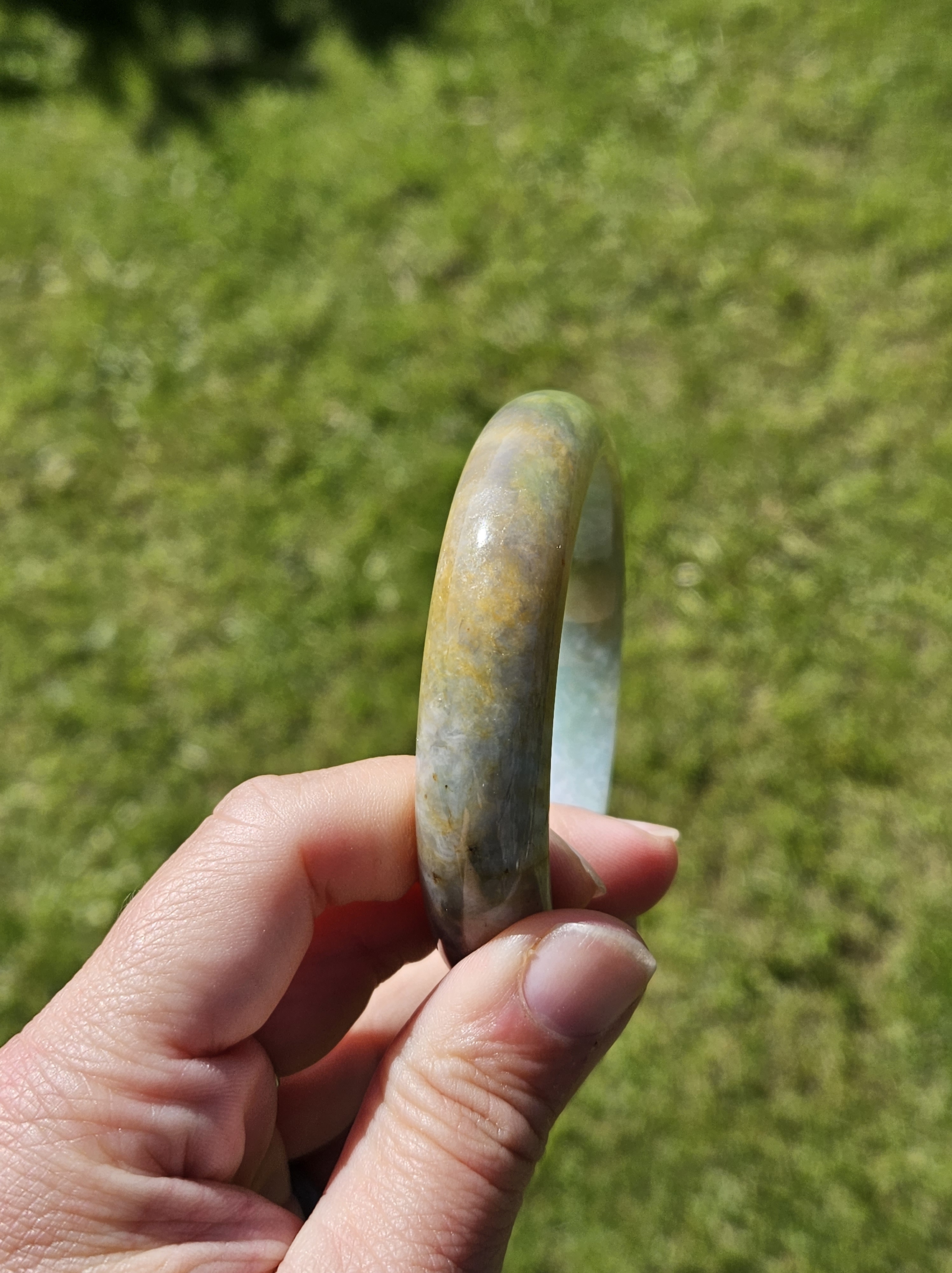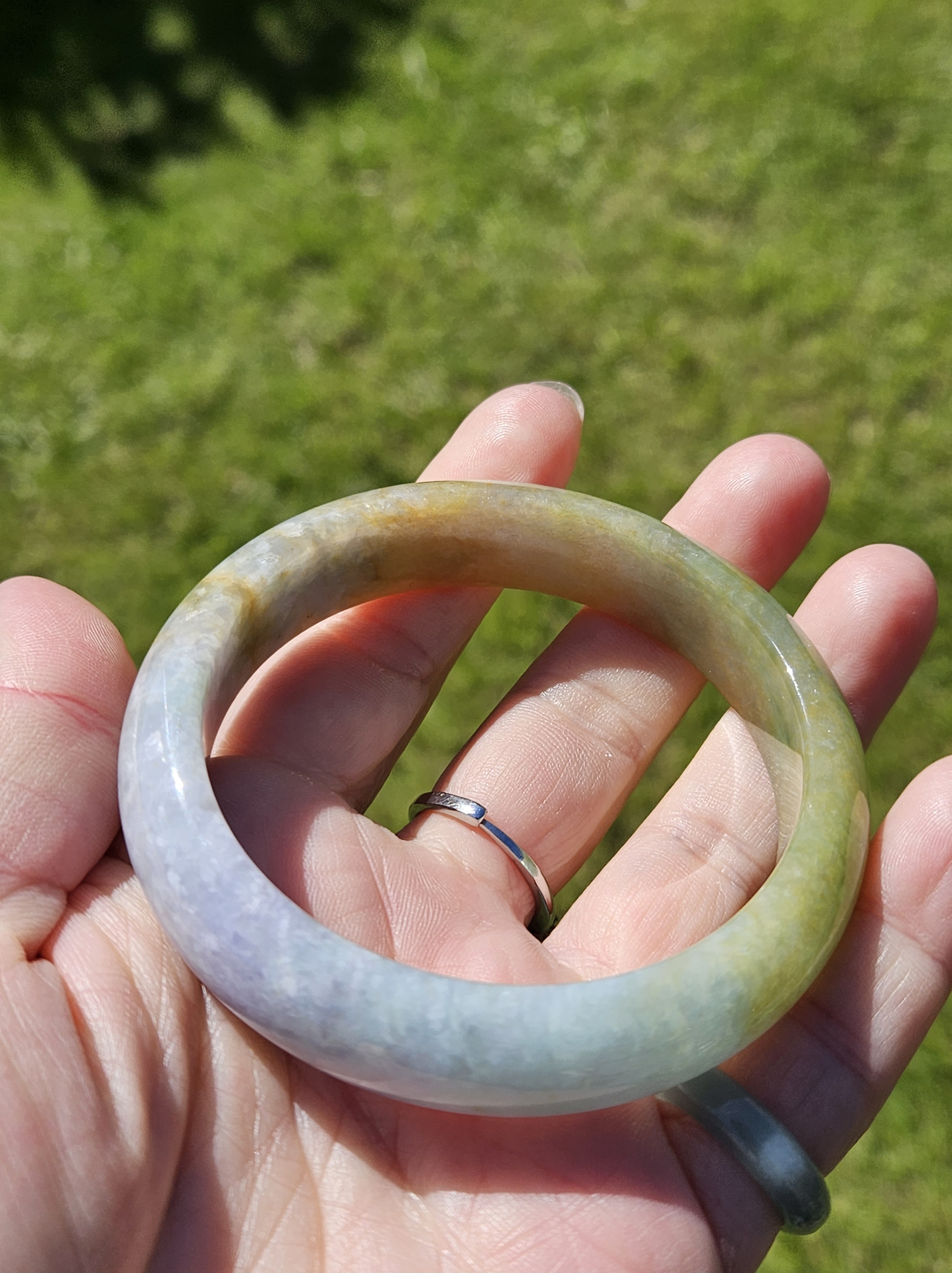 Stunning Burmese jadeite bangle with green,yellow and purple also known as Fulushou福禄寿 signifying good fortune, prosperity and longevity. The colours are natural and will add value as time goes. Measures 57.2 x 14.2 x 8.1mm, weighs 62.49g, comes with a certificate of authenticity £1380
