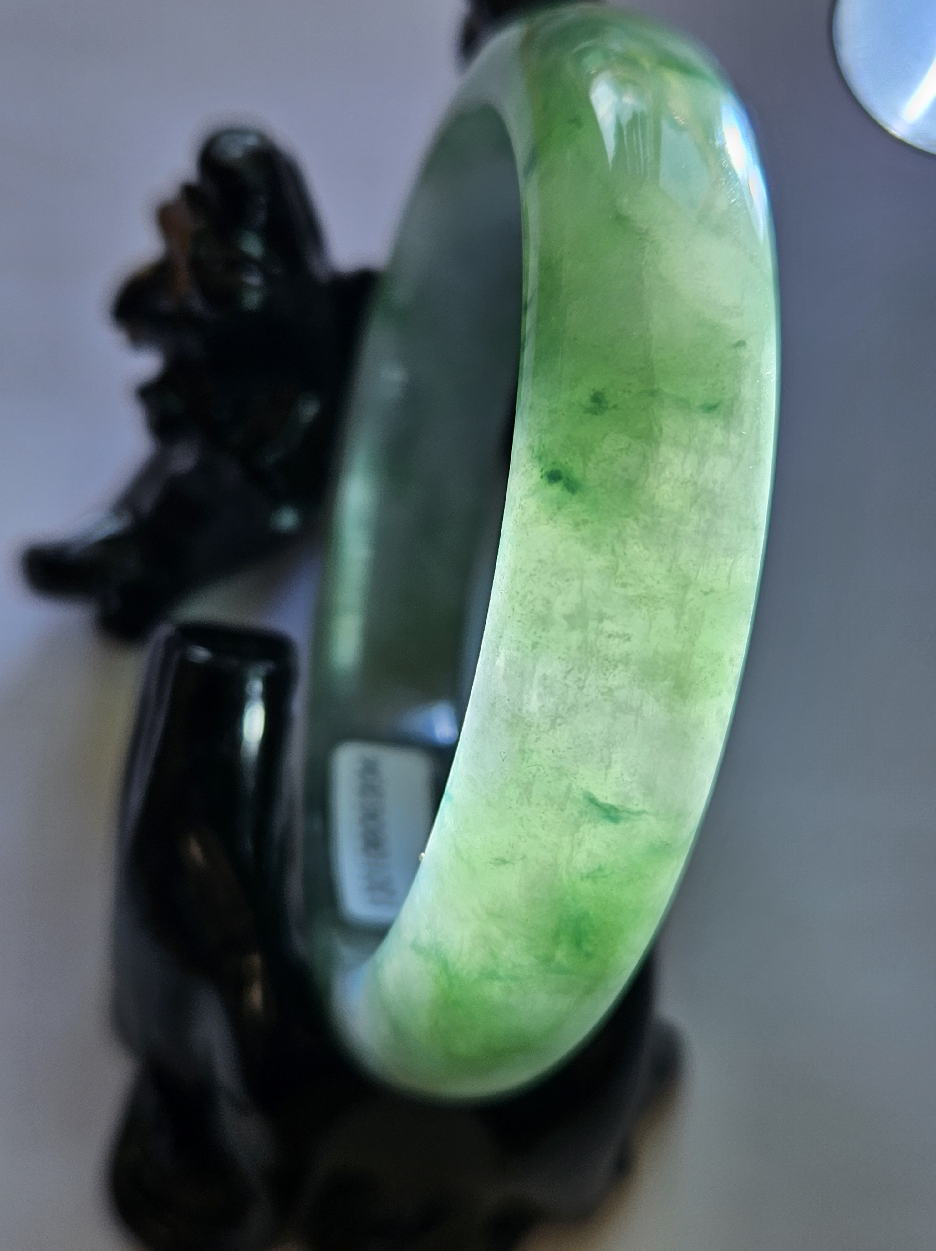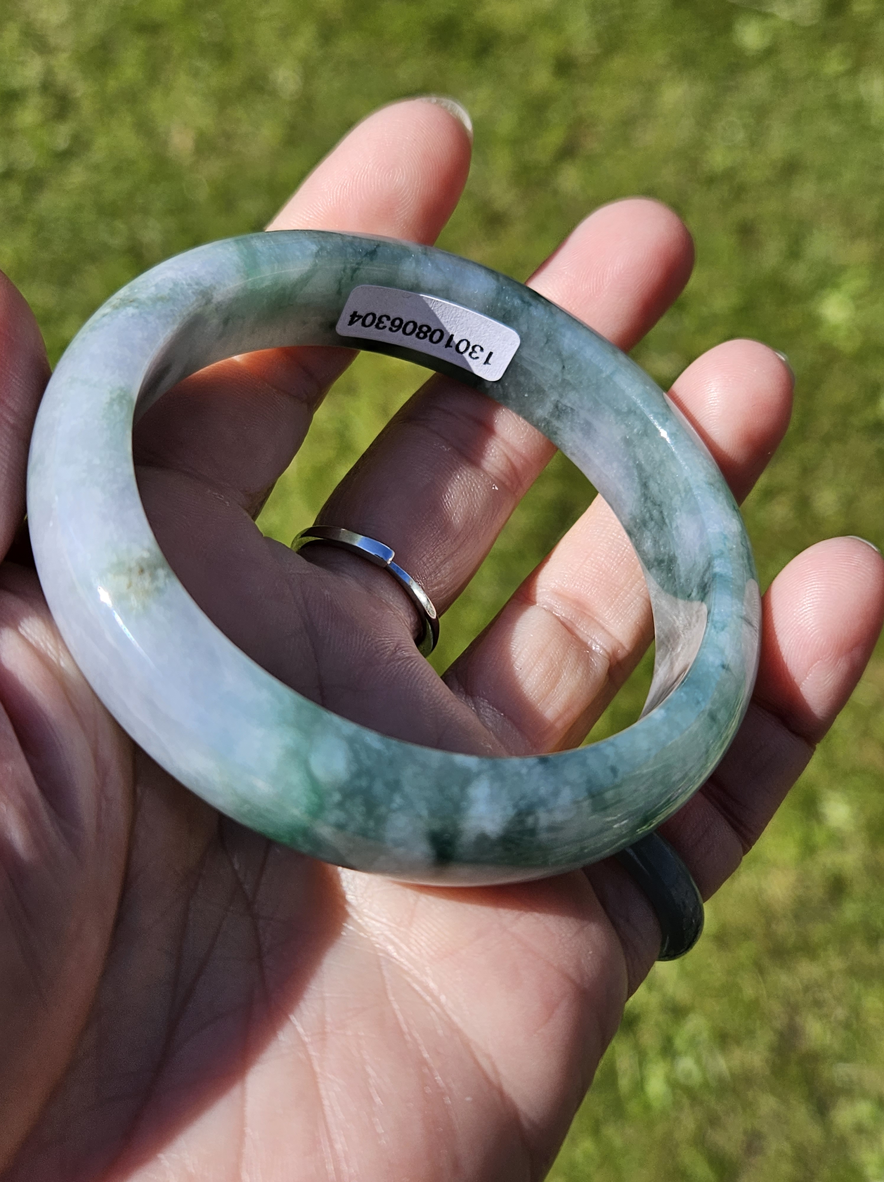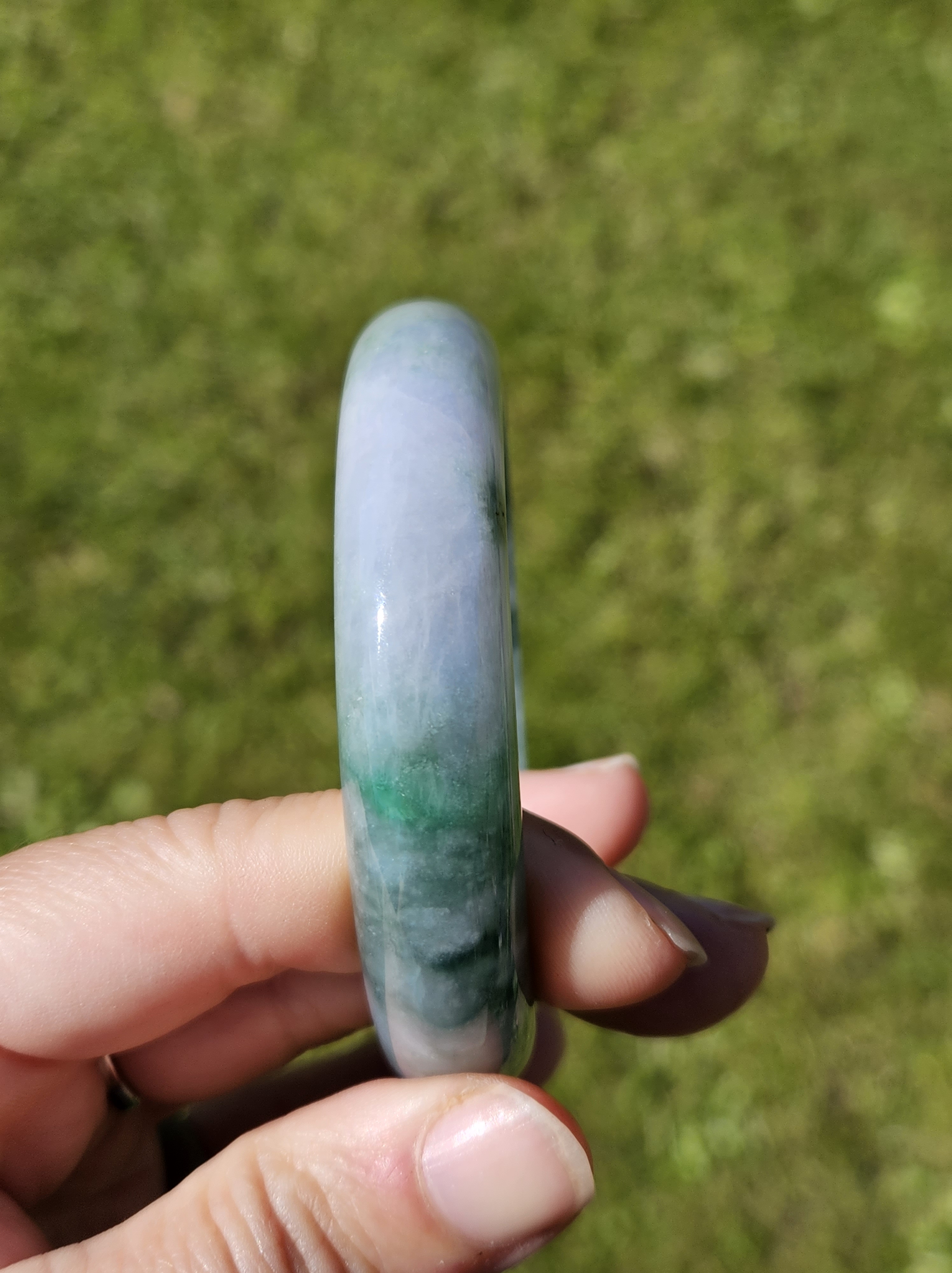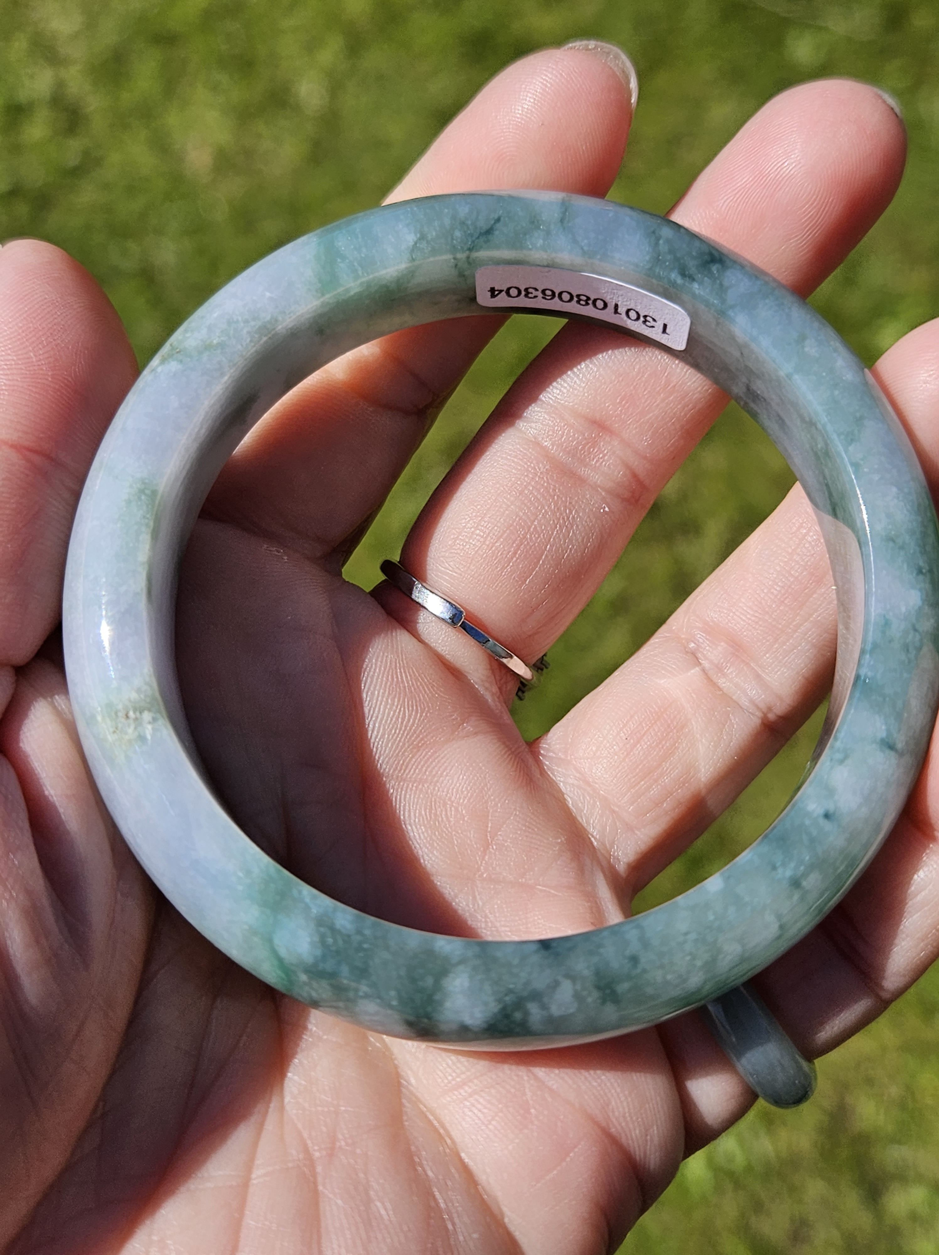 Stunning Burmese jadeite bangle with blue blooms measures 58.1 x 13.8 x 8.4mm, weighs 65.16g, comes with a certificate of authenticity £498