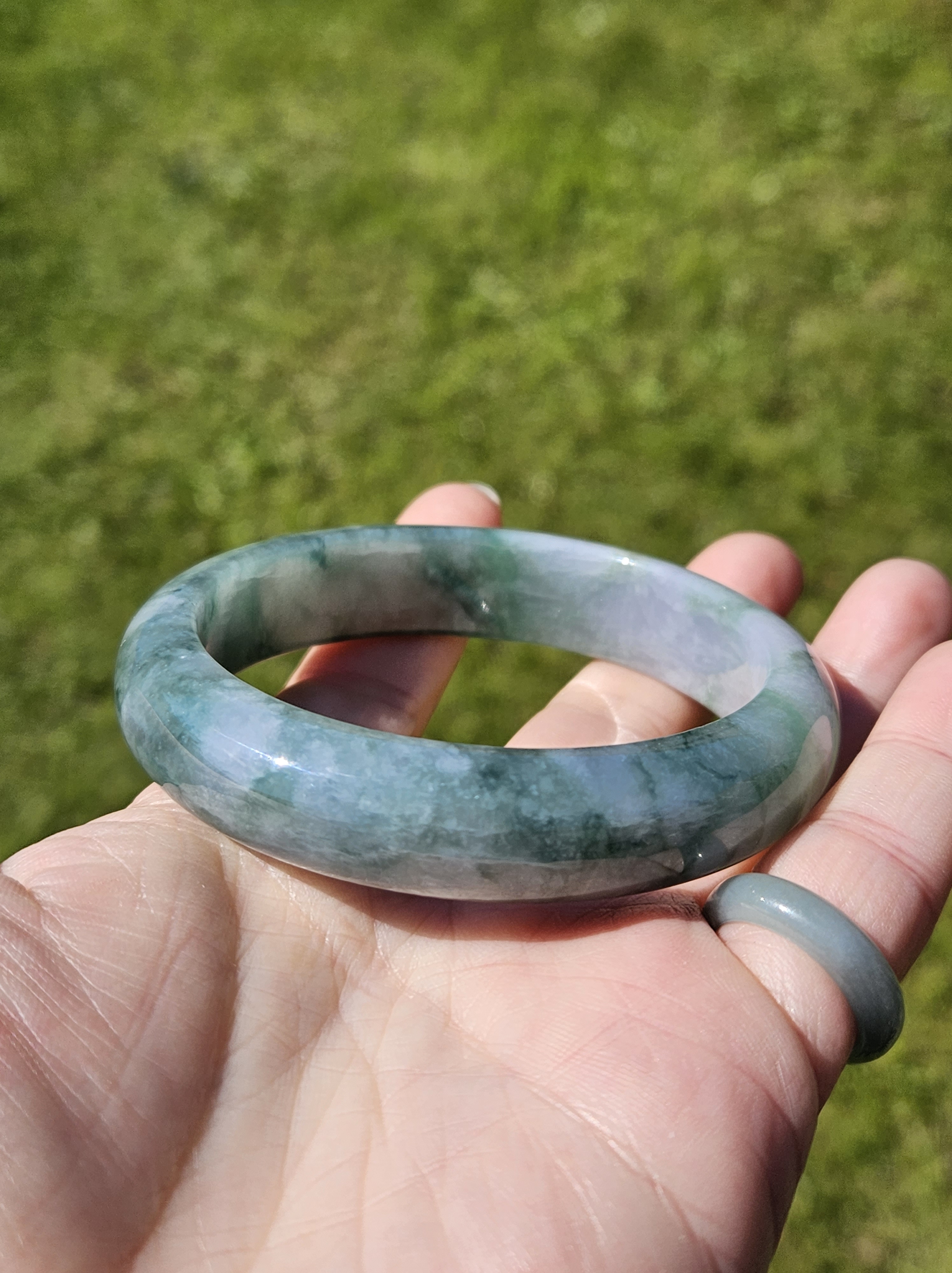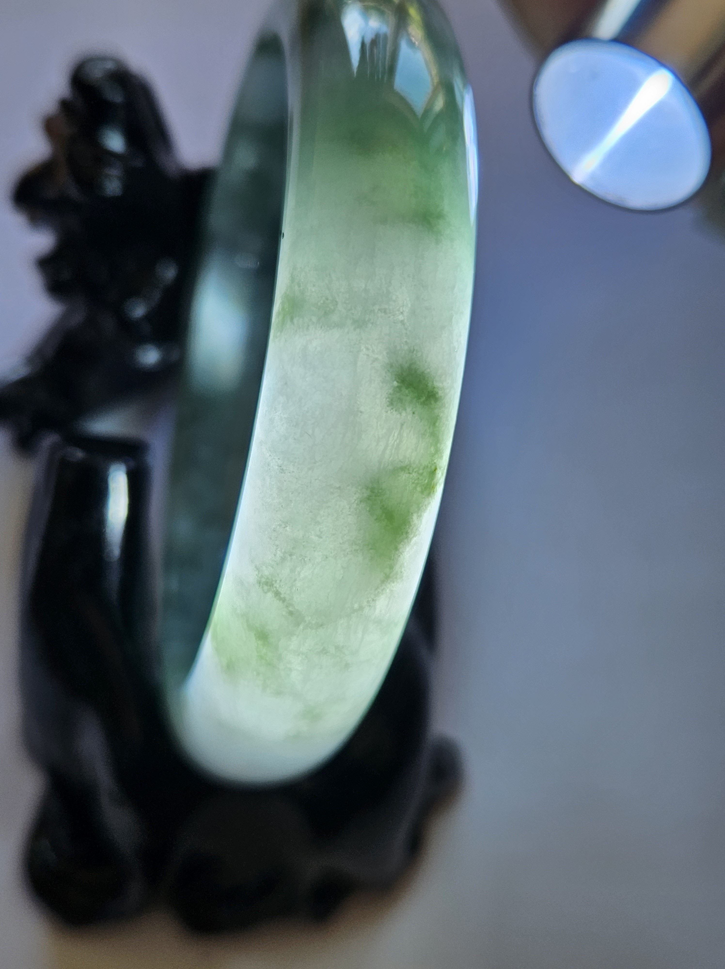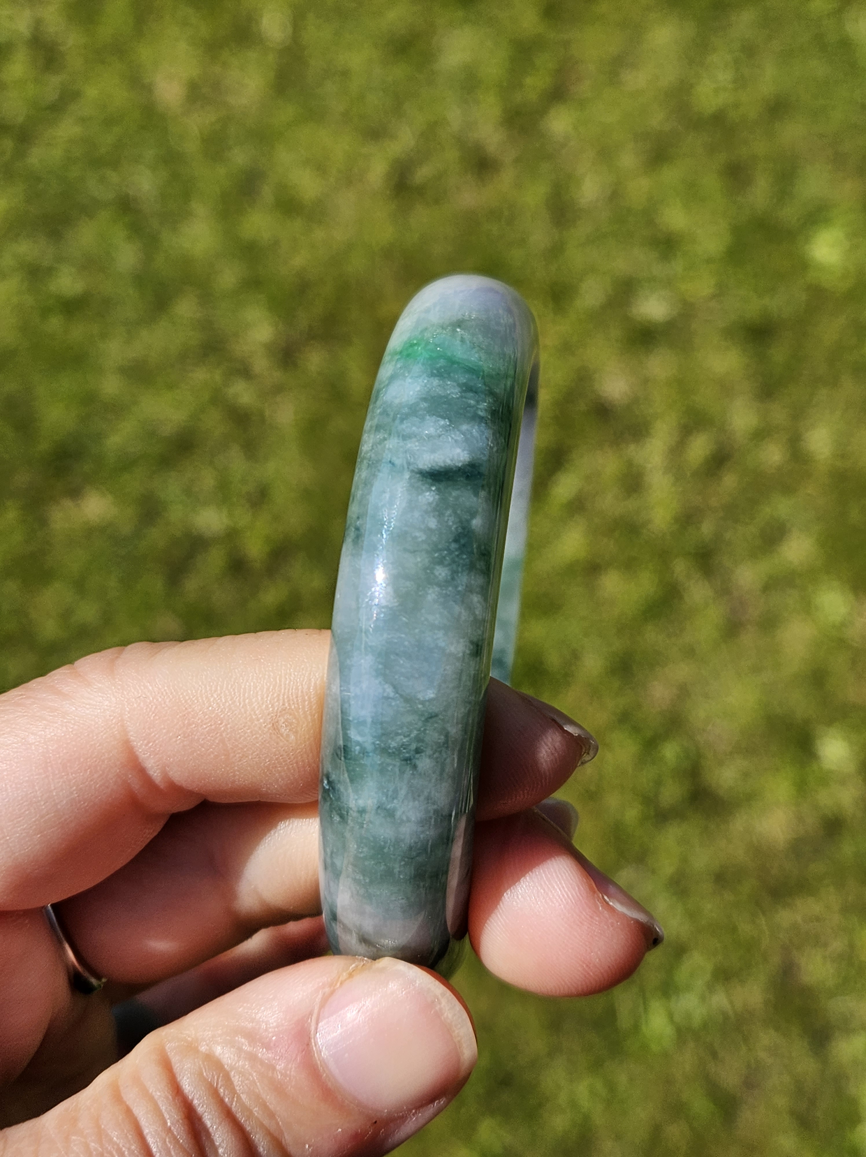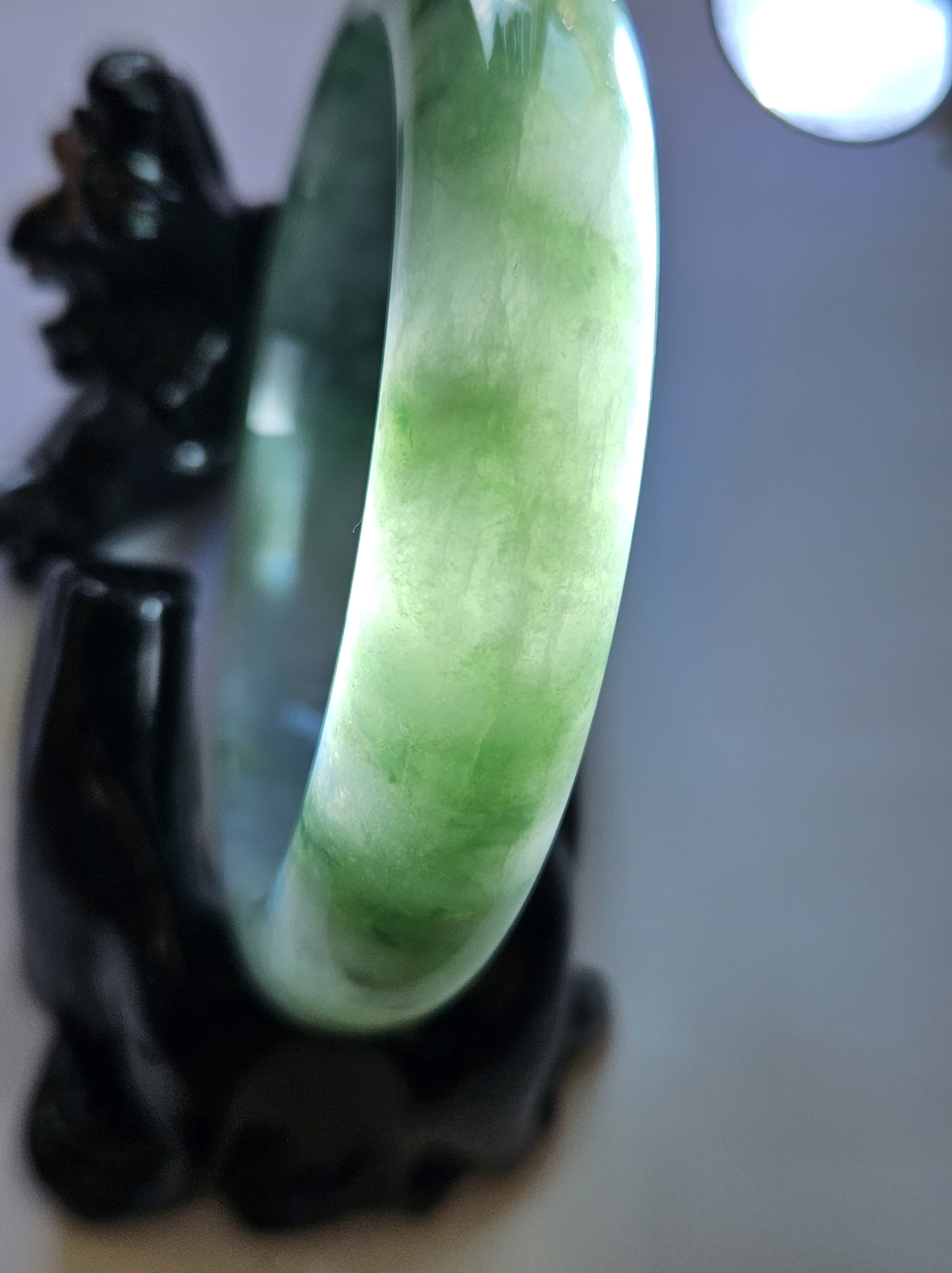 Stunning Burmese jadeite bangle with blue blooms measures 58.1 x 13.8 x 8.4mm, weighs 65.16g, comes with a certificate of authenticity £498
