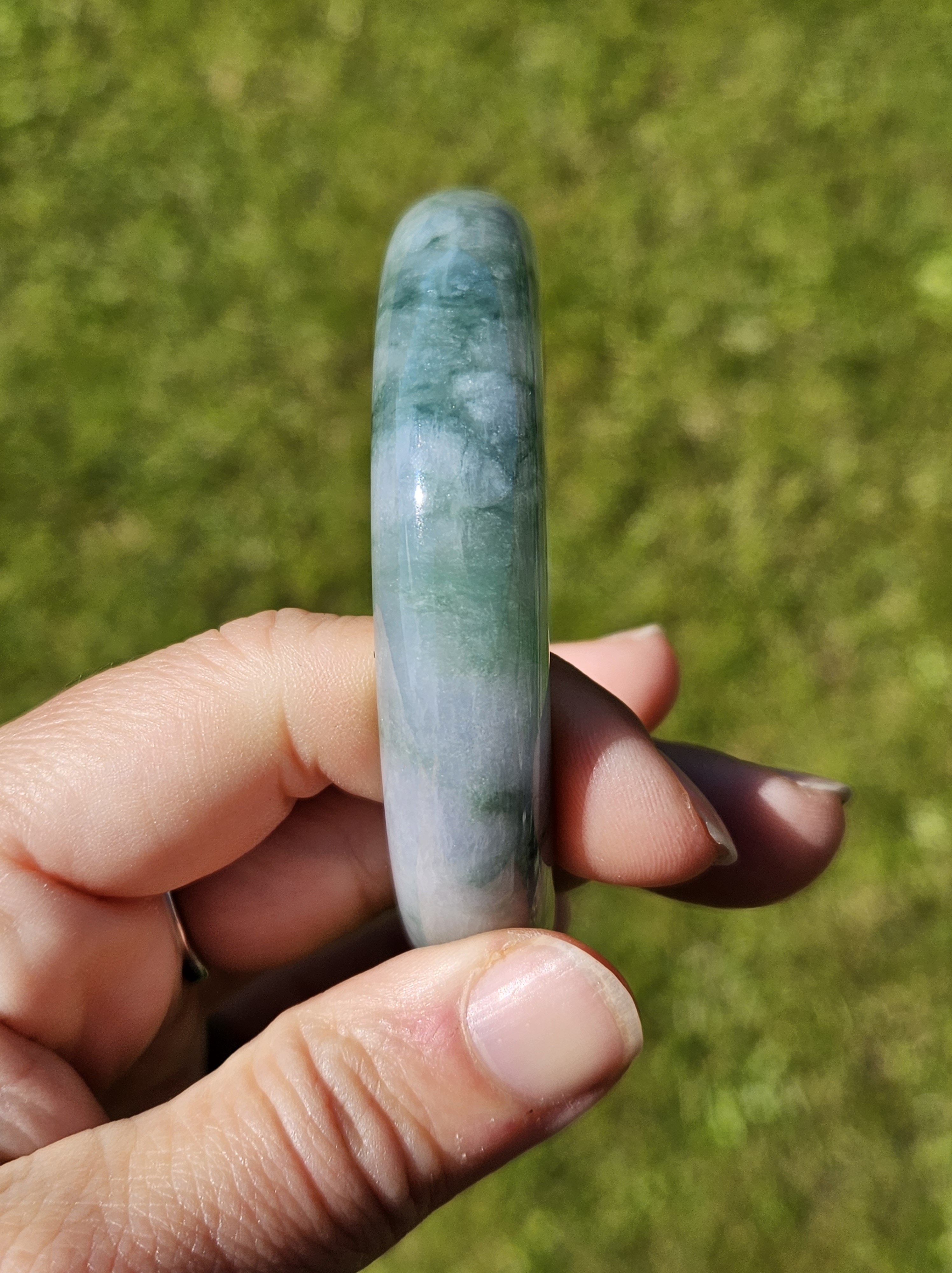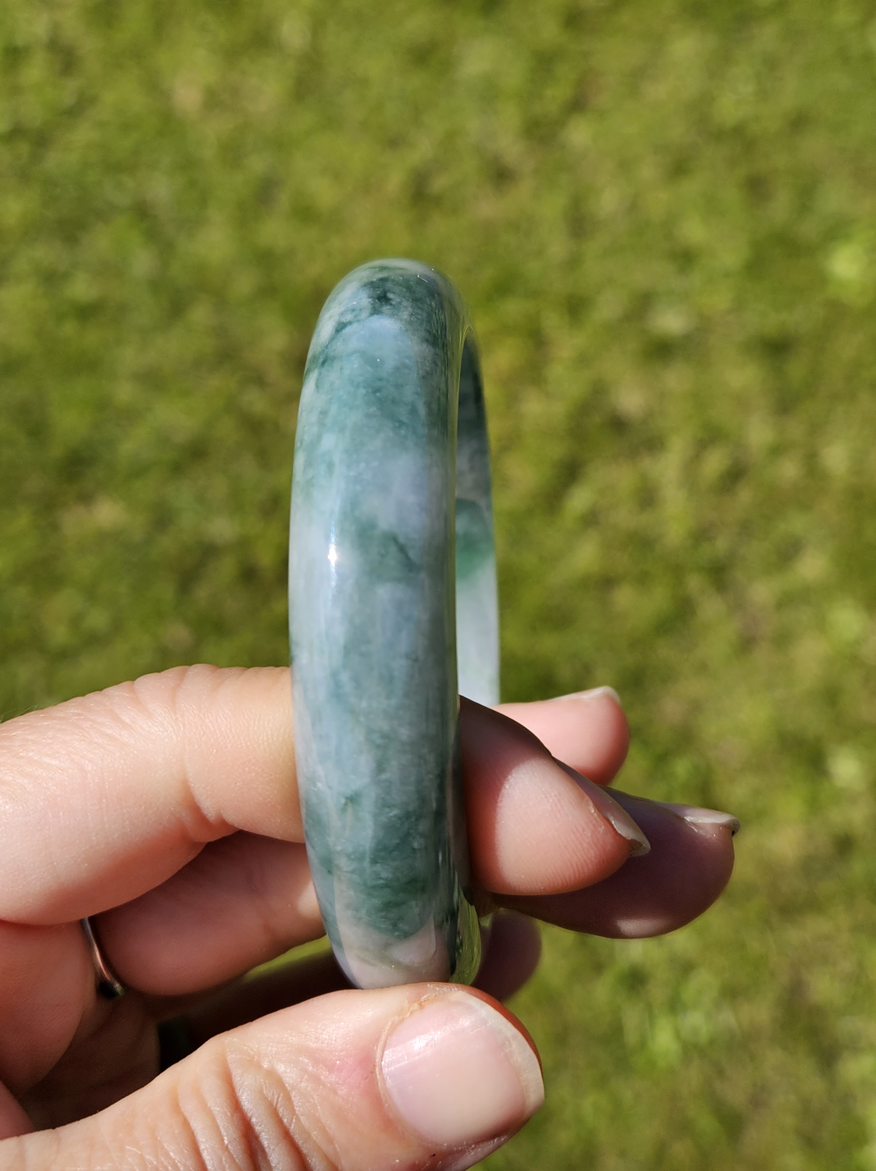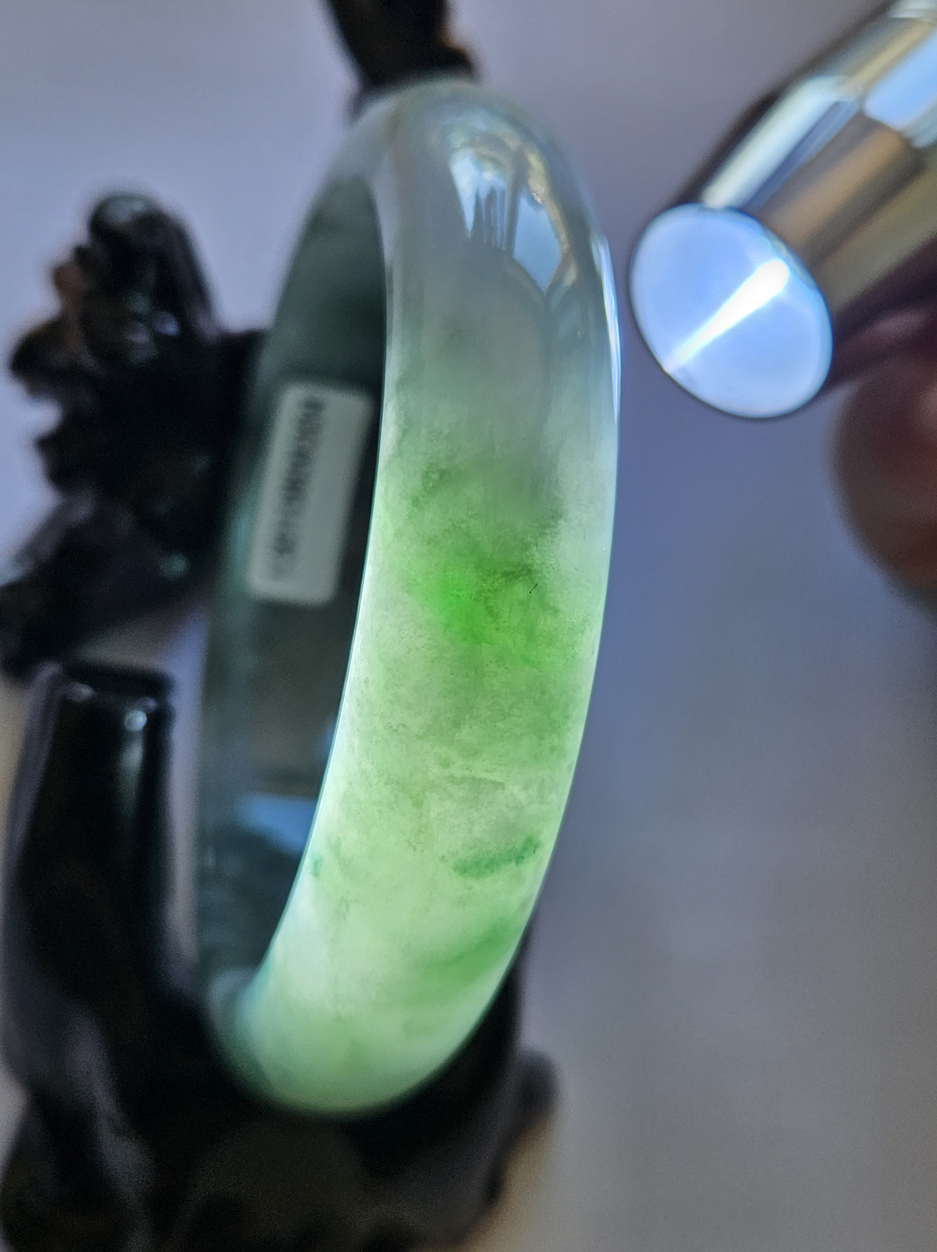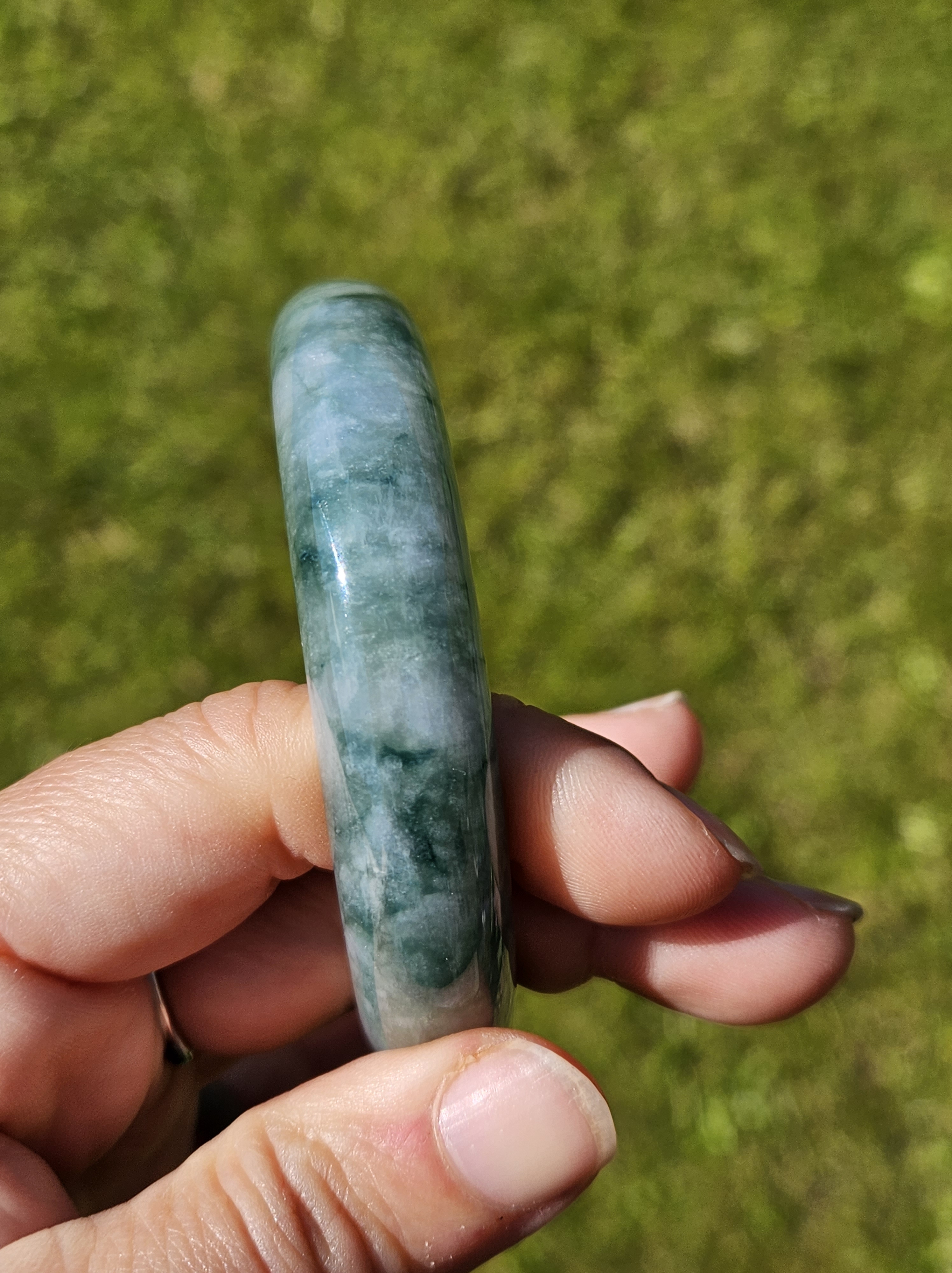 Stunning Burmese jadeite bangle with blue blooms measures 58.1 x 13.8 x 8.4mm, weighs 65.16g, comes with a certificate of authenticity £498