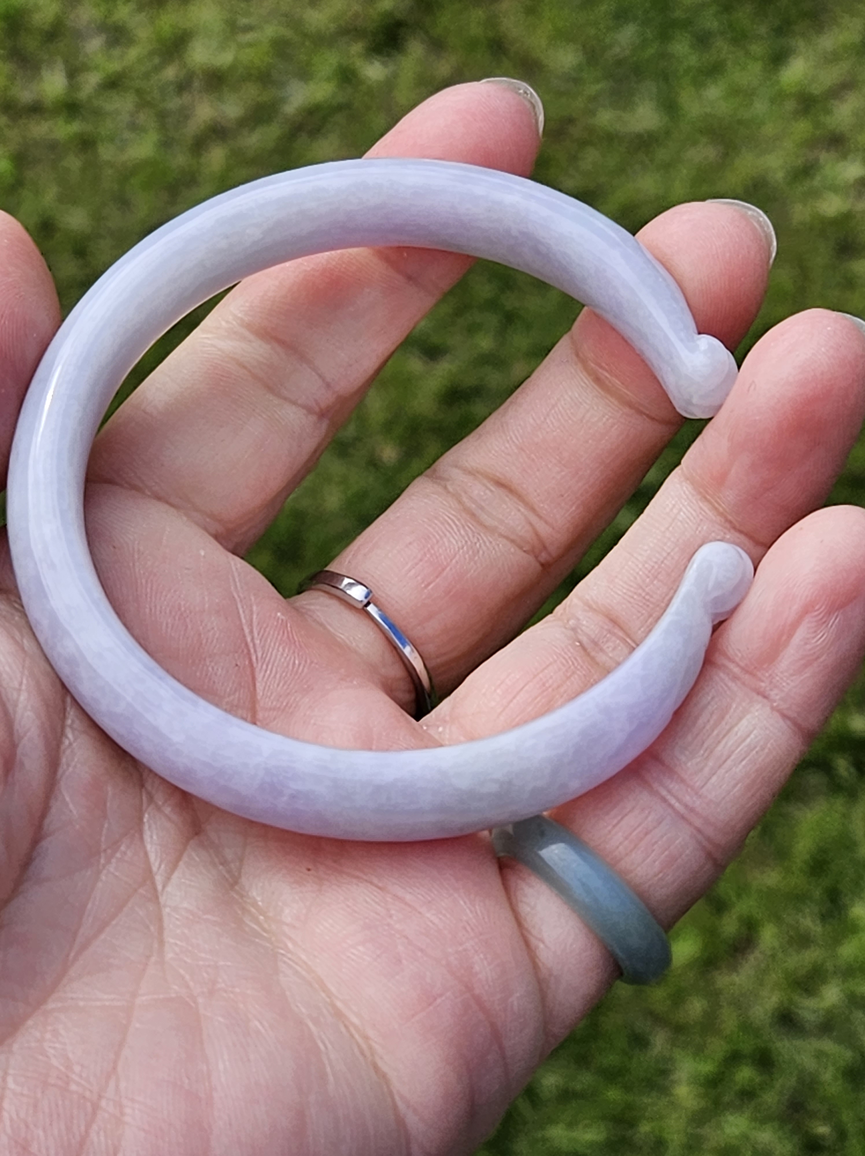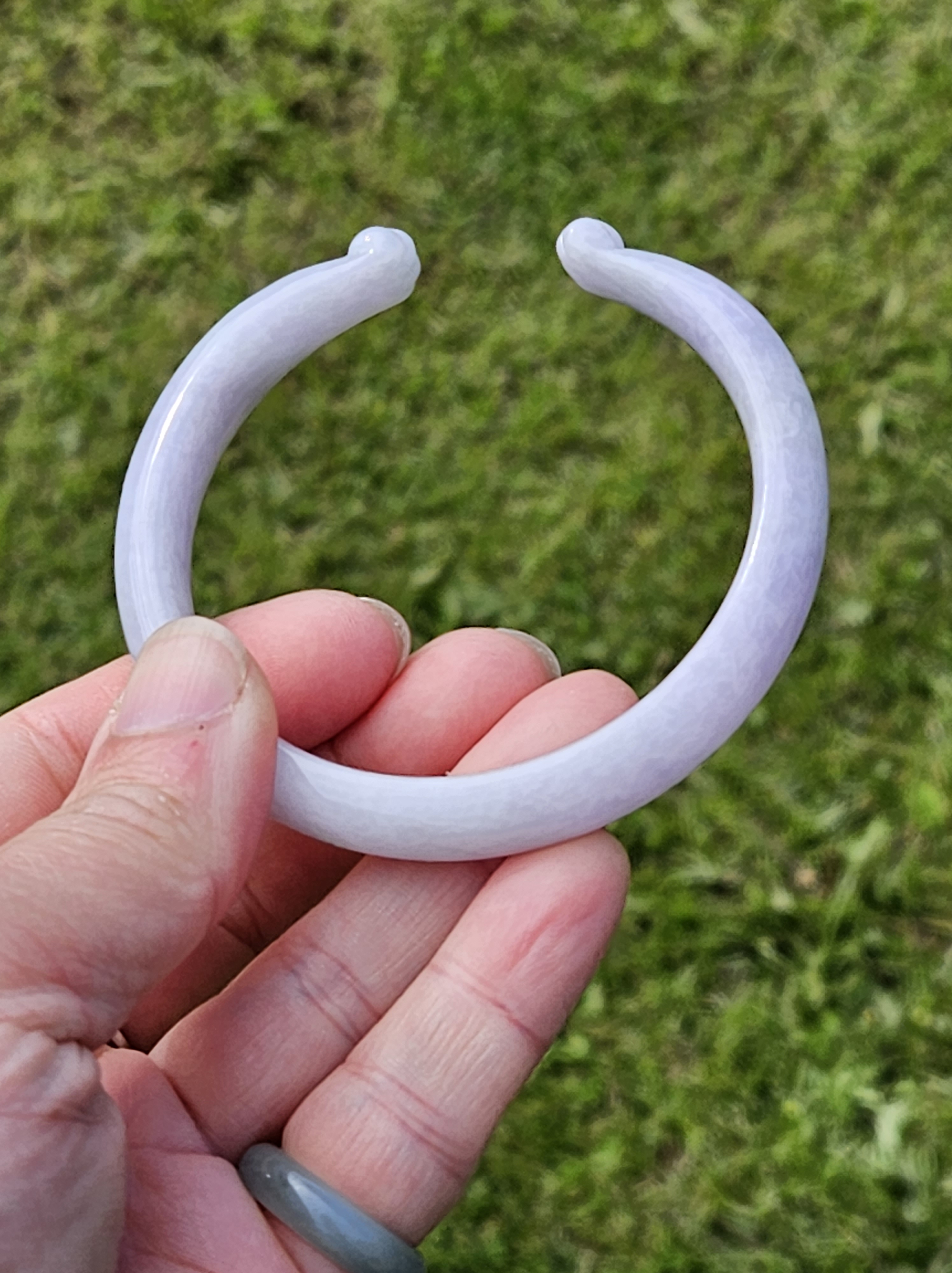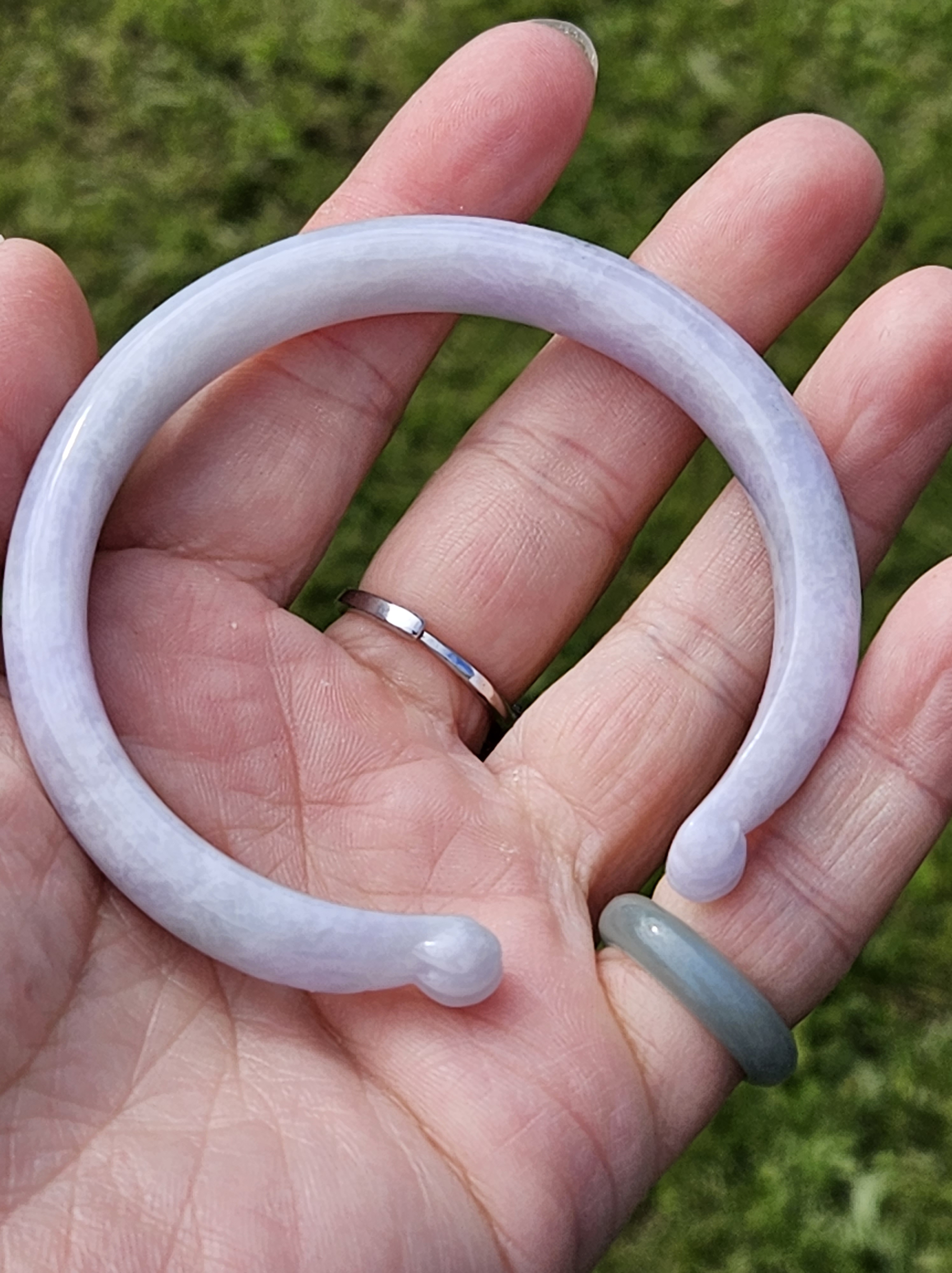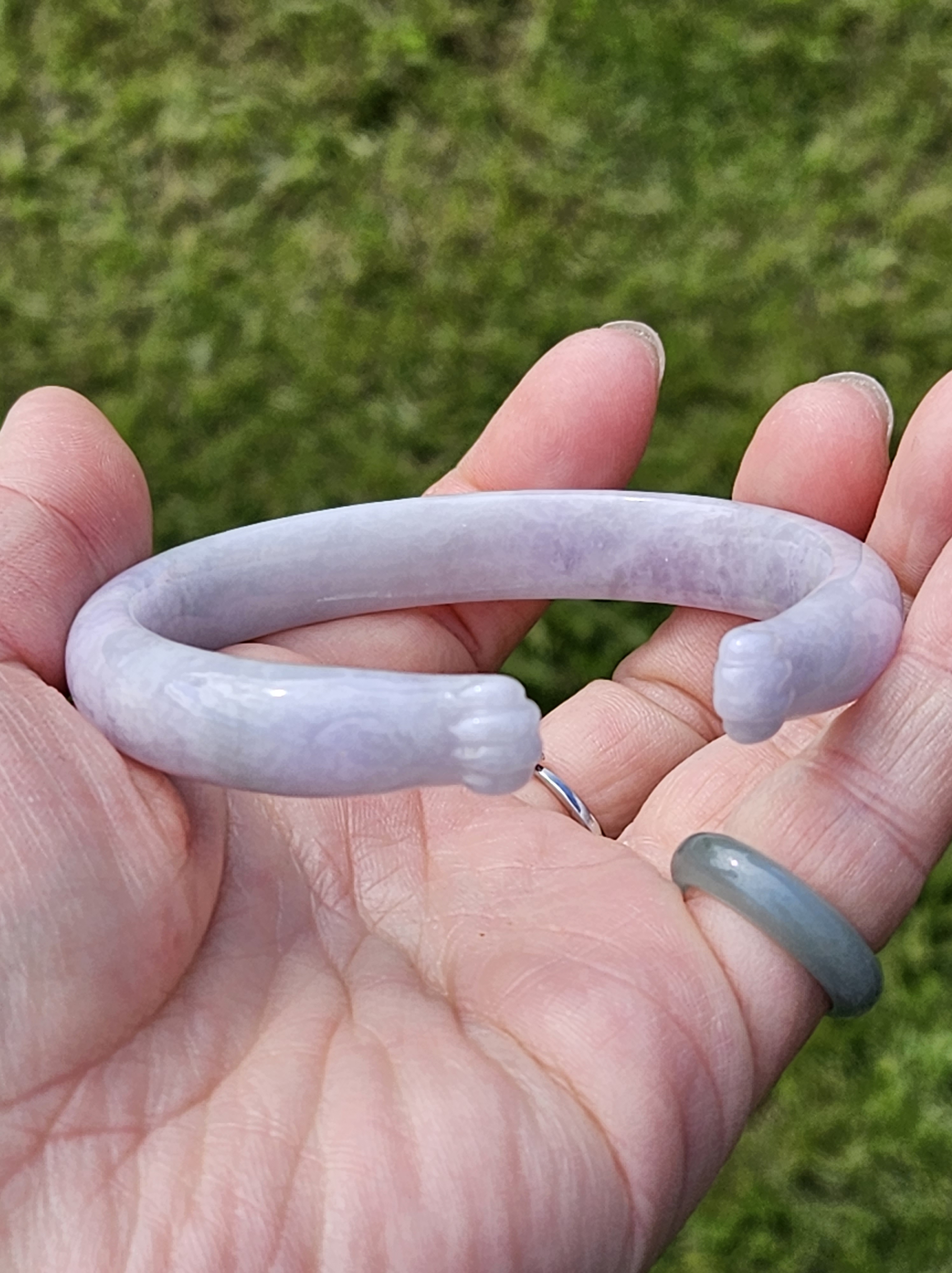 Full light purple jadeite cuff bangle measures 57.5 x 11.2 x 7.7mm, fits up to 59mm, the cuff is carved into the shape of adorable paws. Weighs 35.14g, comes with a certificate of authenticity £428