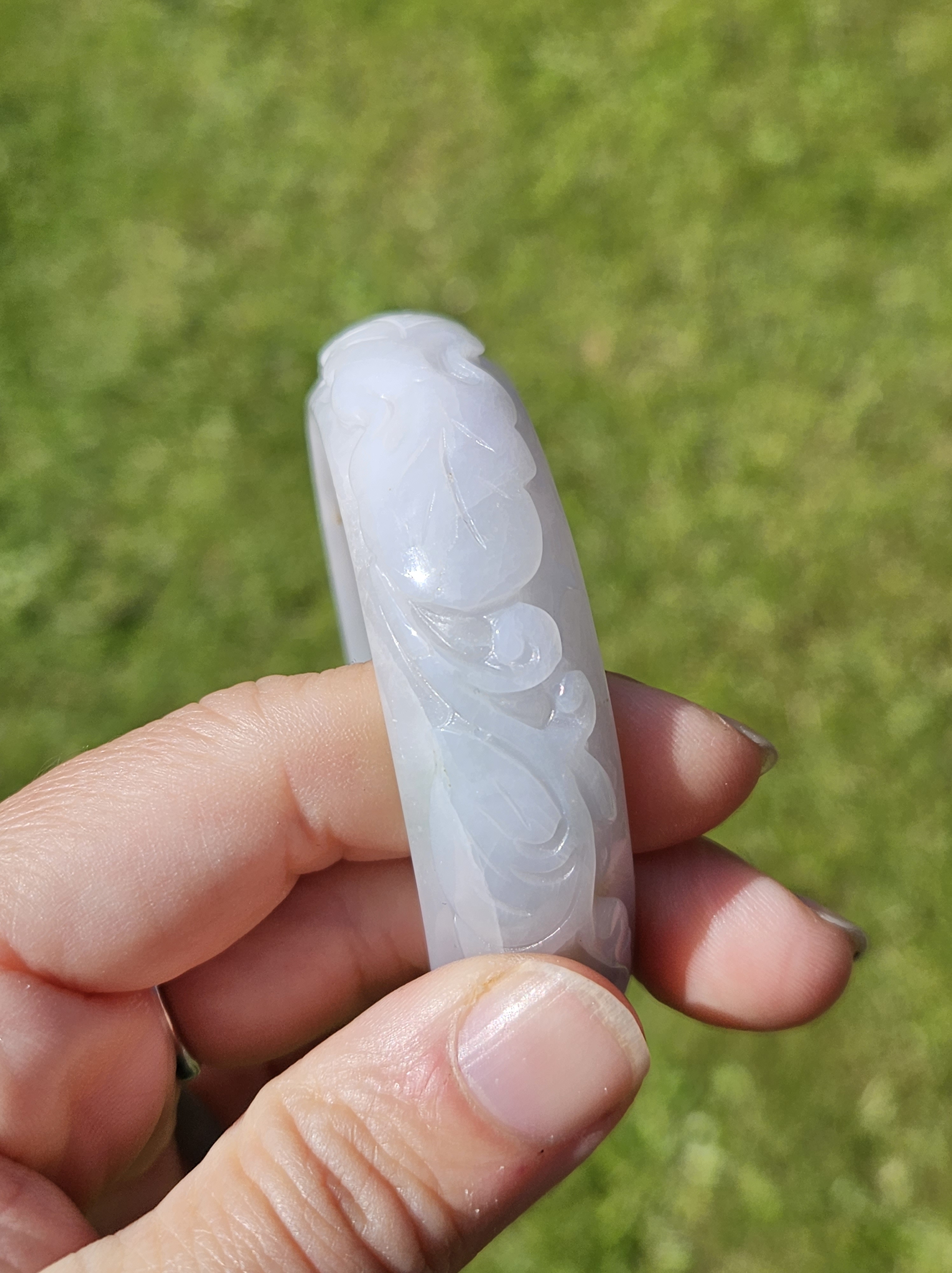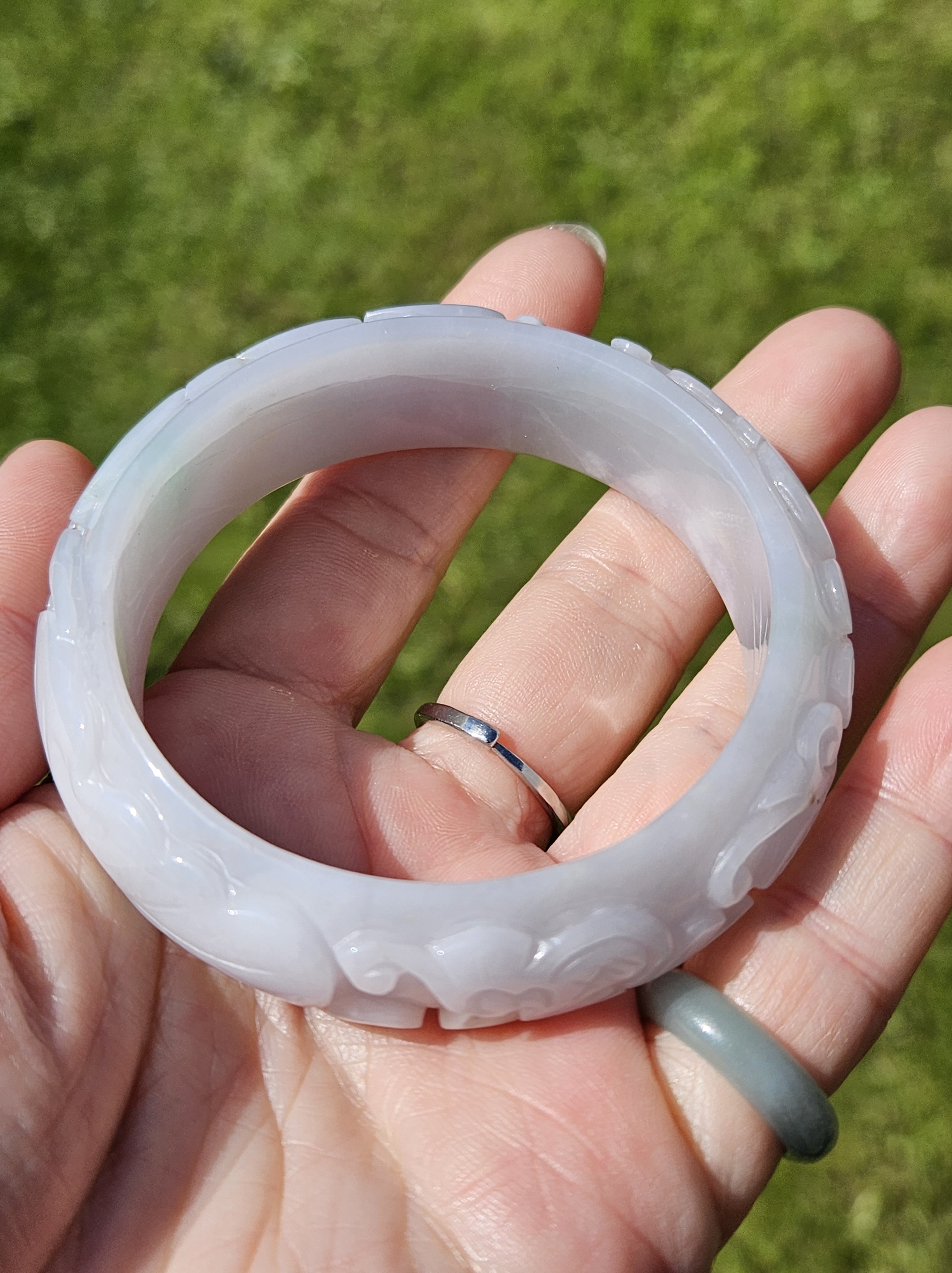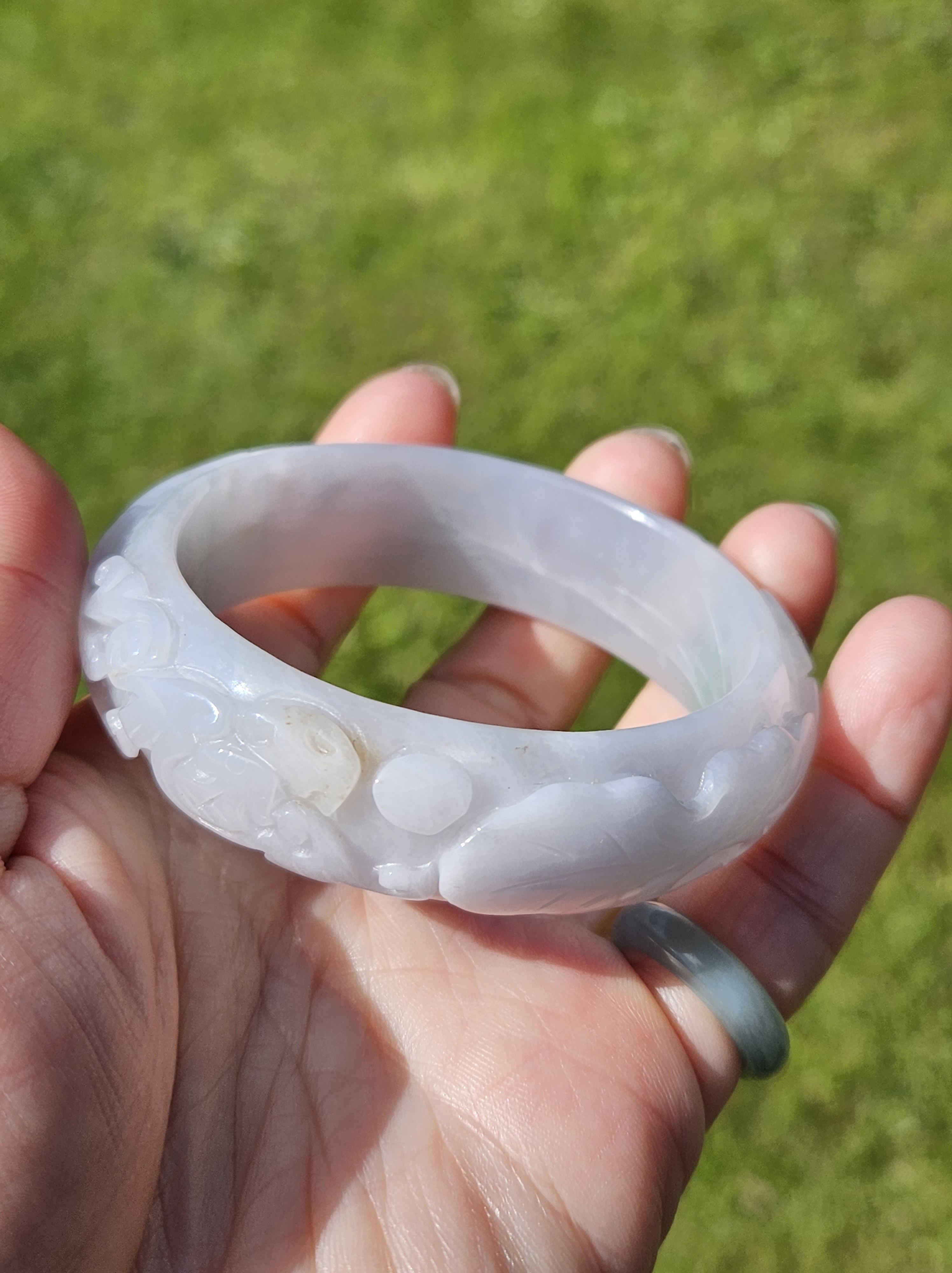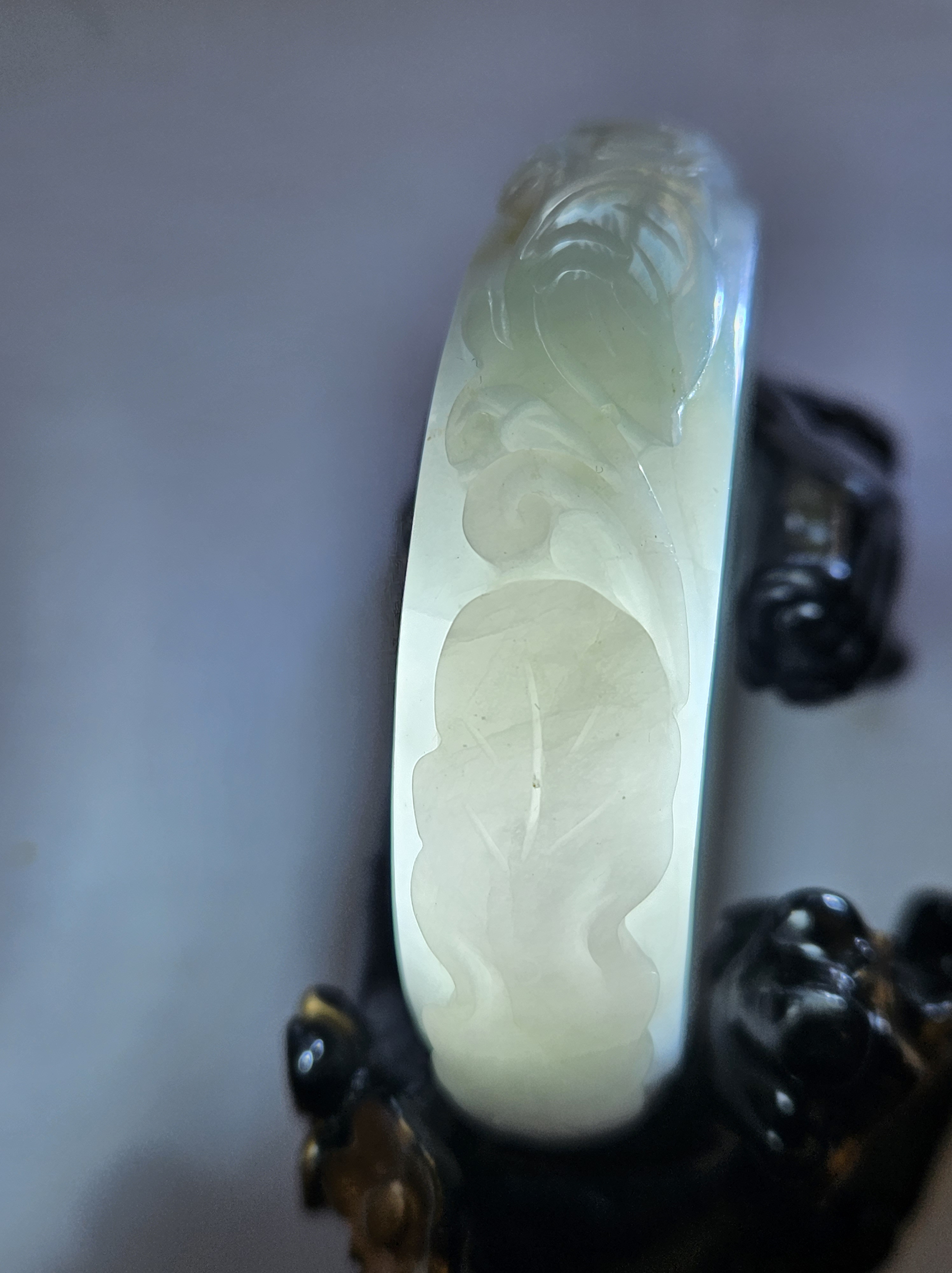 Bangles are usually carved to remove the imperfection, such as cracks or lines. This bangle is carved with ruyi(may everything goes smoothly) and lotuses which rise from the mud without stains, they are often viewed as a symbol of purity. Since they return to the murky water each evening and open their blooms at the break of day, lotus flowers are also symbols of strength, resilience, and rebirth.