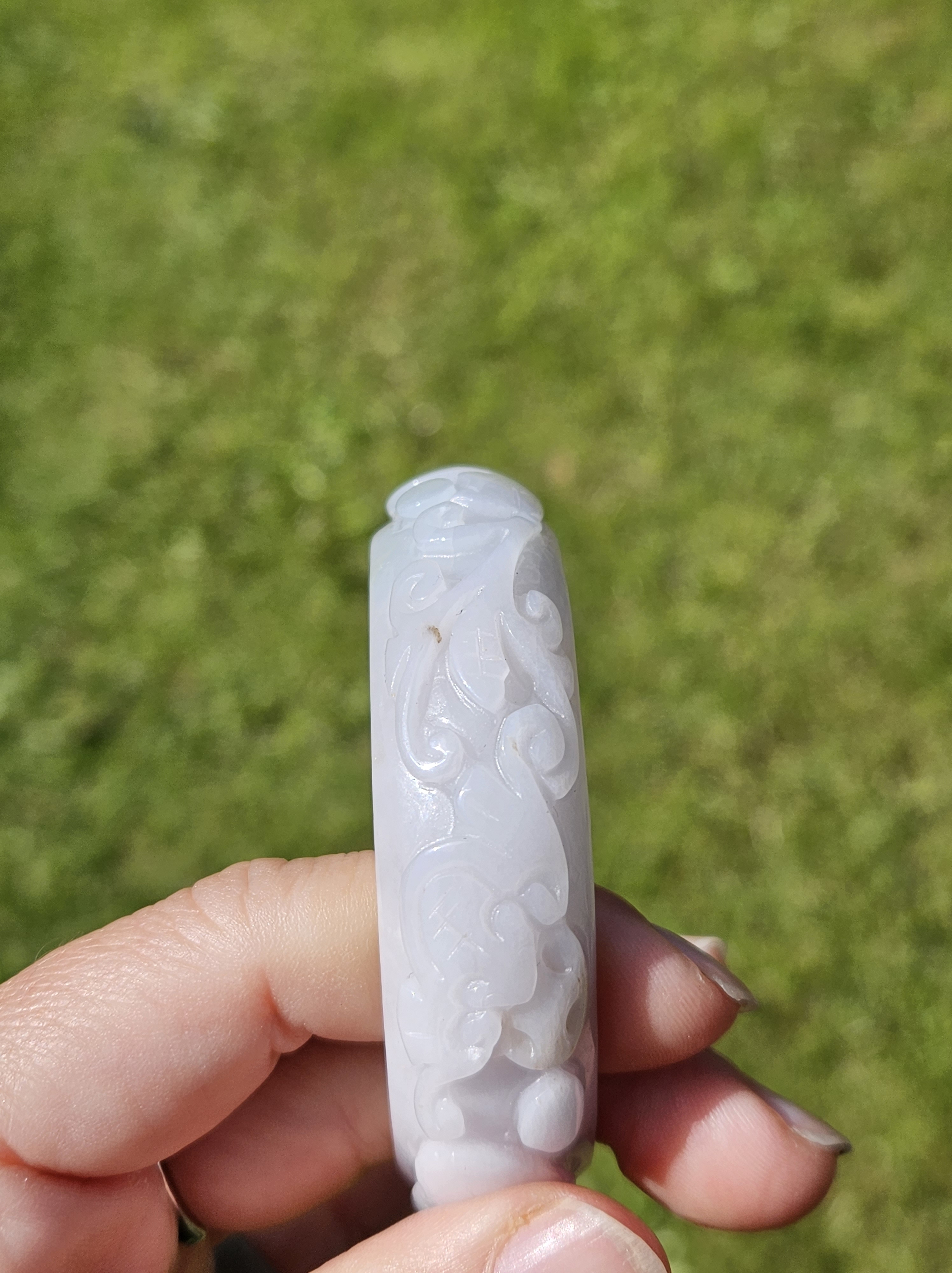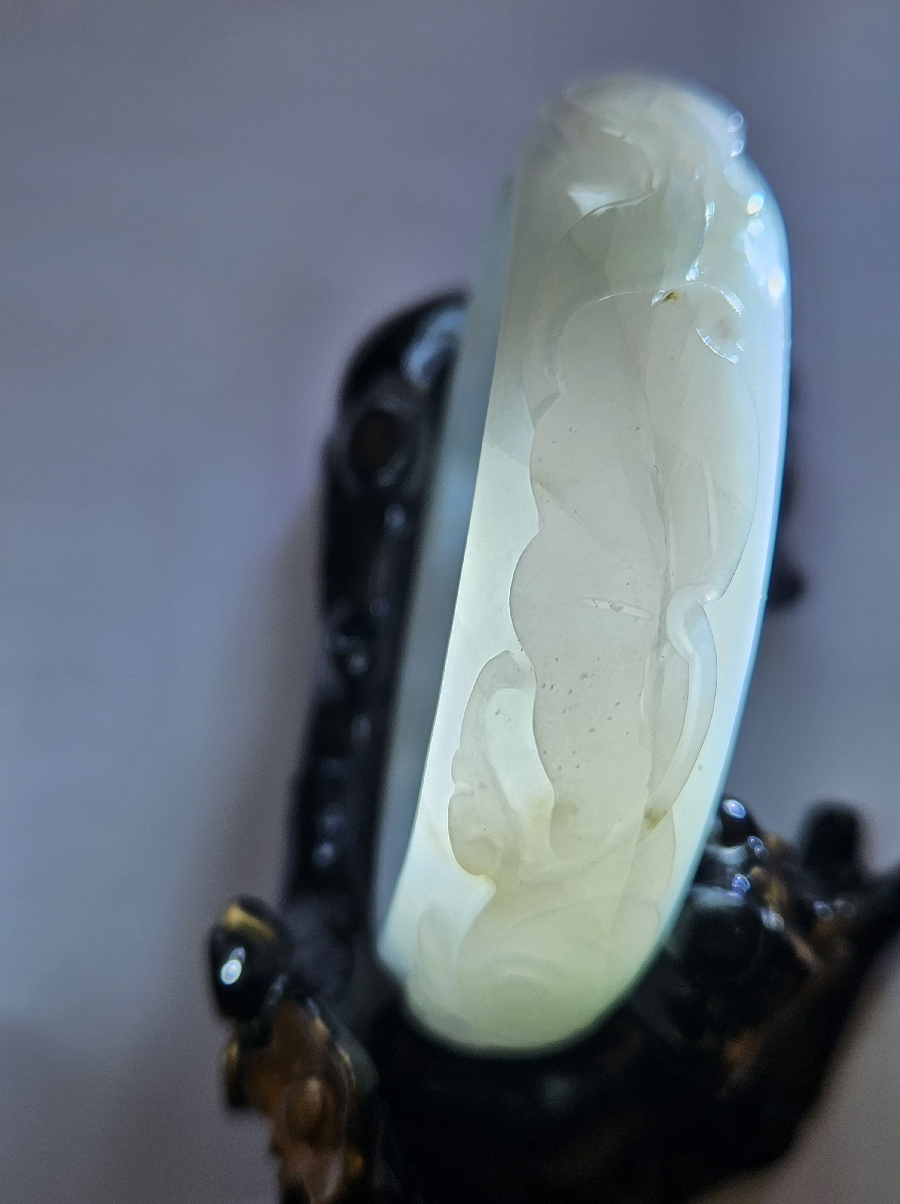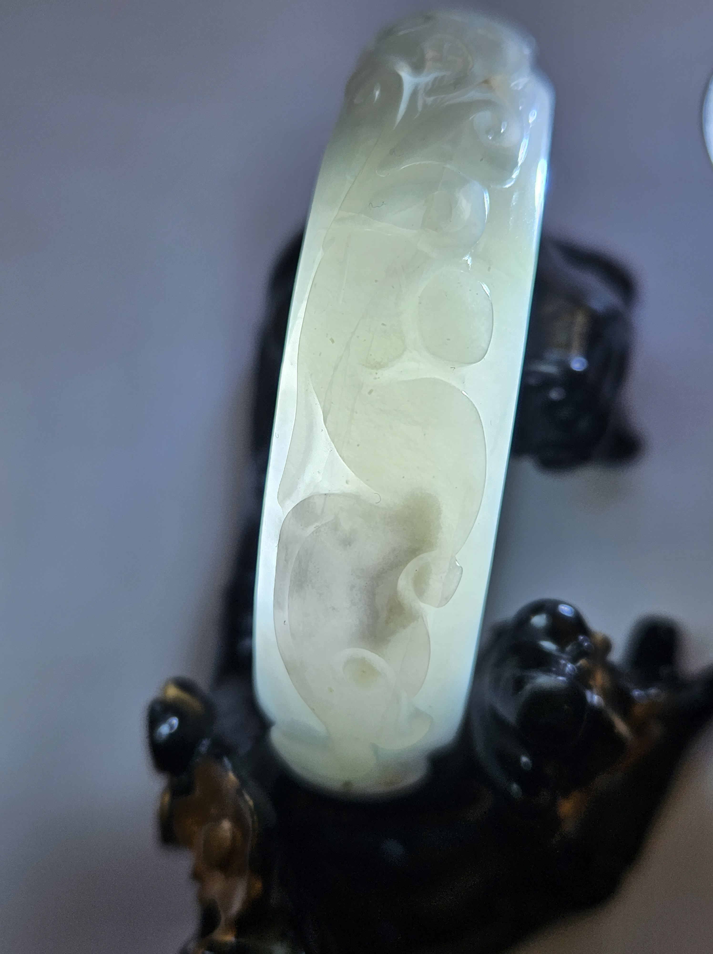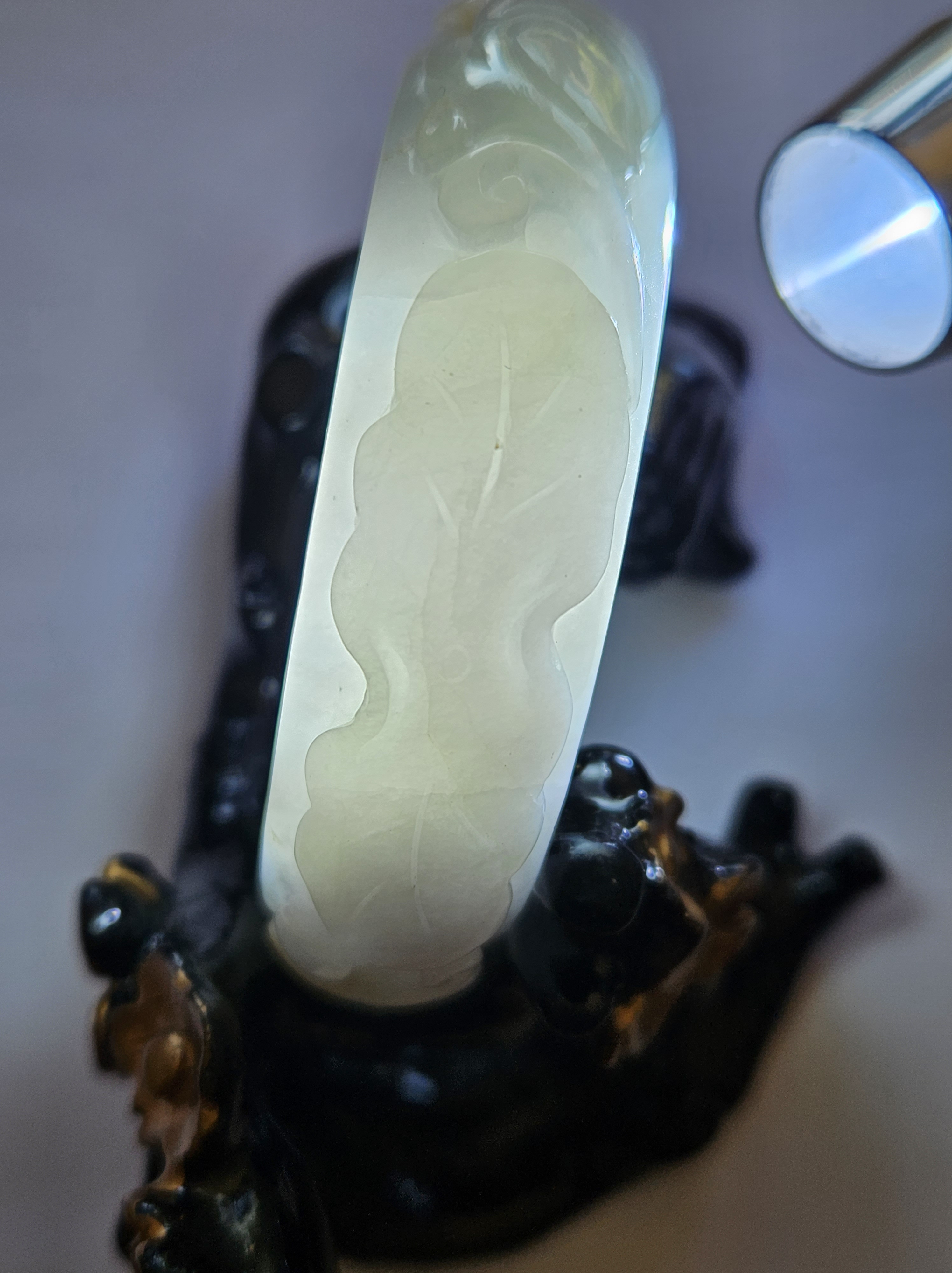 Bangles are usually carved to remove the imperfection, such as cracks or lines. This bangle is carved with ruyi(may everything goes smoothly) and lotuses which rise from the mud without stains, they are often viewed as a symbol of purity. Since they return to the murky water each evening and open their blooms at the break of day, lotus flowers are also symbols of strength, resilience, and rebirth.