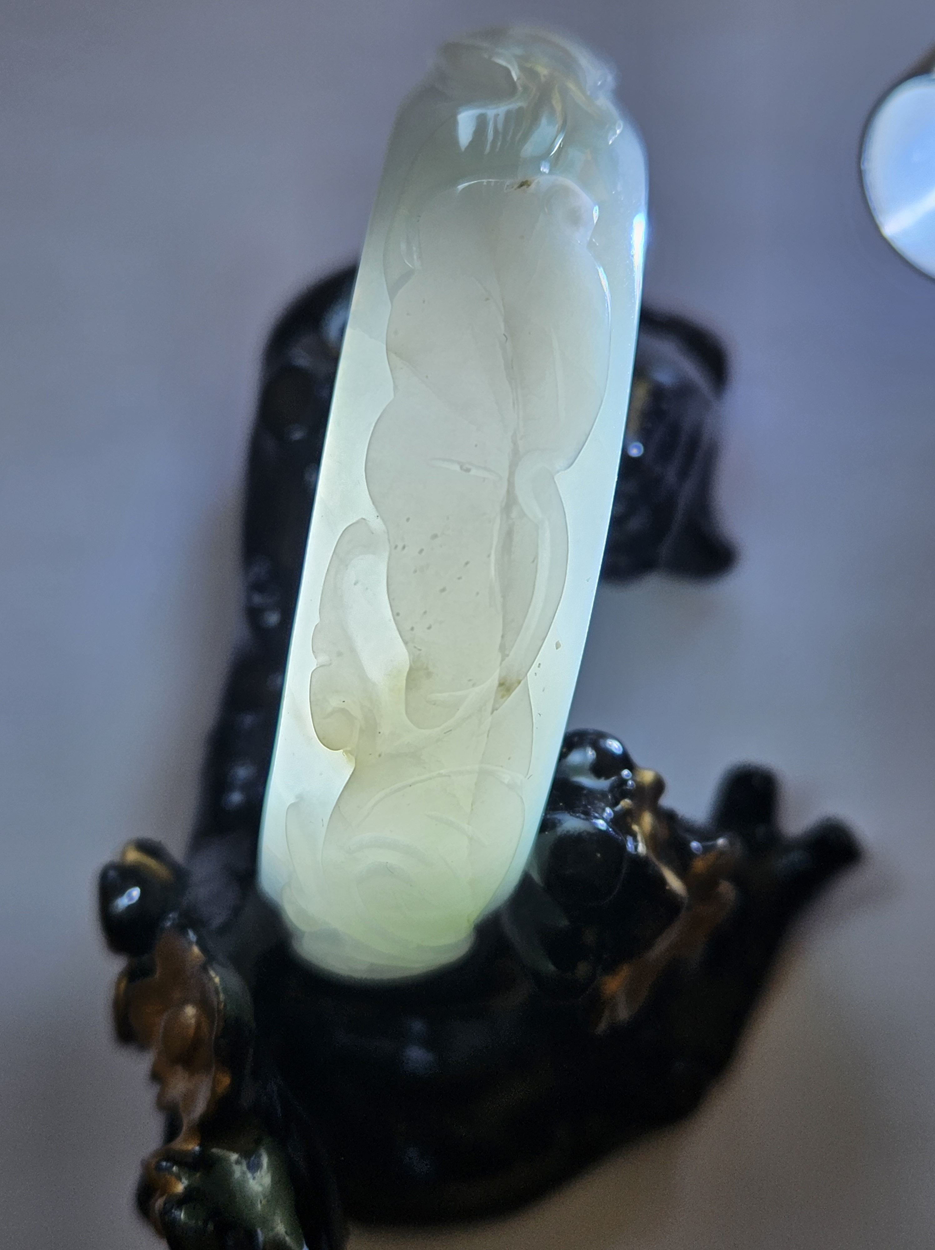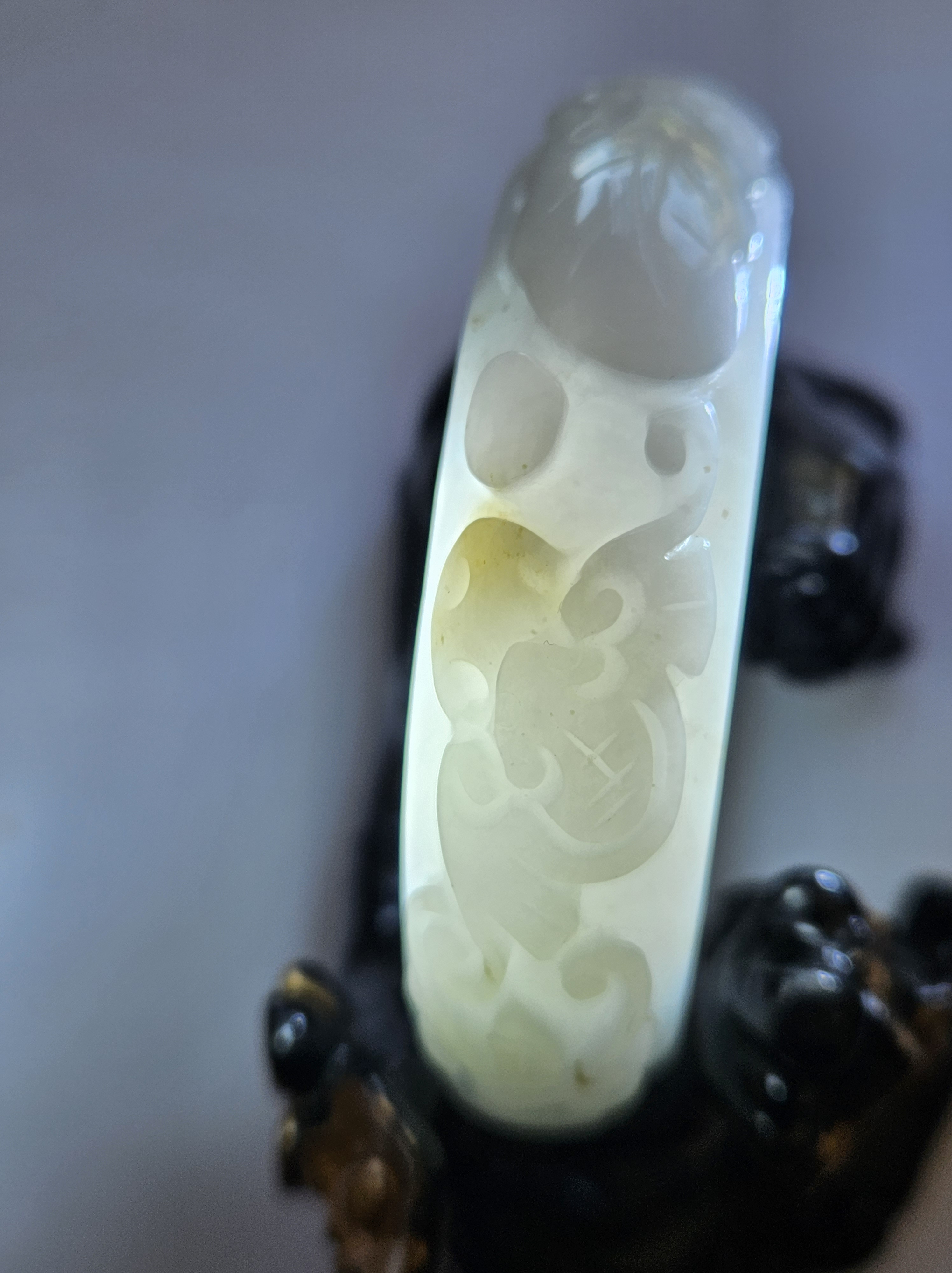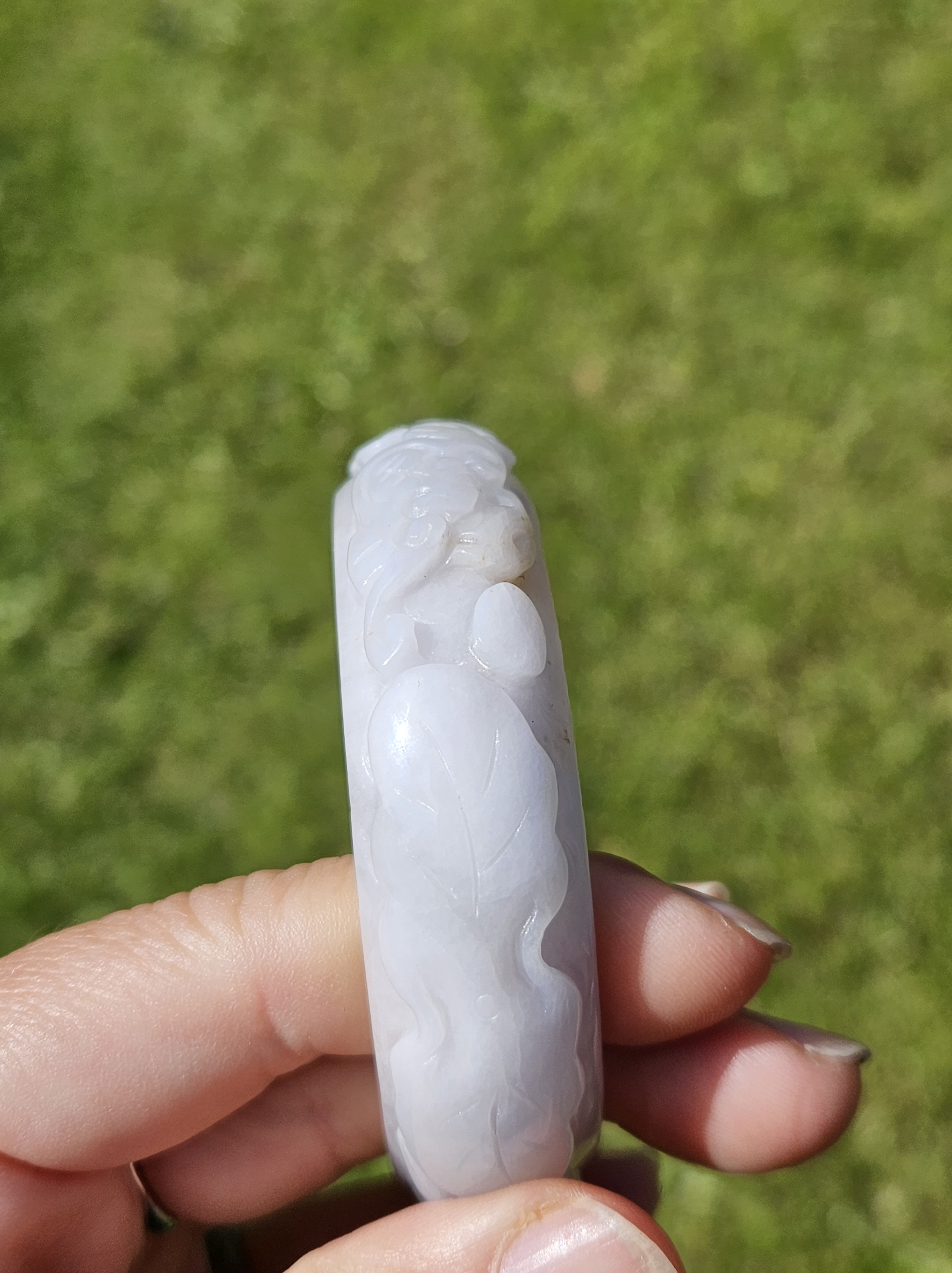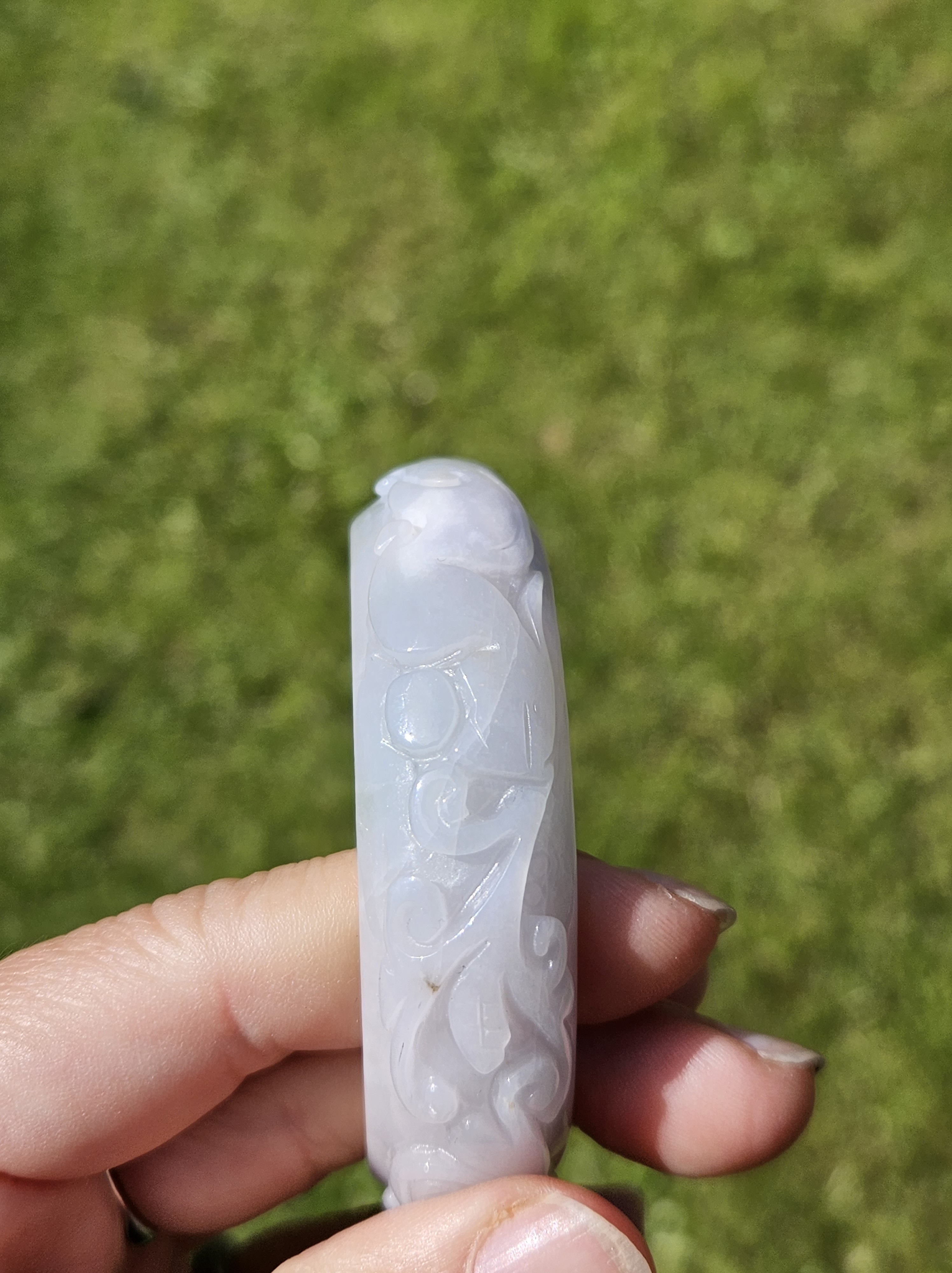 Bangles are usually carved to remove the imperfection, such as cracks or lines. This bangle is carved with ruyi(may everything goes smoothly) and lotuses which rise from the mud without stains, they are often viewed as a symbol of purity. Since they return to the murky water each evening and open their blooms at the break of day, lotus flowers are also symbols of strength, resilience, and rebirth.