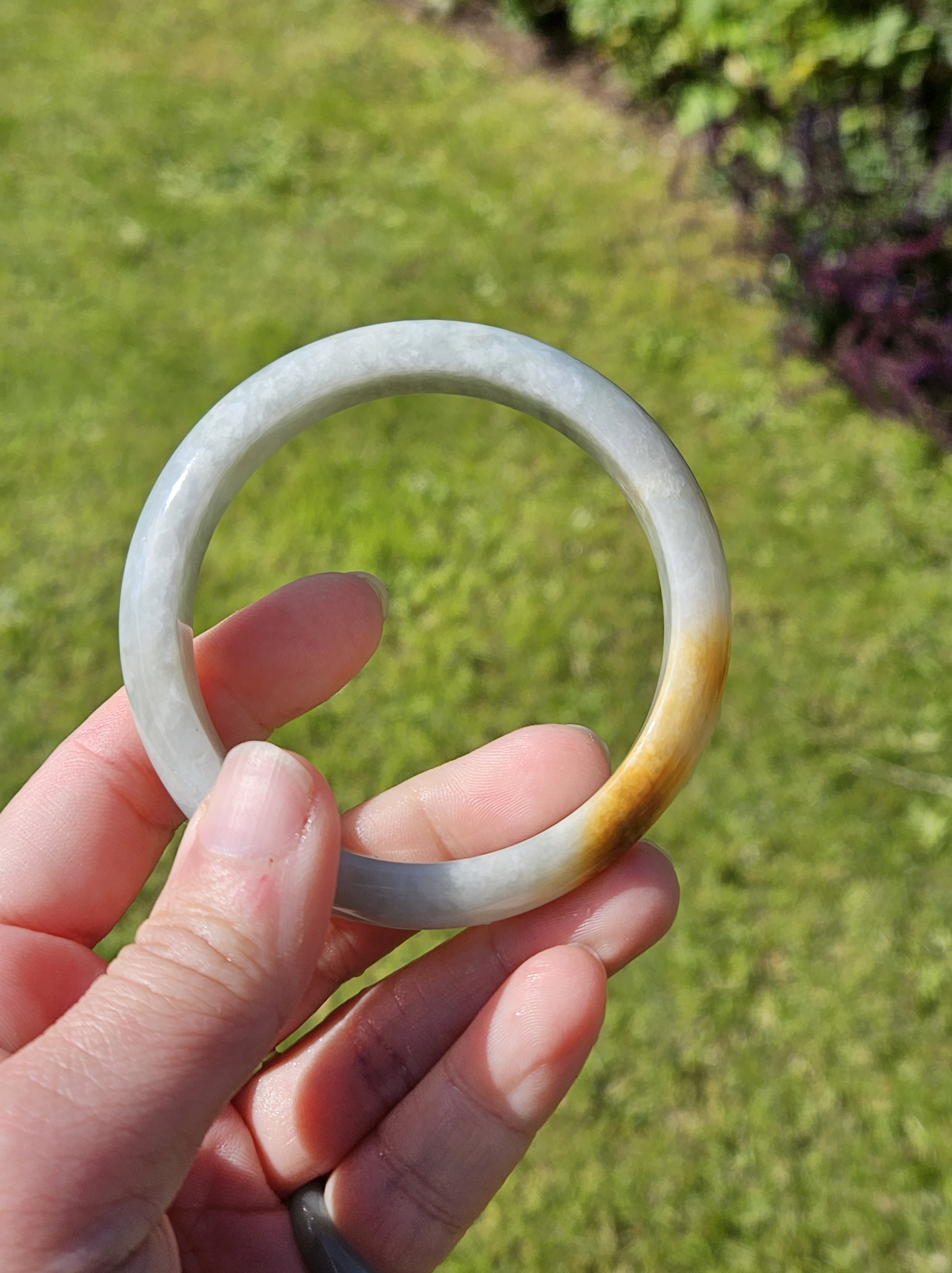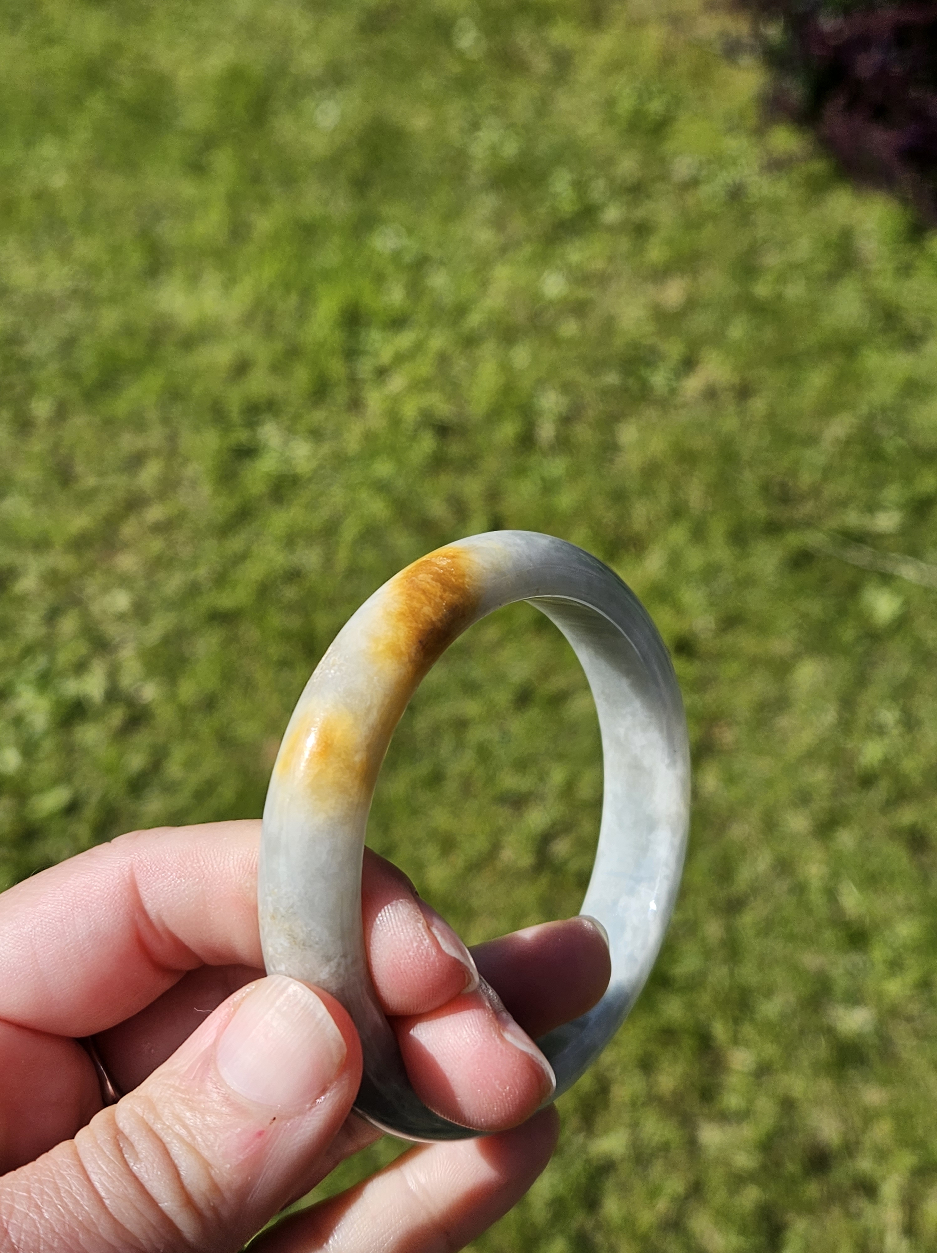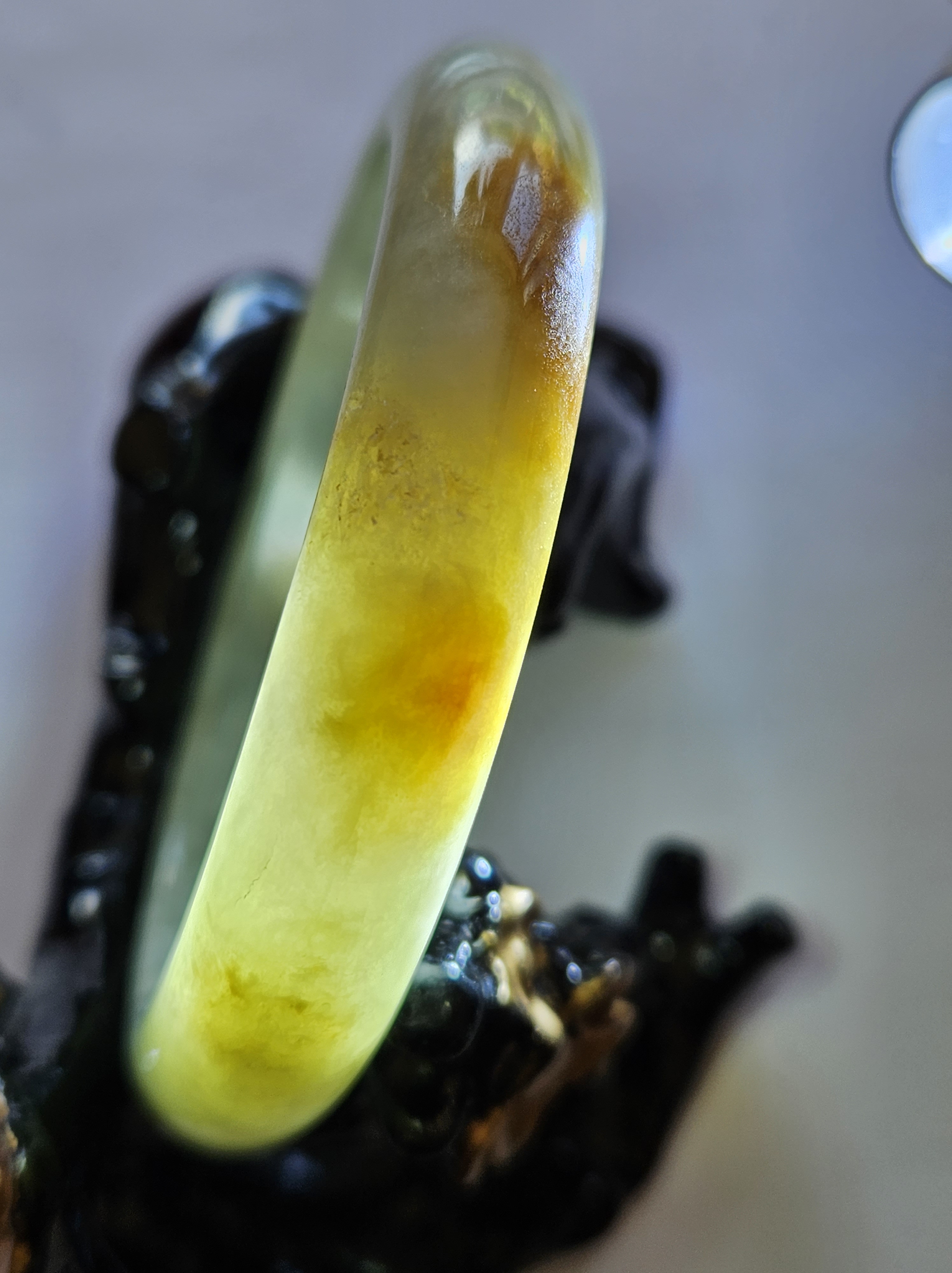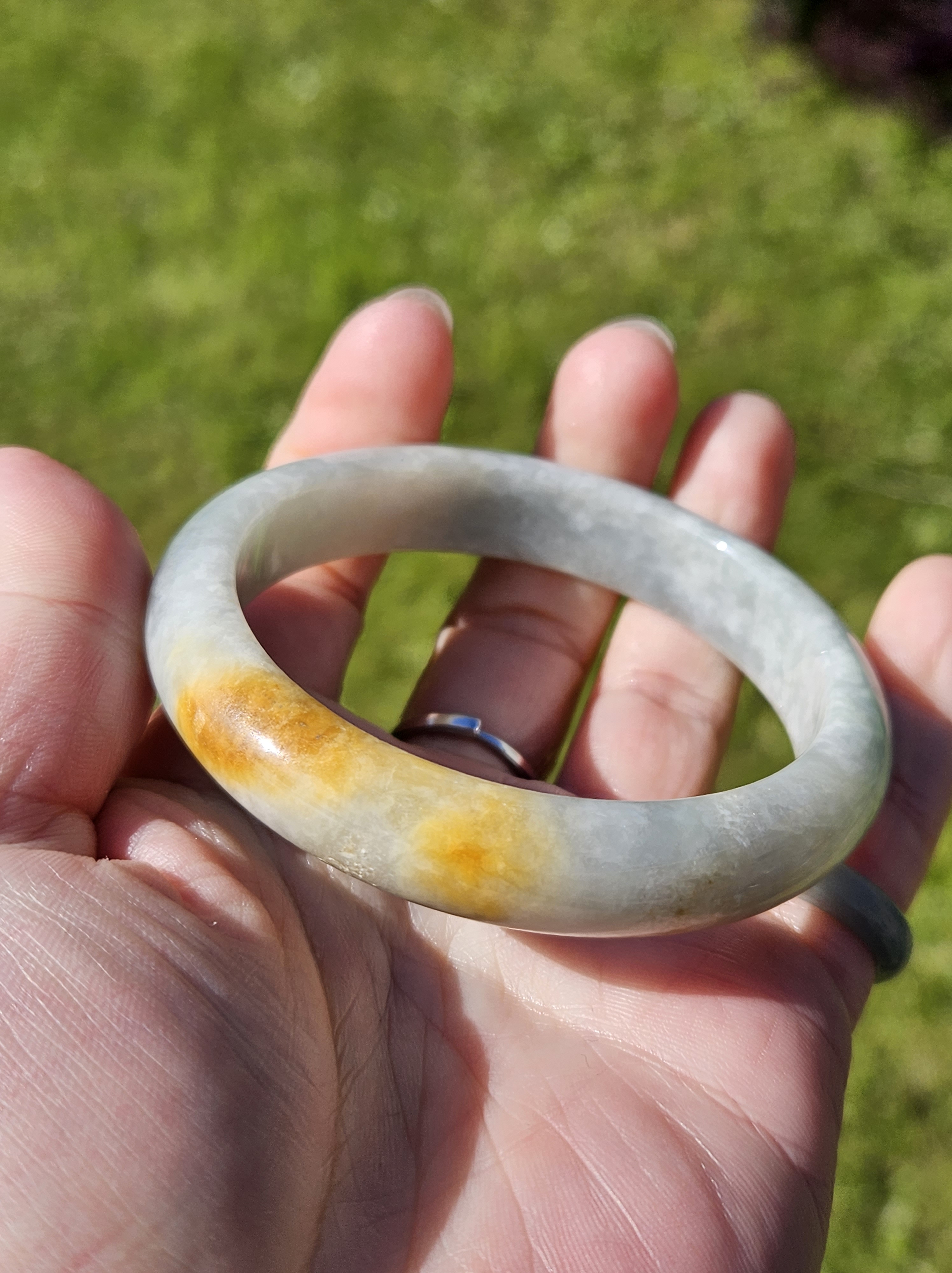 With two patches of vibrant gold and the rest of the bangle is a light green, this lovely Burmese jadeite bangle measures 57.5 x 12.3 x 8.2mm, weighs 52.19g. Comes with a certificate of authenticity £108