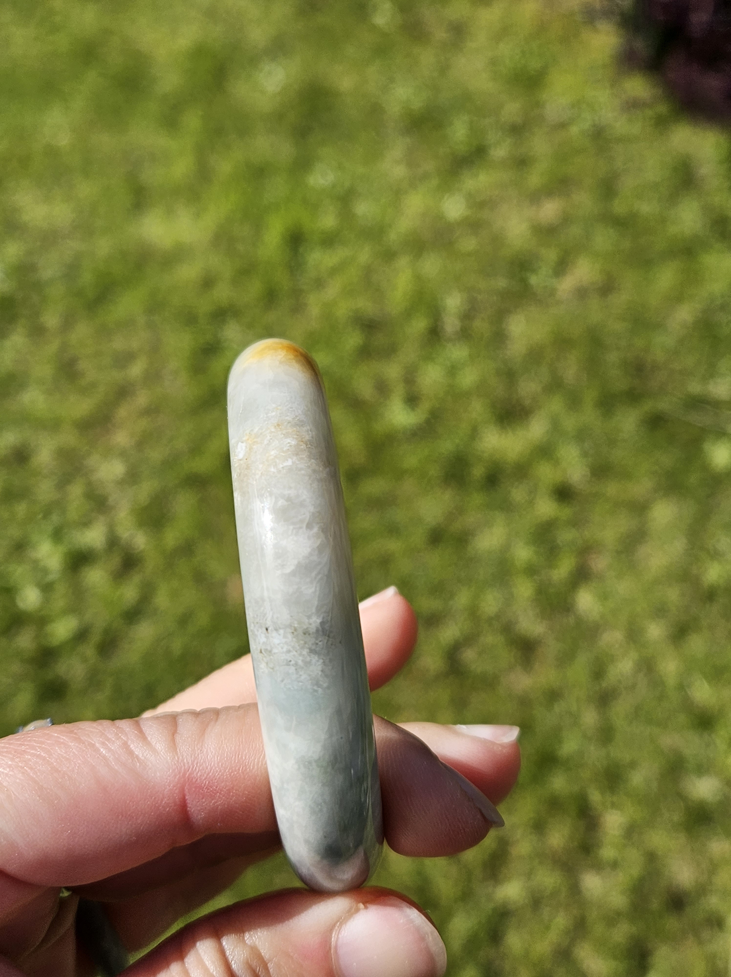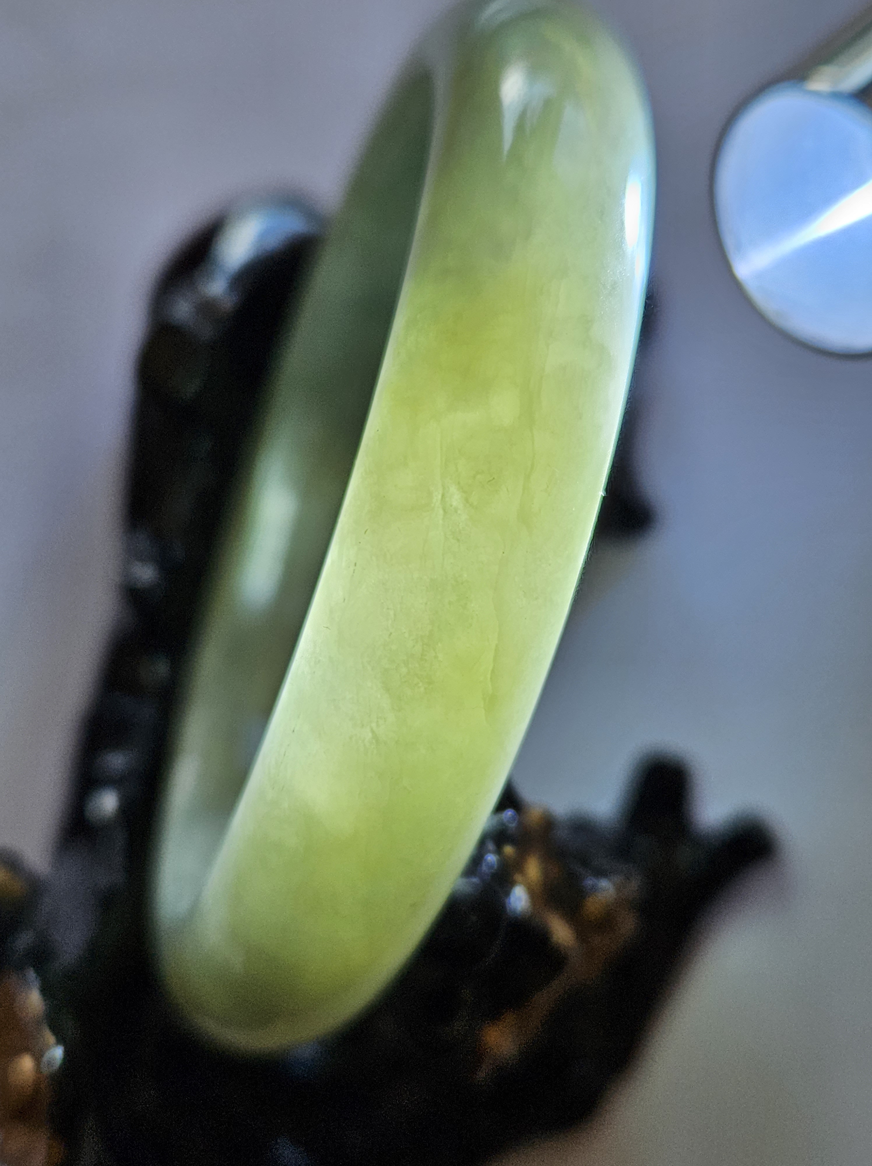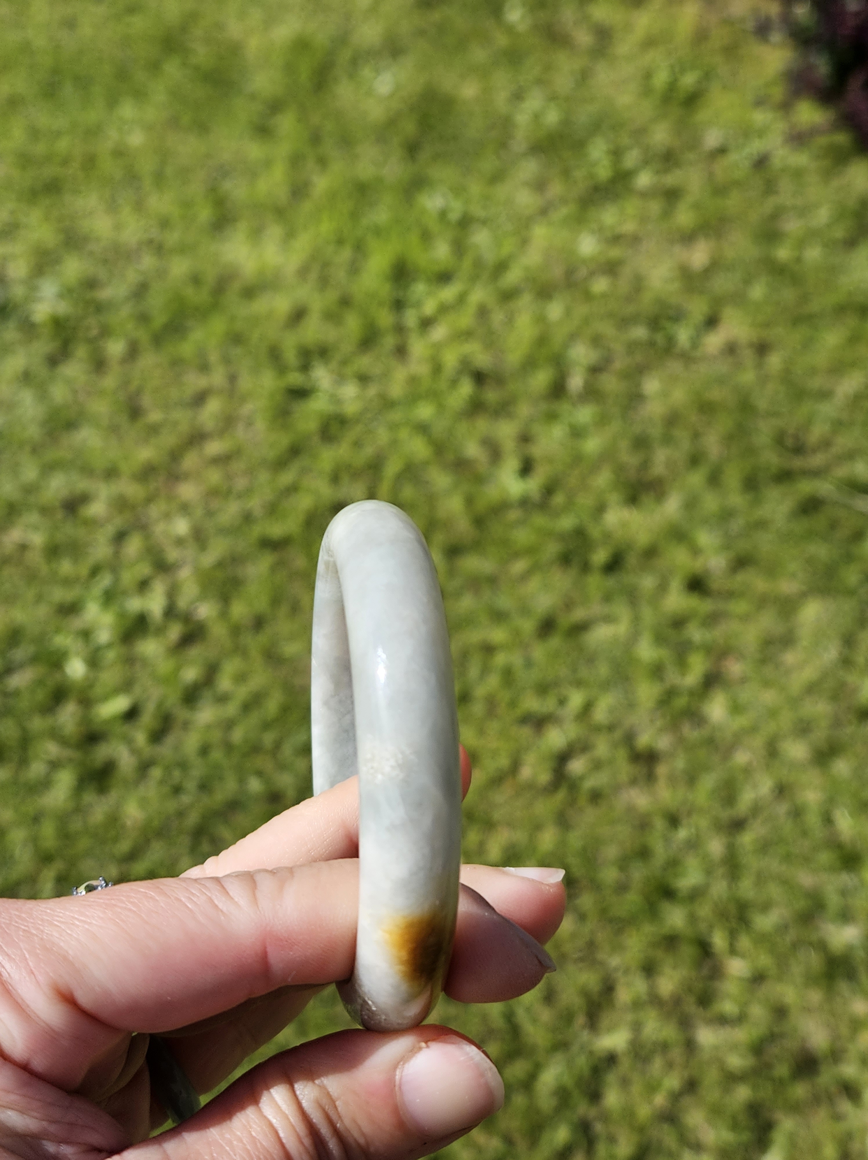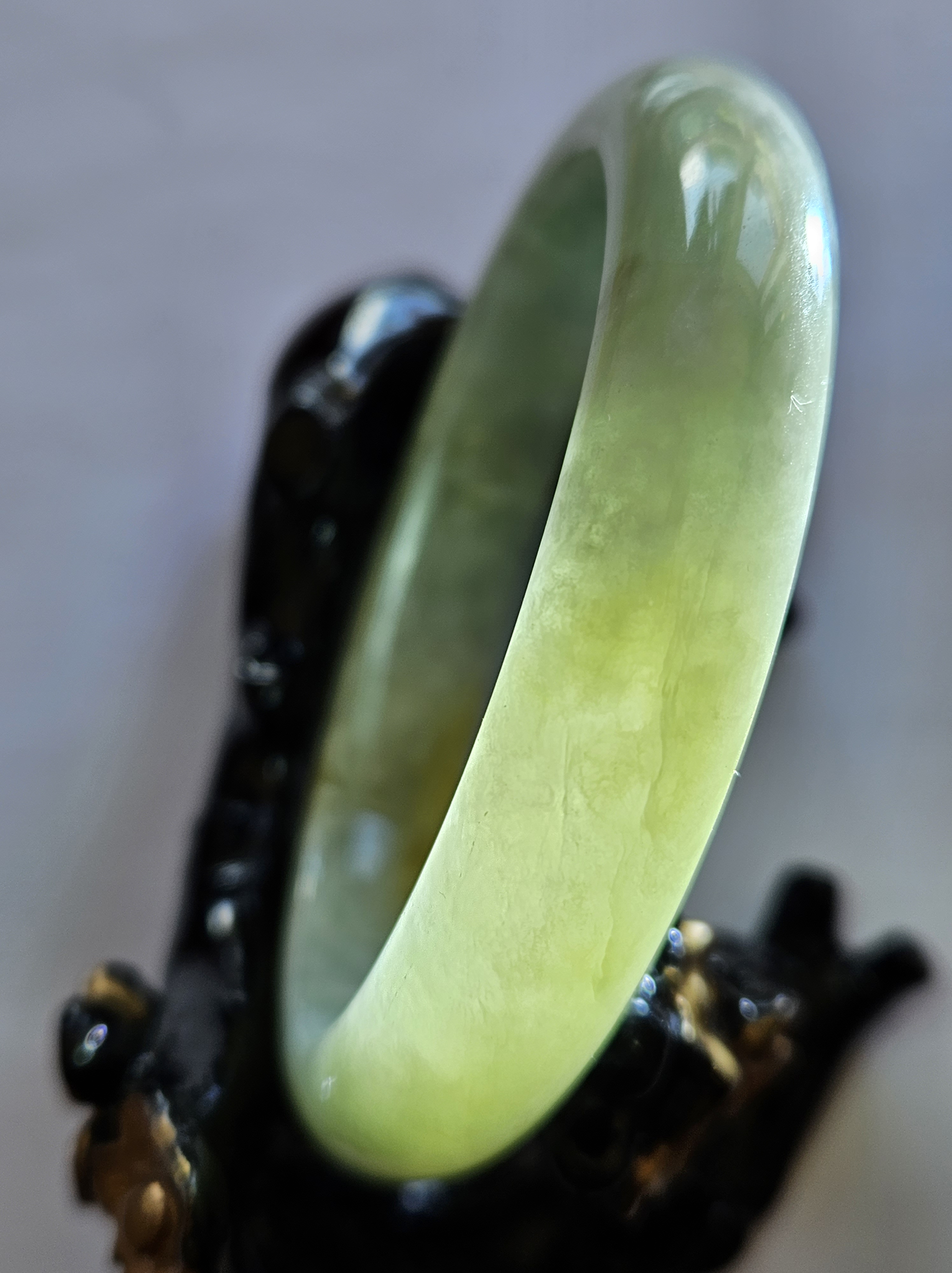 With two patches of vibrant gold and the rest of the bangle is a light green, this lovely Burmese jadeite bangle measures 57.5 x 12.3 x 8.2mm, weighs 52.19g. Comes with a certificate of authenticity £108