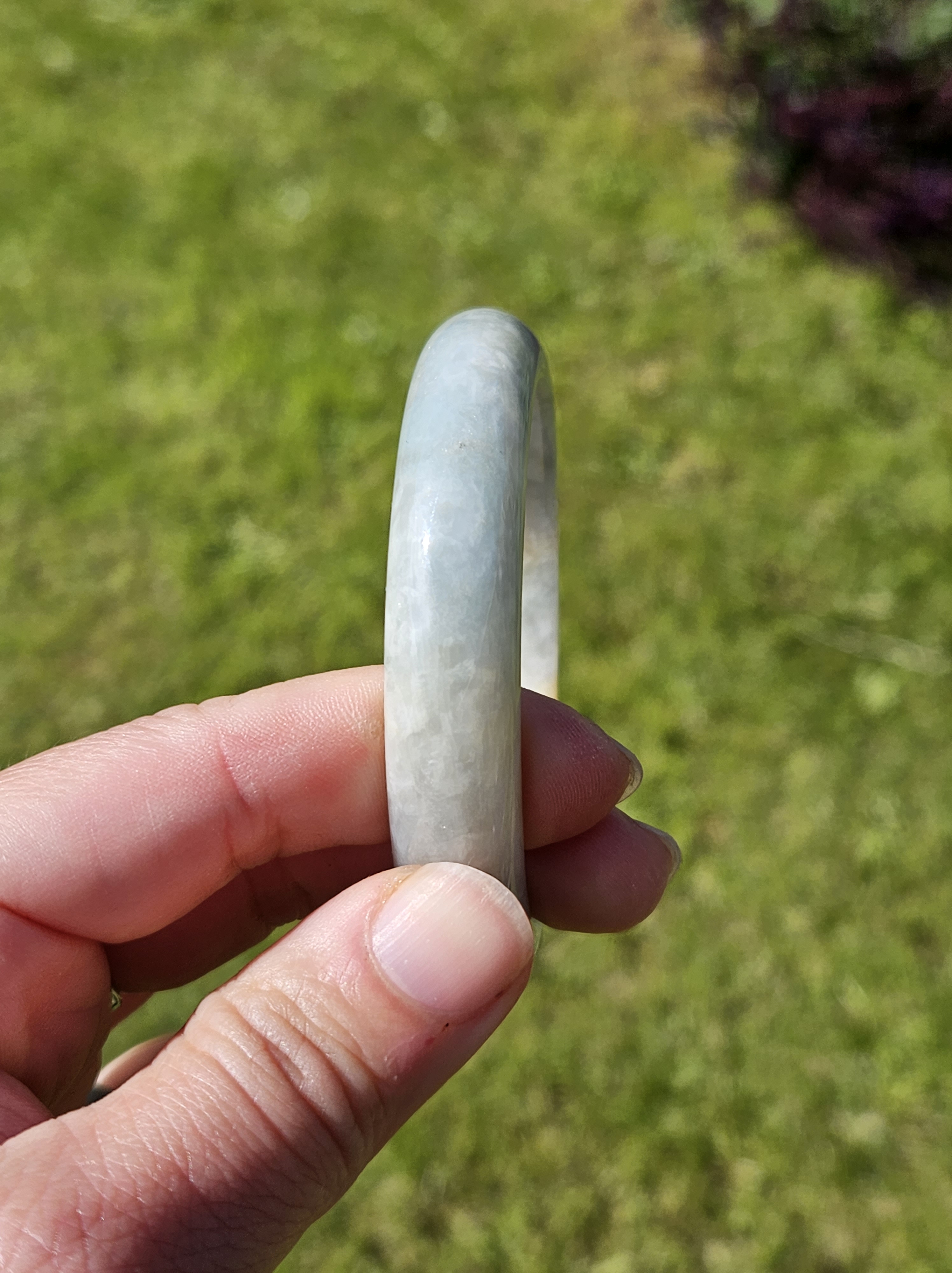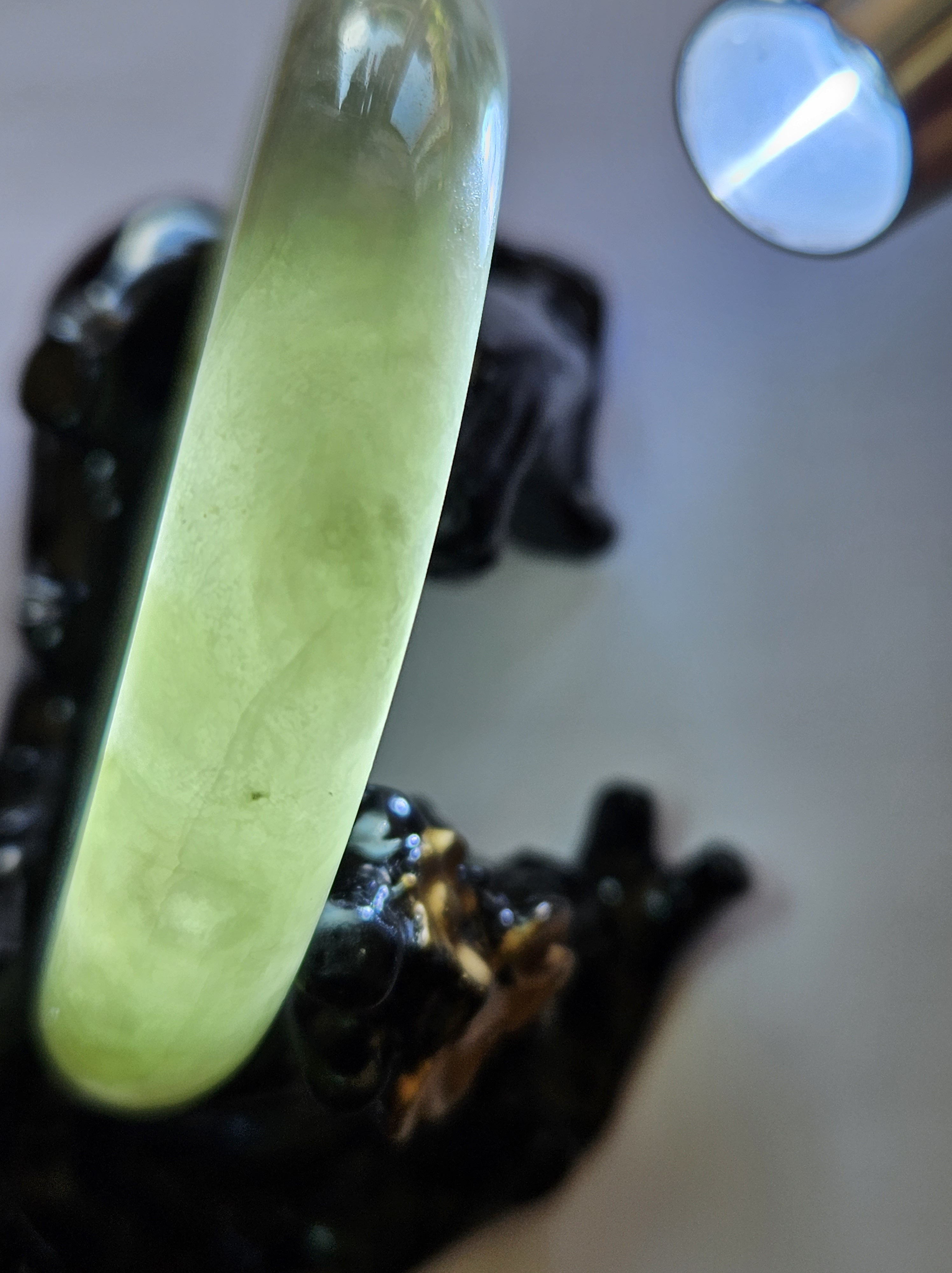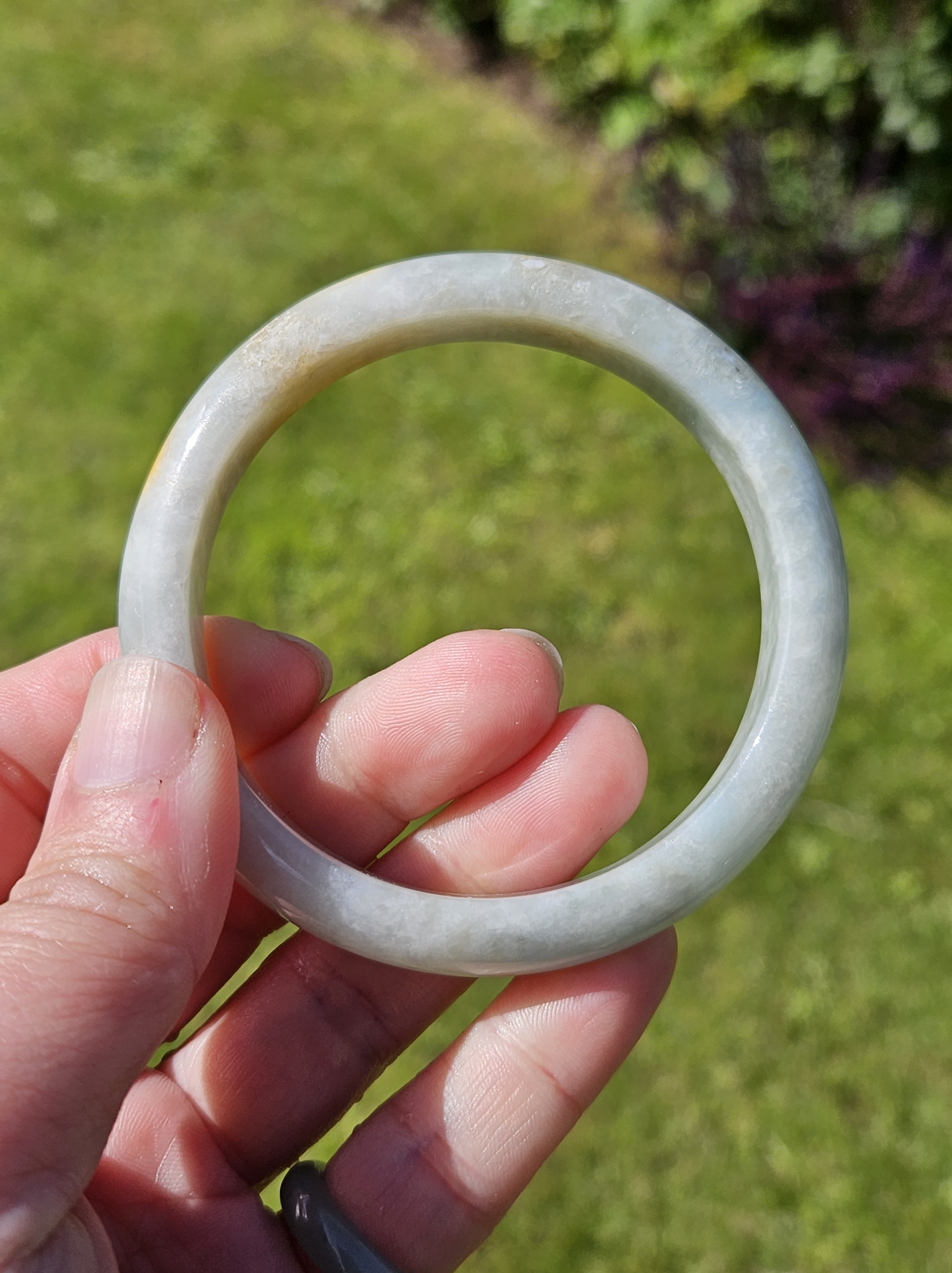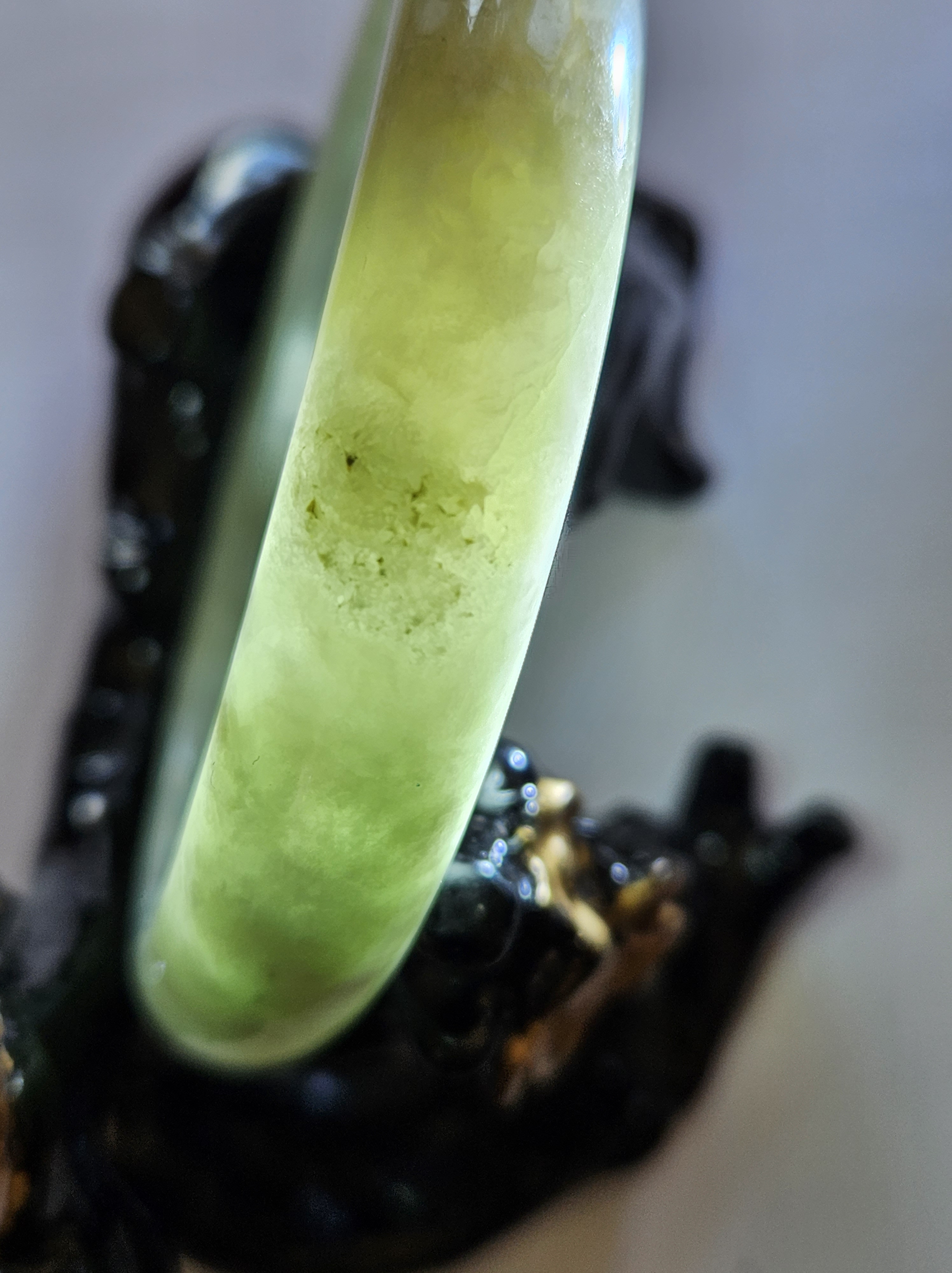 With two patches of vibrant gold and the rest of the bangle is a light green, this lovely Burmese jadeite bangle measures 57.5 x 12.3 x 8.2mm, weighs 52.19g. Comes with a certificate of authenticity £108