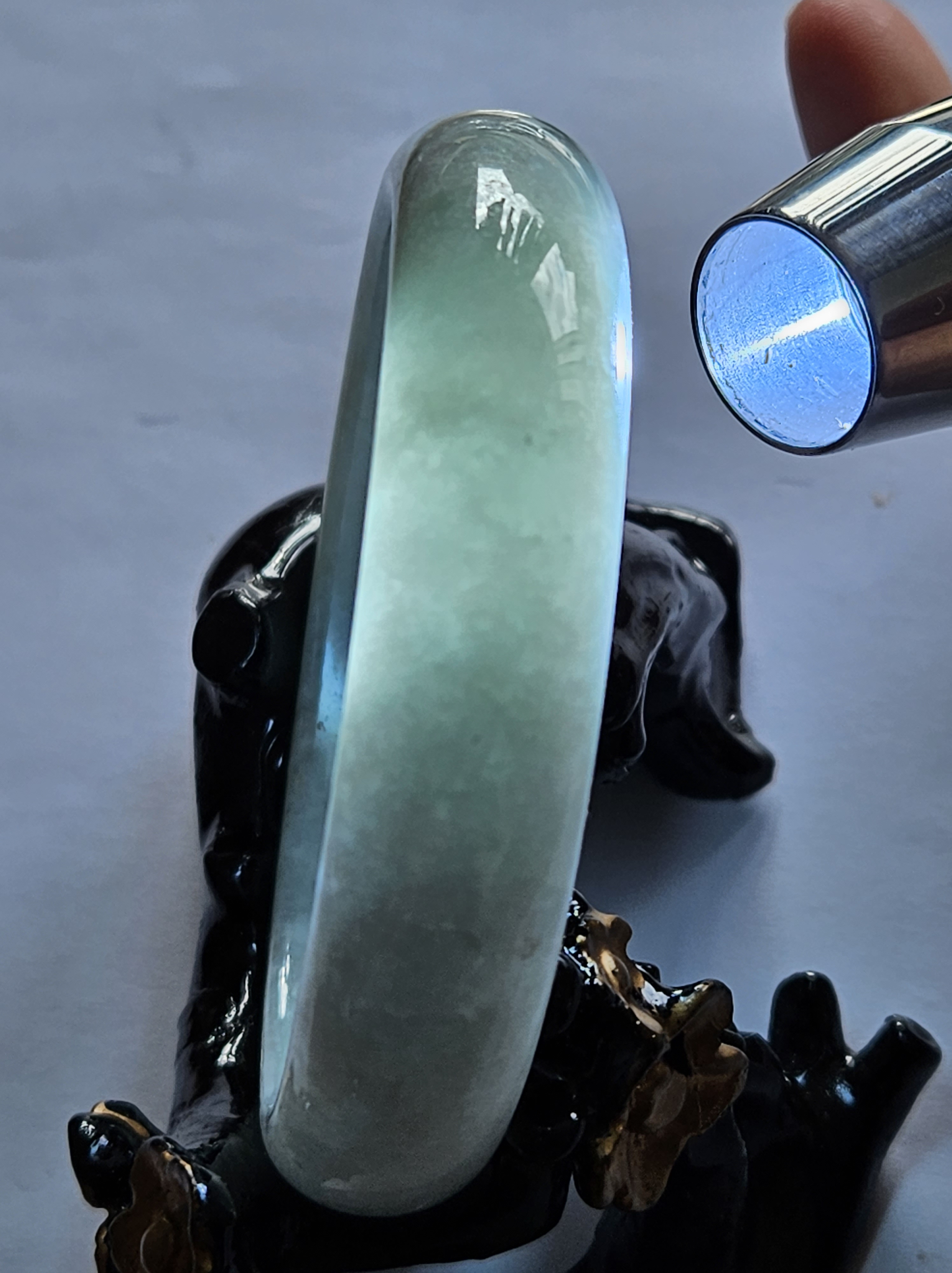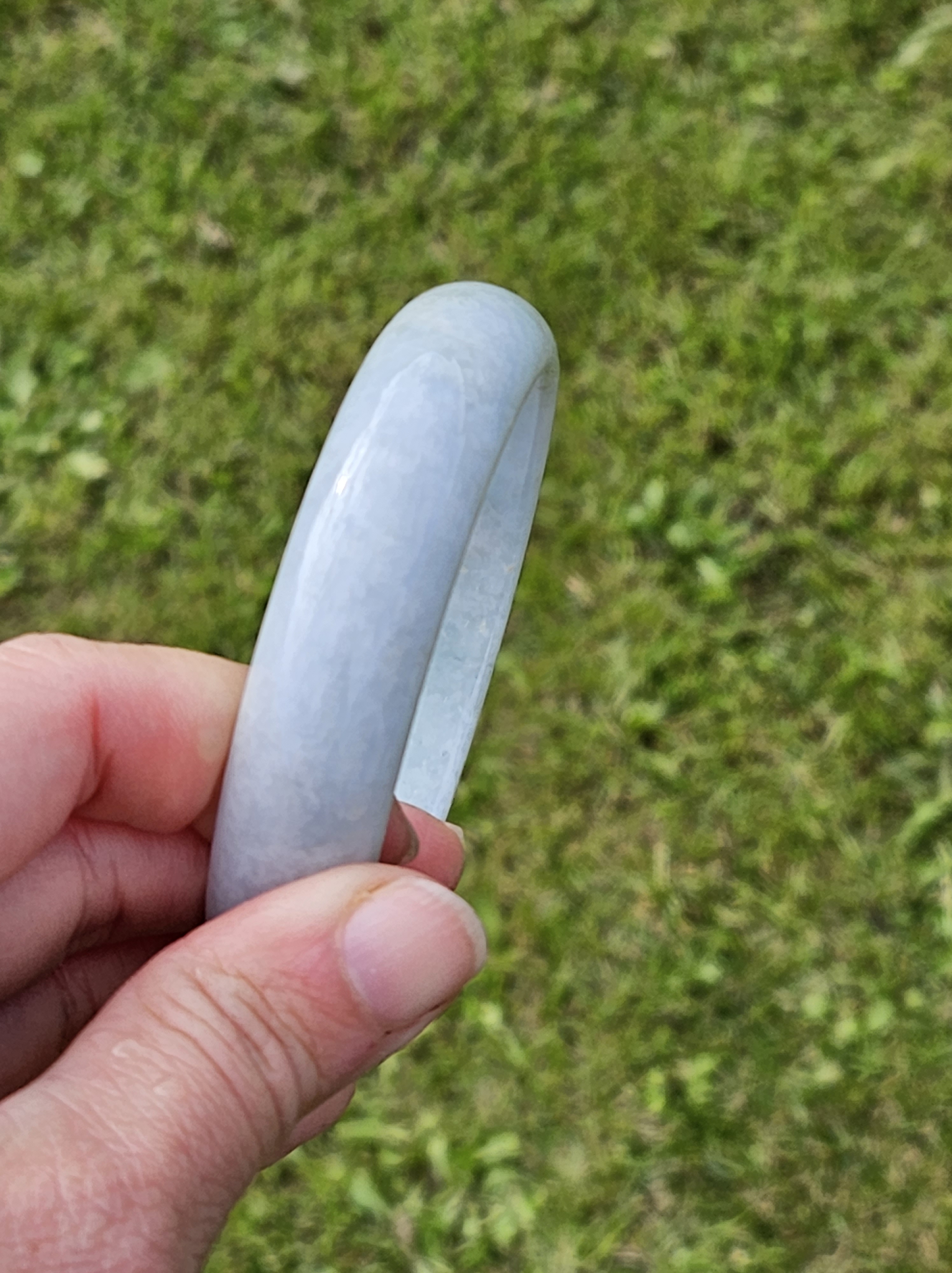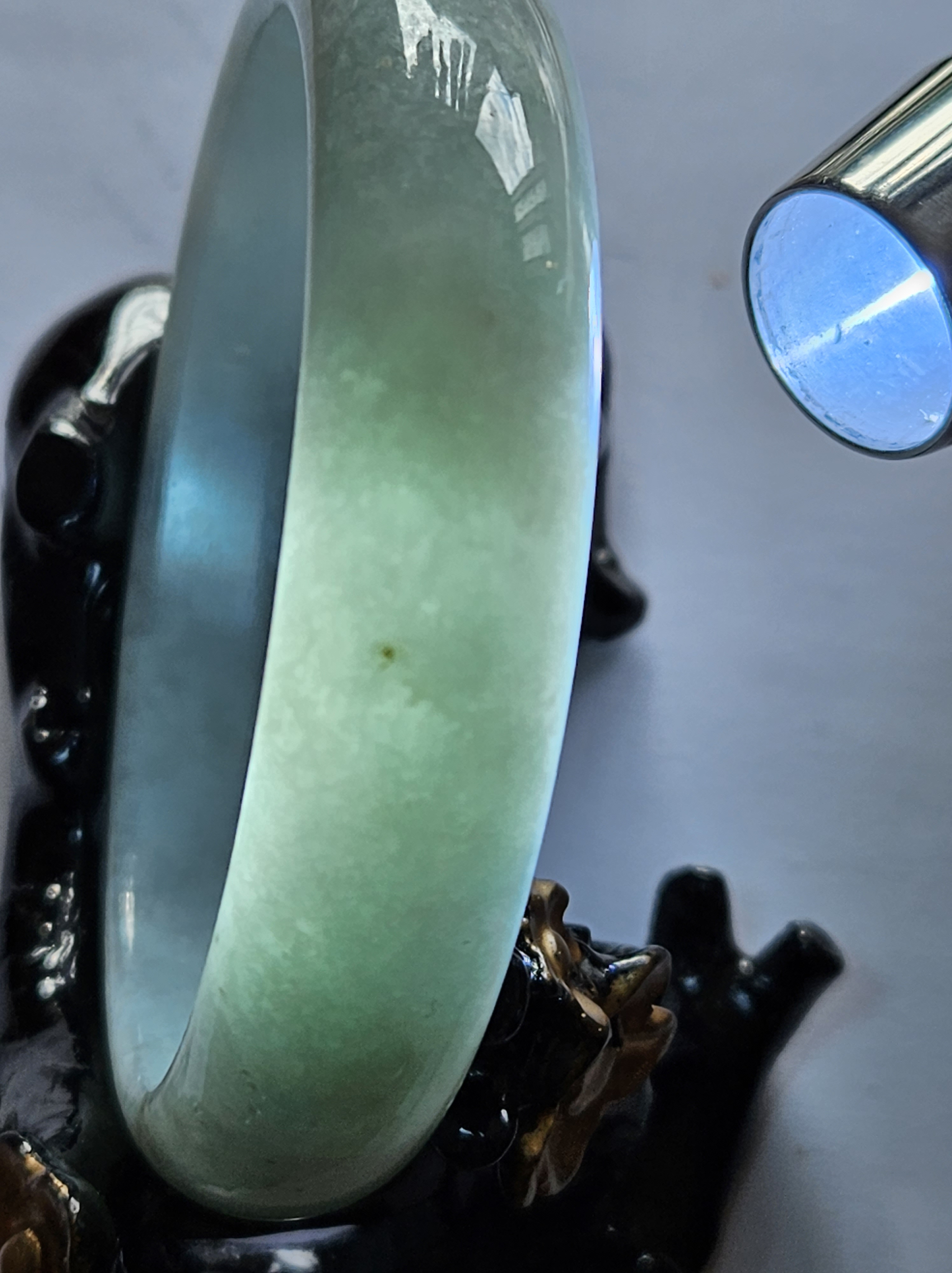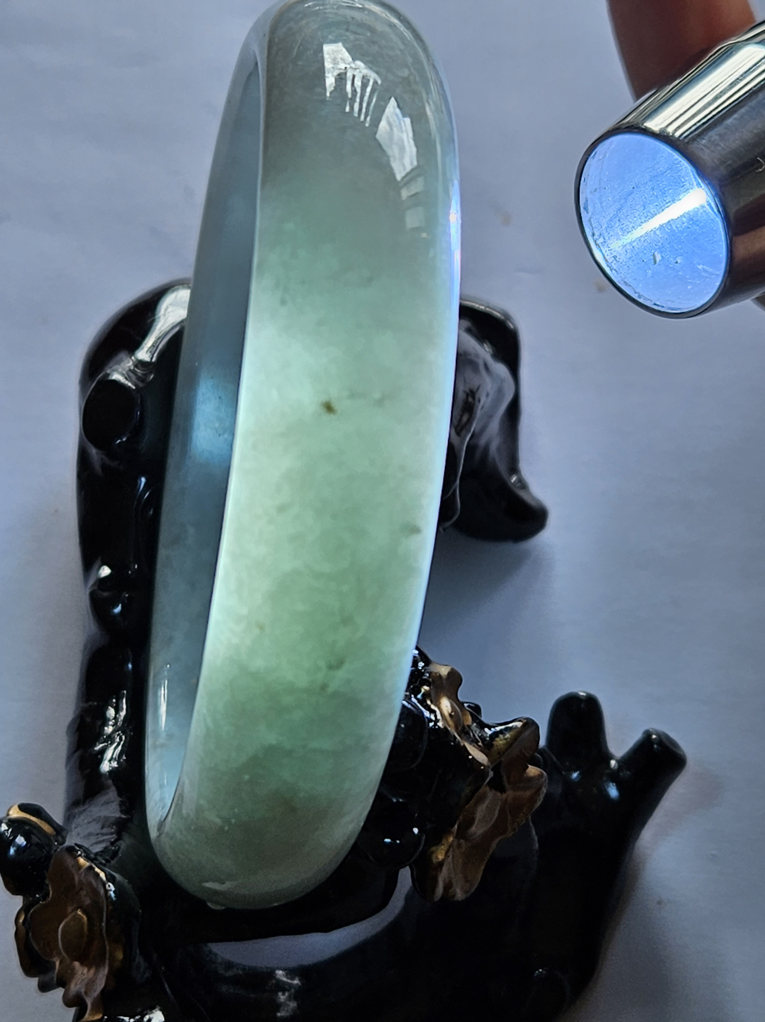 Not often available at this size, lovely light green colour Burmese jadeite bangle with yellow sesame seeds. Measures 64.4 x 15.4 x 8.2mm, weighs 70.90g, comes with a certificate of authenticity £298