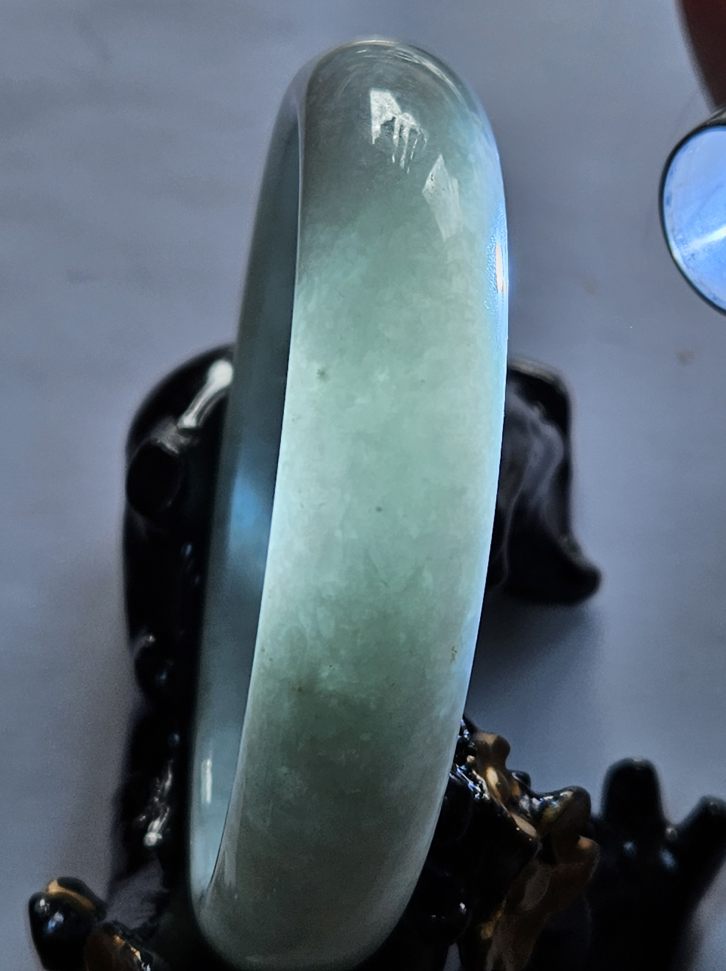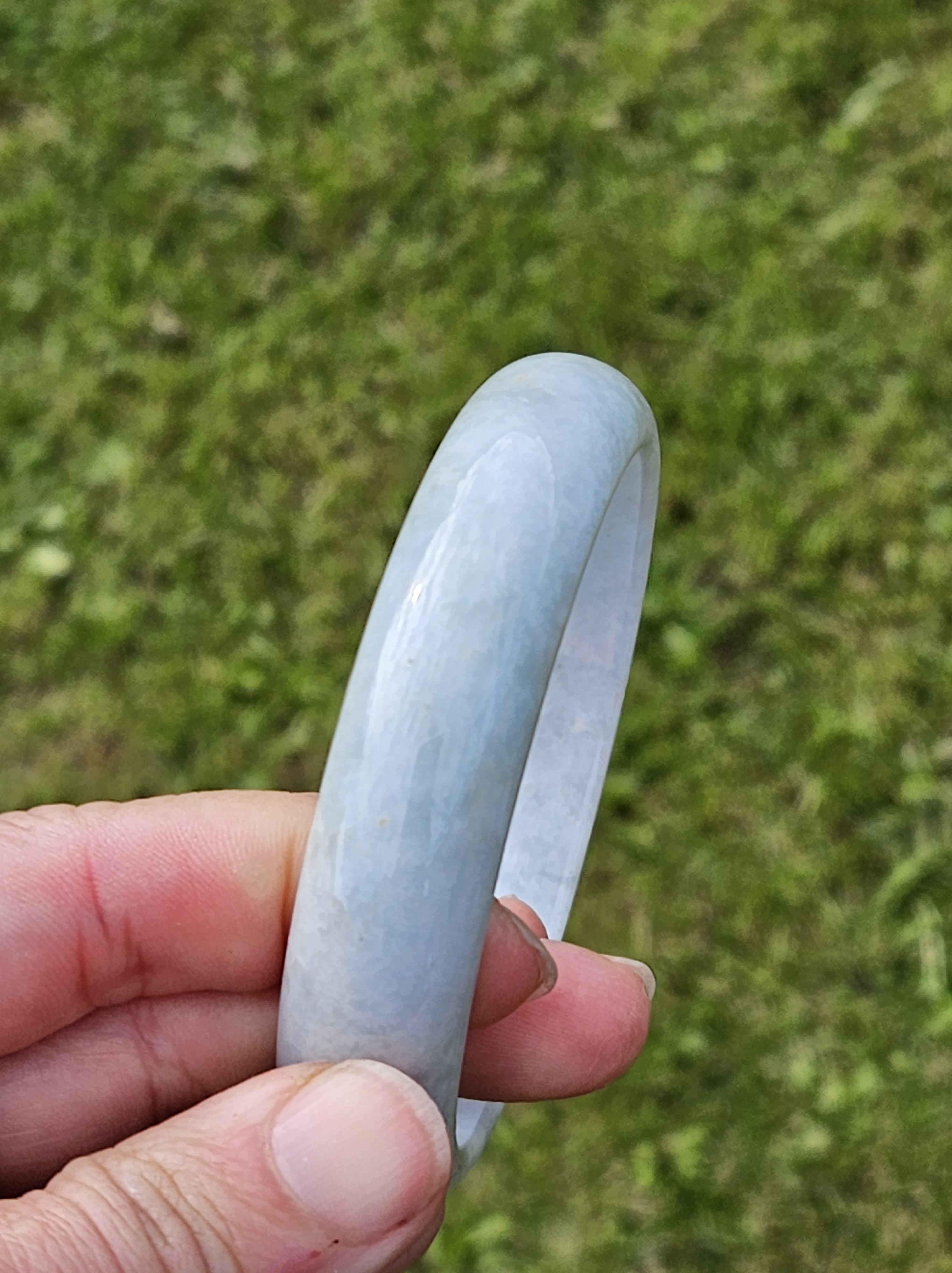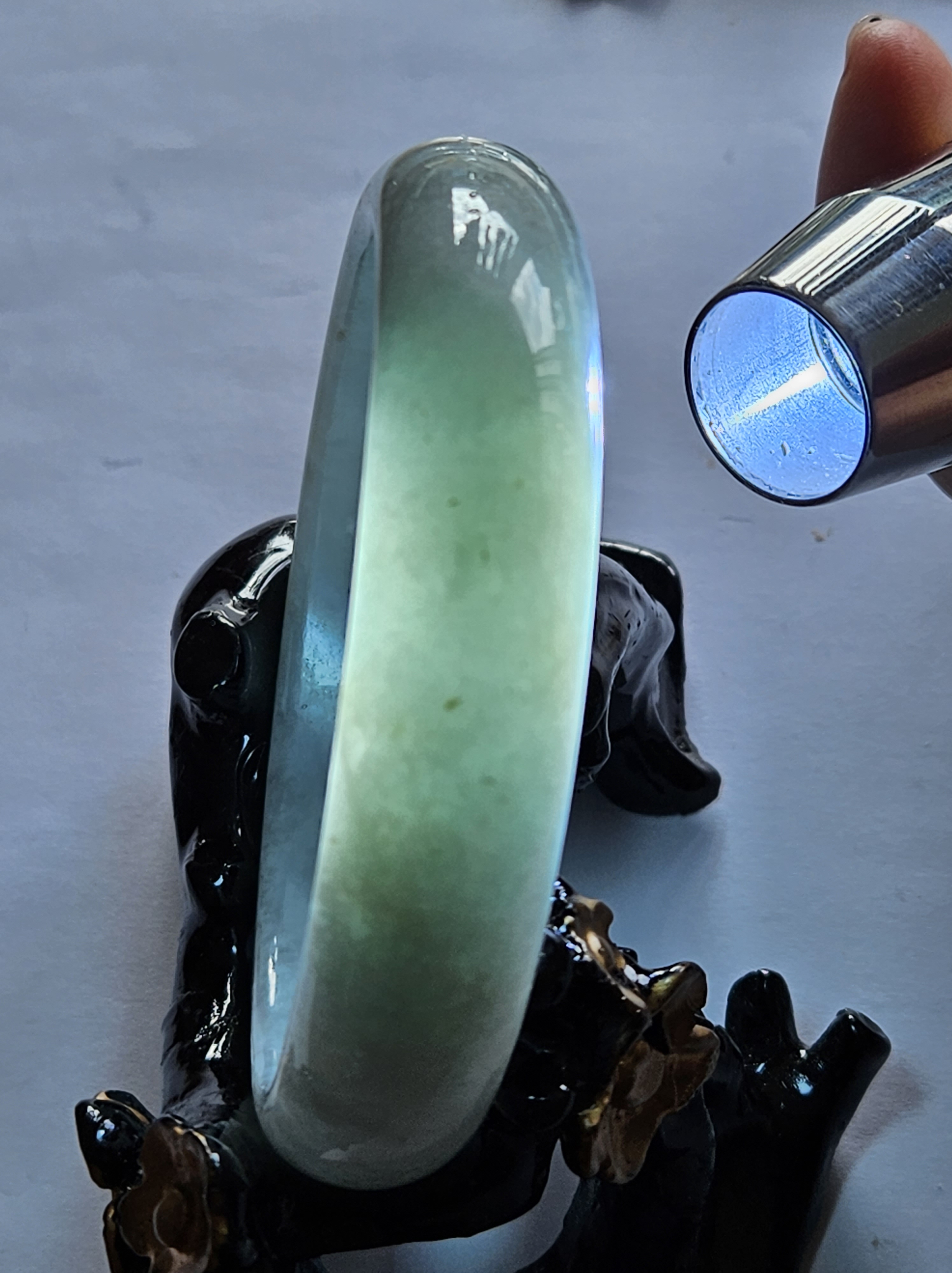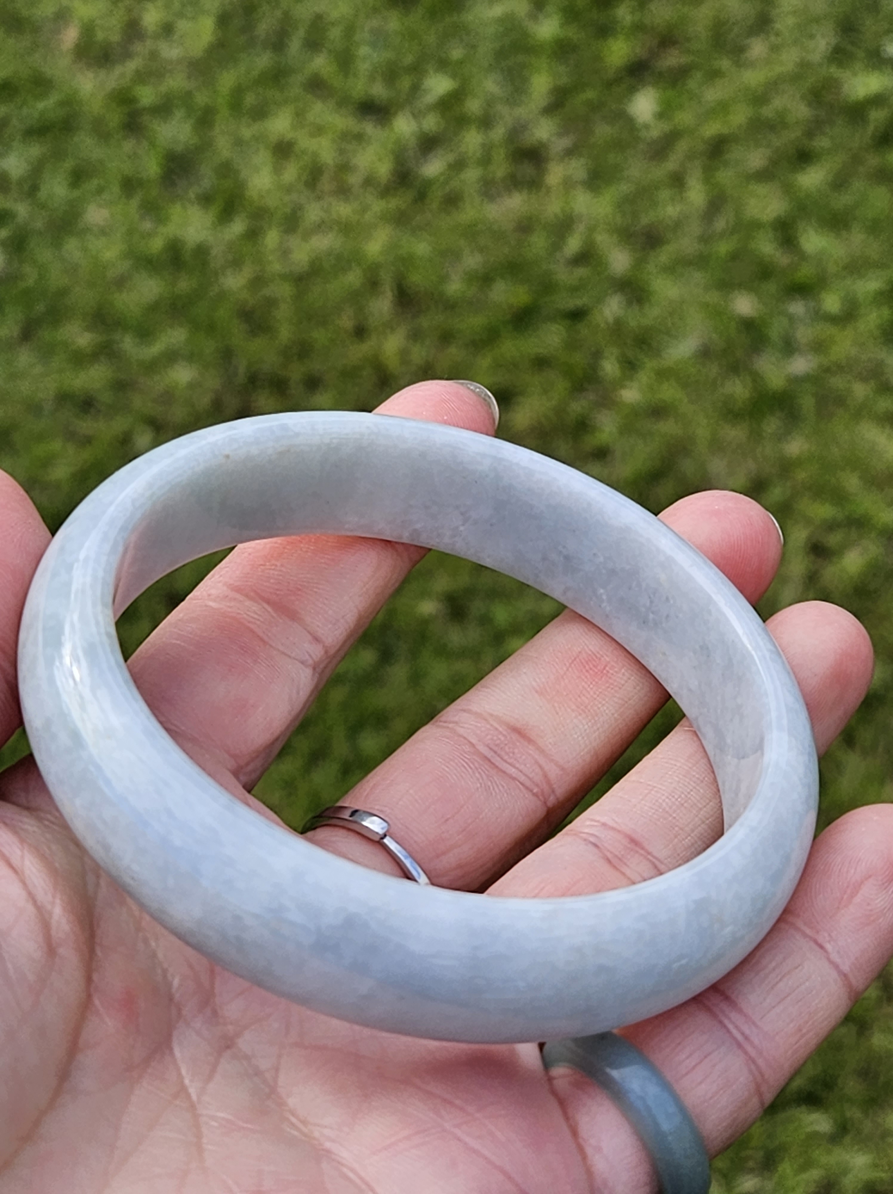 Not often available at this size, lovely light green colour Burmese jadeite bangle with yellow sesame seeds. Measures 64.4 x 15.4 x 8.2mm, weighs 70.90g, comes with a certificate of authenticity £298