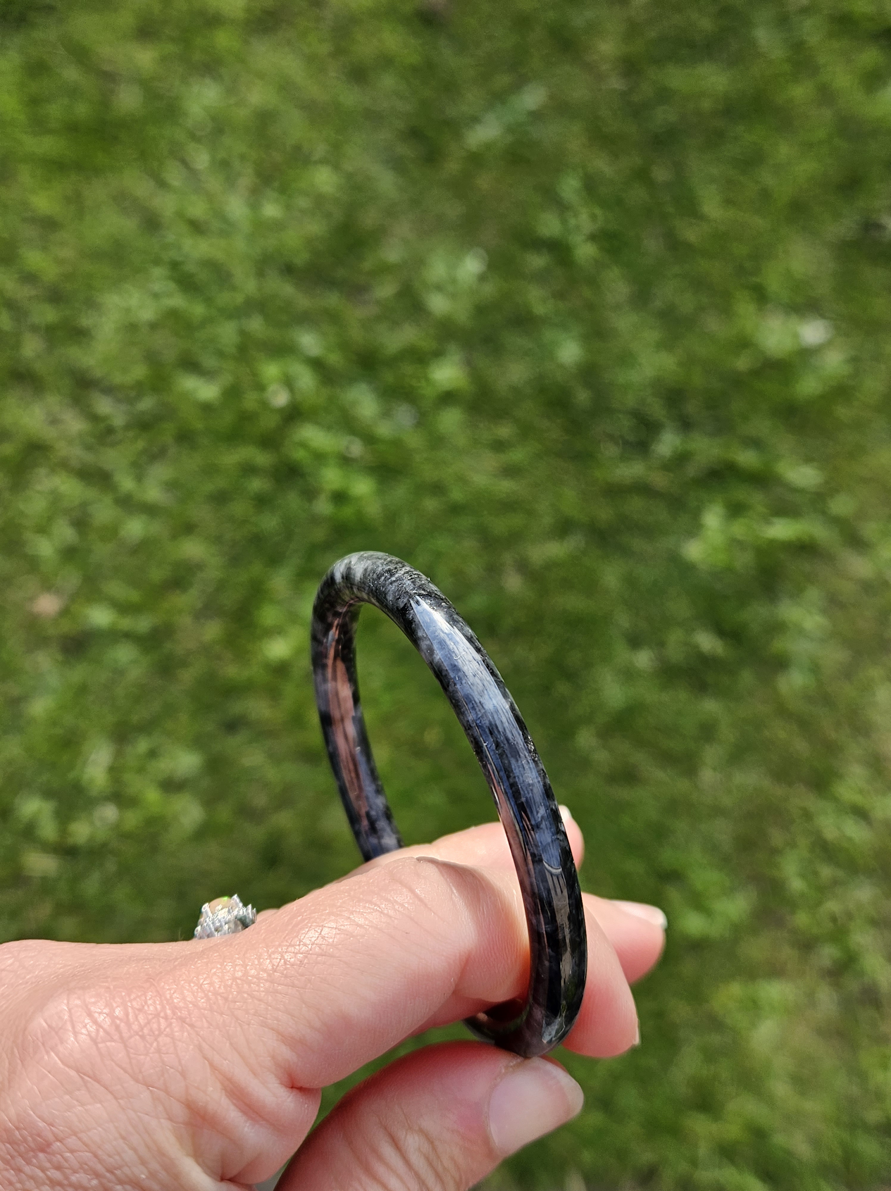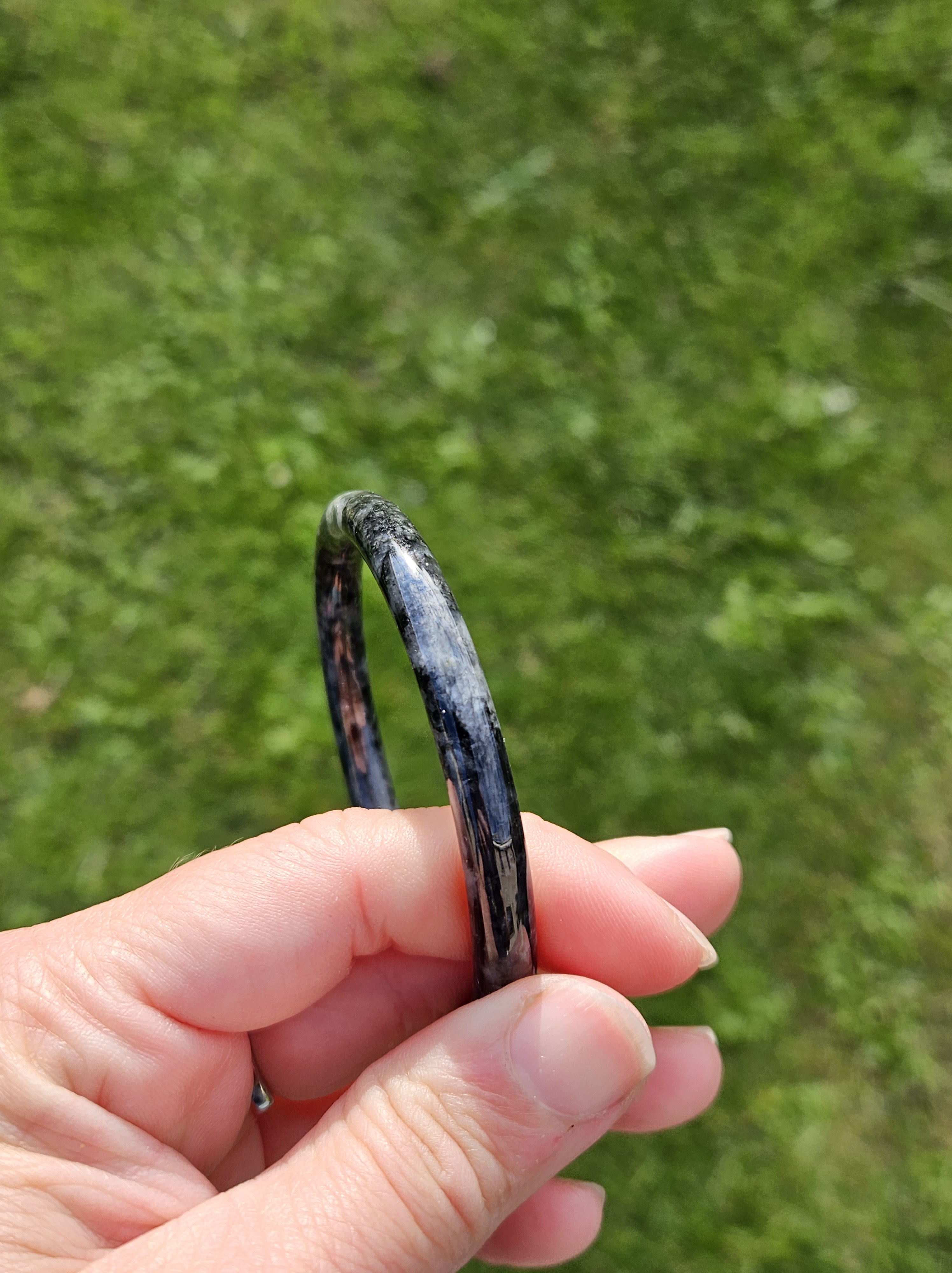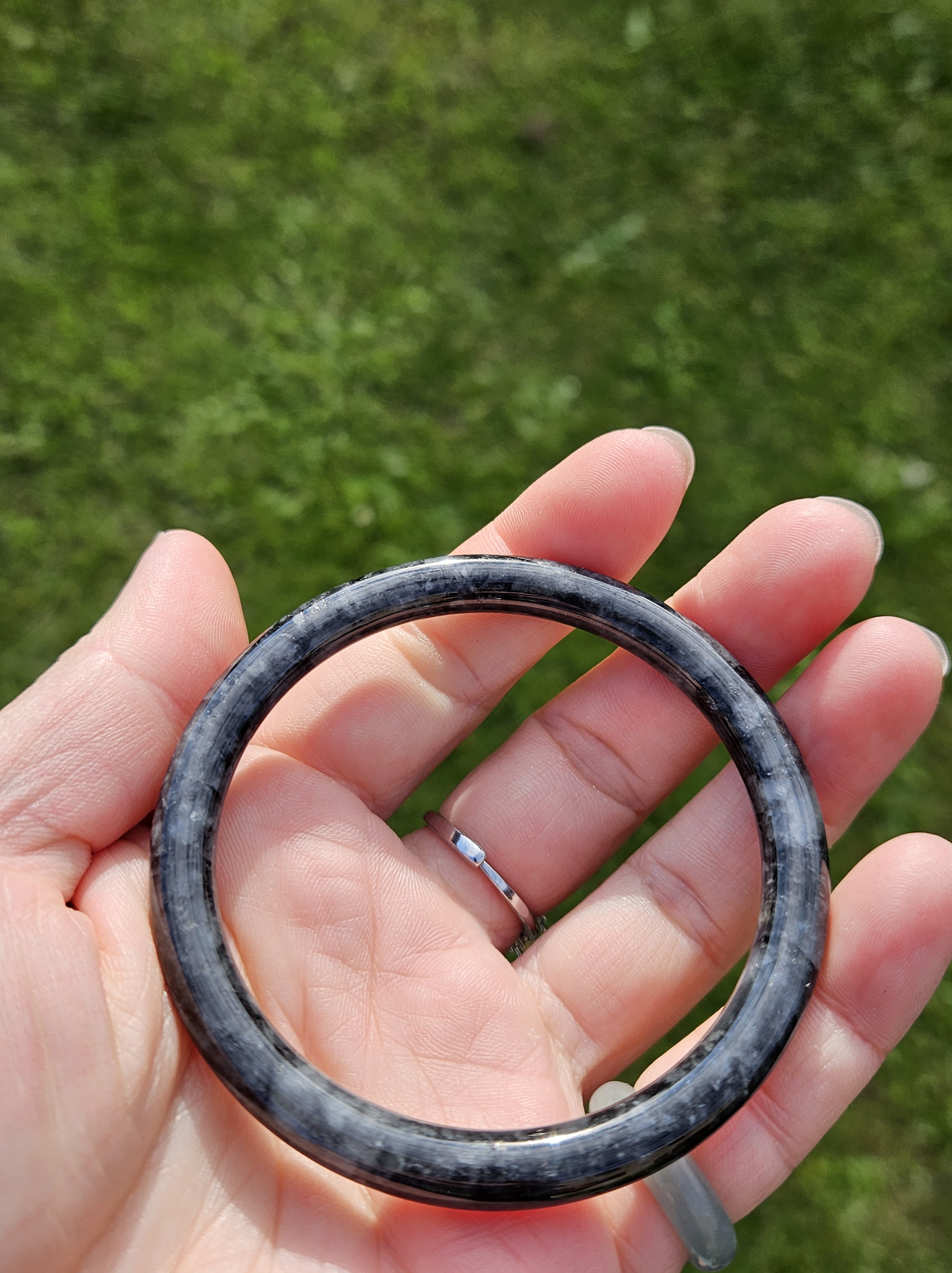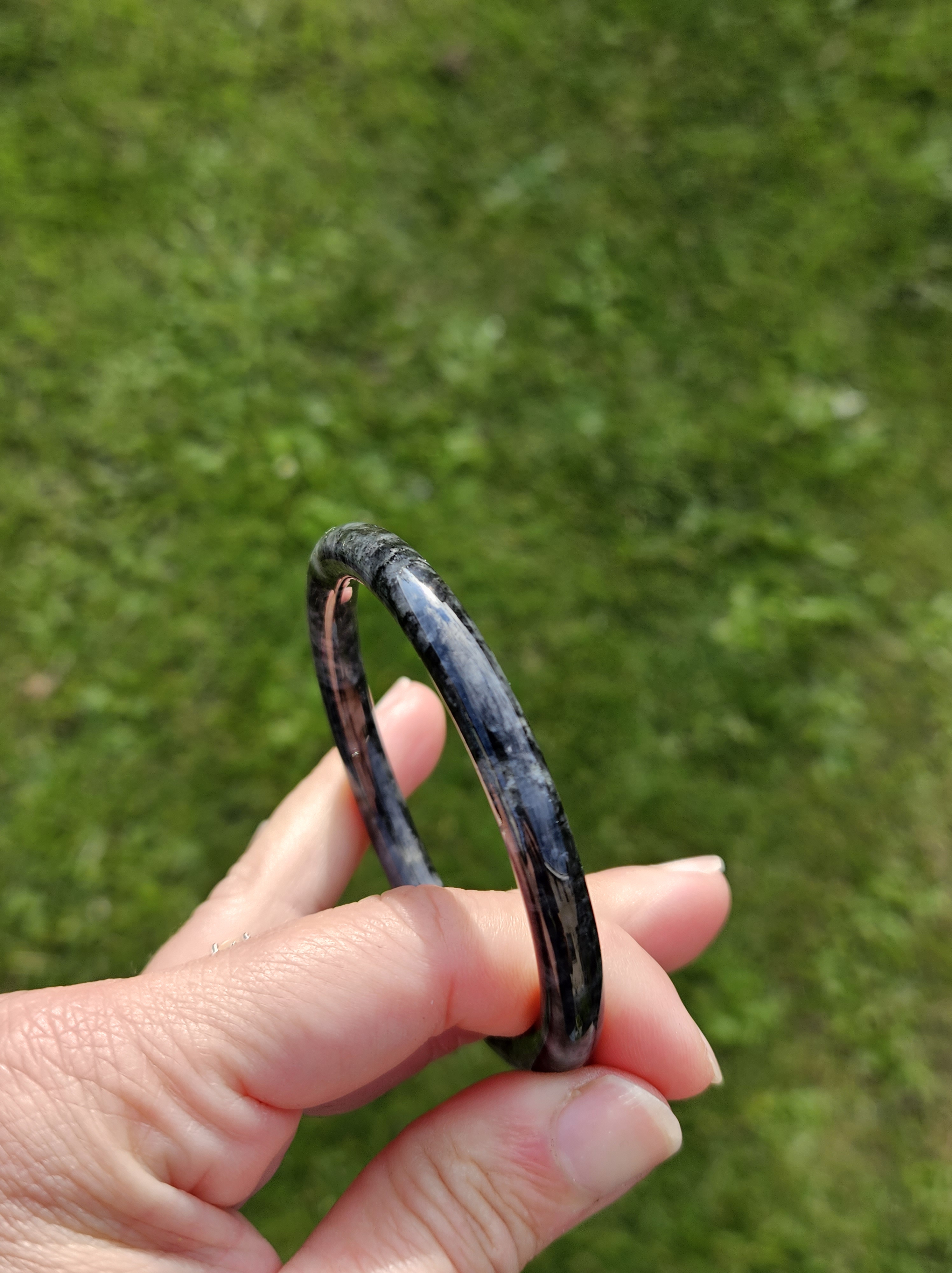 Dark smoky grey Burmese jadeite bangle so dark that only lights can go through the paler parts. Measures 55.8 x 6.4 x 7.3mm fits up to 57mm, weighs 23.79g. Comes with a certificate of authenticity £60