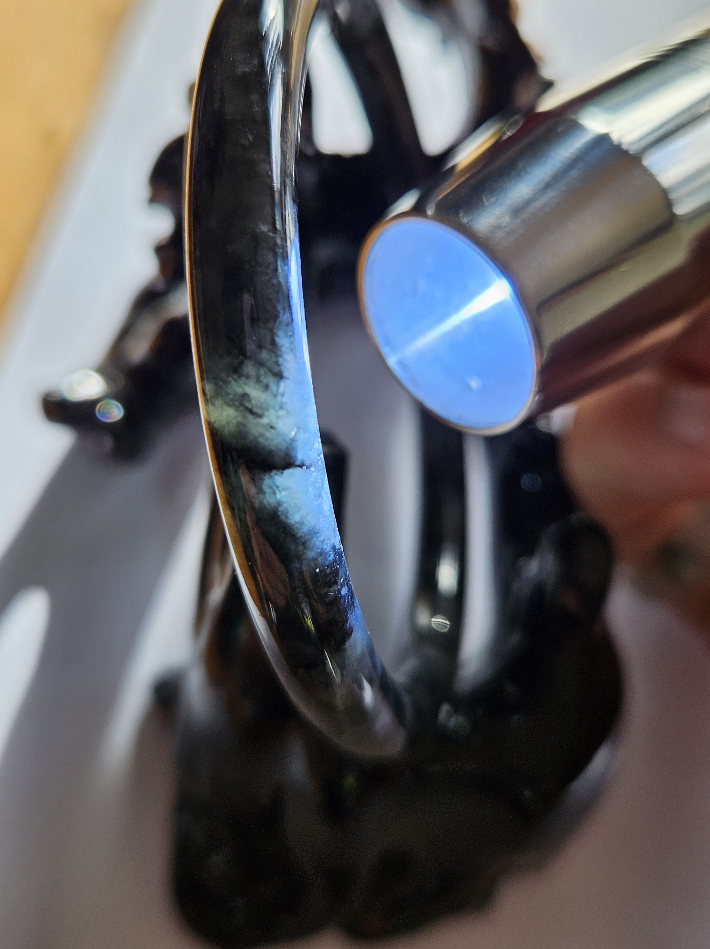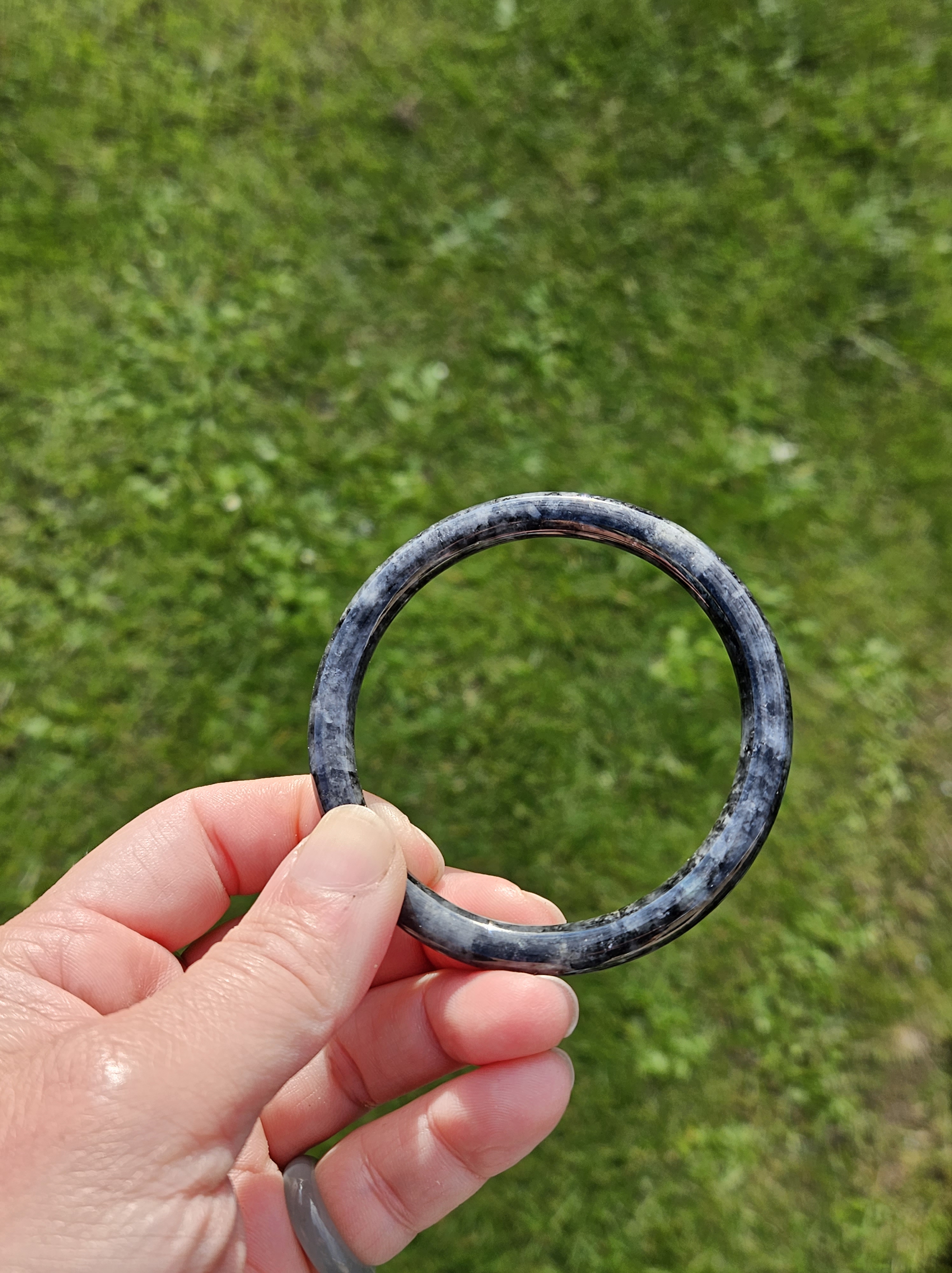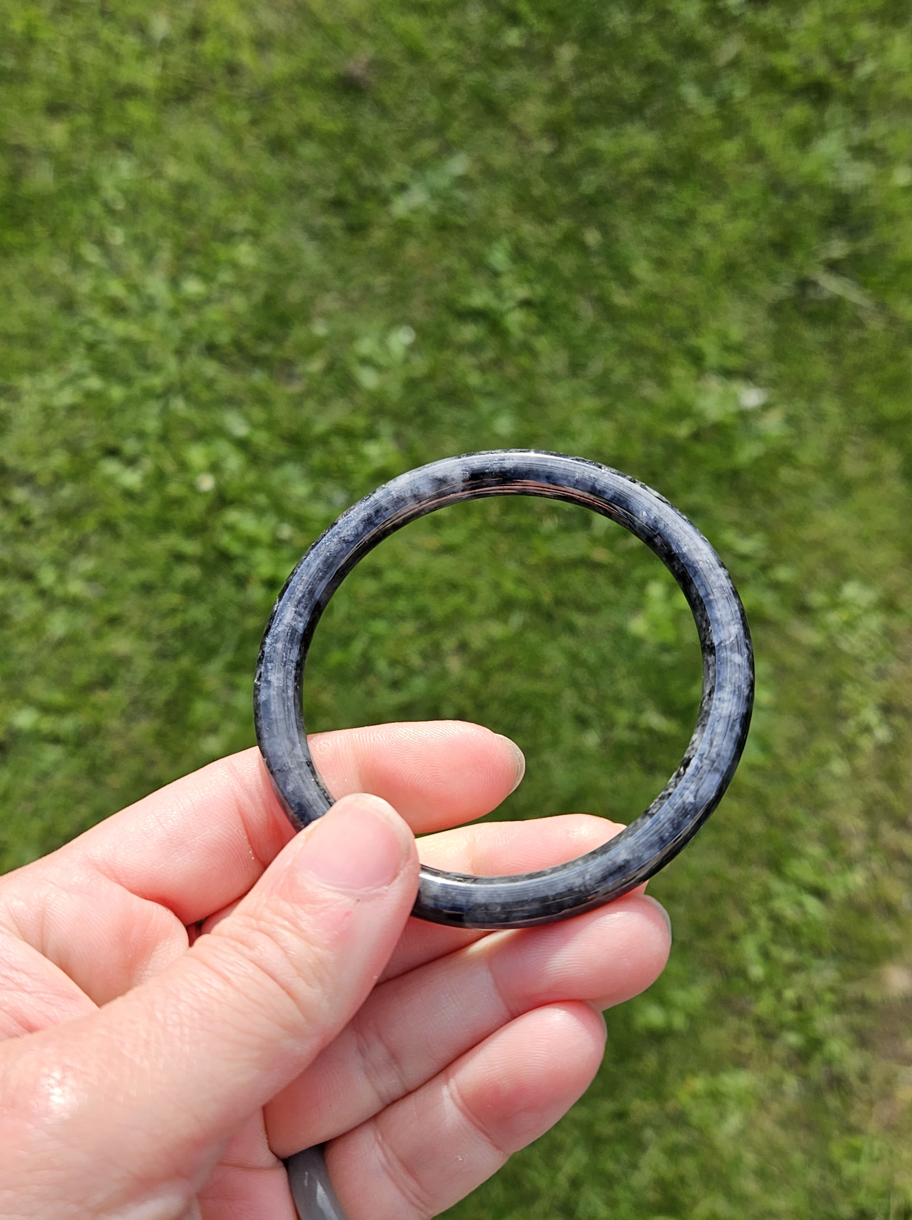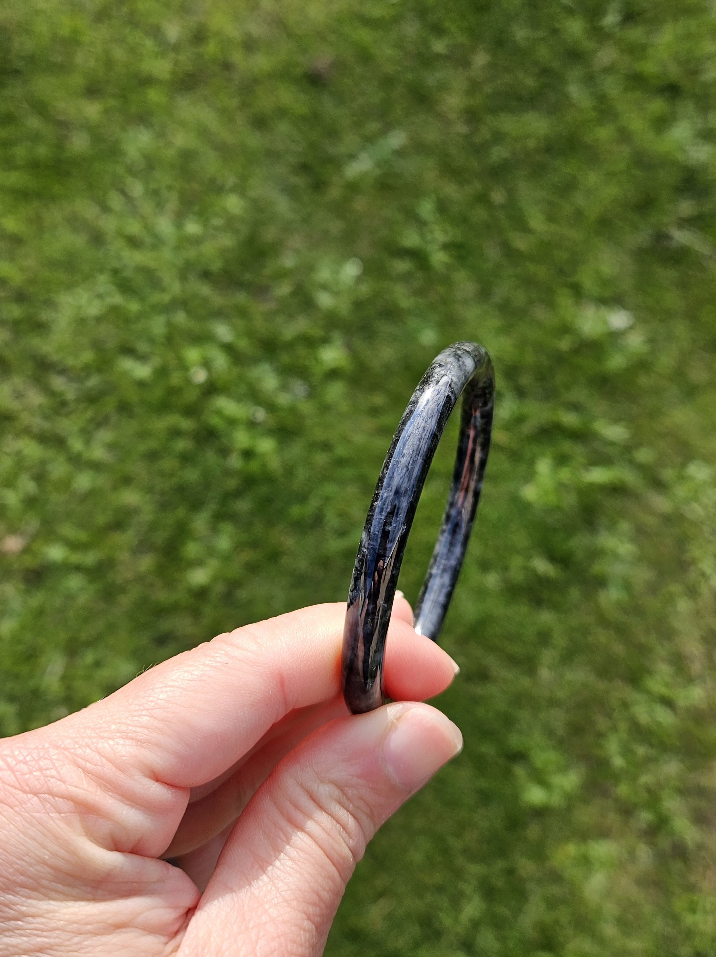 Dark smoky grey Burmese jadeite bangle so dark that only lights can go through the paler parts. Measures 55.8 x 6.4 x 7.3mm fits up to 57mm, weighs 23.79g. Comes with a certificate of authenticity £60