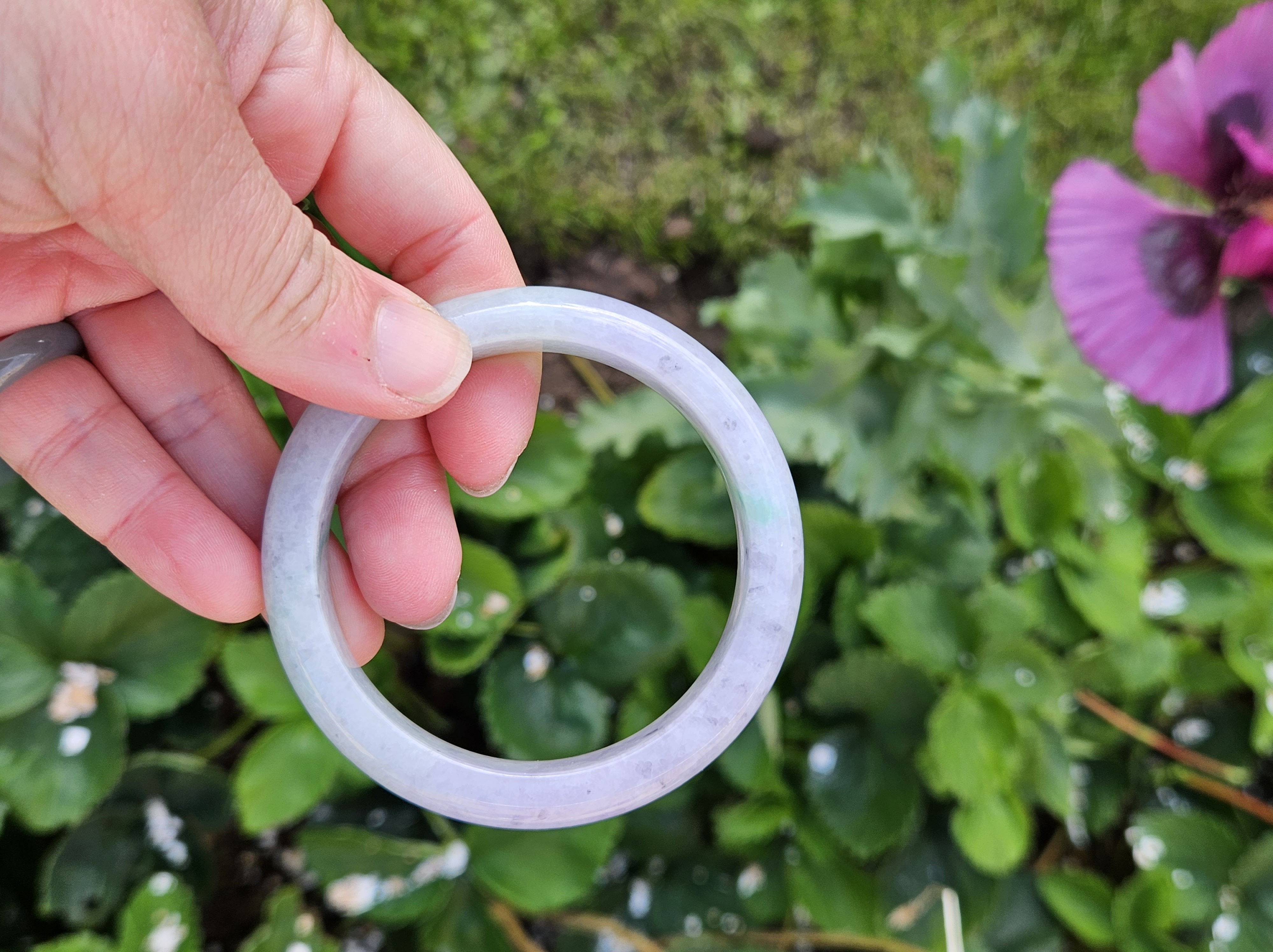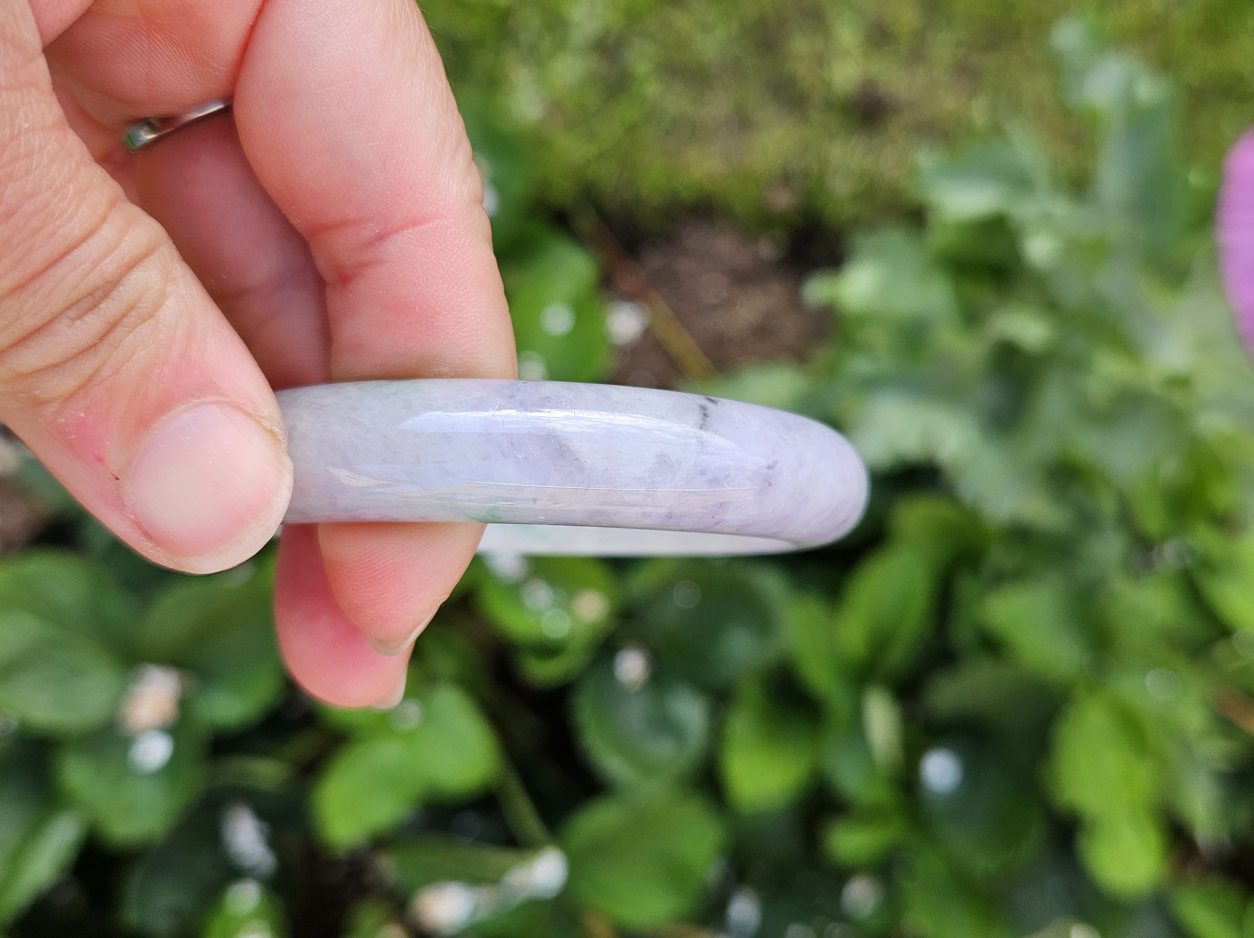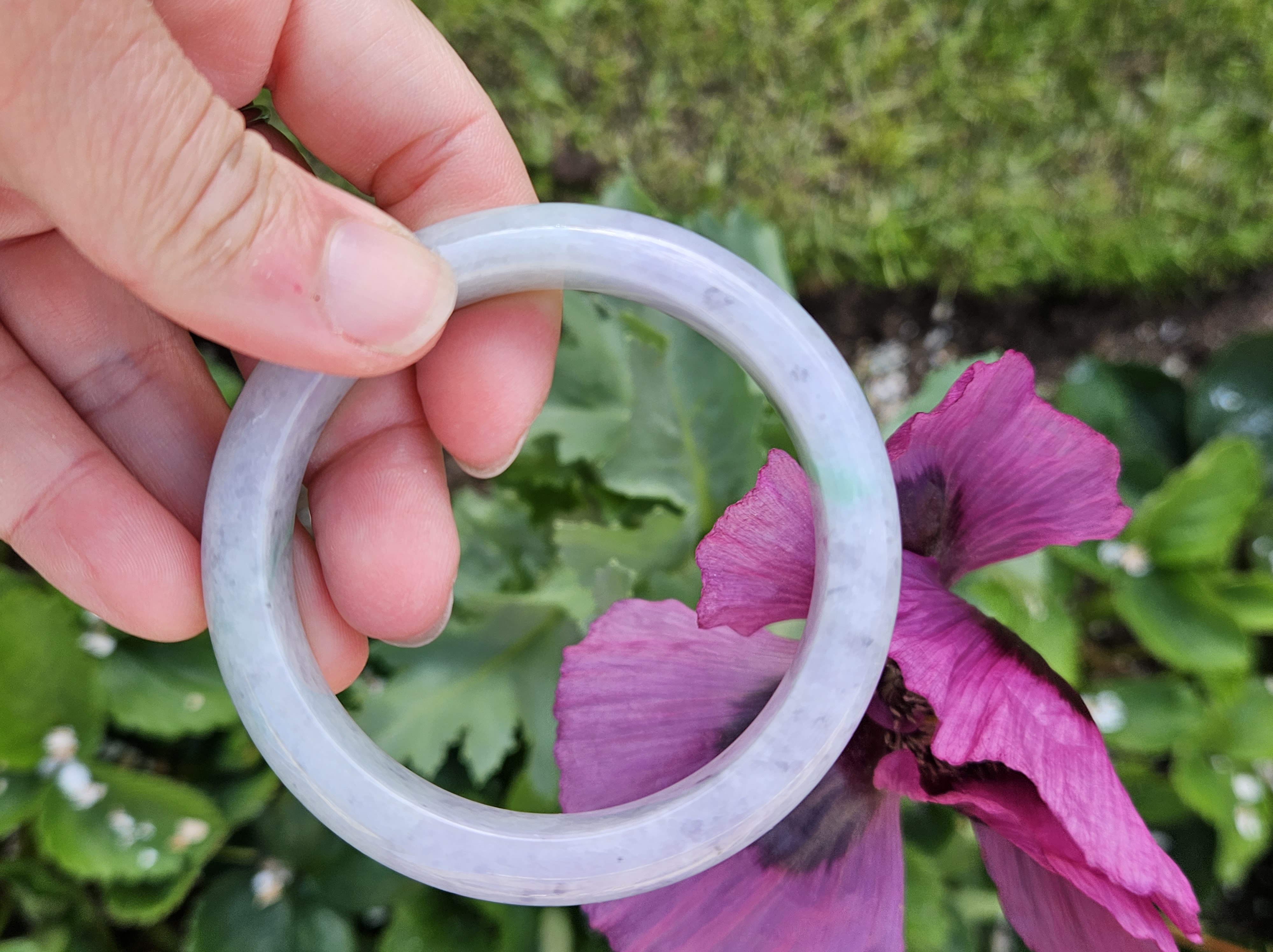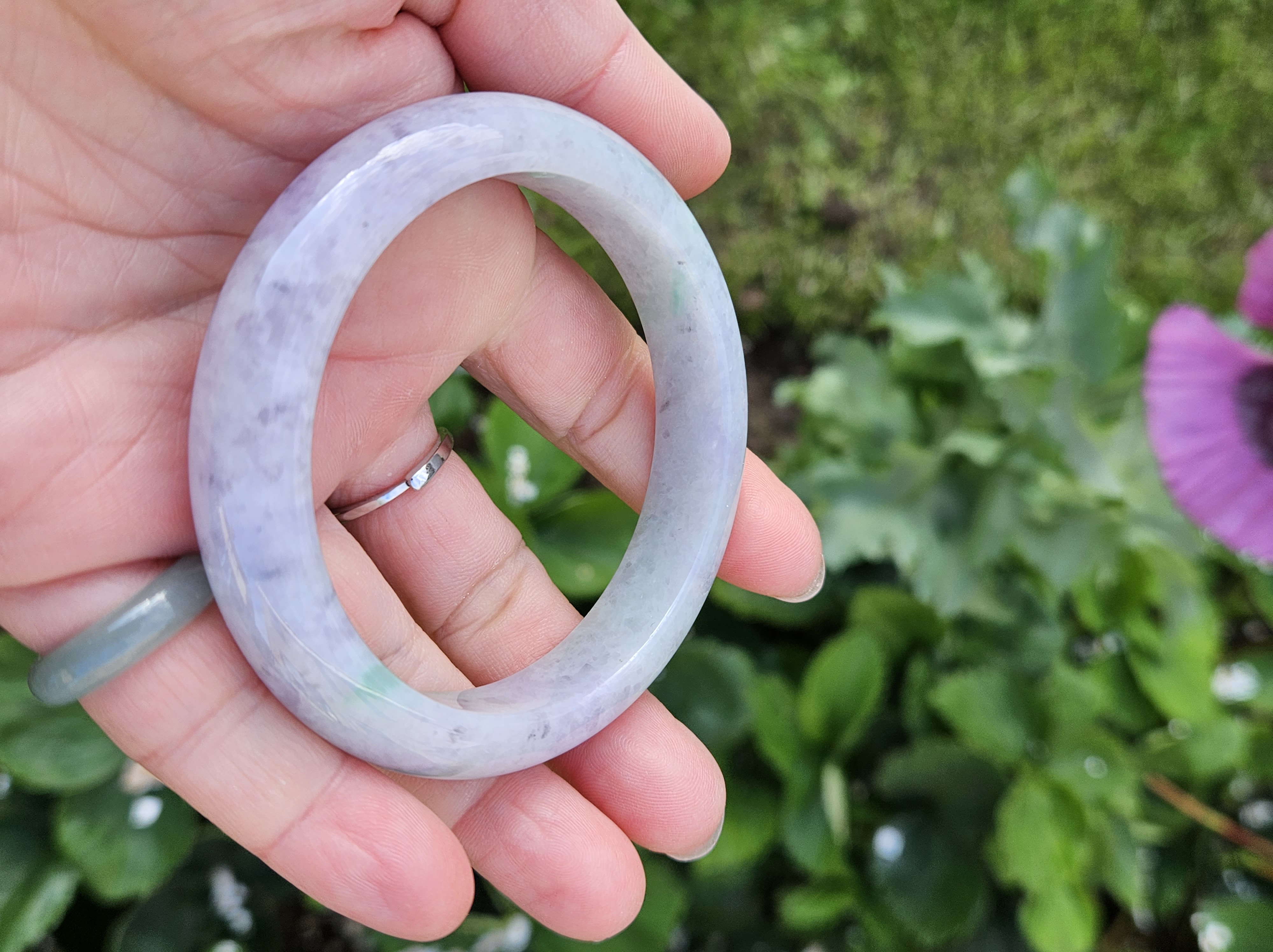 Translucent Burmese jadeite bangle in a gorgeous green and purple colour with smoky grey sesame seeds sprinkled in places. Measures 56.8 x 12.3 x 8.9mm, weighs 56.36g, comes with a certificate of authenticity £488